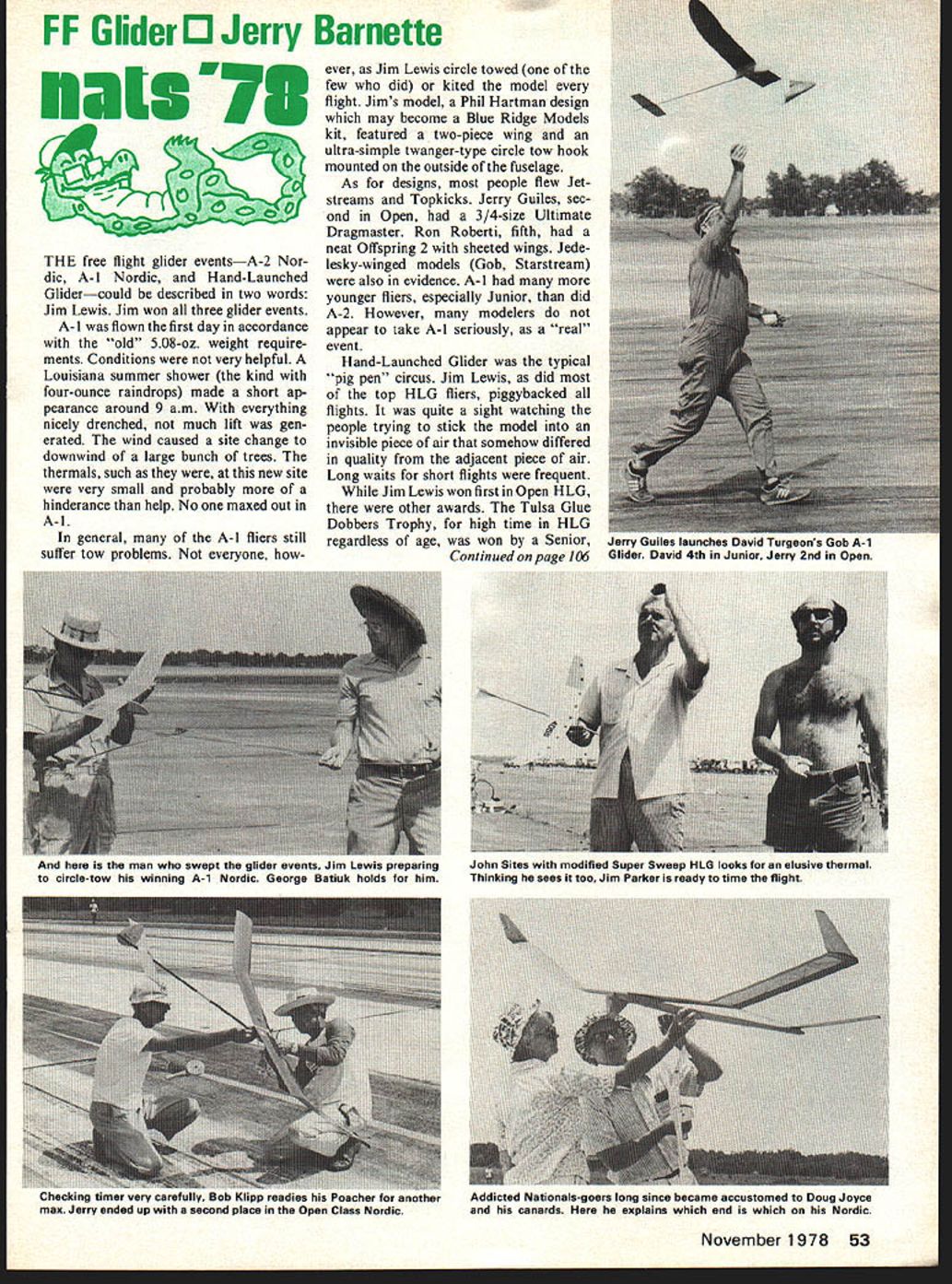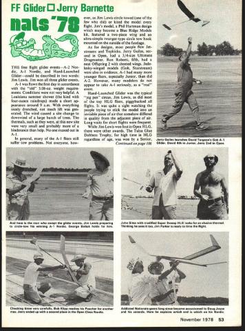 FF Glider 0 Jerry Barnette maim N73 0 THE free flight glider eventsA-2 Nor dic A-i Nordic Hand-Launched Glidercould described two words Jim Lewis Jim won three glider events A- 1 flown first day accordance old 508-oz weight require ments Conditions very helpful Louisiana summer shower kind four-ounce raindrops made short ap pearance around 9 am everything nicely drenched much lift gen erated wind caused site change downwind large bunch trees thermals such new site very small probably hinderance help No maxed out A- 1 general A-I fliers still suffer tow problems everyone however Jim Lewis circle towed few did kited model flight Jims model Phil Hartman design may become Blue Ridge Models kit featured two-piece wing ultra-simple twanger-type circle tow hook mounted outside fuselage As designs people flew Jetstreams Tupkicks Jerry Guiles sec ond Open 3/4-size Ultimate Dragmaster Ron Roberti fifth neat Offspring 2 sheeted wings Jede lesky-winged models Gob Starstream also evidence A-I younger fliers especially Junior did A-2 However modelers appear take A-I seriously real event Hand-Launched Glider typical pig pen~ circus Jim Lewis did top HLG fliers piggybacked flights quite sight watching people trying stick model invisible piece air somehow differed quality adjacent piece air Long waits short flights frequent Jim Lewis won first Open HLG other awards Tulsa Glue Dobbers Trophy high time HLG regardless age won Senior Continued page 106 November1978 53 erry uwles launcnes Uavld lurgeons job A-i Glider David 4th Junior Jerry 2nd Open irIu rime men wnu swepi ins gamuer evenTs im ewis preparing circle-tow winning A-i Nordic George Batiuk holds him John Sites modified Super Sweep HIG looks elusive thermal Thinking sees too Jim Parker ready time flight I.necKing timer very car- -p readies Poacher another max Jerry ended up second place Open Class Nordic Addicted Natlonalsgoers long since became accustomed Doug Joyce canards explains end Nordic tion Wonderful Oh yes free flight participation taled out respectable 90 individuals Apparently rule change deleting glo engines didnt exert quite negative impact anticipated Surprisingly very few ignition conversions evidence yet engines legal competition certainly provide good stable performance avail able See Salt Lake City 79 Nats/Barnette continued page 53 HLG win years US Free Flight Champs Texas Dick Mathis Larry McFarland Mike Hallum beat California Steve Geraghty Bob Boyer David Turgeon 185 seconds re gain quasi-perpetual Texas-California HLG Challenge Trophy Captain Steves id rather fly RC Texas Hand Launch Glider Team poster appar ently failed rally California troops enough provided needed impetus Texans both Grady Turner finishing second Open other person max out Rudy Klubier third close 340 Mike Clem won Junior Friday A-2 Nordic day start delayed until 9 am due site change Again very small Pitifully small quote frustrated flier thermals challenge/nemesis early part day Later day lift better breeze died air became super hot humid first round saw respectable num ber maxes plus some very close ones Dale Segle second Bob Issacson last years fly-off missed max 01 sec ond Bob Klipp noticed DT-timer set less three minutes Rather take time reset timer Bob gambled would high enough DTd would still max Almost Bob did fact DT early touched down 177 Bob went score six straight maxes second place missed forcing flyoff Lewis same three seconds good day Don Chancey designs Klipp flew Poacher Jim Lewis modified Hyperion V Jims Hy perion second A-2 first Poacher Jim worked hard well deserved win circle-towing upwind pick own air round Jim running couple miles evening keep shape event Louisiana heat humidity almost too much Jim spent half hour air conditioning prior last round regain composure Lucky did towed monster downer last round eventu ally ending up long way downwind before releasing max complete perfect score After Lewis Klipp came Herb Mieras first three Seniors top seven places followed Jon Watson sixth Andrew Barron seventh Seniors tough competition Nats/Barnette continued page 54 over minute Rolfe Gregorys nicely detailed Heinkel He-lOOD took fifth place help DC Maxecuters dominate event first sec ond fifth Rolfe also placed fifth Indoor same Flyline kit Tailwinds popular addition Tom Starks Bill Langleys flew identical red ones elder Bill seventh Open younger Bill first Junior Senior closely contested Nick Decarlis Fike Guy Larsen Miles Sparrowhawk Nick Decarlis eventually winning three outdoor scale events Gas Scale sort misnomer widespread use electric first Open CO2 first second Senior fourth fifth Open diesels second Open followed next day Again early morning trimming first order business models brand new However new models cantankerous ones Ron Robertis beautiful blue sil ver Curtiss Robin earned high est static score has around awhile 106 Model Aviation Please send me.......... copies new fourth edition Radio Control Buyers Guide Enclosed $600 copy ordered $525 Guide plus $75 postage & handling Total Enclosed ___________ anada City State ZIP Return Boynton & Assoc Clifton House Clifton VA 22024 Bob Boyer Bob did outstanding job making five maxes plus higher score