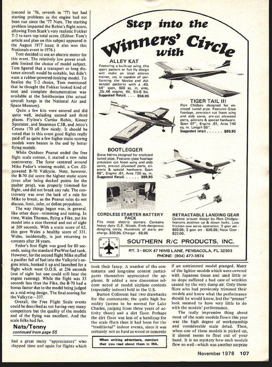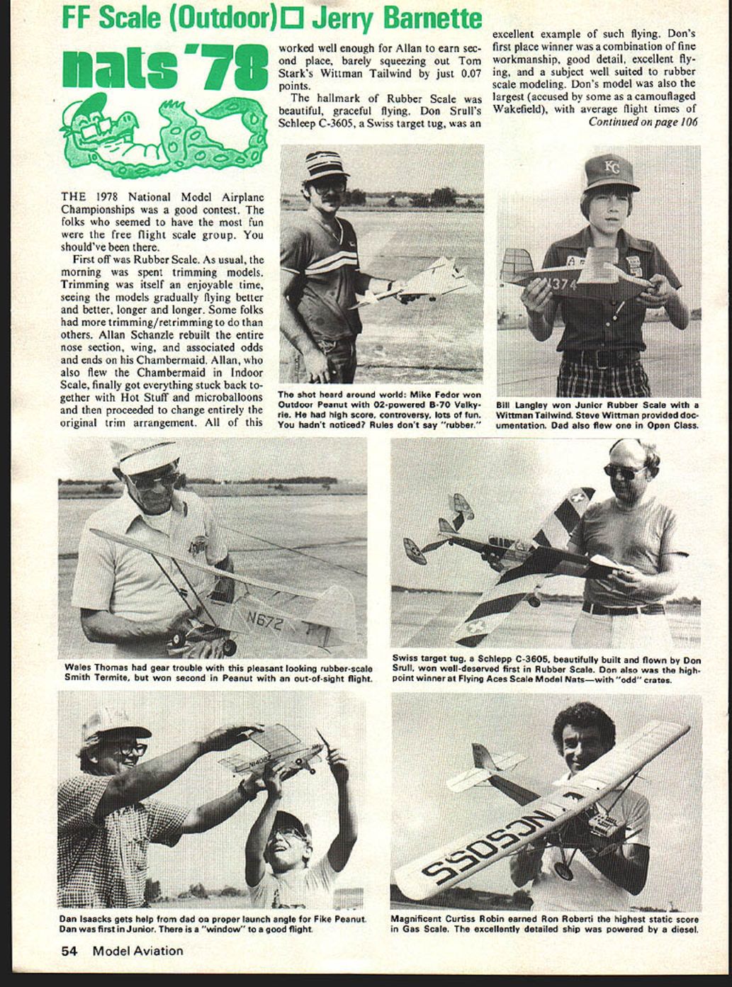 FF Scale OutdoorIJ Jerry Barnette -73 THE 1978 National Model Airplane Championships good contest folks seemed have fun free flight scale group shouldve First off Rubber Scale As usual morning spent trimming models Trimming itself enjoyable time seeing models gradually flying better better longer longer Some folks trim ming/retrimming others Allan Schanzle rebuilt entire nose section wing associated odds ends Chambermaid Allan also flew Chambermaid Indoor Scale finally got everything stuck back gether Hot Stuff microballoons proceeded change entirely original trim arrangement worked well enough Allan earn sec ond place barely squeezing out Tom Starks Wittman Tailwind just 007 points hallmark Rubber Scale beautiful graceful flying Don Srulls Schleep C-3605 Swiss target tug excellent example such flying Dons first place winner combination fine workmanship good detail excellent fly ing subject well suited rubber scale modeling Dons model also largest accused some camouflaged Wakefield average flight times Continued page 106 54 Model Aviation shot heard around world Mike Fedor won Outdoor Peanut 02-powered B-70 Valky ne high score controversy lots fun hadnt noticed Rules dont say rubber Bill Langley won Junior Rubber man Tailwind Steve Wittman provided doc umentation Dad also flew Open Class vvaies i nomas naa gear trouble pleasant looking rubber-scale Smith Termite won second Peanut out-of-sight flight Swiss target tug Schlepp C-3605 beautifully built flown Don Snull won well-deserved first Rubber Scale Don also highpoint winner Flying Aces Scale Model Netswith odd crates Dan lsaacks gets help dad og proper launch angle Fike Peanut Dan first Junior window good flight Magnificent Curtiss Robin earned Ron nouurIa mu nignesi siaxic score Gas Scale excellently detailed ship powered diesel tion Wonderful Oh yes free flight participation taled out respectable 90 individuals Apparently rule change deleting glo engines didnt exert quite negative impact anticipated Surprisingly very few ignition conversions evidence yet engines legal competition certainly provide good stable performance avail able See Salt Lake City 79 Nats/Barnette continued page 53 HLG win years US Free Flight Champs Texas Dick Mathis Larry McFarland Mike Hallum beat California Steve Geraghty Bob Boyer David Turgeon 185 seconds re gain quasi-perpetual Texas-California HLG Challenge Trophy Captain Steves id rather fly RC Texas Hand Launch Glider Team poster appar ently failed rally California troops enough provided needed impetus Texans both Grady Turner finishing second Open other person max out Rudy Klubier third close 340 Mike Clem won Junior Friday A-2 Nordic day start delayed until 9 am due site change Again very small Pitifully small quote frustrated flier thermals challenge/nemesis early part day Later day lift better breeze died air became super hot humid first round saw respectable num ber maxes plus some very close ones Dale Segle second Bob Issacson last years fly-off missed max 01 sec ond Bob Klipp noticed DT-timer set less three minutes Rather take time reset timer Bob gambled would high enough DTd would still max Almost Bob did fact DT early touched down 177 Bob went score six straight maxes second place missed forcing flyoff Lewis same three seconds good day Don Chancey designs Klipp flew Poacher Jim Lewis modified Hyperion V Jims Hy perion second A-2 first Poacher Jim worked hard well deserved win circle-towing upwind pick own air round Jim running couple miles evening keep shape event Louisiana heat humidity almost too much Jim spent half hour air conditioning prior last round regain composure Lucky did towed monster downer last round eventu ally ending up long way downwind before releasing max complete perfect score After Lewis Klipp came Herb Mieras first three Seniors top seven places followed Jon Watson sixth Andrew Barron seventh Seniors tough competition Nats/Barnette continued page 54 over minute Rolfe Gregorys nicely detailed Heinkel He-lOOD took fifth place help DC Maxecuters dominate event first sec ond fifth Rolfe also placed fifth Indoor same Flyline kit Tailwinds popular addition Tom Starks Bill Langleys flew identical red ones elder Bill seventh Open younger Bill first Junior Senior closely contested Nick Decarlis Fike Guy Larsen Miles Sparrowhawk Nick Decarlis eventually winning three outdoor scale events Gas Scale sort misnomer widespread use electric first Open CO2 first second Senior fourth fifth Open diesels second Open followed next day Again early morning trimming first order business models brand new However new models cantankerous ones Ron Robertis beautiful blue sil ver Curtiss Robin earned high est static score has around awhile 106 Model Aviation Please send me.......... copies new fourth edition Radio Control Buyers Guide Enclosed $600 copy ordered $525 Guide plus $75 postage & handling Total Enclosed ___________ anada City State ZIP Return Boynton & Assoc Clifton House Clifton VA 22024 Bob Boyer Bob did outstanding job making five maxes plus higher score second 76 seventh 77 starting problems engine run since 77 Nats starting problem impacted Robins flight score allowing Tom Starks very realistic Fokker T-2 earn top total score Editor Toms article plan subject appeared August 1977 issue also won Nationals event 1976 Tom decided use electric motor event relatively low power avail able limited choice model subject Tom figured transport long dis tance aircraft would suitable didnt want rubber-powered-looking model finalize T-2 choice Tom mentioned thought Fokker looked kind neat complete documentation available Smithsonian actual aircraft hangs National Air Space Museum Quite few kits entered did quite well including second third places Flylines Curtiss Robin Kinner Sportster Stearman C3B Jetcos Cessna 170 flew nicely should noted event good flights really paid oft quite few higher static scoring models beaten end better flying models Outdoor Peanut ended free flight scale contest started n