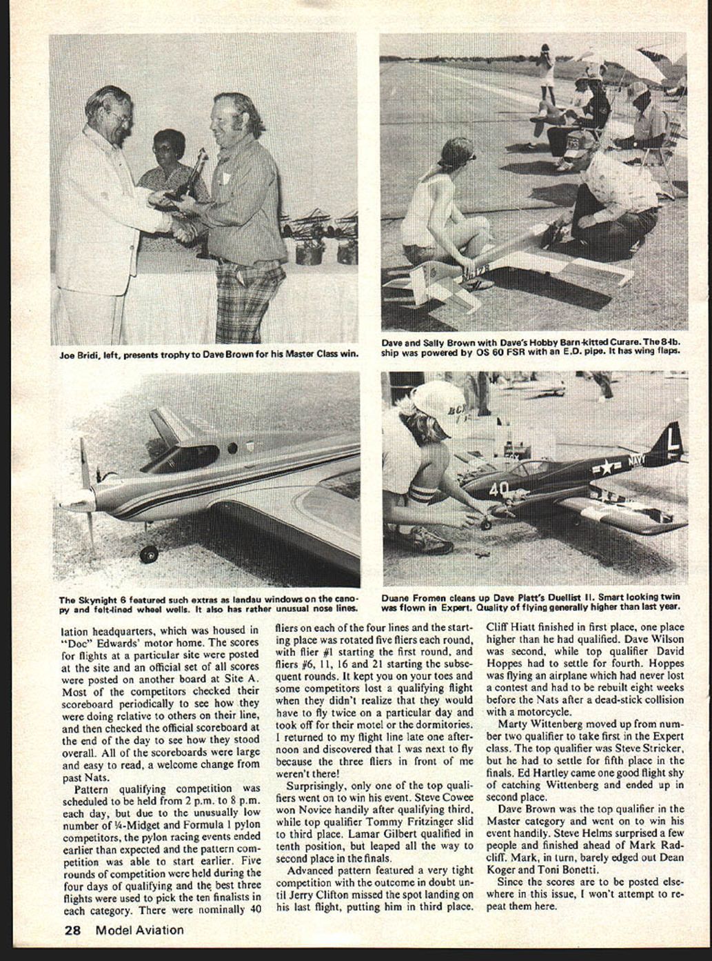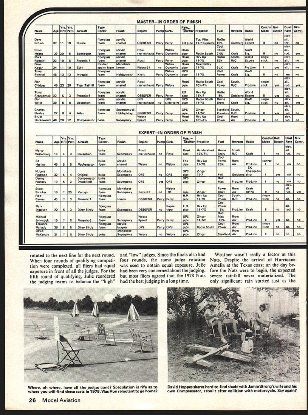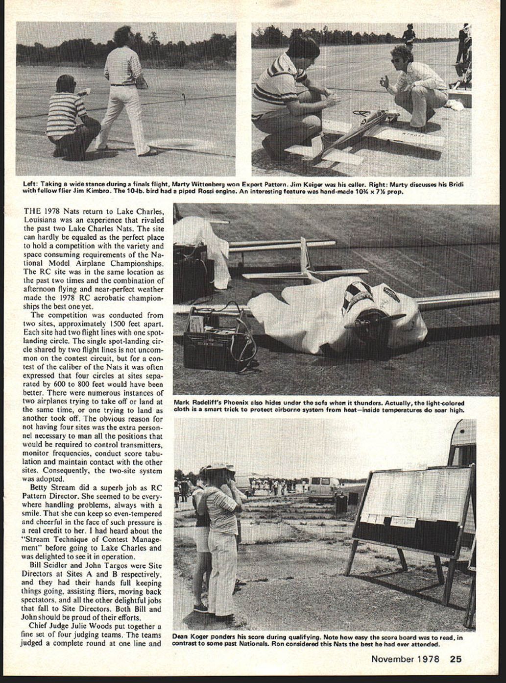 Chief Pattern Judge Julie Woods briefs competitors before Nets gin Pattern Director Betty Stream backs up girls ran pat tern did impressive flawless job No male chauvinists expres sionsof troops background confirmnote guy biting nails Meadames Edwards Koger Shade assist flight tabulation Site Two sites B common landing circle two lines Radio Control Pattern Director Betty Stream begins pilots brief ing just after rain Nets stopped Great weather 24 Model Aviation Suzi Stream Sally Brown assist transmitter processing uuve Brown charge practically Nationals transmitter processing U Left Taking wide stance during finals flight Marty Wittenberg won Expert Pattern Jim Keiger caller Right Marty discusses Bridi fellow flier Jim Kimbro 10-lb bird piped Rossi engine An interesting feature hand-made 10 x 7% prop THE 1978 Nats return Lake Charles Louisiana experience rivaled past two Lake Charles Nats site can hardly equaled perfect place hold competition variety space consuming requirements Na tional Model Airplane Championships RC site same location past two times combination afternoon flying near-perfect weather made 1978 RC aerobatic champion ships best yet competition conducted two sites approximately 1500 feet apart site two flight lines spotlanding circle single spot-landing cir cle shared two flight lines uncom mon contest circuit con test caliber Nats often expressed four circles sites sepa rated 600 800 feet would have better numerous instances two airplanes trying take off land same time trying land another took off obvious reason having four sites extra person nel necessary man positions would required control transmitters monitor frequencies conduct score tabu lation maintain contact other sites Consequently two-site system adopted Betty Stream did superb job RC Pattern Director seemed handling problems always smile can keep even-tempered cheerful face such pressure real credit heard about Stream Technique Contest Manage ment before going Lake Charles delighted see operation Bill Seidler John Targos Site Directors Sites B respectively hands full keeping things going assisting fliers moving back spectators other delightful jobs fall Site Directors Both Bill John should proud efforts Chief Judge Julie Woods put together fine set four judging teams teams judged complete round line November1978 25 Mark Radcliffs Phoenix also hides under sofa thunders Actually light-colored cloth smart trick protect airborne system heatinside temperatures soar high Dean Koger ponders nis score auring qualifying Note easy score board read contrast some past Nationals Ron considered Nets best ever attended MASTERIN ORDER OF FINISH Yre YrsTypeFlControl RollDuel Mix NemeAge RIC PeftAiroaftConstrFinlehEnginePump CerberPropellerFuelRetreats RedloMode Button Rate Contr alex DewfiberglassacrylicTop FliteRoGoWorldall Brown321110CurerefoamanamelOS6OFSRPerryPerryED pipe11-7 Supreme15%GoldberriExpert IInothrno Stew oolelex fiberglassacrylicRossiWebraRosniPowerrafteli Helms29206Bootleggerfoamenamelrear exhauntPerryDynamixRadio South2t4%KraftSig IInorudyes MerkfiberglansacrylicRossiRev UpRoGoSouthWorldsinglealex Fladcliff2310BPhOenix 7foamenamelRoasiPerrhPerrypipe11-7%15%R/CExpertsticknoallno DeanKevlar/MonokoteWebraRosgiMax Daileyalex Koger341110EU-iepoxy foamlmronWebra 61 noDynamix2..11-7i6LXraftProLine Iyeaallno TonyfibergiasaWebraOPSCoolKraft Bonetti481313IntrepidfoamHobbypoxyKraftPerryDynamix11-7YPowerraftSia Ilno nono alex RonfiberglassacrylicRoasiRoasiRadio SouthCoolSouthsingleall Chidgey462320Tiger Tail Illfoamenamelrear exhaustPerryWebrapipe10%-7YPowerR/CProLineatickyesrudyen alex TonyfiberglassacrylicEDRev UpRoGoWorldall Frackowiak22B3Phoenix 6foamenamelOSBOFSRPerryParryoiO1 1A-7 5%GjdpExpert IIrudno DonbelsaacrylicDPSOPSOPSRadio SouthHomeKraftsinglealex Weitz3065Deceptionfoamenamelrear exhaust nolide wiwo11-TABrewKrsftSigsticknoallyes alex CharlesfiberglassSuperpoxy &OPSZingerStanfieldSouthall Danley27B4Atlasfoam9obbypoxyOS6OFSRPerry11-7WPremiumRI...ProLineJJ.~rudno BruceWebraRossiRev UpCoolRomelex Underwood402812CompensatorbelsaSuperpoxySpeedPerryPerry10A-7/PowerAirProLine IInorudno EXPERTIN ORDER OF FINISH Yrs YraTypePi2gControl Roll Duel Mix NameAge R/C PattAiroaftCowerPiniahEnginePump Carb1iufflerPropellerFuelRetractsRadioMode Button Rate Contr slav MartybelsaRossiRossiHandcraftedHomeSouthall WittenberglB43DeceptionfoamSuparpoxywar exhaustnoRossiolpe10%-7YBrewR/CKrafc Inorudno Cool EdbaItsacrylicFoxRex UpPowerRom rse Hartley465BMachensatorfoamenamelWebranoWebrapipe1 1-7A25%AirProLine Ino nono BK RobertMonokoteOPSZingerChampion Redmon3264DriginalbalsaSuperpoxyOPSnoOPSoJ2.11-7PAl3oldbei- Iyen nono DannyCompennatorbalsaOPSRed Ramany1953modifiedlfoamSuperpoxyOPSyesDPSolpeZingerMaxProLineProLine Ino nono alex StewfiberglassMonokoteWebraPowerRomKraftall Stricker16724foamSuperpoxyEnyx XFno91o2.....ZingarSlantAirKP7C IInorudyes RodfiberglassHPRev UpCoolSouth gle Barnen4373Phoenix 7foamIsaronOS6OFSRPerryPerryoipa11-7YPowerR/CPraLine sticknoallno MaryfiberglassSuper-EDRex UpPowerall Ingerson2253Dirty BirdyfoamSuperpoxyOS6OFSR notigrapipe11-7V5%ProLineraft IInorudno Red MichaelfiberglassWebraOPSZingarMatRom Johncock1575PhoenitSfoamSuperpoxySpeedPerryPerryolpe11-7W10%AirProLineIIyesallno TerrsncefiberglassacrylicOPSCoolIqomsingle Mshady36BBDirty BirdyfoamlacquerOPSPerryOPSo2e.....Radio SouthPowerAirProLinesticknoxiino DavidMonokoteOPSRom McKenzie2175Dirty BirdybaitsSuperpoxyWabranoWebrapipeZingerStanfiald AirProLineIInonono rotated next line next round four rounds qualifying Competi tion completed fliers equal exposure front judges fifth round qualifying Julie reordered judging teams balance high low judges Since finals also four rounds same judge rotation used obtain equal exposure Julie very concerned about judging fliers agreed 1978 Nats best judging long time Weather wasnt really factor Nats Despite arrival Hurricane Amelia Texas coast day fore Nats begin expected severe rainfall never materialized significant rain