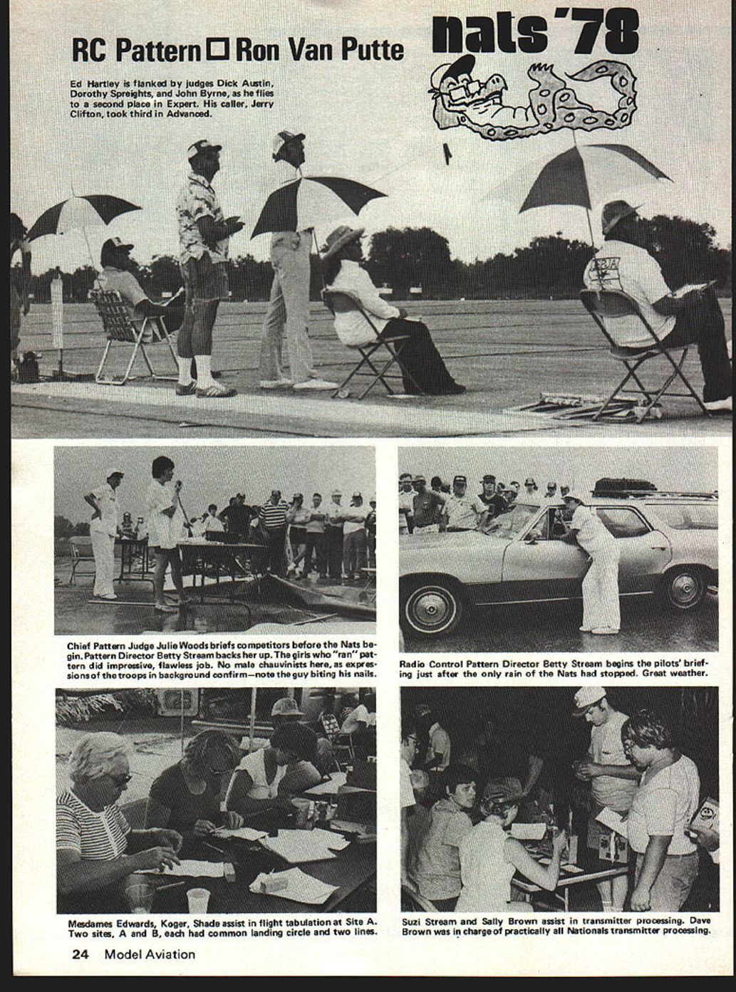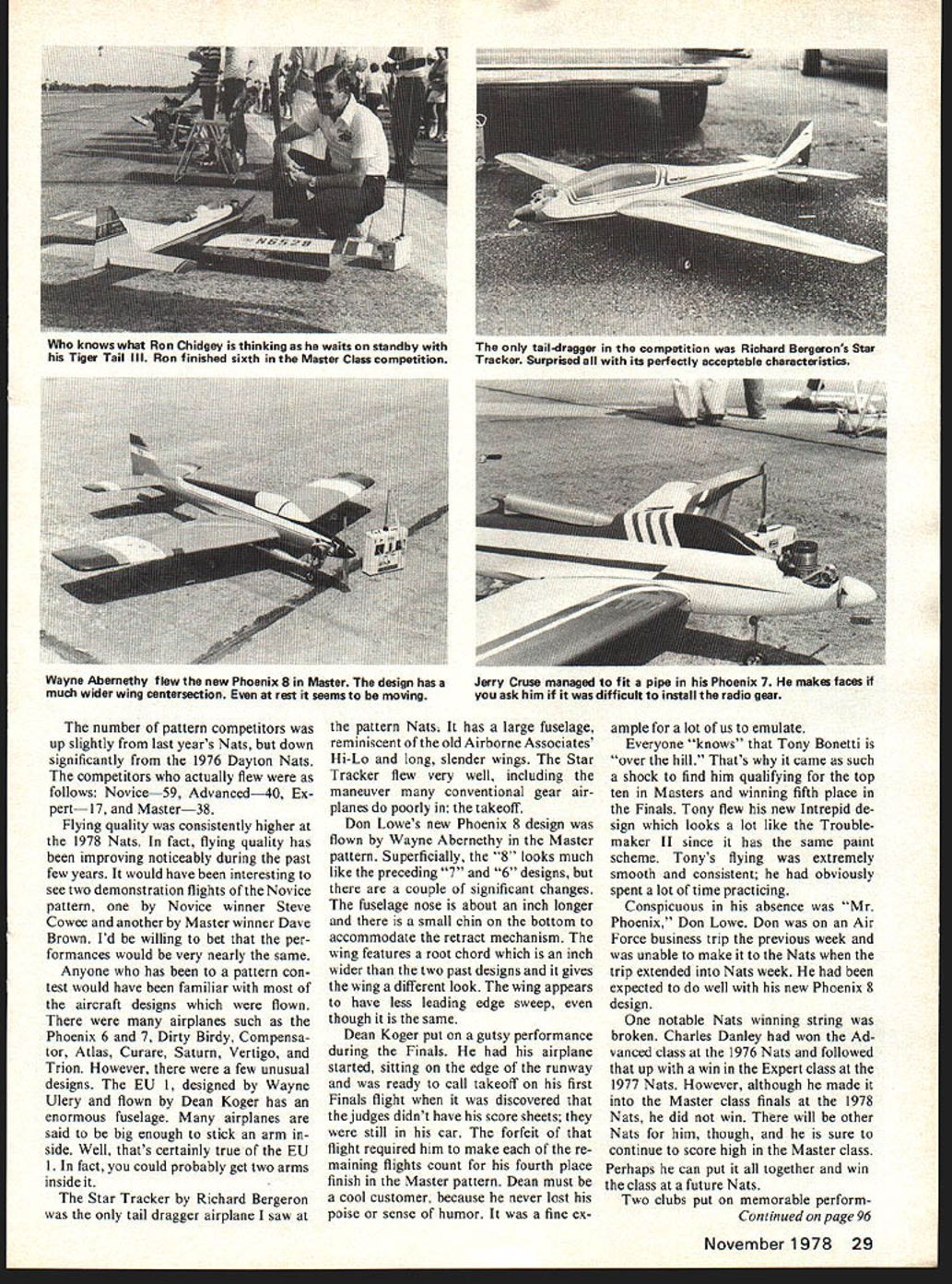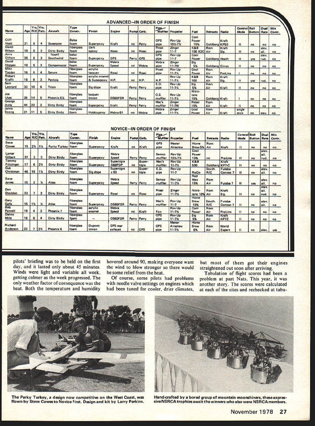 Chief Pattern Judge Julie Woods briefs competitors before Nets gin Pattern Director Betty Stream backs up girls ran pat tern did impressive flawless job No male chauvinists expres sionsof troops background confirmnote guy biting nails Meadames Edwards Koger Shade assist flight tabulation Site Two sites B common landing circle two lines Radio Control Pattern Director Betty Stream begins pilots brief ing just after rain Nets stopped Great weather 24 Model Aviation Suzi Stream Sally Brown assist transmitter processing uuve Brown charge practically Nationals transmitter processing U Left Taking wide stance during finals flight Marty Wittenberg won Expert Pattern Jim Keiger caller Right Marty discusses Bridi fellow flier Jim Kimbro 10-lb bird piped Rossi engine An interesting feature hand-made 10 x 7% prop THE 1978 Nats return Lake Charles Louisiana experience rivaled past two Lake Charles Nats site can hardly equaled perfect place hold competition variety space consuming requirements Na tional Model Airplane Championships RC site same location past two times combination afternoon flying near-perfect weather made 1978 RC aerobatic champion ships best yet competition conducted two sites approximately 1500 feet apart site two flight lines spotlanding circle single spot-landing cir cle shared two flight lines uncom mon contest circuit con test caliber Nats often expressed four circles sites sepa rated 600 800 feet would have better numerous instances two airplanes trying take off land same time trying land another took off obvious reason having four sites extra person nel necessary man positions would required control transmitters monitor frequencies conduct score tabu lation maintain contact other sites Consequently two-site system adopted Betty Stream did superb job RC Pattern Director seemed handling problems always smile can keep even-tempered cheerful face such pressure real credit heard about Stream Technique Contest Manage ment before going Lake Charles delighted see operation Bill Seidler John Targos Site Directors Sites B respectively hands full keeping things going assisting fliers moving back spectators other delightful jobs fall Site Directors Both Bill John should proud efforts Chief Judge Julie Woods put together fine set four judging teams teams judged complete round line November1978 25 Mark Radcliffs Phoenix also hides under sofa thunders Actually light-colored cloth smart trick protect airborne system heatinside temperatures soar high Dean Koger ponders nis score auring qualifying Note easy score board read contrast some past Nationals Ron considered Nets best ever attended MASTERIN ORDER OF FINISH Yre YrsTypeFlControl RollDuel Mix NemeAge RIC PeftAiroaftConstrFinlehEnginePump CerberPropellerFuelRetreats RedloMode Button Rate Contr alex DewfiberglassacrylicTop FliteRoGoWorldall Brown321110CurerefoamanamelOS6OFSRPerryPerryED pipe11-7 Supreme15%GoldberriExpert IInothrno Stew oolelex fiberglassacrylicRossiWebraRosniPowerrafteli Helms29206Bootleggerfoamenamelrear exhauntPerryDynamixRadio South2t4%KraftSig IInorudyes MerkfiberglansacrylicRossiRev UpRoGoSouthWorldsinglealex Fladcliff2310BPhOenix 7foamenamelRoasiPerrhPerrypipe11-7%15%R/CExpertsticknoallno DeanKevlar/MonokoteWebraRosgiMax Daileyalex Koger341110EU-iepoxy foamlmronWebra 61 noDynamix2..11-7i6LXraftProLine Iyeaallno TonyfibergiasaWebraOPSCoolKraft Bonetti481313IntrepidfoamHobbypoxyKraftPerryDynamix11-7YPowerraftSia Ilno nono alex RonfiberglassacrylicRoasiRoasiRadio SouthCoolSouthsingleall Chidgey462320Tiger Tail Illfoamenamelrear exhaustPerryWebrapipe10%-7YPowerR/CProLineatickyesrudyen alex TonyfiberglassacrylicEDRev UpRoGoWorldall Frackowiak22B3Phoenix 6foamenamelOSBOFSRPerryParryoiO1 1A-7 5%GjdpExpert IIrudno DonbelsaacrylicDPSOPSOPSRadio SouthHomeKraftsinglealex Weitz3065Deceptionfoamenamelrear exhaust nolide wiwo11-TABrewKrsftSigsticknoallyes alex CharlesfiberglassSuperpoxy &OPSZingerStanfieldSouthall Danley27B4Atlasfoam9obbypoxyOS6OFSRPerry11-7WPremiumRI...ProLineJJ.~rudno BruceWebraRossiRev UpCoolRomelex Underwood402812CompensatorbelsaSuperpoxySpeedPerryPerry10A-7/PowerAirProLine IInorudno EXPERTIN ORDER OF FINISH Yrs YraTypePi2gControl Roll Duel Mix NameAge R/C PattAiroaftCowerPiniahEnginePump Carb1iufflerPropellerFuelRetractsRadioMode Button Rate Contr slav MartybelsaRossiRossiHandcraftedHomeSouthall WittenberglB43DeceptionfoamSuparpoxywar exhaustnoRossiolpe10%-7YBrewR/CKrafc Inorudno Cool EdbaItsacrylicFoxRex UpPowerRom rse Hartley465BMachensatorfoamenamelWebranoWebrapipe1 1-7A25%AirProLine Ino nono BK RobertMonokoteOPSZingerChampion Redmon3264DriginalbalsaSuperpoxyOPSnoOPSoJ2.11-7PAl3oldbei- Iyen nono DannyCompennatorbalsaOPSRed Ramany1953modifiedlfoamSuperpoxyOPSyesDPSolpeZingerMaxProLineProLine Ino nono alex StewfiberglassMonokoteWebraPowerRomKraftall Stricker16724foamSuperpoxyEnyx XFno91o2.....ZingarSlantAirKP7C IInorudyes RodfiberglassHPRev UpCoolSouth gle Barnen4373Phoenix 7foamIsaronOS6OFSRPerryPerryoipa11-7YPowerR/CPraLine sticknoallno MaryfiberglassSuper-EDRex UpPowerall Ingerson2253Dirty BirdyfoamSuperpoxyOS6OFSR notigrapipe11-7V5%ProLineraft IInorudno Red MichaelfiberglassWebraOPSZingarMatRom Johncock1575PhoenitSfoamSuperpoxySpeedPerryPerryolpe11-7W10%AirProLineIIyesallno TerrsncefiberglassacrylicOPSCoolIqomsingle Mshady36BBDirty BirdyfoamlacquerOPSPerryOPSo2e.....Radio SouthPowerAirProLinesticknoxiino DavidMonokoteOPSRom McKenzie2175Dirty BirdybaitsSuperpoxyWabranoWebrapipeZingerStanfiald AirProLineIInonono rotated next line next round four rounds qualifying Competi tion completed fliers equal exposure front judges fifth round qualifying Julie reordered judging teams balance high low judges Since finals also four rounds same judge rotation used obtain equal exposure Julie very concerned about judging fliers agreed 1978 Nats best judging long time Weather wasnt really factor Nats Despite arrival Hurricane Amelia Texas coast day fore Nats begin expected severe rainfall never materialized significant rain