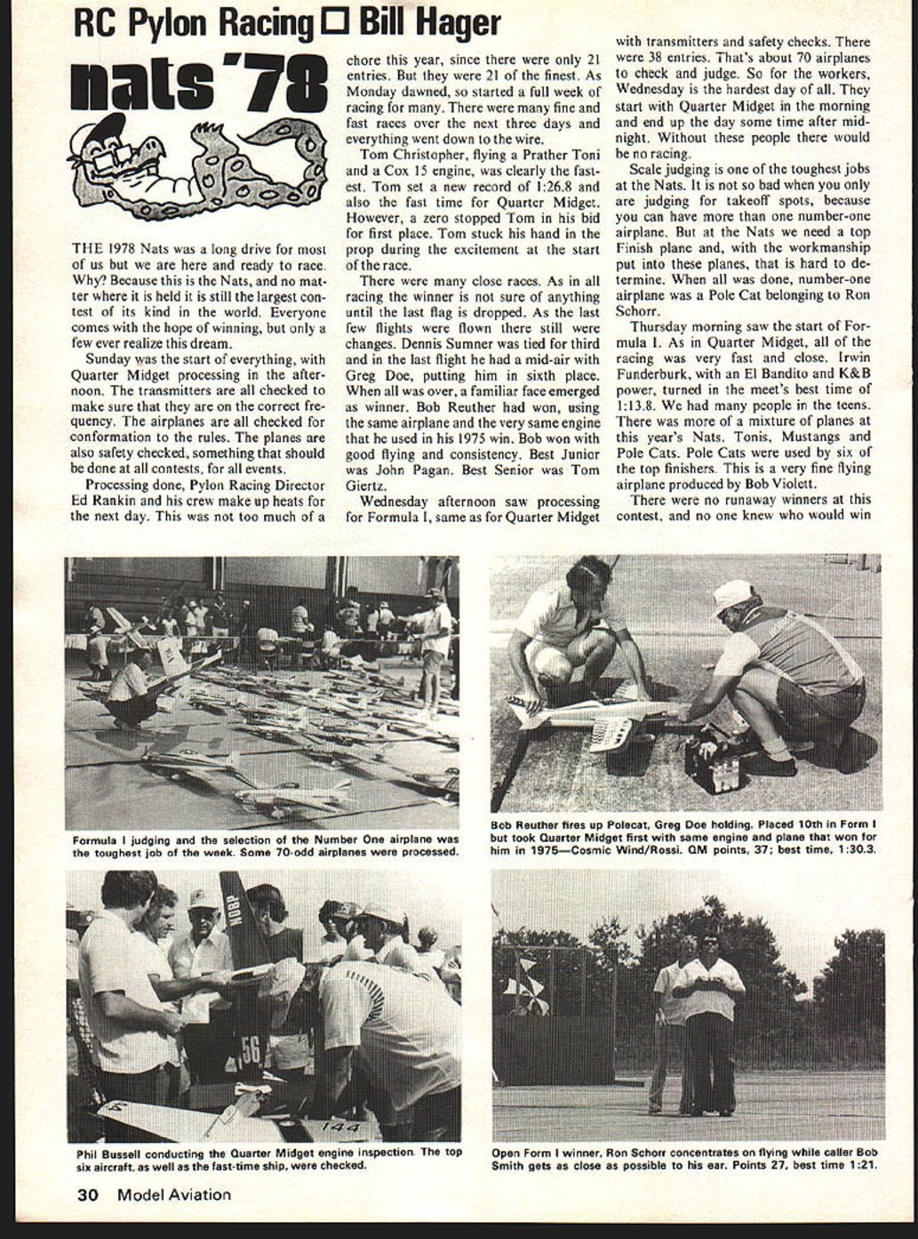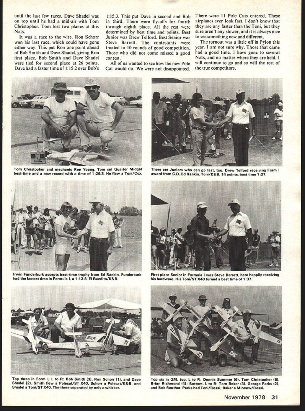 RC Pylon Racing IJ Bill Hager THE 1978 Nats long drive us ready race Because Nats no mat ter held still largest con test its kind world Everyone comes hope winning few ever realize dream Sunday start everything Quarter Midget processing after noon transmitters checked make sure correct fre quency airplanes checked conformation rules planes also safety checked something should done contests events Processing done Pylon Racing Director Ed Rankin crew make up heats next day too much chore year since 21 entries 21 finest As Monday dawned started full week racing fine fast races over next three days everything went down wire Tom Christopher flying Prather Toni Cox 15 engine clearly fast est Tom set new record 1268 also fast time Quarter Midget However zero stopped Tom bid first place Tom stuck hand prop during excitement start race close races As racing winner sure anything until last flag dropped As last few flights flown still changes Dennis Sumner tied third last flight mid-air Greg Doe putting him sixth place over familiar face emerged winner Bob Reuther won using same airplane very same engine used 1975 win Bob won good flying consistency Best Junior John Pagan Best Senior Tom Giertz Wednesday afternoon saw processing Formula same Quarter Midget transmitters safety checks 38 entries Thats about 70 airplanes check judge So workers Wednesday hardest day start Quarter Midget morning end up day some time after mid night Without people would no racing Scale judging toughest jobs Nats bad judging takeoff spots because can have number-one airplane Nats need top Finish plane workmanship put planes hard de termine done number-one airplane Pole Cat belonging Ron Schorr Thursday morning saw start mula As Quarter Midget racing very fast close Irwin Funderburk El Bandito K&B power turned meets best time 1138 people teens mixture planes years Nats Tonis Mustangs Pole Cats Pole Cats used six top finishers very fine flying airplane produced Bob Violett no runaway winners contest no knew would win 30 Model Aviation Formula judging selection Number airplanu WdS toughest job week Some 70-odd airplanes processed Bob Reuther fires up Polecat Greg Doe holding Placed 10th Form took Quarter Midget first same engine plane won him 1975Cosmic Wind/Rossi GM points 37 best time 1303 Phil Uusseii conducting tne uuarter Midget engine inspection ins top six aircraft well fast-time ship checked Open Form winner Ron Schorr concentrates flying caller Bob Smith gets close possible ear Points 27 best time 121 until last few races Dave Shadel top until mid-air Tom Christopher Tom lost two planes Nats race wire Ron Schorr won last race could have gone either way put Ron point ahead Bob Smith Dave Shadel giving Ron first place Bob Smith Dave Shadel tied second place 26 points Dave faster time 1152 over Bobs 1153 put Dave second Bob third fly-offs fourth through eighth place rest determined best time points Best Junior Drew Telford Best Senior Steve Barrett contestants treated 10 rounds good competition did come missed good contest us wanted see new Pole Cat would disappointed 11 Pole Cats entered airplanes look fast dont know faster Toni sure arent slower always nice see something new different turnout little off Pylon year am sure came good time have gone several Nats no matter held will continue go will rest true competitors November1978 31 iom InrIstopner ana mecnanic lion Young loin set uuarter iaget best-time new record time 1263 flew Toni/Cox lucre Juniors can go fast too Drew Telford receiving Form award CD Ed Rankin Toni/K&B 14 points best time 137 Irwin Funderburk accepts best-time trophy co liankin 1-unoerourK fastest time Formula 1138 El Bandito/K&B First place Senior Formula Steve Barrett happily receiving hia hardware Toni/ST X40 turned best time 137 Top three Form L R Bob Smith 3 Ron Schorr 11 Dave Shadel 2 Smith flew Polecat/ST X40 Schorr Polecat/K&B Shadel Toni/ST X40 three separated whisker Top six QM top L R Dennis Summer 6 Tom Cnristopher ioi Brian Richmond 4 Bottom R Tom Baker 3 George Parks 2 Bob Reuther Parks Toni/Rossi Baker Minnow/Rossi