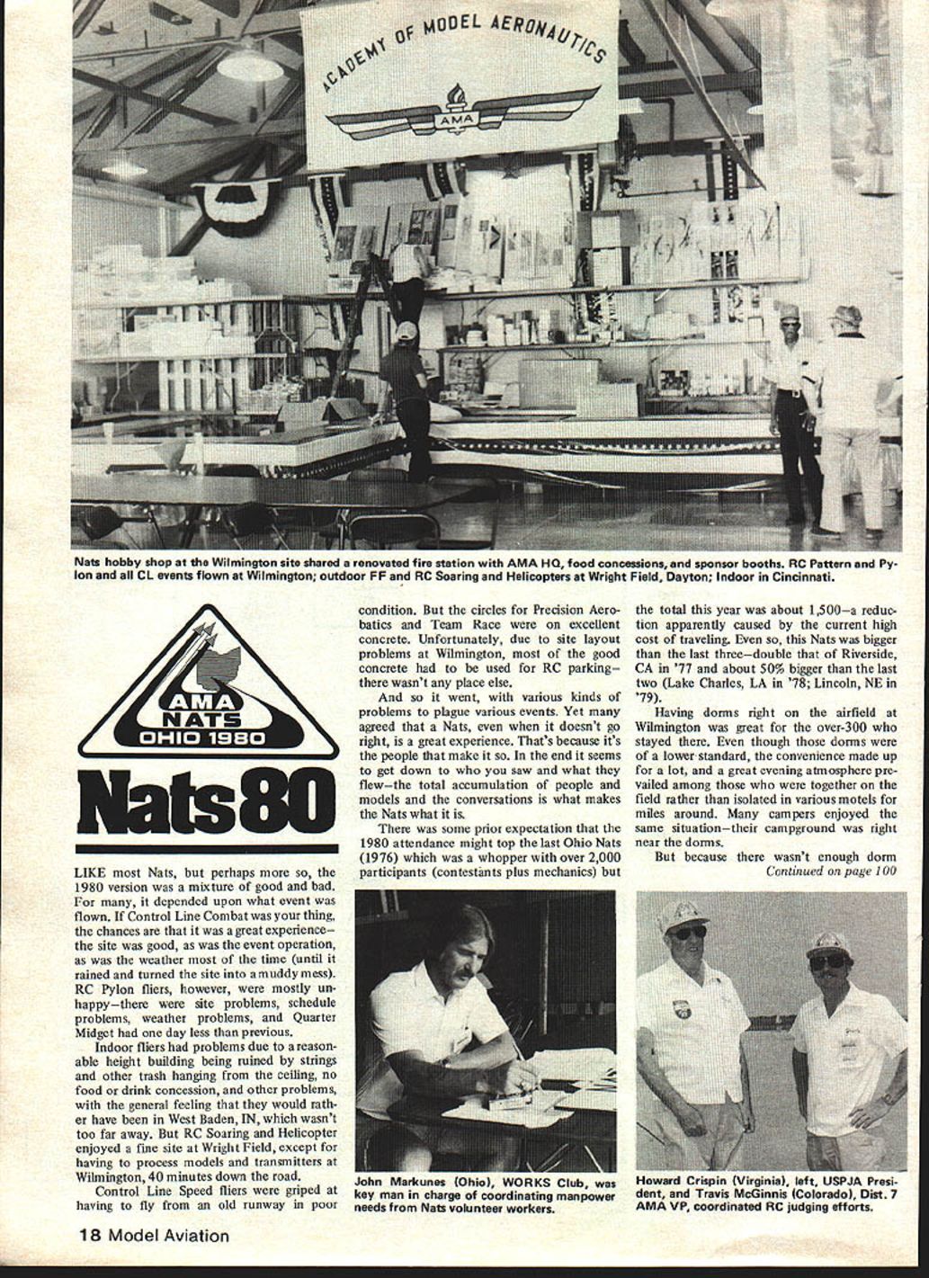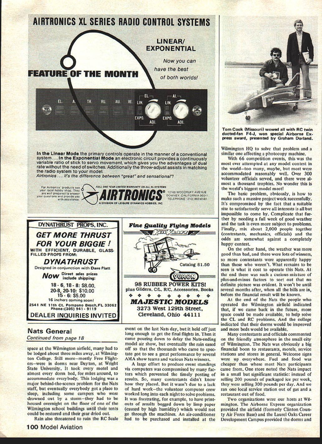 NatsU LIKE Nats perhaps 1980 version mixture good bad depended upon what event flown Control Line Combat thing chances great experience site good event operation weather time until rained turned site muddy mess RC Pylon fliers however mostly un happythere site problems schedule problems weather problems Quarter Midget day less previous Indoor fliers problems due reason able height building being ruined strings other trash hanging ceiling no food drink concession other problems general feeling would rath er have West Baden IN wasnt too far away RC Soaring Helicopter enjoyed fine site Wright Field except having process models transmitters Wilmington 40 minutes down road Control Line Speed fliers griped having fly old runway poor condition circles Precision Aero batics Team Race excellent concrete Unfortunately due site layout problems Wilmington good concrete used RC parking wasnt place else went various kinds problems plague various events Yet agreed Nats doesnt go right great experience Thats because its people make end seems get down saw what flewthe total accumulation people models conversations what makes Nats what some prior expectation 1980 attendance might top last Ohio Nats 1976 whopper over 2000 participants contestants plus mechanics total year about 1500a reduc tion apparently caused current high cost traveling Nats bigger last threedouble Riverside CA 77 about 50% bigger last two Lake Charles LA 78 Lincoln NE 79 Having dorms right airfield Wilmington great over-300 stayed though dorms lower standard convenience made up lot great evening atmosphere pre vailed among together field rather isolated various motels miles around campers enjoyed same situationtheir campground right near dorms because wasnt enough dorm Continued poge 100 18 Model Aviation Nats hobby shop Wilmington site shared renovated fire station AMA HO food concessions sponsor booths RC Pattern Py lon CL events flown Wilmington outdoor FF RC Soaring Helicopters Wright Field Dayton Indoor Cincinnati John Markunes Ohio WORKS Club key man charge coordinating manpower needs Nats volunteer workers Howard Crispin VirginiaI lett Presi dent Travis McGinnis Colorado Dist 7 AMA VP coordinated RC judging efforts Nats General Continued page 18 space Wilmington airfield lodged about three miles away Wilming ton College Still moremostly Free Flight erswere dorms near Dayton Wright State University took motel almost dorm bed miles around accommodate everybody lodging major behind-the-scenes problem Nats staff eventually everybody got place sleep including some campers drowned out stormthey housed overnight floor Wilmington school buildings until tents could restored gear dried out Rain also threatened ruin RC Scale Catalog S150 Fine Quality Flying Models 98 RUBBER POWER KITS plus Gliders C/L R/C Accessories Books MAJESTIC MODELS 3273 West 129th Street Cleveland Ohio 44111 event last Nats day held off just long enough get final flights came pouring down delay Nats-ending model air show eventually rain eased off thousands came spectate got see great performance several AMA show teams various Nats winners large effort produce event standings via computers compromised fac tors prevented timely posting results So contestants didnt know placed wasnt due lack hard workthe volunteer computer crew worked long night solve problems frustrating example have print outs results bogged down limp paper caused high humidity would go through machines An air-conditioner purchased installed Wilmington HQ solve problem similar affecting photocopy machine 66 competition events ever attempted model contest worldtoo maybe accommodated reasonably well Over 300 volunteer officials served al thousand trophies No wonder worlds biggest model meet basic problem obviously make such massive project work successfully Its compromised fact suitable site satisfactorily serve interests impossible come Complicate fur ther needing full week good weather task subject problems Finally mix about 2000 people together contestants mechanics officials odds somewhat against completely happy contest other hand weather good bad lots winners contestants apparently happy werent What remains seen what cost operate Nats end such curious mixture plus-and-minus factors sort out no definite picture evident wont until several months after bills before financial result will known end Nats people operated Wilmington airfield indicated came back future space could made available help solve CL RC problems college indicated dorms would improved beds would available contestants officials commented friendly atmosphere small city Wilmington Nats obviously big financial boon restaurants motels service stations stores general Welcome signs up everywhere Fuel food cheaper Nats participants came store noted Nats impact small significant statistic instead selling 200 pounds packaged ice per week selling 300 pounds per day ran local service station out gas restaurant out food Two organizations hosts Wil mington Airborne Express organization provided airfield formerly Clinton Coun ty Air Force Base Laurel Oaks Career Development Campus provided dorms 100 Model Aviation Tom Cook Missouri wowed RC twin ducted-fan F4-J won special Airborne Ex press award presented Graham Dorland DYNATI-IRUST PROPS INC GET MORE THRUST FOR YOUR BIGGIE WITH EFFICIENT DURABLE GLASSFILLED PROPS FROM DYNA THRUST Designed conjunction Dave Platt NDirect sales prices OVt include shipping 18- 618-8 $800 20-8 20-10 $1000 15-6 $500 16 inchers coming soon 2541 NE 11th Ct Pompano Beach FL 33062 Phone305 941-9119 DEALER INQUIRIES INVITED other buildings Nats Assistance al provided Jaycees Jayceettes operating AMA Cub Delta Dart pro gram Other help given Wilmington Chamber Commerce also Southern State Community College printing daily Nats News Wright Field Air Force provided flying site well enjoyed except food drink concession provided Air Force Exchange woefully adequatenot mobile too small located too far away action also traffic pa
