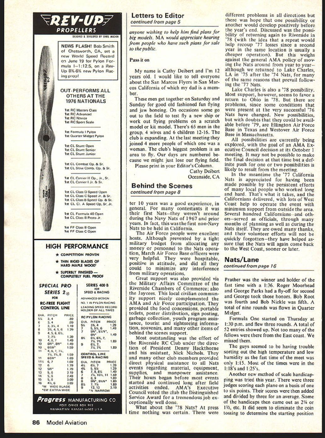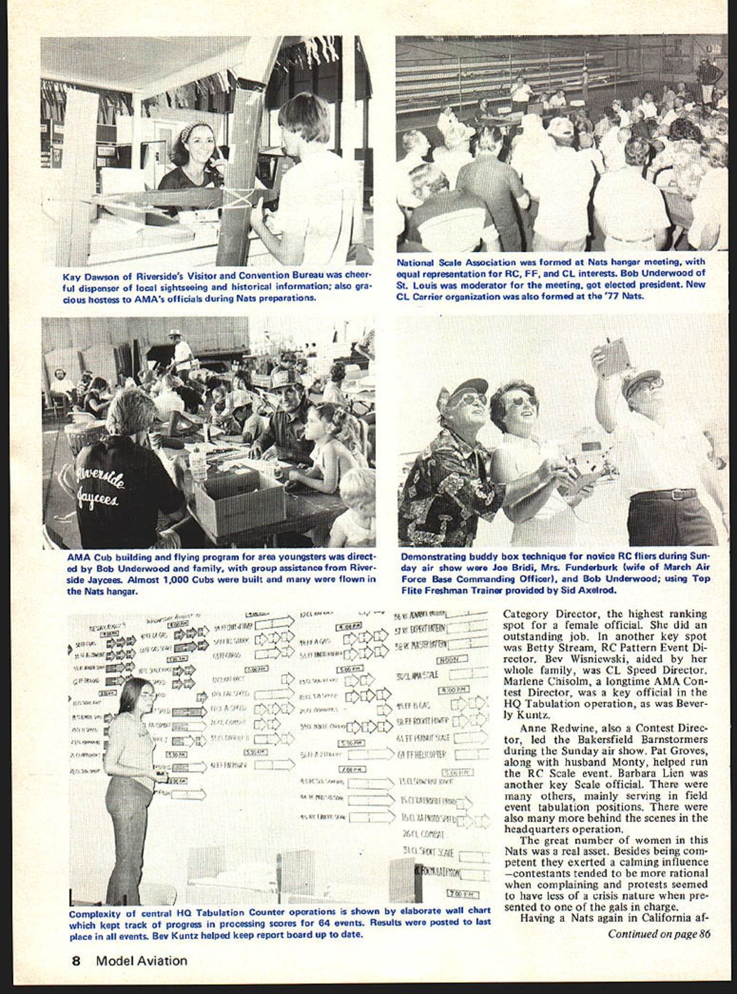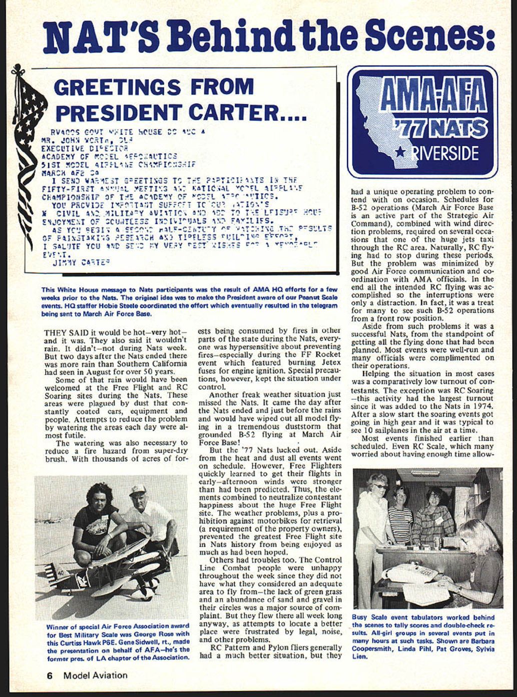 NATS Behind Scenes GREETINGS FROM PRESIDENT CARTER.. RV~ JITE iC .E 7 i .. \ EXECUTIJE DIETC *CDEY CF rEL E~.LTIC3 i4ACH FE NJ 1iT EETIGS T T Tii \TS PiF S FIFTY FIET L -EFTIS ~ ti L CL ILF YOU PiCVIE IT5T SUFFrrT TCU V715\S \ rYET OF ZClJiTLE3 II.1iALS LJTF YCU VD S2 Y VFY -EY t JlY C~TE9 White House message Nats participants result AMA HO efforts few weeks prior Nats original idea make President aware Peanut Scale events HO staffer Hobie Steele coordinated effort eventually resulted telegram THEY SAID would hotvery hot also said wouldnt rain didntnot during Nats week two days after Nats ended rain Southern California seen August over 50 years Some rain would have welcomed Free Flight RC Soaring sites during Nats areas plagued dust con stantly coated cars equipment people Attempts reduce problem watering areas day al futile watering also necessary reduce fire hazard super-dry brush thousands acres forests being consumed fires other parts state during Nats hypersensitive about preventing firesespecially during FE Rocket event featured burning Jetex fuses engine ignition Special precau tions however kept situation under controL Another freak weather situation just missed Nats came day after Nats ended just before rains would have wiped out model fly ing tremendous duststorm grounded B-52 flying March Air Force Base 77 Nats lucked out Aside heat dust events went schedule However Free Flighters quickly learned get flights earlyafternoon winds stronger predicted Thus ele ments combined neutralize contestant happiness about huge Free Flight site weather problems plus pro hibition against motorbikes retrieval requirement property owners prevented greatest Free Flight site Nats history being enjoyed much hoped Others troubles too Control Line Combat people unhappy throughout week since did have what considered adequate area fly fromthe lack green grass abundance sand gravel circles major source com plaint flew week long anyway attempts locate better place frustrated legal noise other problems RC Pattern Pylon fliers generally much better situation unique operating problem con tend occasion Schedules B-52 operations March Air Force Base active part Strategic Air Command combined wind direc tion problems required several occa sions huge jets taxi through RC area Naturally RC fly ing stop during periods problem minimized good Air Force communication co ordination AMA officials end intended RC flying ac complished interruptions distraction fact treat see such B-52 operations front row position Aside such problems successful Nats standpoint getting flying done planned Most events well-run officials complimented operations Helping situation cases comparatively low turnout con testants exception RC Soaring activity largest turnout since added Nats 1974 After slow start soaring events got going high gear typical see 10 sailplanes air time Most events finished earlier scheduled RC Scale worried about having enough time allow6 Model Aviation being sent March Air Force Base Winner special Air Force Association award Best Military Scale George Rose Curtiss Hawk P6E Gene Sidwell rt made presentation behalf AFAhes former pres LA chapter Association Busy Scale event tabulators worked behind scenes tally scores double-check re suIts All-girl groups several events put hours such tasks Shown Barbara Coopersmith Linda PihI Pat Groves Sylvia Lien ance finished several hours spareafter three rounds flying same events gen erally agreed however num ber contestants same 76 Nats would have problems 77 biggest effect overall low contestant turnout financial 1976 Nats produced almost $42000 entry fees compared about $27000 year Considering takes $50000 put Nats lower income serious problem reasons low turnout discussed widely during Nats incorrect example lamented contestants east Rockies largely stayed away years Nats Frequently men tioned contributing factor fact Canadian Nats held east couple weeks earlier Nats Executive Committee members noted Nats always mostly local event small percentage days drive away respect 77 Nats typical California consistent past Nats history also noted West Coasters contestants other California events did show Nats prime example quoted annual Bakersfield RC Pylon meet contestants seen Riverside side effects over 100 Nats trophies presented simply because enough contestants entered events Free Flight Control Line events par ticularly plagued problem Yet small Nats over 1000 contestants Almost 200 late entries registered Nats rather pre-entered mail addi tion 1061 contestants 419 mechanics Thus almost 1500 registered participants addition well over 400 officials RC contestants456 total Outdoor FF 351 Control Line 341 Indoor 140 large RC total noted have result ed fact contestants entered event Thus Quarter Midget fliers typically did fly Formula Pattern Scale Sailplanes likewise RC events contrast FF contestants entered several events category same Indoor Control Line fliers differentCombat fliers mostly flew Combat several Combat events fly Similarly Speed Racing Carrier fliers several events enter within specialty Noteworthy year large number women officials key posi tions Patty Sasnett Control Line November1977 7 Busy AMA souvenir booth sold patches pins hats other items produce record come such Nats sales help pay Nats operating costs Volunteers manned booth seven days Key center support field events volunteer desk several hundred errands job assignments handled River side RC Club leaders Jerry Crowley Clyde Reed other club members throughout Nats week Hectic center activity AMA Nats HO trailer Processing entry forms typing event results financial accounting income expenses coordinating officials needs communications field events other operations carried out busy crew Washington DC Star Sunday air show 5-year-old Chip Gordon Hyde Yuma Arizona flew RC Ugly Stick unassisted except advice proud dad crowd loved Chip has flying RC past year -C d L ~ -9\ 14{J 14$ 1 I ROSJ r14 VL / L& r Li72 * 