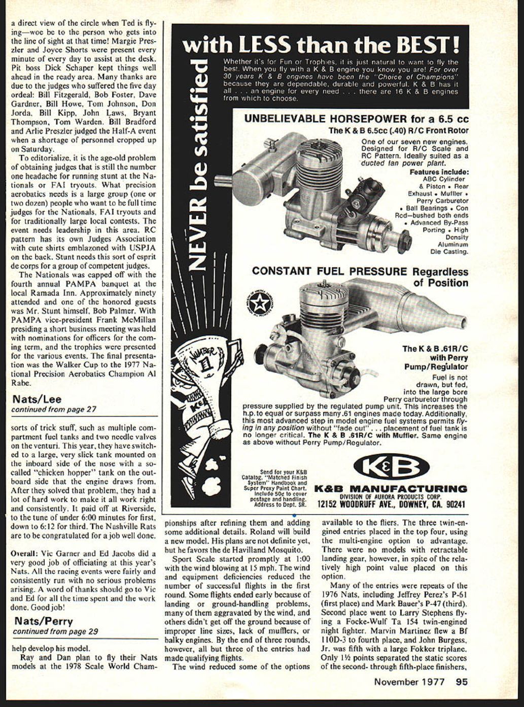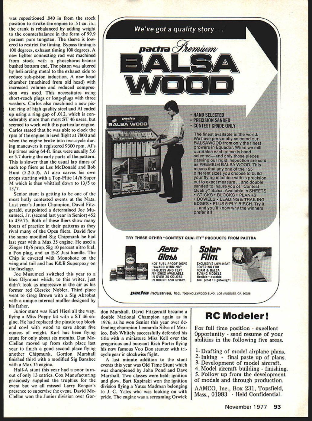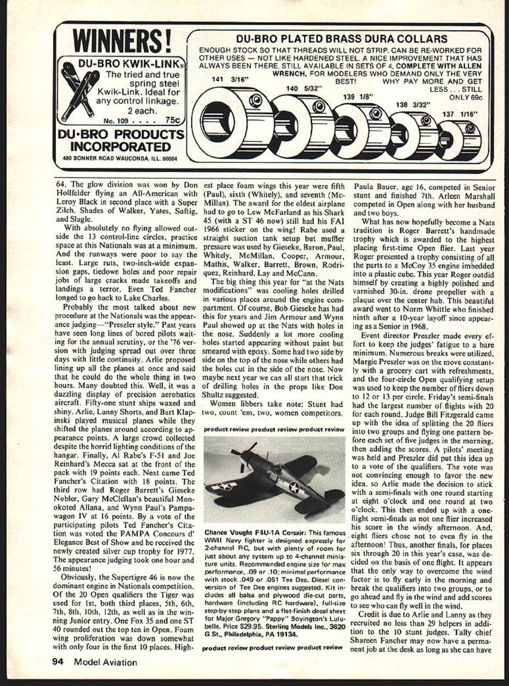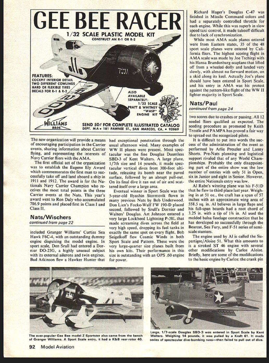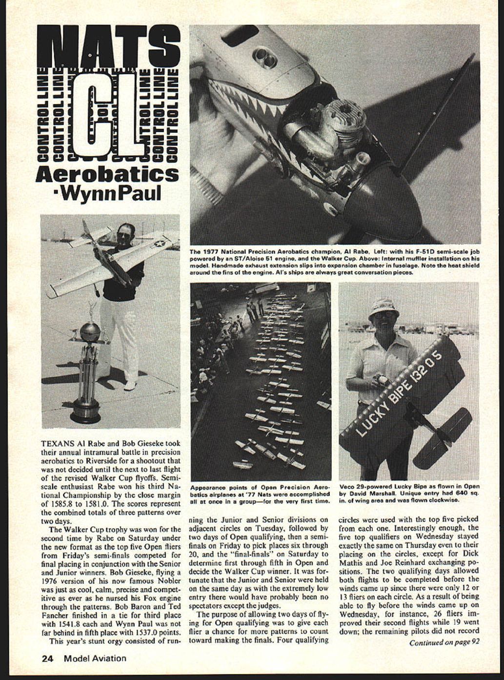 TEXANS Al Rabe Bob Gieseke took annual intramural battle precision aerobatics Riverside shootout decided until next last flight revised Walker Cup flyofis Semiscale enthusiast Rabe won third Na tional Championship close margin 15858 15810 scores represent combined totals three patterns over two days Walker Cup trophy won second time Rabe Saturday under new format top five Open fliers Fridays semi-finals competed final placing conjunction Senior Junior winners Bob Gieseke flying 1976 version now famous Nobler just cool calm precise compet itive ever nursed Fox engine through patterns Bob Baron Ted Fancher finished tie third place 15418 Wynn Paul far behind fifth place 15370 points years stunt orgy consisted runfling Junior Senior divisions adjacent circles Tuesday followed two days Open qualifying semi finals Friday pick places six through 20 final-finals Saturday determine first through fifth Open decide Walker Cup winner tunate Junior Senior held same day extremely low entry would have probably no spectators except judges purpose allowing two days fly ing Open qualifying give flier chance patterns count toward making finals Four qualifying circles used top five picked Interestingly enough five top qualifiers Wednesday stayed exactly same Thursday placing circles except Dick Mathis Joe Reinhard exchanging po sitions two qualifying days allowed both flights completed before winds came up since 12 13 fliers circle As result being able fly before winds came up Wednesday instance 26 fliers im proved second flights 19 went down remaining pilots did record Continued page 92 24 Model Aviation :L Aerobatics Wynn Paul 1977 National Precision Aerobatics champion Al Rabe Left F-510 semi-scale job powered ST/Aloise 51 engine Walker Cup Above Internal muffler installation model Handmade exhaust extension slips expansion chamber fuselage Note heat shield around fins engine Als ships always great conversation pieces Appearance points Open Precision Aero batics airplanes 77 Nats accomplished once groupfor very first time Veco 29-powered Lucky Bipe flown Open David Marshall Unique entry 640 sq wing area flown clockwise new organization will provide means encouraging participation Carrier events sharing information about Carrier flying representing interests Navy Carrier fliers AMA first official act organization establish Eugene Ely Award commemorates first man suc cessfully take off land aboard ship 1911 1912 award Na tionals Navy Carrier Champion re ceives total points three Carrier events Nats years award went Ron Duly accumulated 7869 points placed first Class Class II N ats/Wischers continued page 22 included Granger Williams Curtiss Sea Hawk F6C-4 outstanding dummy engine disguising model engine sport scale Don Srull entered Dor nier DO-23G highly unusual subject its external ailerons twin engines Bud Atkinson flew Hawker Hunter exceptional penetration through usual afternoon wind examples WW II planes present Most spec tacular fine Douglas Dauntless SBD-3 Kent Walters large plane 1/7th size 14 pounds made spec tacular vertical dives 300-foot alti tude releasing its bomb near paved surface followed abrupt pull-out its final dive ran out air scat tered itself over large area Eventual winner Sport Scale 5-year-old llyushin Stormovik flown previous Nats Bob Underwood Don Liens Focke-WuIf FW 190-D placed second followed Srulls Dornier Walters Douglas Art Johnson entered very large Lockheed Lightning P-38L made screaming dives across field very high speed dropping its fuel tanks exactly same spot flight Bob Seigelkoff flew Cosmic Winds both Sport Scale Pattern very large-quarter size planes built own kits performance size outstanding OPS 60 engine power Richard Hagers Douglas C-47 finished Missile Command colors separately controlled throttle engine superb slow speed taxi control made takeoff difficult due lack synchronization AMA scale planes entered Eastern states 35 48 sport scale planes entered Cali fornia fliers highest scoring flight AMA scale made Joe Tschirgi Hansa Brandenburg seaplane lifted off wheeled-dolly landed very slowly almost no forward motion skid along its keel Actually Joes plane should have entered Sport Scale entry AMA protest against pattern-like flight WW II fighter majority Sport Scale Nats/Paul continued page 24 two scores due crashes passing 12 seeded fliers qualified expected seeding procedure promoted Keith Trostle PAMPA has proved fair way spread out recognized pilots difficult put words suc cess administration event performed Arlie Preszler Lanny Shorts Pre-Nats planning logistical support rivaled World Cham pionships Probably disappoint ing part entire show low number entries 51 Open six Junior eight Senior However entire Nationals entry low Al Rabes winning plane F-51D flew third place last year Weigh ing 51 oz craft has span 57 inches approximate wing area 5585 sq Al believes large flaps full-span boards root chord 325 tip 1 Al used molded balsa fuselage construction has developed successfully through Bearcat Sea Fury F-5l series semiscale stunters engine used Al called Su pertigre/Aloise 51 What amounts stroked ST 46 engine several other modifications Carlos Aloise Briefly some modifications basic engine Carlos crank pin 92 Model Aviation GEE BEE RACER 1/32 SCALE PLASTIC MODEL KIT CONSTRUCT R-1 OR 1-2 SErAKRILf WASP SEND 5O FOR COMPLETE ILLUSTRATED CATALOG DEPT MA PAWNEE ST SAN MARCOS CA 92069 ne ever-popular uee ee mooel L portster aiso came tram tne DOflCfl Granger Williams Sport Scale entry K&B rear-rotor 40 Large I/I-scale uougias b5U-1 enxerea bport caie Ient Walters Weighing 14 pounds pulled Kraft 61 made series spectacular dive-bombing runsthen failed pull Out dive repositioned 040 stock position stroke engine 51 cu crank rebalanced adding weight counterbalance form 999 percent pure tungsten sleeve low ered restrict timing Bypass timing 100 degrees exhaust timing 108 degrees new lighter connecting rod machined stock phosphorus-bronze bushed bottom end piston al
