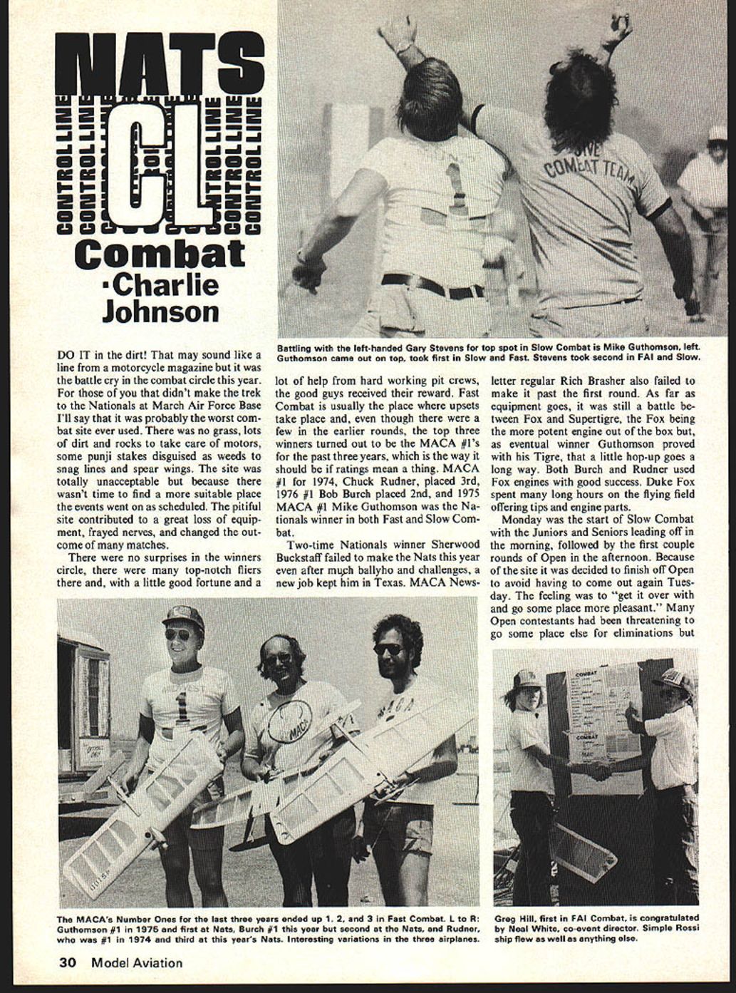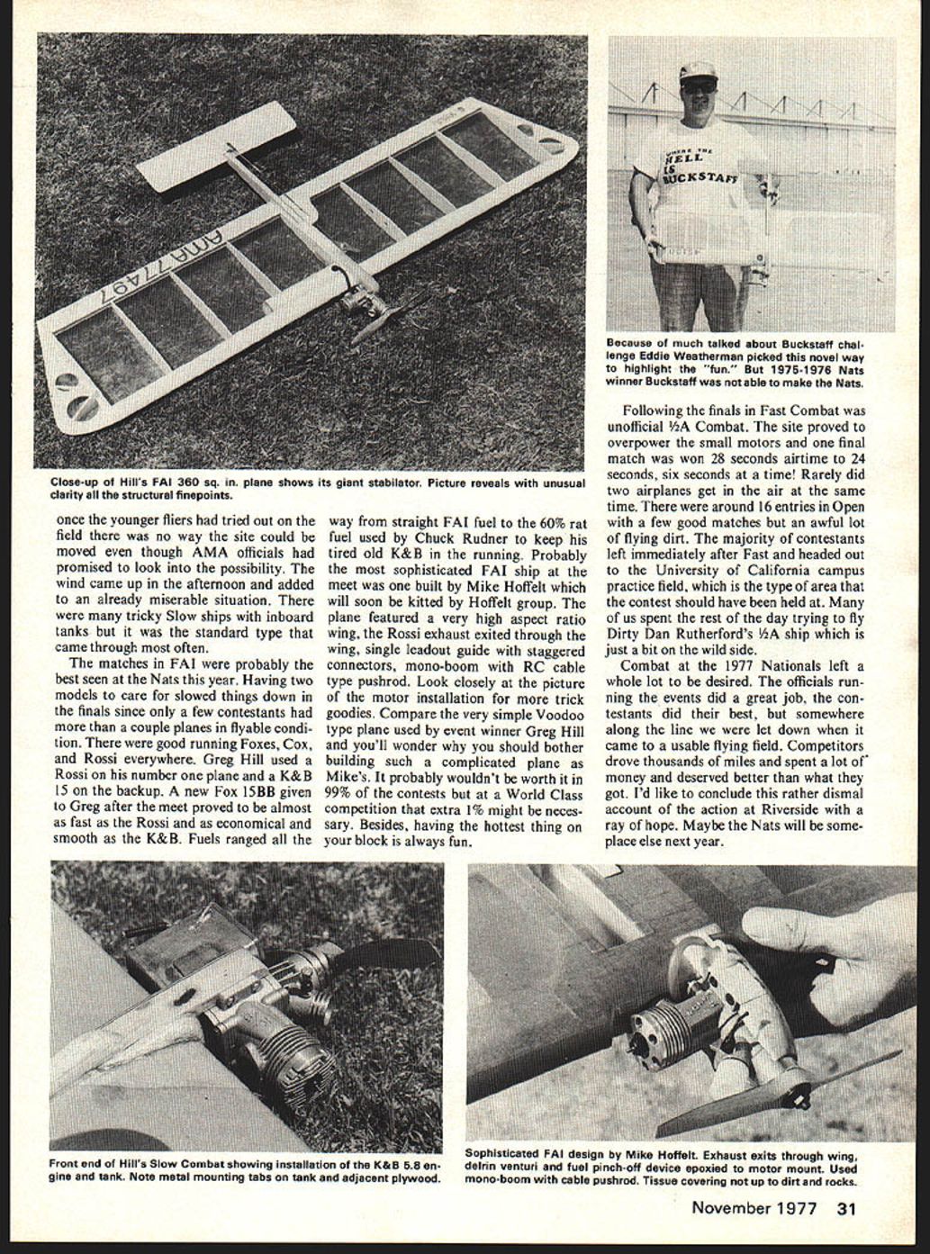 DO IT dirt may sound like line motorcycle magazine battle cry combat circle year didnt make trek Nationals March Air Force Base Ill say probably worst com bat site ever used no grass lots dirt rocks take care motors some punji stakes disguised weeds snag lines spear wings site totally unacceptable because wasnt time find suitable place events went scheduled pitiful site contributed great loss equip ment frayed nerves changed out come matches no surprises winners circle top-notch fliers little good fortune lot help hard working pit crews good guys received reward Fast Combat usually place upsets take place though few earlier rounds top three winners turned out MACA #1s past three years way should ratings mean thing MACA #1 1974 Chuck Rudner placed 3rd 1976 #1 Bob Burch placed 2nd 1975 MACA #1 Mike Guthomson Na tionals winner both Fast Slow Com bat Two-time Nationals winner Sherwood Buckstaff failed make Nats year after muh ballyho challenges new job kept him Texas MACA Newsletter regular Rich Brasher also failed make past first round As far equipment goes still battle tween Fox Supertigre Fox being potent engine out box eventual winner Guthomson proved Tigre little hop-up goes long way Both Burch Rudner used Fox engines good success Duke Fox spent long hours flying field offering tips engine parts Monday start Slow Combat Juniors Seniors leading off morning followed first couple rounds Open afternoon Because site decided finish off Open avoid having come out again Tues day feeling get over go some place pleasant Open contestants threatening go some place else eliminations 30 Model Aviation Johnson Battling left-handed Gary Stevens top spot Slow Combat Mike Guthomson left Guthomson came Out Ofl top took first Slow Fast Stevens took second FAI Slow MACAs Number Ones last three years ended up 1 2 3 Fast Combat Ito R Guthomson #1 1975 first Nats Burch #1 year second Nats Rudner #1 1974 third years Nats Interesting variations three airplanes Greg Hill first FAI Combat congratulated Neal White co-event director Simple Rossi ship flew well anything else once younger fliers tried out field no way site could moved though AMA officials promised look possibility wind came up afternoon added already miserable situation tricky Slow ships inboard tanks standard type came through often matches FAT probably best seen Nats year Having two models care slowed things down finals since few contestants couple planes flyable condi tion good running Foxes Cox Rossi everywhere Greg Hill used Rossi number plane K&B 15 backup new Fox l5BB given Greg after meet proved almost fast Rossi economical smooth K&B Fuels ranged way straight FAT fuel 60% rat fuel used Chuck Rudner keep tired old K&B running Probably sophisticated FAT ship meet built Mike Hoffelt will soon kitted Hoffelt group plane featured very high aspect ratio wing Rossi exhaust exited through wing single leadout guide staggered connectors mono-boom RC cable type pushrod Look closely picture motor installation trick goodies Compare very simple Voodoo type plane used event winner Greg Hill youll wonder should bother building such complicated plane Mikes probably wouldnt worth 99% contests World Class competition extra 1% might neces sary Besides having hottest thing block always fun Following finals Fast Combat unofficial /2A Combat site proved overpower small motors final match won 28 seconds airtime 24 seconds six seconds time Rarely did two airplanes get air same time around 16 entries Open few good matches awful lot flying dirt majority contestants left immediately after Fast headed out University California campus practice field type area contest should have held us spent rest day trying fly Dirty Dan Rutherfords ship just bit wild side Combat 1977 Nationals left whole lot desired officials run ning events did great job con testants did best somewhere along line let down came usable flying field Competitors drove thousands miles spent lot money deserved better what got Id like conclude rather dismal account action Riverside ray hope Maybe Nats will some place else next year November 1977 31 Because much talked about Buckstaff chal lenge Eddie Weatherman picked novel way highlight fun 1975-1976 Nats winner Buckstaff able make Nats Closeup Hills FAI 360 sq plane shows its giant stabilator Picture reveals unusual clarity structural finepoints Front end Hills Slow Combat showing installation K&B 58 en gine tank Note metal mounting tabs tank adjacent plywood Sophisticated FAI design Mike Hoffelt Exhaust exits through wing deirin venturi fuel pinch-off device epoxied motor mount Used mono-boom cable pushrod Tissue covering up dirt rocks