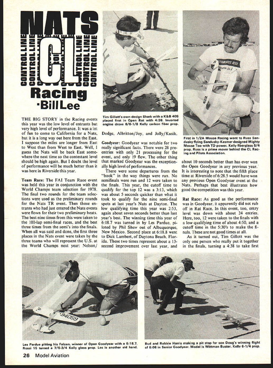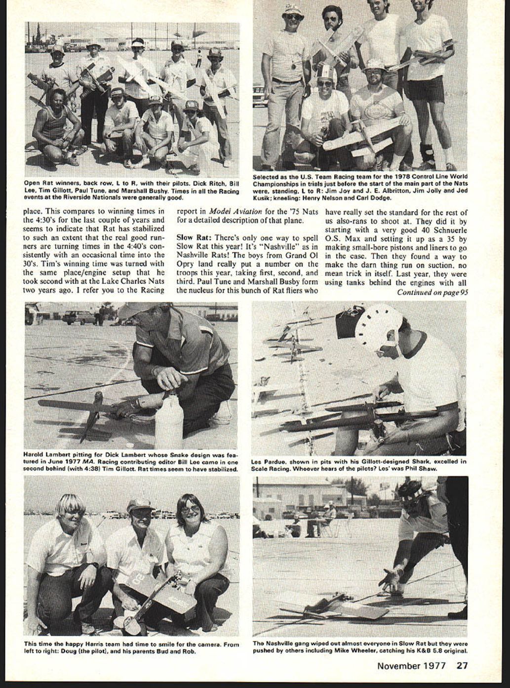 I inJinImilmimi UPmm mmmum mm mm 00130 Racing BiII Lee THE BIG STORY Racing events year low level entrants very high level performance lot fun come California Nats long way out East suppose miles longer East West West East Well guess Nats will back East some next time contestant level should high again doubt level performance will much better Riverside year Team Race FAI Team Race event held year conjunction World Champs team selection 1978 final two rounds team selec tions used preliminary rounds Nats TR event en trants just entered Nats events flown two preliminary heats best nine times taken 100-lap semi-final races best three times semis finals said done first three places Nats event taken three teams will represent US World Champs next year Nelson/ Dodge Aibritton/Joy Jolly/Kusik Goodyear Goodyear notable two really significant facts 28 pre entries 21 processing event 19 flew other thing marked Goodyear exception ally high level performances some departures book way things run No semifinals run 12 taken finals year cutoff time qualifi top 12 313 about 5 seconds quicker what took qualify nine semi-final spots last years Nats Dayton low qualifying time year 253 again about seven seconds better last years best winning time year 6187 turned Les Pardue pi loted Phil Shew out Albuquerque New Mexico Second place 6188 went Dick Lambert Daytona Beach Flor ida two times represent about 13second improvement over last year about 10 seconds better has ever won Open Goodyear previous year interesting note fifth place time Riverside 6285 would have won previous Open Goodyear event Nats Perhaps best illustrates good competition year Rat Race As good performance Goodyear apparently did rub off Rat Race event too entry level down about 24 entries too 12 taken finals low qualifying time about 450 cutoff time 530s make fi nals good times As turned out Tim Gillott person really put together finals turning 438 take first 26 Model Aviation Tim Gillotts own-design Shark K&B 40S placed first Open Rat 438 Inverted engine drove 8/8-1/8 Kelly carbon fiber prop First 1/2A Mouse Racing went Russ Sandusky flying Sandusky-Kasmer designed Mighty Mouse Too TD power Kelly fiberglass 5/4 prop Russ prime mover behind CL Rac ing Pilots Association Las Pardue pitting Falcon winner Open Goodyear 6187 Rossi 15 turned 7/53/4 Kelly glass prop Les another old hand Bud Robbie Harris making pit stop son Dougs winning flight 606 Senior Goodyear Modal Wittman Buster Kelly 6-1/4 prop place compares winning times 430s last couple years seems indicate Rat has stabilized such extent real good run ners turning times 440s con sistently occasional time 30s Tims winning time turned same place/engine setup took second Lake Charles Nats two years ago refer Racing report Model Aviation 75 Nats detailed description plane Slow Rat Theres way spell Slow Rat year Its Nashville~ Nashville Rats boys Grand 01 Opry land really put number troops year taking first second third Paul Tune Marshall Busby form nucleus bunch Rat fliers have really set standard rest us also-rans shoot did starting very good 40 Schnuerle 0S Max setting up 35 making small-bore pistons liners go case found way make darn thing run suction no mean trick itself Last year using tanks behind engines Continued page 95 November1977 27 Open Rat winners back row R pilots Dick Ritch Bill Lee Tim Gillott Paul Tune Marshall Bushy Times Racing events Riverside Nationals generally good Selected US TUUITI naumFig ontrol Line World Championships trials just before start th-uu nlaIn part Nats standing R Jim Joy J E Albritton Jim Jolly Jed Kusik kneeling Henry Nelson Carl Dodge Harold Lambert pitting Dick Lambert Snake design fea tured June 1977 MA Racing contributing editor Bill Lee came second behind 4381 Tim Gillott Rat times seem have stabilized Lea Pardue shown pits Gillott-designed Shark excelled Scale Racing Whoever hears pilots les Phil Shaw time happy Harris team time smile camera left right Doug pilotl parents Bud Rob Nashville gang wiped Out almost everyone Slow Rat pushed others including Mike Wheeler catching K&B 58 original direct view circle Ted fly ingwoe person gets line sight time Margie Pres zier Joyce Shorts present minute day assist desk Pit boss Dick Schaper kept things well ahead ready area thanks due judges suffered five day ordeal Bill Fitzgerald Bob Foster Dave Gardner Bill Howe Tom Johnson Don Jorda Bill Kipp John Laws Bryant Thompson Tom Warden Bill Bradford Arlie Preszler judged Half-A event shortage personnel cropped up Saturday editorialize age-old problem obtaining judges still number headache running stunt Na tionals FAI tryouts What precision aerobatics needs large group two dozen people want full time judges Nationals FAI tryouts traditionally large local contests event needs leadership area RC pattern has its own Judges Association cute shirts emblazoned USPIA back Stunt needs sort esprit de corps group competent judges Nationals capped off fourth annual PAMPA banquet local Ramada Inn Approximately ninety attended honored guests Mr Stunt himself Bob Palmer PAMPA vice-president Frank McMillan presiding short business meeting held nominations officers com ing term trophies presented various events final presenta tion Walker Cup 1977 Na tional Precision Aerobatics Champion Al Rabe N ats/Lee continued page 27 sorts trick stuff such multiple com partment fuel tanks two needle valves venturi year have switch ed large very slick tank mounted inboard side nose socalled chicken hopper tank out board side engine draws After solved problem lot hard work make work right consistently paid off Riverside tune under 600 minutes first down 612 third Nashville Rats congratulated ajob well done Overall Vic Garner Ed Jacobs did very good job officiating years Nats racing events fairly consistently run no serious problems arising word thanks should go Vic Ed time spent work done Good job N ats/Perry continued page 29 pionships after refining adding some additional details Roland