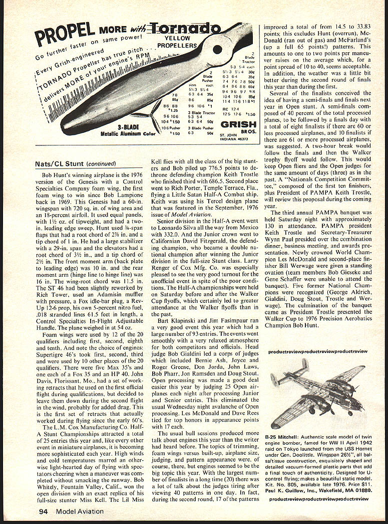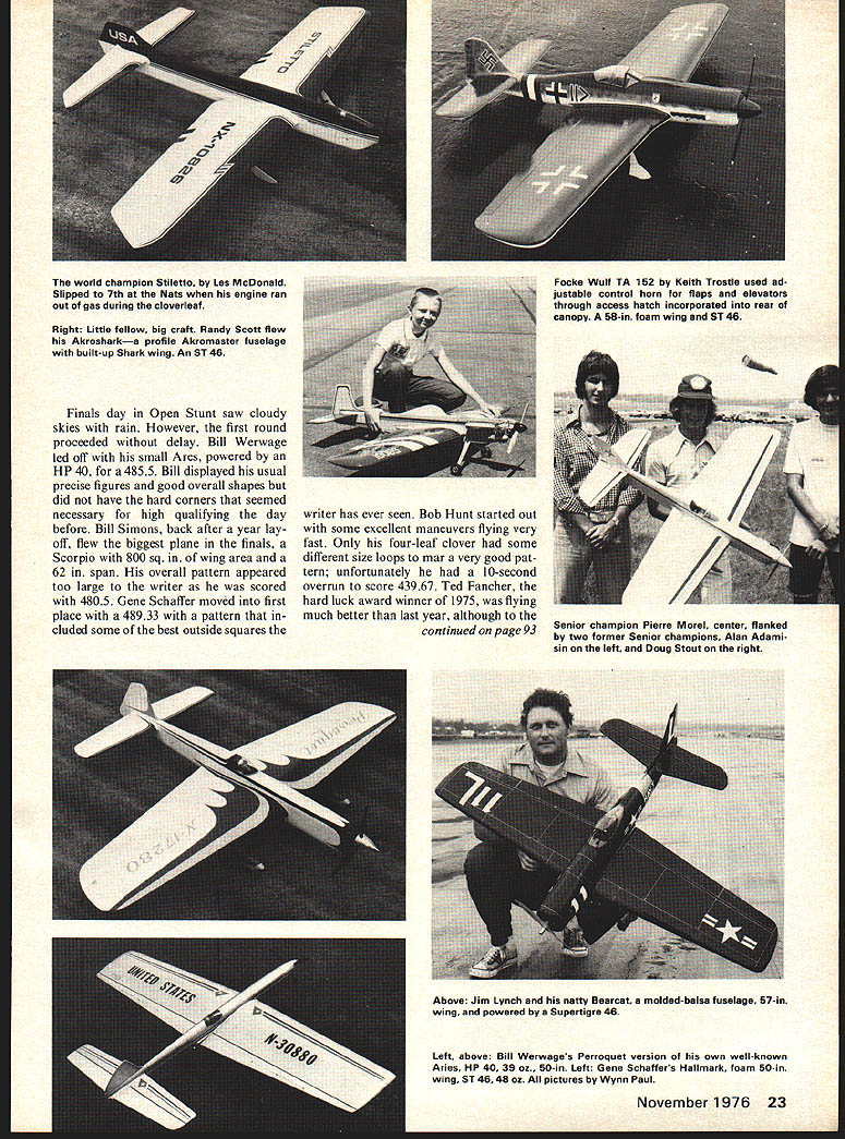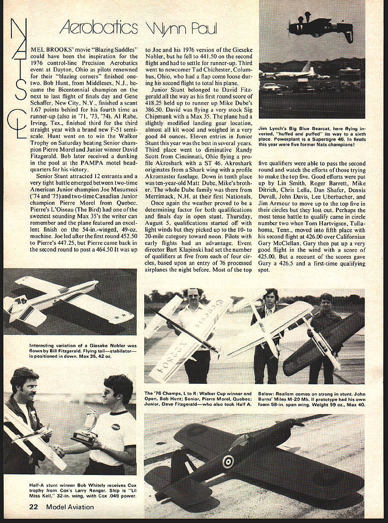 Aerobotcs \Nvnn Pod MEL BROOKS movie Blazing Saddles could have inspiration 1976 control-line Precision Aerobatics event Dayton Ohio pilots renowned blazing corners finished onetwo Bob Hunt Middlesex NJ came Bicentennial champion next last flight finals day Gene Schaffer New City NY finished scant 167 points behind fourth time runner-up also 71 73 74 Al Rabe Irving Tex finished third third straight year brand new F-5 semiscale Hunt went win Walker Trophy Saturday beating Senior cham pion Pierre Morel Junior winner David Fitzgerald Bob later received dunking pool PAMPA motel head quarters victory Senior Stunt attracted 12 entrants very tight battle emerged between two-time American Junior champion Joe Musumeci 74 75 two-time Canadian Junior champion Pierre Morel Quebec Pierres LOiseau Bird sweetest sounding Max 35s writer can remember plane featured excel lent finish 54-in-winged 49-oz machine Joe led after first round 45250 Pierres 44725 Pierre came back second round post 46450 up 22 Model Aviation Joe 1976 version Gieseke Nobler fell 44150 second flight settle runner-up Third went newcomer Tad Chichester Colum bus Ohio flap come loose dur ing second flight total plane Junior Stunt belonged David Fitz gerald way first round score 41825 held up runner up Mike Dubes 38650 David flying very stock Sig Chipmunk Max 35 plane slightly modified landing gear location almost kit wood weighed very good 44 ounces Eleven entries Junior Stunt year best several years Third place went diminutive Randy Scott Cincinnati Ohio flying pro file Akroshark ST 46 Akroshark originates Shark wing profile Akromaster fuselage Down tenth place ten-year-old Matt Dube Mikes broth er whole Dube family Merrimack NH first Nationals Once again weather proved determining factor both qualifications finals day open stunt Thursday August 5 qualifications started off light winds picked up 10- 20-mile category toward noon Pilots early flights advantage Event director Bart Klapin ski set number qualifiers five four cir cles based upon entry 76 processed airplanes night before Most top five qualifiers able pass second round watch efforts trying make top five Good efforts put up Lin Smith Roger Barrett Mike Ditrich Chris Lella Dan Shafer Dennis Duvall John Davis Lee Uberbacher Jim Armour move up top five circles lost out Perhaps tense battle qualify came circle number two Tom Hartvigsen Tulla homa Tenn moved fifth place second flight 42600 over Californian Gary McClellan Gary put up very good flight wind score 42500 recount scores gave Gary 4265 first-time qualifying spot Jim Lynchs Big Blue Bearcat flying verted huffed puffed its way sixth place Powerplant Supertigre 46 finals year five former Nats champions Interesting variation Gieseke Nobler flown Bill Fitzgerald Flying tailstabilator positioned down Max 3542 oz V 76 Champs Ito R Walker Cup winner Below Realism comes strong stunt John Open Bob Hunt Senior Pierre Morel Quebec Burns Miles M-20 Mk II prototype own Junior Dave Fitzgeraldwho also took Half foam 58-in span wing Weight 59 oz. Max 40 Half-A stunt winner Bob Whitely receives Cox trophy Coxs Larry Renger Ship Ill Miss Kell 32-in wing Cox 049 power Right Little fellow big craft Randy Scott flew Akrosharka profile Akromaster fuselage built-up Shark wing An ST 46 Finals day Open Stunt saw cloudy skies rain However first round proceeded delay Bill Werwage led off small Ares powered HP 40 4855 Bill displayed usual precise figures good overall shapes did have hard corners seemed necessary high qualifying day before Bill Simons back after year lay off flew biggest plane finals Scorpio 800 sq wing area 62 span overall pattern appeared too large writer scored 4805 Gene Schaffer moved first place 48933 pattern cluded some best outside squares Left above Bill Werwages Perroquet version own wall-known Aries HP 40 39 oz. 50-in Left Gene Schaffers Hallmark foam 50-in wing ST 4648 oz pictures Wynn Paul November1976 23 world champion Stiletto Les McDonald Slipped 7th Nats engine ran Out gas during cloverleaf Focke WuIf TA 152 Keith Trostle used ad justable control horn flaps elevators through access hatch incorporated rear canopy 58-in foam wing ST 46 writer has ever seen Bob Hunt started out some excellent maneuvers flying very fast Only four-leaf clover some different size loops mar very good pat tern unfortunately 10-second overrun score 43967 Ted Fancher hard luck award winner 1975 flying much better last year although continued page 93 Senior champion Pierre Morel center flanked two former Senior champions Alan Adami sin left Doug Stout right Above Jim Lynch natty Bearcat molded-balsa fuselage 57-in wing powered Supertigre 46 Nats/CL Stunt/Paul continued page 23 writer pattern appeared slightly large Teds well done plane always pleasure seehe should help keep west coast fliers improving First-time qualifiers Bill Eybers NJ Gary McClellan both gave good accounts themselves followed ever improving Fred Miles flies traditional New York style small figures tight corners Freds first time qualify also Bob Gieseke flying number nine spot moved lead very slow-flying Nobler 49533 smaller pattern size definite asset seemed having some line tension problems new World Champion Les McDonald flew driving rain scored 5086 pattern bad very good round figures excellent hourglass Bob Whitely trouble landing gear after good pattern Keith Tros tIe back competition after directing last two Nationals flew FWTA 152 semi-scale 45917 Another year back competition Keith could give leaders some trouble Al Rabe moved second position new F-S 1 totaled month before new fuse lage forward trailing edge wing new wing center section grafted remains plane after rag caught prop running stooge Wynn Paul moved seventh new white Pampawagon III evidently showed up better air blue ones although having troubles pullouts Big Jim Lynch year old Big Blue Bearcat unmuffled ST 46 huffed puffed 48750 move fifth place An intense Rich LeRoy Calif put yellow Miss Poppy now powered 