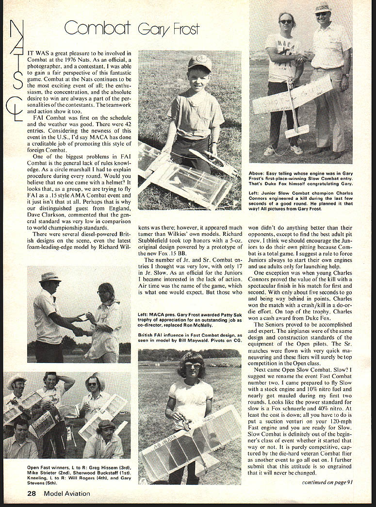 Combat Gary Frost IT WAS great pleasure involved Combat 1976 Nats As official photographer contestant able gain fair perspective fantastic game Combat Nats continues exciting event enthu siasm concentration absolute desire win always part perso nalities contestants teamwork action show too FAL Combat first schedule weather good 42 entries Considering newness event US Id say MACA has done creditable job promoting style foreign Combat biggest problems FAI Combat general lack rules knowl edge As circle marshall explain procedure during round Would believe no came helmet looks group trying fly FAI 15 style AMA Combat event just isnt Perhaps distinguished guest England Dave Clarkson commented gen eral standard very low comparison world championship standards several diesel-powered Brit ish designs scene latest foam-leading-edge model Richard Wil kens however appeared much tamer Wilkies own models Richard Stubblefield took top honors 5-oz original design powered prototype new Fox 15 BB number Jr Sr Combat en tries thought very low 17 Jr Slow As official Juniors became interested lack action Air time name game what would expect Left MACA pres Gary Frost awarded Patty Sak trophy appreciation outstanding job co-director replaced Ron McNally British FAI influence Fast Combat design seen model Bill Maywald Pivots CG Above Easy telling engine Gary Frosts first-place-winning Slow Combat entry Thats Duke Fox himself congratulating Gary Left Junior Slow Combat champion Charles Connors engineered kill during last few seconds good round planned way pictures Gary Frost won didnt anything better opponents except find best adult pit crew think should encourage Jun iors own pitting because Com bat total game suggest rule force Juniors always start own engines use adults launching help exception young Charles Connors proved value kill spectacular finish match first second about five seconds go being way behind points Charles won match crash/kill do-ordie effort top trophy Charles won cash award Duke Fox Seniors proved accomplished expert airplanes same design construction standards equipment Open pilots Sr matches flown very quick ma neuvering fliers will surely top competition Open class Next came Open Slow Combat Slow suggest rename event Fast Combat number two came prepared fly Slow stock engine 10% nitro fuel nearly got mauled during first two rounds Looks like power standard slow Fox schnuerle 40% nitro least cost down have put suction venturi 120-mph Fast engine ready Slow Slow Combat definitely out begin ners class event whether started way purely competitive cap tured die-hard veteran Combat flier another event go out further submit attitude engrained will never changed continued page 9] 28 Model Aviation Open Fast winners L R Greg Hissem 3rd Mike Strieter 2nd Sherwaod Buckstaff 1st Kneeling R Will Rogers 4th Gary Stevens 5th Nats/CL Combat/Frost continued page 28 Next came Fast Combat rain tape entire length streamers keep together pilots continuously slipping center circle mud Id say usual number kills early rounds speeds Fast Com bat planes under rainy conditions about equal Slow planes good weather Weve got something about Texas Combat fliers understand have won Combat Nats last four years year Sherwood Buckstaff won Fast Combat second year row used Fox few months advance introduction Fox has captured Combat power title Supertigre previously unchallenged think entire crew Combat offi cials Nats deserves big pat back dont think lot us realize time hard workers put Combat event over still offi cials work done wished mention names just too yet help still needed Co-director Pat Wilcox feels sub jectiveness line entangle rule big judging headache MACA meeting voted three to get rid please keep mind no action cure-all absence rule may see yanking contests subsequently fly-aways Patty Sak co-director gets particular pat back ability keep things running smoothly absence Ron McNally able attend Nats missed circle hope feels better knowing Patty did such good job him Neal White deserves big hand really doing homework rules application As circle marshall noticed swift accurate steadfast decisions prevented argu ments helped keep pace CLCB found flaw third watch system plane leaves circle continues flying need watch measure air time circle also need another extra watch measure flying time plane still circle unless think both planes will just happen land together Right judge having two watches prob lem solved have admit did have outand-out judging problems First cir cles properly marked no 75-foot circle Second center circle plain see third frequently no judge watching center circle anyway did have problems center-circle complaints got lax some pilots just took off standing right pilots circle combat started launchwhich just unsafe practice rules seek avoid Right now should start planning run Combat 77 Nats brave souls will have run event submit following three direc tors instead two judges made up competition fliers pre-judge practice session situation Combat extra judge match dont use third watch sys tem short discussion after problem corrective action plan implemented judges working pairs judge 90 degrees circle pilots ineeting least once streamers two colors made inspected ad vance colors should bright light-such orange gold re matches absolutely no other alternative exists Pit technology has definitely improved will harder call plane unflyable use new cyanoacrylate glues quick repair tail comes off plane unflyable pit crew un prepared Mike Tallman gets sportsmanship award contest extreme desire win us Mike gave Rich ard Stubblefield rematch Mike declared original winner because torn streamer Richards plane ck pit work Dan Rutherford Mike Tallman soon obvious. smooth motion could see guys flip prop remove leads get out way ch between Bob Burch Rich Lopez combat ground well air few words exchanged tape re corder could selling tickets ll Rogers tried unsuccessfully use psychol ogy against Buckstaff deliberat