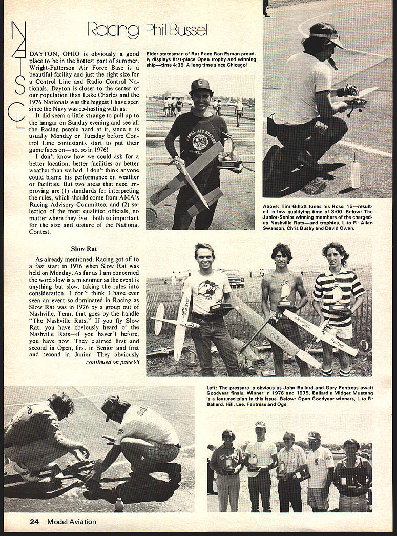 Rocimg Ph Busse DAYTON OHIO obviously good place hottest part summer Wright-Patterson Air Force Base beautiful facility just right size Control Line Radio Control Na tionals Dayton closer center population Lake Charles 1976 Nationals biggest have seen since Navy co-hosting us did seem little strange pull up hangar Sunday evening see Racing people hard since usually Monday Tuesday before Con trol Line contestants start put game faces onnot 1976 dont know could ask better location better facilities better weather dont think anyone could blame performance weather facilities two areas need im proving standards interpreting rules should come AMAs Racing Advisory Committee 2 se lection qualified officials no matter liveboth important size stature National Contest Slow Rat As already mentioned Racing got off fast start 1976 Slow Rat held Monday As far am concerned word slow misnomer event anything slow taking rules consideration dont think have ever seen event dominated Racing Slow Rat 1976 group out Nashville Tenn goes handle Nashville Rats fly Slow Rat have obviously heard Nashville Ratsif havent before have now claimed first second Open first Senior first second Junior obviously continued page 98 Elder statesman Rat Race Ron Esman proud iy displays first-place Open trophy winning shiptime 439 long time since Chicago 24 Model Aviation Above Tim Gillott tunes Rossi 15result ed low qualifying time 300 Below Junior-Senior winning members charged up Nashville Ratsand trophies L R Allan Swanson Chris Busby David Owen Left The pressure obvious John Ballard Gary Fentress await Goodyear finals Winner 1976 1975 Ballards Midget Mustang featured plan issue Below Open Goodyear winners Ito R Ballard Hill Lee Fentress Oge Bill Lee enjoyed Goodyear con petitionuntil mid-air resulted third David Owen Junior members Allen Swanson Senior member Paul does engine work Marshall airframe designing build ing group works very well together just simply went out blew ones doors off key domination lies engine Paul has spent hours devel oping powerplant results obvious engine built around OS Max 40 case homebuilt piston sleeve L-ring sleeve built mild steel piston standard 20-24-T4 aluminum ring made centrifugally forged cast iron transfer exhaust timing stock 0S Max 40 timing flying prop worked 8-8 K & W glass prop progresses 6/4 pitch first sta tion 8 pitch tip station ground rpm flying prop racing fuel approximately 18000 rpm standard racing fuel 30% nitro 50% al cohol 20% Klotz Racing Oil Goodyear can say about Goodyear speeds out sight obvious long rules allow exhaust tuning will necessary run least megaphone-tuned exhaust system engine competitive Goodyear Fusite GloBee Racing Plug obviously making its mark Goodyear Open A-Speed first three places Open Speed using plug John Ballard Larry Hill Bill Lee managed make finals sporting megaphone-tuned Rossi 15powered engines tell truth three should very impres sive John Kilsdonk flying Hill Gary Fentress pitting John Bal lard Russ Brown flying Bill Lee wasnt all-star lineup have never seen could feel ex citement tension build came time race marbles finals marred mid-air collision between Bill Lee Larry Hill lap 20 Big John went claim first place being pushed Fentress flawless pits engine performed beautifully would have taken super effort Lee Hill depose John also 1975 winner am sure Hill Lee along others can hardly wait until 1977 will get another shot Big John now feels pressure trying stay top after winning two years row Rat Racing Rat has obviously matured through years claimed its spot granddaddy Racing events still prestigious win first Open Rat other Racing event should gives great pleasure report Open Rat 1976 claimed Ron Esman Houston Tex Dick Stubblefield doing flying Ronnie true gentleman elder states men racing cant think anyone would rather have pits Ron matter cant think bet ter pilot Dick Stubblefield Together make impressive team makes beat seldom make mistakes always makes feel good see someone loves racing Ron Esman does good Harold Dick Lambert 1975 winners pushed Esman limit did Paul Tune took third 05 Max-powered entry Marshall Busby low qualifying time also OS Max powered took fourth place 1975s low qualifying time Larry Newton took 5th HP-powered ships claimed first second fifth place have talked length Tune Busby am convinced running box stock OS Max 40 engines Obviously OS Max making its presence felt Racing Racing Wright-Patterson 1976 exciting sets stage 1977 Can anyone challenge Nashville Rats Slow Rat Can anyone dethrone John Ballard Goodyear Last least can OS Max its number Rat Yes Racing 1977 will fun watch also great participate can hardly wait Internal Switch Mount Noble Switchcraft other switch 1 1-1/8 tween mounting screws simple sturdy internal switch mount installs quickly double-sided tape side bulkhead bottom location Eliminates awkward drilling boltingideal small-size planes $89 Ace R/C Inc. Box 511 Higginaville MO 64037 productrviewproductrviwpoductrviwproduCtrevieW