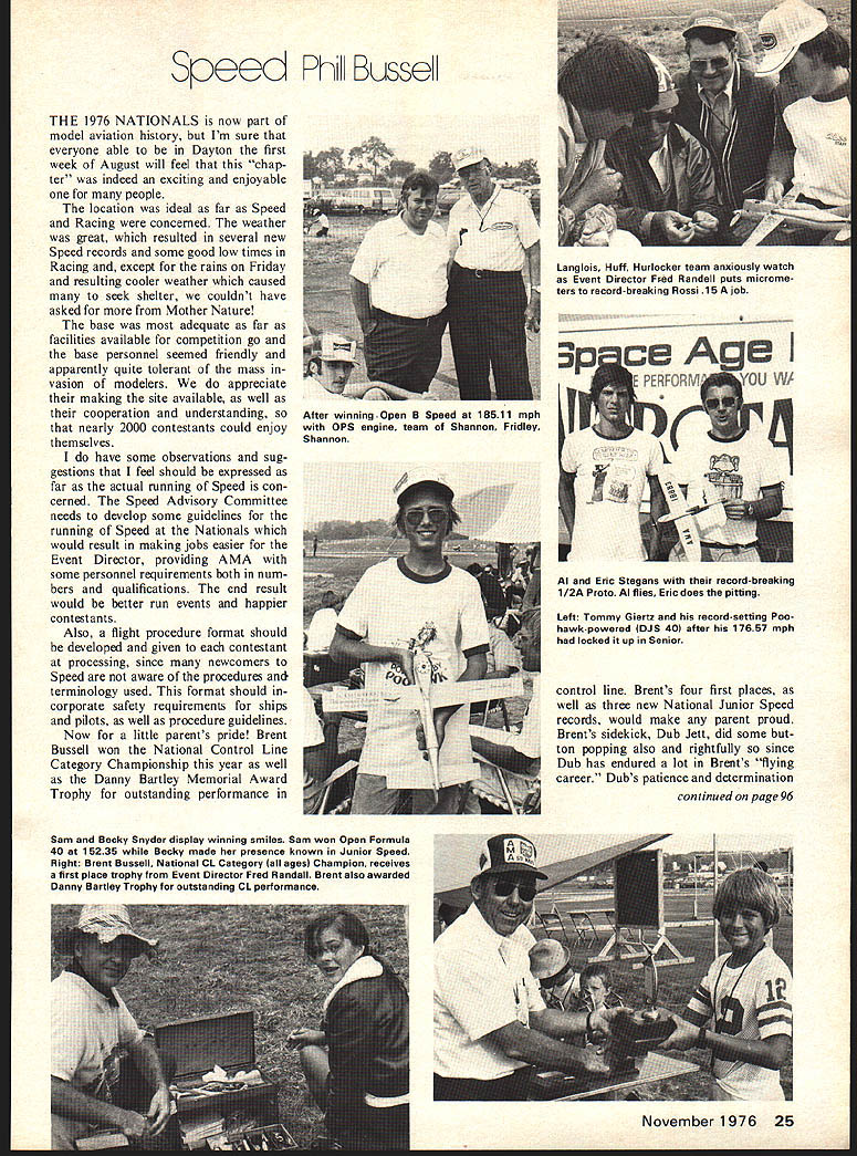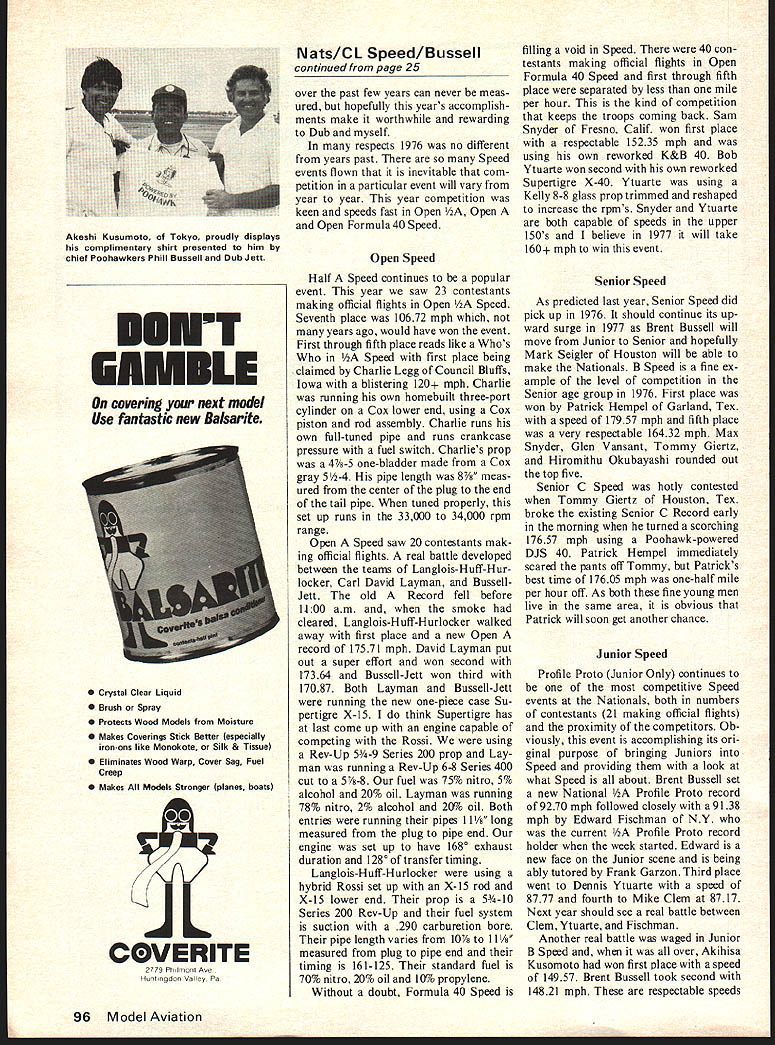 Speed Ph Busse THE 1976 NATIONALS now part model aviation history Im sure everyone able Dayton first week August will feel chap ter indeed exciting enjoyable people location ideal far Speed Racing concerned weather great resulted several new Speed records some good low times Racing except rains Friday resulting cooler weather caused seek shelter couldnt have asked Mother Nature base adequate far facilities available competition go base personnel seemed friendly apparently quite tolerant mass vasion modelers appreciate making site available well cooperation understanding nearly 2000 contestants could enjoy themselves have some observations sug gestions feel should expressed far actual running Speed con cerned Speed Advisory Committee needs develop some guidelines running Speed Nationals would result making jobs easier Event Director providing AMA some personnel requirements both num bers qualifications end result would better run events happier contestants Also flight procedure format should developed given contestant processing since newcomers Speed aware procedures terminology used format should corporate safety requirements ships pilots well procedure guidelines Now little parents pride Brent Bussell won National Control Line Category Championship year well Danny Bartley Memorial Award Trophy outstanding performance Sam Becky Snyder display winning smiles Sam won Open Formula 40 15235 Becky made presence known Junior Speed Right Brent Bussell National CL Category ages Champion receives first place trophy Event Director Fred Randall Brent also awarded Danny Bartley Trophy outstanding CL performance S AI Al Eric Stegans record-breaking 1/2A Proto Al flies Eric does pitting Left Tommy Giertz record-setting Poo hawk-powered DJS 401 after 17657 mph locked up Senior control line Brents four first places well three new National Junior Speed records would make parent proud Brents sidekick Dub Jett did some ton popping also rightfully since Dub has endured lot Brents flying career Dubs patience determination continued page 96 Langlois Huff Hurlocker team anxiously watch Event Director Fr-ed Randell puts microme ters record-breaking Rossi 15 jab After winningOpen B Speed iBSil mph OPS engine team Shannon Fridlay Shannon IUET BuMBLE covering next model Use fantastic new Ba/sante crystal Clear Liquid Brush Spray Protects Wood Models Moisture Makes Coverings Stick Better especially iron-ons like Monakote Silk & Tissue Eliminates Wood Warp Cover Sag Fuel Creep Makes Models Stronger planes boats 0@ 9m COVERITE 2779 Pfllmont Ave HuntngooD Valley Pa Nats/CL Speed/Bussell continued page 25 over past few years can never meas ured hopefully years accomplish ments make worthwhile rewarding Dub myself respects 1976 no different years past Speed events flown inevitable com petition particular event will vary year year year competition keen speeds fast Open Open Open Formula 40 Speed Open Speed Half Speed continues popular event year saw 23 contestants making official flights Open Speed Seventh place 10672 mph years ago would have won event First through fifth place reads like Whos Speed first place being claimed Charlie Legg Council Bluffs Iowa blistering 120 mph Charlie running own homebuilt three-port cylinder Cox lower end using Cox piston rod assembly Charlie runs own full-tuned pipe runs crankcase pressure fuel switch Charlies prop 47/~5 one-bladder made Cox gray 5-4 pipe length 8/s meas ured center plug end tail pipe tuned properly set up runs 33000 34000 rpm range Open Speed saw 20 contestants mak ing official flights real battle developed between teams Langlois-Huff-Hur locker Carl David Layman Bussell Jett old Record fell before 1100 am smoke cleared Langlois-Huff-H urlocker walked away first place new Open record 17571 mph David Layman put out super effort won second r7364 Bussell-Jett won third 17087 Both Layman Bussell-Jett running new one-piece case Su pertigre X-l5 think Supertigre has last come up engine capable competing Rossi using Rev-Up 5-9 Series 200 prop Lay man running Rev-Up 6-8 Series 400 cut 5/s-8 fuel 75% nitro 5% alcohol 20% oil Layman running 78% nitro 2% alcohol 20% oil Both entries running pipes 1 l/8 long measured plug pipe end engine set up have 1680 exhaust duration 1280 transfer timing Langlois-Huff-Hurlocker using hybrid Rossi set up X-15 rod X-15 lower end prop 5-b Series 200 Rev-Up fuel system suction 290 carburetion bore pipe length varies l0/s 11 /s measured plug pipe end timing 161-125 standard fuel 70% nit ro 20% oil 10% propylene Without doubt Formula 40 Speed filling void Speed 40 con testants making official flights Open Formula 40 Speed first through fifth place separated less mile per hour kind competition keeps troops coming back Sam Snyder Fresno Calif won first place respectable 15235 mph using own reworked K&B 40 Bob Ytuarte won second own reworked Supertigre X-40 Ytuarte using Kelly 8-8 glass prop trimmed reshaped increase rpms Snyder Ytuarte both capable speeds upper ISOs believe 1977 will take 160 mph win event Senior Speed As predicted last year Senior Speed did pick up 1976 should continue its up ward surge 1977 Brent Bussell will move Junior Senior hopefully Mark Seigler Houston will able make Nationals B Speed fine ex ample level competition Senior age group 1976 First place won Patrick Hempel Garland Tex speed 17957 mph fifth place very respectable 16432 mph Max Snyder Glen Vansant Tommy Giertz Hiromithu Okubayashi rounded out top five Senior C Speed hotly contested Tommy Giertz Houston Tex broke existing Senior C Record early morning turned scorching 17657 mph using Poohawk-powered DJS 40 Patrick Hempel immediately scared pants off Tommy Patricks best time 17605 mph one-half mile per hour off As both fine young men live same area obvious Patrick will soon get another chance Junior Speed Profile Proto Junior Only continues competitive Speed events Nationals both numbers contestants 21 making official flights proximity competitors Ob viously event acco