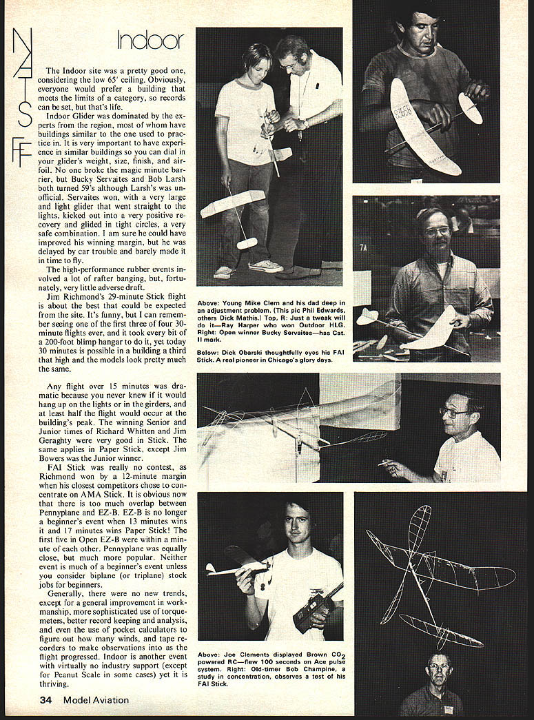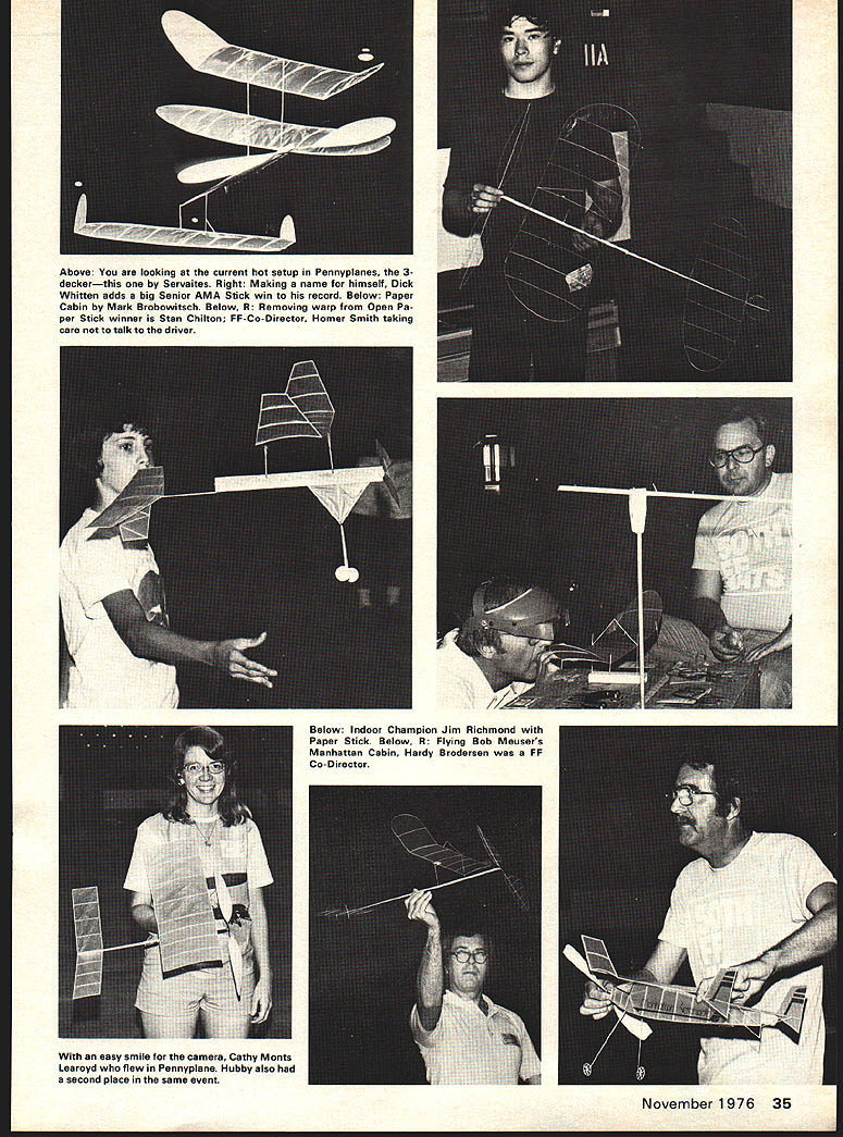 indoor Indoor site pretty good considering low 65 ceiling Obviously everyone would prefer building meets limits category records can set thats life Indoor Glider dominated ex perts region have buildings similar used prac tice very important have experi ence similar buildings can dial gliders weight size finish air foil No broke magic minute bar rier Bucky Servaites Bob Larsh both turned 59s although Larshs un official Servaites won very large light glider went straight lights kicked out very positive re covery glided tight circles very safe combination am sure could have improved winning margin delayed car trouble barely made time fly high-performance rubber events volved lot rafter banging fortu nately very little adverse draft Jim Richmonds 29-minute Stick flight about best could expected site Its funny can remem ber seeing first three four 30minute flights ever took bit 200-foot blimp hangar yet today 30 minutes possible building third high models look pretty much same Any flight over 15 minutes dra matic because never knew would hang up lights girders least half flight would occur buildings peak winning Senior Junior times Richard Whitten Jim Geraghty very good Stick same applies Paper Stick except Jim Bowers Junior winner FAT Stick really no contest Richmond won 12-minute margin closest competitors chose con centrate AMA Stick obvious now too much overlap between Pennyplane EZ-B EZ-B no longer beginners event 13 minutes wins 17 minutes wins Paper Stick first five Open EZ-B within min ute other Pennyplane equally close much popular Neither event much beginners event unless consider biplane triplane stock jobs beginners Generally no new trends except general improvement work manship sophisticated use torquemeters better record keeping analysis use pocket calculators figure out winds tape re corders make observations flight progressed Indoor another event virtually no industry support except Peanut Scale some cases yet thriving 34 Model Aviation Above Young Mike Clem dad deep adjustment problem pic Phil Edwards others Dick Mathis Top R Just tweak will itRay Harper won Outdoor HIG Right Open winner Bucky Servaiteshas Cat II mark Below Dick Obarski thoughtfully eyes FAI Stick real pioneer Chicagos glory days Above Joe Clements displayed Brown CO2 powered RCflew 100 seconds Ace pulse system Right Old-timer Bob Champine study concentration observes test FAI Stick Above You looking current hot setup Pennyplanes 3deckerthis Servaites Right Making name himself Dick Whitten adds big Senior AMA Stick win record Below Paper Cabin Mark Brobowitsch Below R Removing warp Open Pa per Stick winner Stan Chilton FF-Co-Director Homer Smith taking care talk driver easy smile camera Cathy Monts Learoyd flew Pennyplane Hubby also second place same event Below Indoor Champion Jim Richmond Paper Stick Below R Flying Bob Meusers Manhattan Cabin Hardy Brodersen FF Co-Director November1976 35