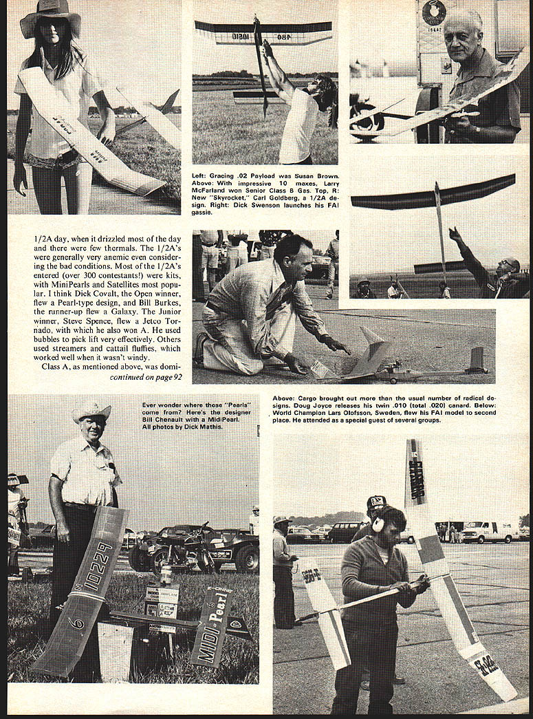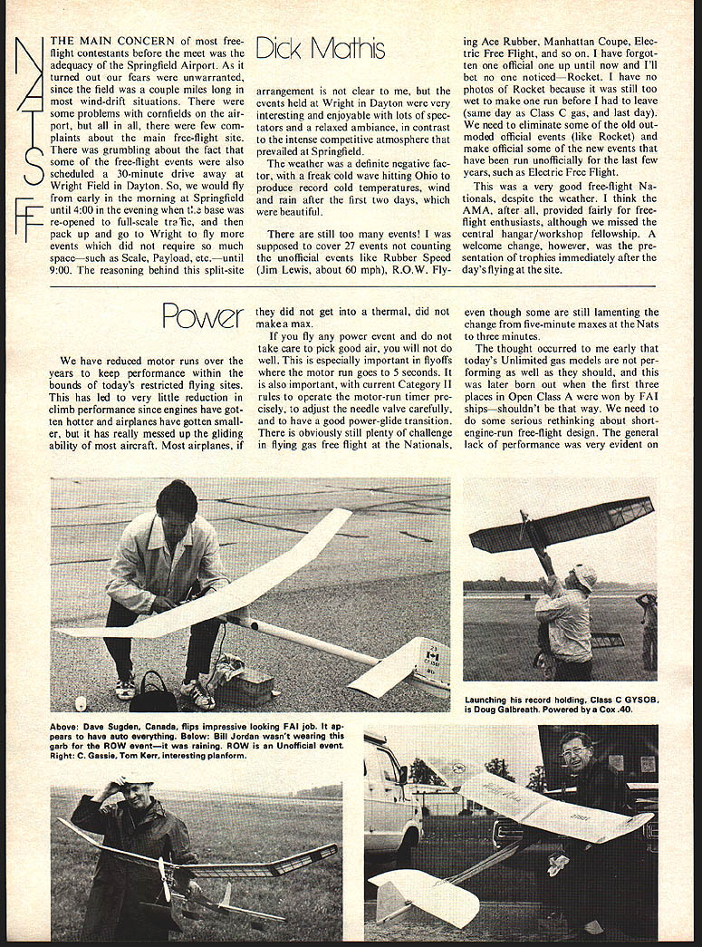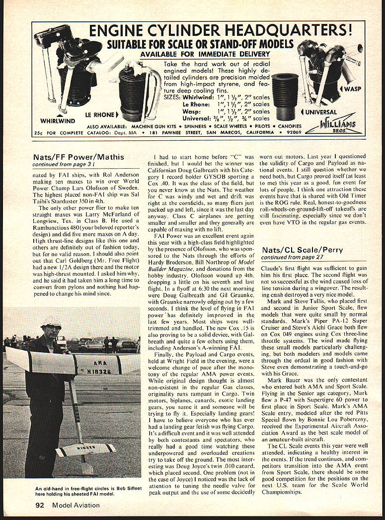 THE MAIN CONCERN freeflight contestants before meet adequacy Springfield Airport As turned out fears unwarranted since field couple miles long wind-drift situations some problems cornfields air port few com plaints about main free-flight site grumbling about fact some free-flight events also scheduled 30-minute drive away Wright Field Dayton So would fly early morning Springfield until 400 evening te base re-opened full-scale tra lic pack up go Wright fly events did require much space such Scale Payload etcuntil 900 reasoning behind split-site Dck Mothis arrangement clear events held Wright Dayton very interesting enjoyable lots spec tators relaxed ambiance contrast intense competitive atmosphere prevailed Springfield weather definite negative fac tor freak cold wave hitting Ohio produce record cold temperatures wind rain after first two days beautiful still too events supposed cover 27 events counting unofficial events like Rubber Speed Jim Lewis about 60 mph ROW Flying Ace Rubber Manhattan Coupe Elec tric Free Flight have forgot ten official up until now Ill bet no noticedRocket have no photos Rocket because still too wet make run before leave same day Class C gas last day need eliminate some old out moded official events like Rocket make official some new events have run unofficially last few years such Electric Free Flight very good free-flight Na tionals despite weather think AMA after provided fairly freeflight enthusiasts although missed central hangar/workshop fellowship welcome change however pre sentation trophies immediately after days flying site Power have reduced motor runs over years keep performance within bounds todays restricted flying sites has led very little reduction climb performance since engines have got ten hotter airplanes have gotten small er has really messed up gliding ability aircraft Most airplanes did get thermal did make max fly power event take care pick good air will well especially important flyofis motor run goes 5 seconds also important current Category II rules operate motor-run timer pre cisely adjust needle valve carefully have good power-glide transition obviously still plenty challenge flying gas free flight Nationals though some still lamenting change five-minute maxes Nats three minutes thought occurred early todays Unlimited gas models per forming well should later born out first three places Open Class won FAI shipsshouldnt way need some serious rethinking about shortengine-run free-flight design general lack performance very evident Above Dave Sugden Canada flips impressive looking FAI job ap pears have auto everything Below Bill Jordan wasnt wearing garb ROW eventit raining ROW Unofficial event Right C Gassie Tom Kerr interesting planform Launching record holding Class C GYSOB Doug Galbreath Powered Cox 40 l/2A day drizzled day few thermals l/2As generally very anemic consider ing bad conditions Most 1/2As entered over 300 contestants kits MiniPearls Satellites popu lar think Dick Covalt Open winner flew Pearl-type design Bill Burkes runner-up flew Galaxy Junior winner Steve Spence flew Jetco Tor nado also won used bubbles pick lift very effectively Others used streamers cattail fluffies worked well wasnt windy Class mentioned above domi continued page 92 V. Left Gracing 02 Payload Susan Brown Above With impressive 10 maxes Larry McFarland won Senior Class B Gas Top R New Skyrocket Carl Goldberg 1/2A de sign Right Dick Swenson launches FAI gassie Above Cargo brought out usual number radical de signs Doug Joyce releases twin 010 total 0201 canard Below World Champion Lars Oloisson Sweden flew FAI model second place attended e special guest several groups ENGINE CYLINDER HEADQUARTERS SUITABLE FOR SCALE OR STAND-OFF MODELS AVAILABLE FOR IMMEDIATE DELIVERY / hard work out radial engined models highly de ed cylinders precision molded JI high-impact styrene fea ture deep cooling fins / SIZES Whirlwind 1 1 Y2 2 scales Le Rhone 1 1 ales LE RHONE Wasp 1 11/2 2 scales4 UNIvERSAL Universal/8 les CATALOG Dept MA PAWNEE STREET SAN MARCOS CALIFORNIA 9 ALSO AVAILABLE MACHINE GUN KITS NERS E WHEELS TS PIES Nats/FF Power/Mathis continued page 3 1 nated FAI ships Rol Anderson making ten maxes win over World Power Champ Lars Olofsson Sweden highest placed non-FAI ship Sal Taibis Starduster 350 4th other power flier make ten straight maxes Larry McFarland Longview Tex Class B used Rambunctious 480your beloved reporters design did five maxes day High thrust-line designs like others definitely out fashion today no valid reason should also point out Carl Goldberg Mr Free Flight new l/2A design motor high-thrust mounted asked him said taken him long time convert pylons nothing hap pened change mind since An oid-hand freeflight circles Bob Sifleet holding sheeted FAI modei start home before C finished would bet winner Californian Doug Galbreath Cate gory record holder GYSOB sporting Cox 40 class field never know Nats weather C windy wet drift right cornfields fliers just packed up left since last day anyway Class C airplanes getting smaller smaller generally capable maxing no lift FAI Power excellent event again year high-class field highlighted presence ofQlofsson spon sored Nats through efforts Hardy Broderson Bill Northrop Model Builder Magazine donations hobby industry Olofsson wound up 4th dropping little seventh last flight flyoff 630 next morning Doug Galbreath Gil Graunke Graunke narrowly edging out few seconds think level flying FAI power has definitely improved last few years Most ships welltrimmed handled new Cox 15 also proving solid device Galbreath quite few others using including Andersons A-winning FAI Finally Payload Cargo events held Wright Field evening welcome change pace after mono tony regular AMA power events original design thought almost non-existent regular Gas classes originality runs rampant Cargo Twin motors biplanes canards exotic landing gears name someone will trying fly Especially landing gears have believe everyone has ever landi