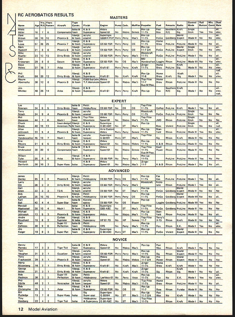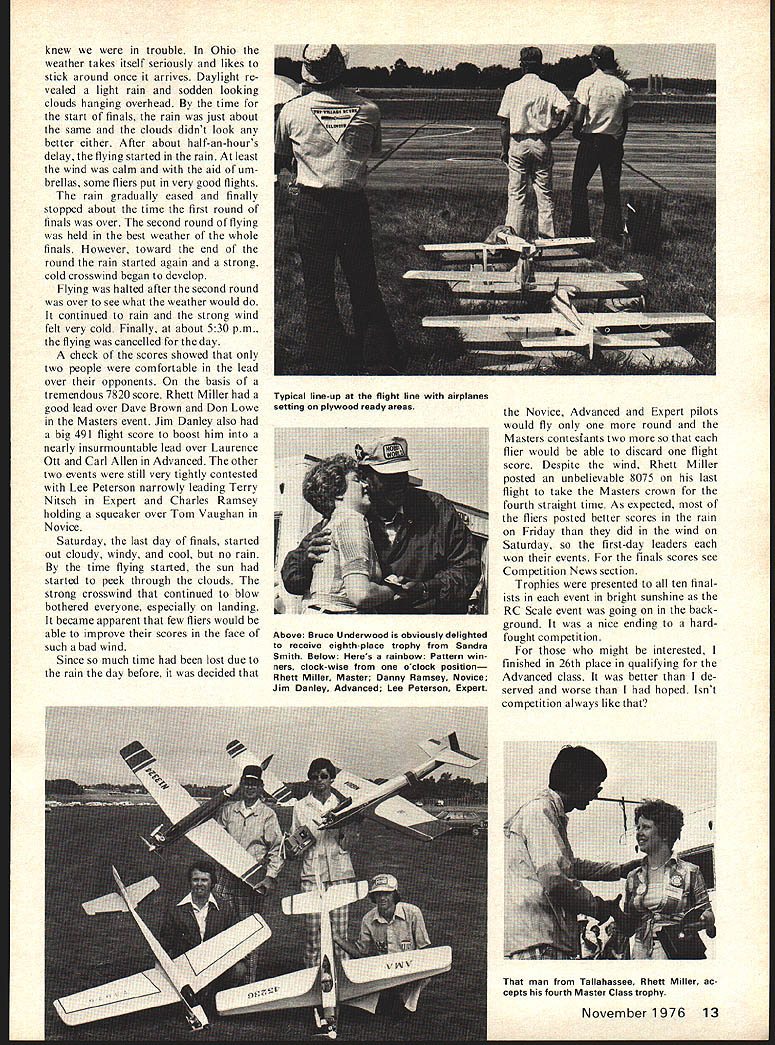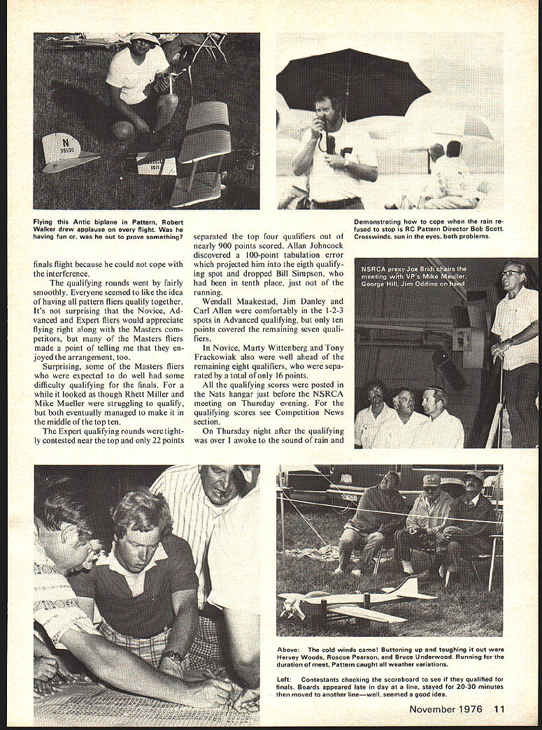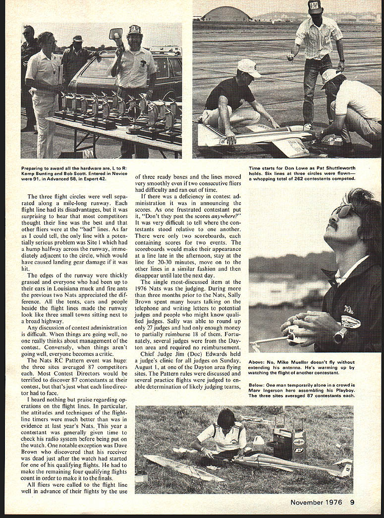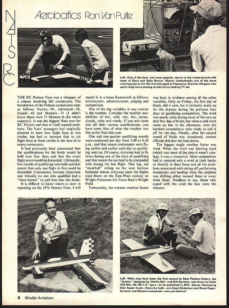 Aerobolics RoD Van Pffe THE RC Pattern Nats whopper contest involving 262 contestants breakdown Pattern contestants went follows Novice91 Advanced58 Expert42 Masters71 didnt know 71 Masters whole country biggest Nats ever RC Pattern itself created prob lems Nats managers originally planned have four flight lines two circles increase six flight lines three circles face contestants previously announced qualifications finals would held over four days worst flight score would discarded Ultimately five rounds qualifying held meant flight five could discarded Consistency became important virtually no qualified barn burner pull him finals difficult know start reporting 1976 Pattern Nats will report loose framework follows environment administration judging competition big variables contest weather Consider weather pos sibilities hot cold wet dry sunny cloudy calm windy mix various combinations have some idea what weather like Nats year one-quarter qualifying rounds conducted per day 200 830 pm meant contestants fly ing earlier earlier day qualify ing went course everyone fly twice during days qualifying meant sun contended during last flight big red meatball sitting west horizon bothered almost everyone since flights flown East-West runway Wright-Patterson Air Force Bases Wright Field Fortunately wetness weather factor least evidence among other variables Only Friday first day finals did rain certainly made up dryness during previous four days qualifying competition wind nearly calm during rain first day finals cold wind came up late afternoon hardiest competitors ready call off day Finally after second round finals completed contest officials did shut lines down biggest single weather factor wind wind blowing hard time wasnt rain ing crosswind Most competitors contend wind backs directly faces prob lems associated taking off performing maneuvers landing airplane drifting either toward away Needless say coped wind best winners 8 Model Aviation Left One best end popular teams husband-and-wife team Dave Sally Brown Above Undoubtedly wearing jobs RC site belonged Frequency Monitor good spent long hours peering funny-looking TV set Left What may have first canard Nets Pattern history Zonker/ designed Charlie Bair Milt Sanders flown latter OS Max 40 58-1/2 spanto published MA Above Discussing Super Duckflown bothare Lloyd Nicholson Dean Koger Seventy-one Masters competedcan believe Preparing award hardware Ito R Kemp Bunting Bob Scott Entered Novice 91 Advanced 5B Expert 42 three flight circles well sepa rated along mile-long runway flight line its disadvantages surprising hear competitors thought line best other fliers lines As far could tell line poten tially serious problem Site hump halfway across runway imme diately adjacent circle would have caused landing gear damage hit edges runway thickly grassed everyone up ears Louisiana muck fire ants previous two Nats appreciated dif ference tents cars people beside flight lines made runway look like three small towns sitting next broad highway Any discussion contest administration difficult things going well no really thinks about management contest Conversely things arent going well everyone becomes critic Nats RC Pattern event huge three sites averaged 87 competitors Most Contest Directors would terrified discover 87 contestants contest thats just what line direc tor face heard nothing praise regarding op erations flight lines particular attitudes techniques flightline timers much better evidence last years Nats year contestant generally given time check radio system before being put watch notable exception Dave Brown discovered receiver dead just after watch started qualifying flights make remaining four qualifying flights count order make finals fliers called flight line well advance flights use three ready boxes lines moved very smoothly two consecutive fliers difficulty ran out time deficiency contest ad ministration announcing scores As frustrated contestant put Dont post scores anywhere very difficult tell con testants stood relative another two scoreboards containing scores two events scoreboards would make appearance line late afternoon stay line 20-30 minutes move other lines similar fashion disappear until late next day single most-discussed item 1976 Nats judging During three months prior Nats Sally Brown spent hours talking telephone writing letters potential judges people might know quali fied judges Sally able round up 27 judges enough money partially reimburse 18 Fortu nately several judges Day ton area required no reimbursement Chief Judge Jim Doc Edwards held judges clinic judges Sunday August Dayton area flying sites Pattern rules discussed several practice flights judged en able determination likely judging teams Time Starts Don Lowe Pat Shuttleworth holds Six lines three circles flown whopping total 262 contestants competed November1976 9 Above No Mike Mueller doesnt fly extending antenna Hes warming up watching flight another contestant Below man temporarily alone crowd Mary Ingerson assembling Playboy three sites averaged B7 contestants Acrobatics composed three individuals scores practice flights indicated average score would about equal average scores other teams Since six flight lines three judges takes 18 people Doc several extra teams rotate provide relief Sally agonized over conduct judge ro tation decided rotate judges 1 / hours physically impossi ble judging team see con testant fly since too contestants judge during four days qualifications So 1-hour rotation seemed good idea However way things worked out contestants judged same team twice some judged same team three times situation would have bad teams scored about same way several individuals sud denly became low judges low judge mean very low example people contend scores 8 7 3 same maneuver three judges saw set scores Don Lowes qualifying flights scores can best recall 935 905 665 contest like Nats gross scoring inconsistencies can warp results Some people missed c