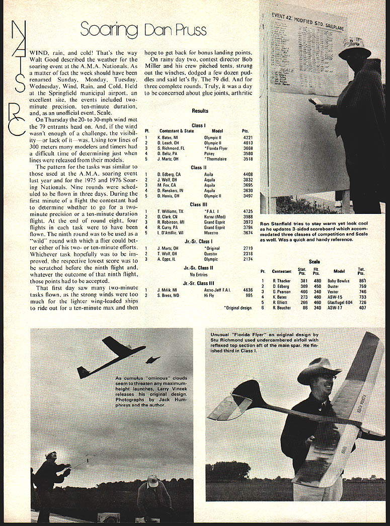 Soohmg DOD Pruss WIND rain cold Thats way Walt Good described weather soaring event AMA Nationals As matter fact week should have renamed Sunday Monday Tuesday Wednesday Wind Rain Cold Held Springfield municipal airport excellent site events included twominute precision ten-minute duration unofficial event Scale OnThursdaythe20-to 30-mph wind met 79 entrants head wind wasnt enough challenge visibil ity lack -was Using tow lines 300 meters modelers timers difficult time determining just lines released models pattern tasks similar used AMA soaring event last year 1975 1976 Soar ing Nationals Nine rounds sched uled flown three days During first minute flight contestant determine whether go twominute precision ten-minute duration flight end round eight four flights task have flown ninth round used wild round flier could bet ter either two- ten-minute efforts Whichever task hopefully im proved respective lowest score scratched before ninth flight whatever outcome ninth flight points accepted first day saw two-minute tasks flown strong winds too much lighter wing-loaded ships ride out ten-minute max hope get back bonus landing points rainy day two contest director Bob Miller crew pitched tents strung out winches dodged few dozen pud dles said lets fly 79 did three complete rounds Truly day concerned about glue joints arthritic Results P1 2 3 4 5 2 3 4 S 2 3 4 5 3 2 Class Contestant & State K Bates Ml D Leach OH S Richmond Ft 0 Belts PA J Marts OH 0 Edherg CA J Wolf OH M Ftx CA 0 Reoskers IN 0 Harris OH T Williams TX 0 Clark CN R Robinson Ml R Corry PA t DAttillie WI J Marts OH T Wolf OH A Epps II J Mrlik Ml S Bress MO Model Olympic II Olympic II Florida Flyer Pokey Tltermalaire Class II Avila Aqoila Aqaila Aquila Olympic II Class Ill FAI Kurwi ModI Grand Esprit Grand Espnit Matstro Jr-Sr Class Oniginal flu onto Olympic Jr-Sr Class II No Entries Jr-Sr Class Ill Astro-Jeff FAl Hi Fly Pos 4221 4013 3668 3680 3518 4408 3832 3695 3630 3497 4725 3988 3973 3794 3674 2719 2318 2174Scale StatFit Pt Centestant pts Model 1R Tftacker 20 Edberg 4636 3 G Pearson 985 4 K Baten 5R Elliott Original design 6 R Booclter 381480 309450 406340 273460 266460 86340 Baby Bombs foster Vector AS W 15 Glaoflogel 604 ASW-17 Ron Stanfield tries stay warm yet look cool updates 3-sided scoreboard accom modated three classes competition Scale well quick handy reference Tot Pto 88 759 746 733 726 407 joints wing coverings spoiler open ings Fuselages filled water hot dogs got soggy Gordon Pearsons pet mar mot darn near drowned took three two-minute flights first day faced proh 1cm maxing out least twice Friday spite such uncontest type weather few did get very respectahle duration flights Saturday cold temperatures 50s wind sort warmup Detroits Sno-Fli clothes blankets modelers wore day would never make pages summer issue fashion magazine Pat Flinns wife wore parka mittens did know Boh Boucher California Astro Flight ran around Bermuda shorts cause Dayton August abays 95 de grees humid Ive heen before day Scale flew six entries hy unanimous decision six fliers two rounds xsere flown back back scores tal lied Col Bob Thacker topped pack 861 points win repeat feat Lockport Ill two weeks earlier same plane Bowlus next four places spread over 33 points Scale being official event Nationals took outside support help make successful Airtronics Lee Renaud provided trophies Gordon Pearson volunteered services event director As contest closed wind subsided part contest package 79 contestants divided three categories Class standard class 29 Class II modified standard class 20 Class III unlimited 30 Class Ill included allowance thermal sniffers Maximum points attainable twominute task 700 tenminute task Task II AMA rule book 100 landing points potential 800 points Maximum possible score 6000 points nothing need said about weather compare winning scores against 6000 point po tential Awards fifth place best overall class third JuniorSenior categories classes II Ill Bob Miller club DARTS Dayton Area Radio Thermal Soarers commended taking job pulling off during three days inclement weather fliers ever experienced way Sunday sunny 70s November1976 17 Shades 1937 Three five competed RC year compete again 76 L Leo Weiss Chet Lanzo Walt Good Chet holds 39 design shook up power boys rules committee Wheels usedback tooso Chet could hand-tow/ROG alone Right Texas Tom WilliamsClass Ill winnershows hes sport about launches Walt Goods Kurwi cold day Umbrellas rain gear basic covering material wet Friday Two-minute precision 10-minute duration wasnt challengefinding high ground Results showed Don Goughnour launches Class Ill Rattler Now know gets maxes wheres timer Yeah windy too Dick Beltz helps steady Gene Shelkeys Po key 20- 30-mph winds challenged contest ants during Thursdays flying Dick de signed plane flew Class version