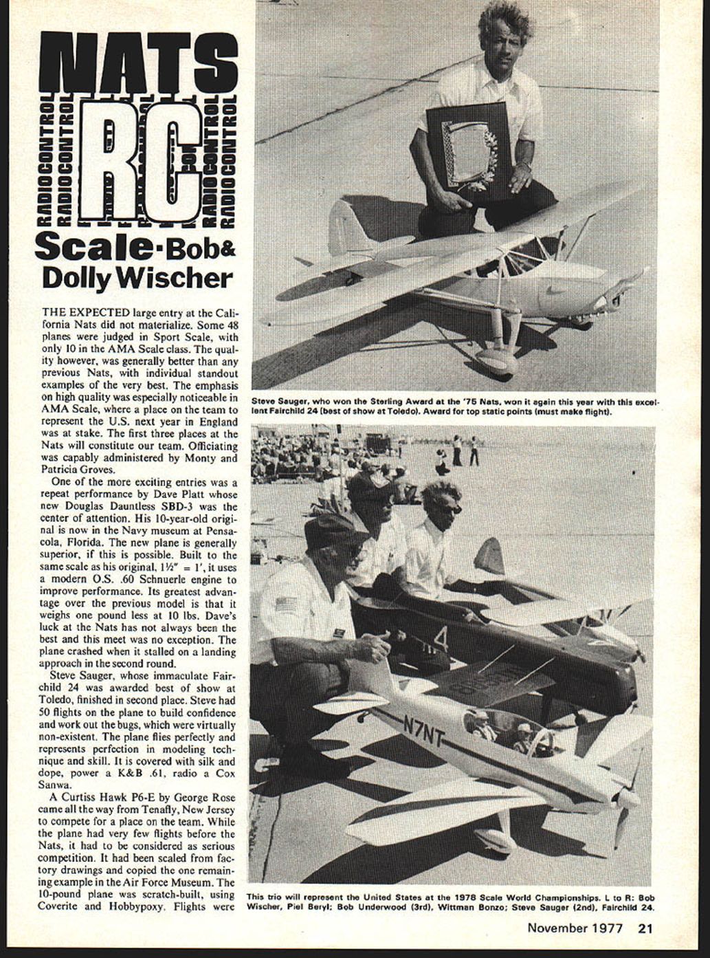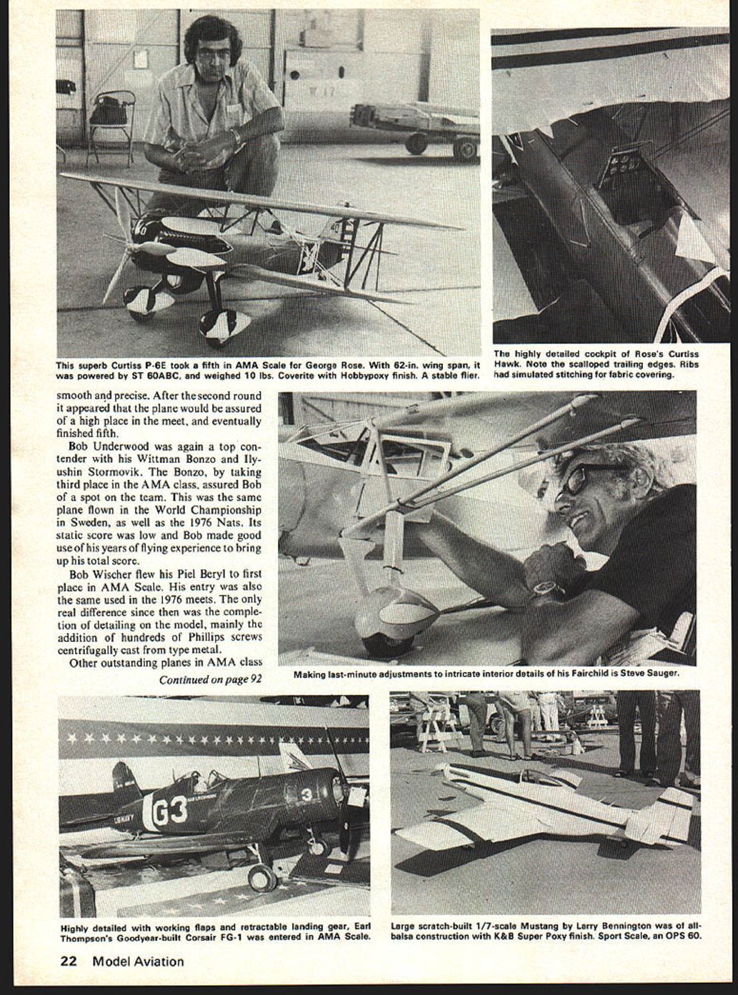EU mm U 0U HE Mu ScaleBob& Dolly Wischer THE EXPECTED large entry Cali fornia Nats did materialize Some 48 planes judged Sport Scale 10 AMA Scale class qual ity however generally better previous Nats individual standout examples very best emphasis high quality especially noticeable AMA Scale place team represent US next year England stake first three places Nats will constitute team Officiating capably administered Monty Patricia Groves exciting entries repeat performance Dave Platt new Douglas Dauntless SBD-3 center attention 10-year-old origi nal now Navy museum Pensa cola Florida new plane generally superior possible Built same scale original 1 /2 es modern OS 60 Schnuerle engine improve performance Its greatest advan tage over previous model weighs pound less 10 lbs Daves luck Nats has always best meet no exception plane crashed stalled landing approach second round Steve Sauger immaculate Fair child 24 awarded best show Toledo finished second place Steve 50 flights plane build confidence work out bugs virtually non-existent plane flies perfectly represents perfection modeling tech nique skill covered silk dope power K&B 61 radio Cox Sanwa Curtiss Hawk P6-E George Rose came way Tenafly New Jersey compete place team plane very few flights before Nats considered serious competition scaled fac tory drawings copied remain ing example Air Force Museum 10-pound plane scratch-built using Coverite Hobbypoxy Flights November 1977 21 Steve Sauger won Sterling Award 75 Nats won again year excel lent Fairchild 24 best show Toledo Award top static points must make flight trio will represent United States 1978 Scale World Championships L R Bob Wischer Piel Beryl Bob Underwood 3rd Wittman Bonzo Steve Sauger 2nd Fairchild 24 highly detailed cockpit Roses Curtiss superb Curtiss P-Ut took littfl AMA acale tar usorge Rose el-in wing span Hawk Note scalloped trailing edges Ribs powered ST 6OABC weighed 10 lbs Coverite Hobbypoxy finish stable flier simulated stitching fabric covering smooth precise After second round appeared plane would assured high place meet eventually finished fifth Bob Underwood again top con tender Wittman Bonzo Ily ushin Stormovik Bonzo taking third place AMA class assured Bob spot team same plane flown World Championship Sweden well 1976 Nats Its static score low Bob made good use years flying experience bring up total score Bob Wischer flew Piel Beryl first place AMA Scale entry also same used 1976 meets real difference since comple tion detailing model mainly addition hundreds Phillips screws centrifugally cast type metal Other outstanding planes AMA class 22 Model Aviation Continued page 92Making last-minute adjustments intricate interior aetaiis nis aircniia oteve auger Highly detailed working flaps retractable landing gear Earl Large scratch-built 1/7-scale Mustang Larry Bennington allThompsons Goodyear-built Corsair FG-1 entered AMA Scale balsa construction K&B Super Poxy finish Sport Scale OPS 60 new organization will provide means encouraging participation Carrier events sharing information about Carrier flying representing interests Navy Carrier fliers AMA first official act organization establish Eugene Ely Award commemorates first man suc cessfully take off land aboard ship 1911 1912 award Na tionals Navy Carrier Champion re ceives total points three Carrier events Nats years award went Ron Duly accumulated 7869 points placed first Class Class II N ats/Wischers continued page 22 included Granger Williams Curtiss Sea Hawk F6C-4 outstanding dummy engine disguising model engine sport scale Don Srull entered Dor nier DO-23G highly unusual subject its external ailerons twin engines Bud Atkinson flew Hawker Hunter exceptional penetration through usual afternoon wind examples WW II planes present Most spec tacular fine Douglas Dauntless SBD-3 Kent Walters large plane 1/7th size 14 pounds made spec tacular vertical dives 300-foot alti tude releasing its bomb near paved surface followed abrupt pull-out its final dive ran out air scat tered itself over large area Eventual winner Sport Scale 5-year-old llyushin Stormovik flown previous Nats Bob Underwood Don Liens Focke-WuIf FW 190-D placed second followed Srulls Dornier Walters Douglas Art Johnson entered very large Lockheed Lightning P-38L made screaming dives across field very high speed dropping its fuel tanks exactly same spot flight Bob Seigelkoff flew Cosmic Winds both Sport Scale Pattern very large-quarter size planes built own kits performance size outstanding OPS 60 engine power Richard Hagers Douglas C-47 finished Missile Command colors separately controlled throttle engine superb slow speed taxi control made takeoff difficult due lack synchronization AMA scale planes entered Eastern states 35 48 sport scale planes entered Cali fornia fliers highest scoring flight AMA scale made Joe Tschirgi Hansa Brandenburg seaplane lifted off wheeled-dolly landed very slowly almost no forward motion skid along its keel Actually Joes plane should have entered Sport Scale entry AMA protest against pattern-like flight WW II fighter majority Sport Scale Nats/Paul continued page 24 two scores due crashes passing 12 seeded fliers qualified expected seeding procedure promoted Keith Trostle PAMPA has proved fair way spread out recognized pilots difficult put words suc cess administration event performed Arlie Preszler Lanny Shorts Pre-Nats planning logistical support rivaled World Cham pionships Probably disappoint ing part entire show low number entries 51 Open six Junior eight Senior However entire Nationals entry low Al Rabes winning plane F-51D flew third place last year Weigh ing 51 oz craft has span 57 inches approximate wing area 5585 sq Al believes large flaps full-span boards root chord 325 tip 1 Al used molded balsa fuselage construction has developed successfully through Bearcat Sea Fury F-5l series semiscale stunters engine used Al called Su pertigre/Aloise 51 What amounts stroked ST 46 engine several other modifications Carlos 