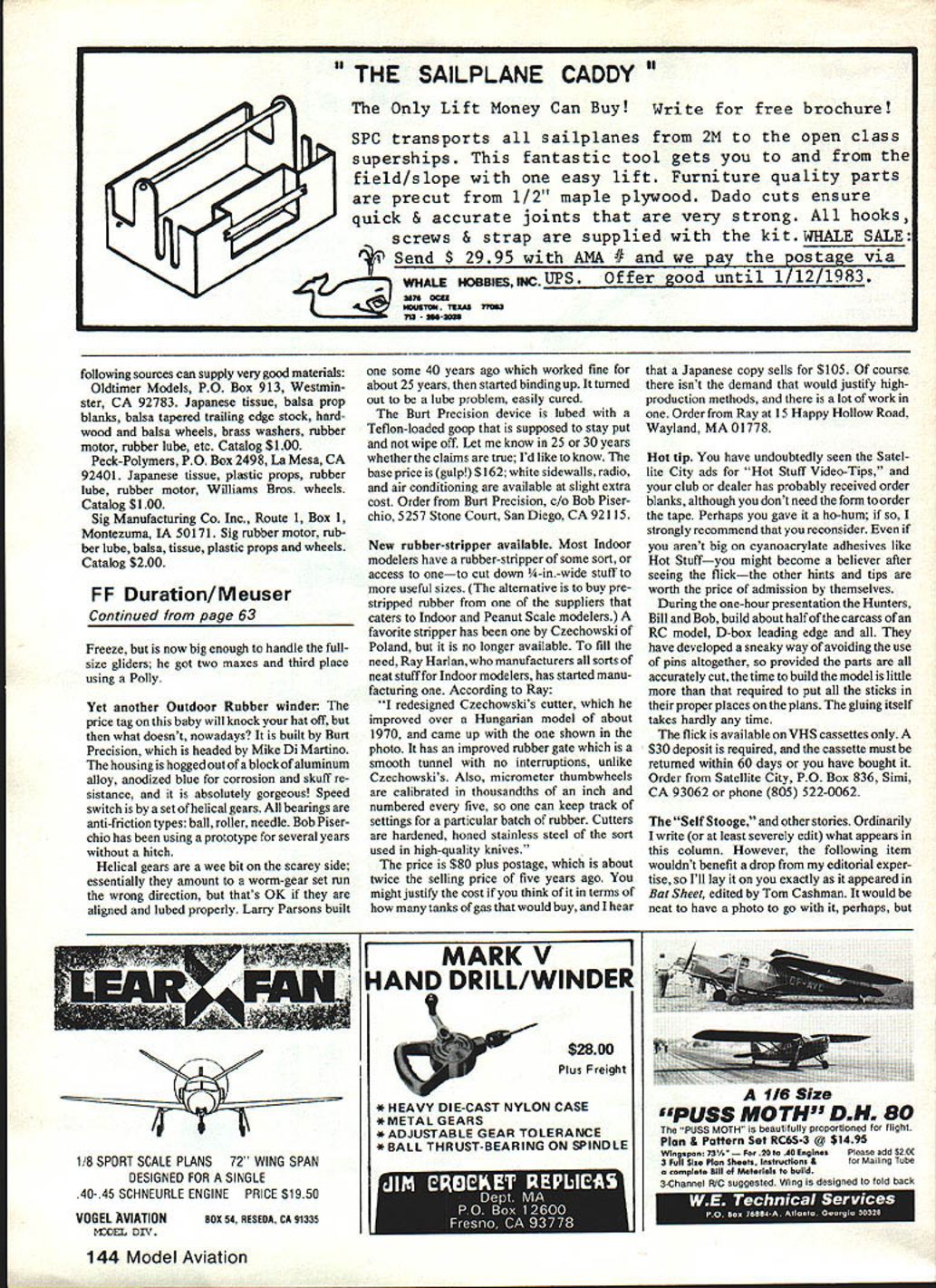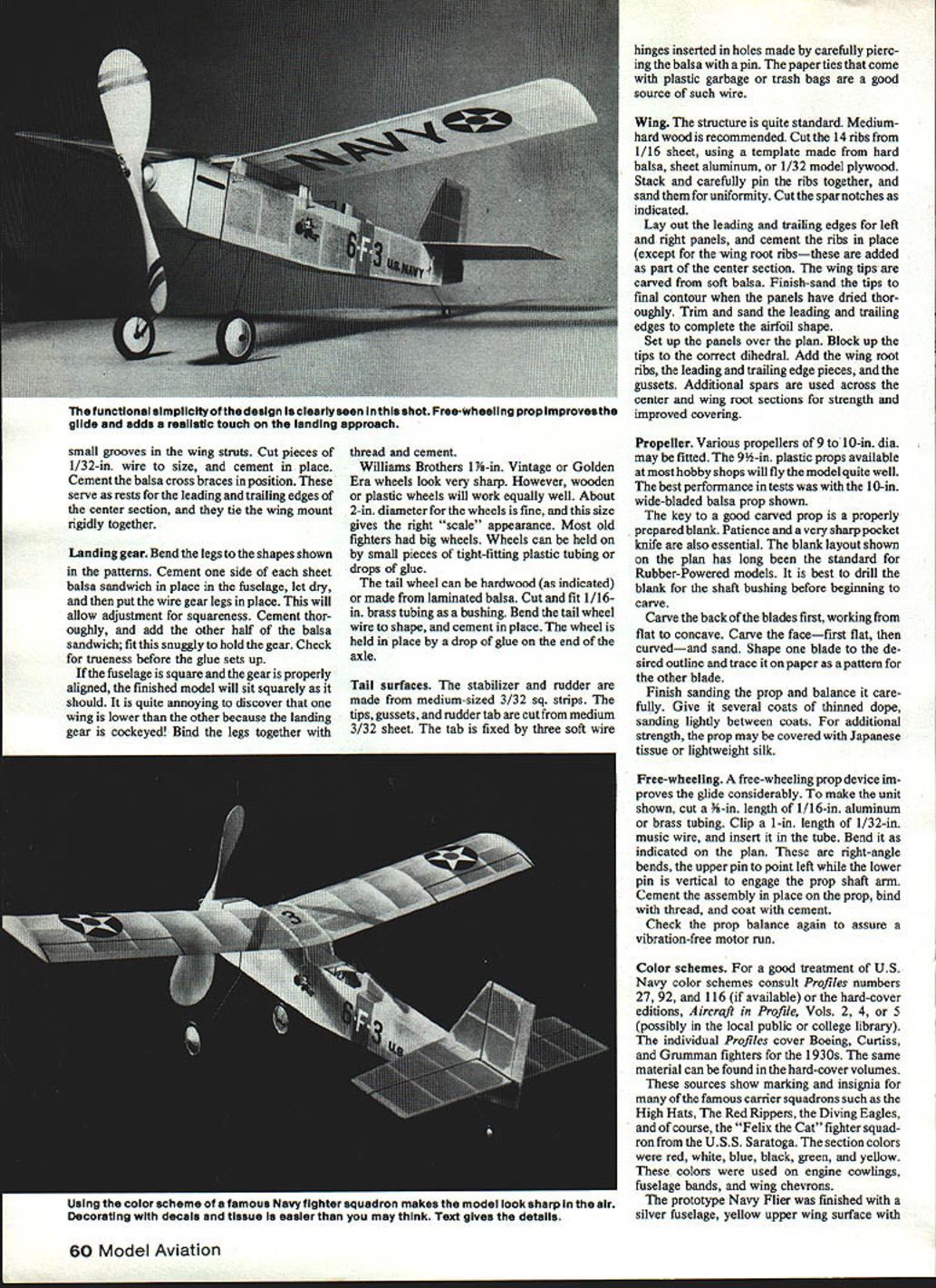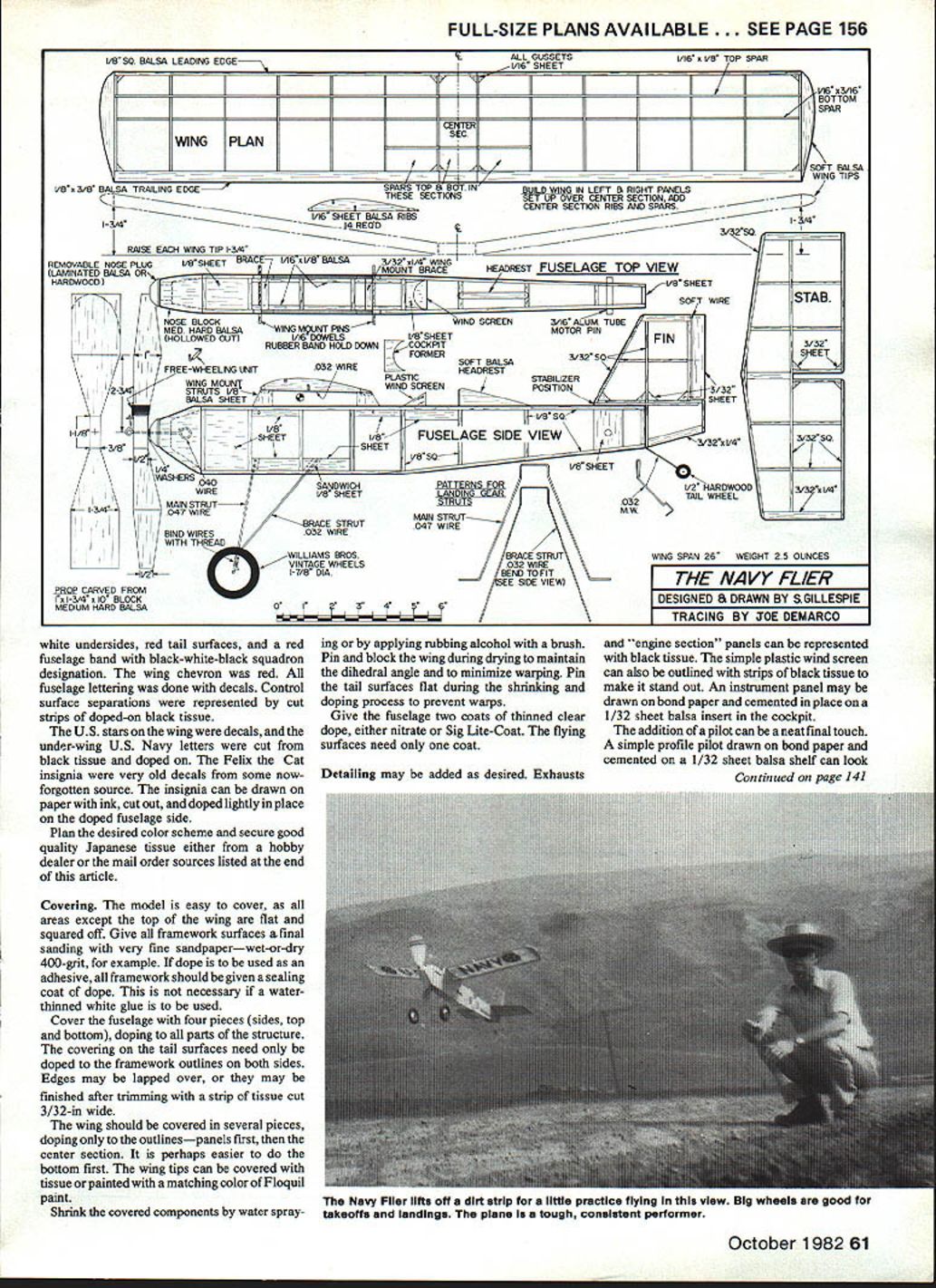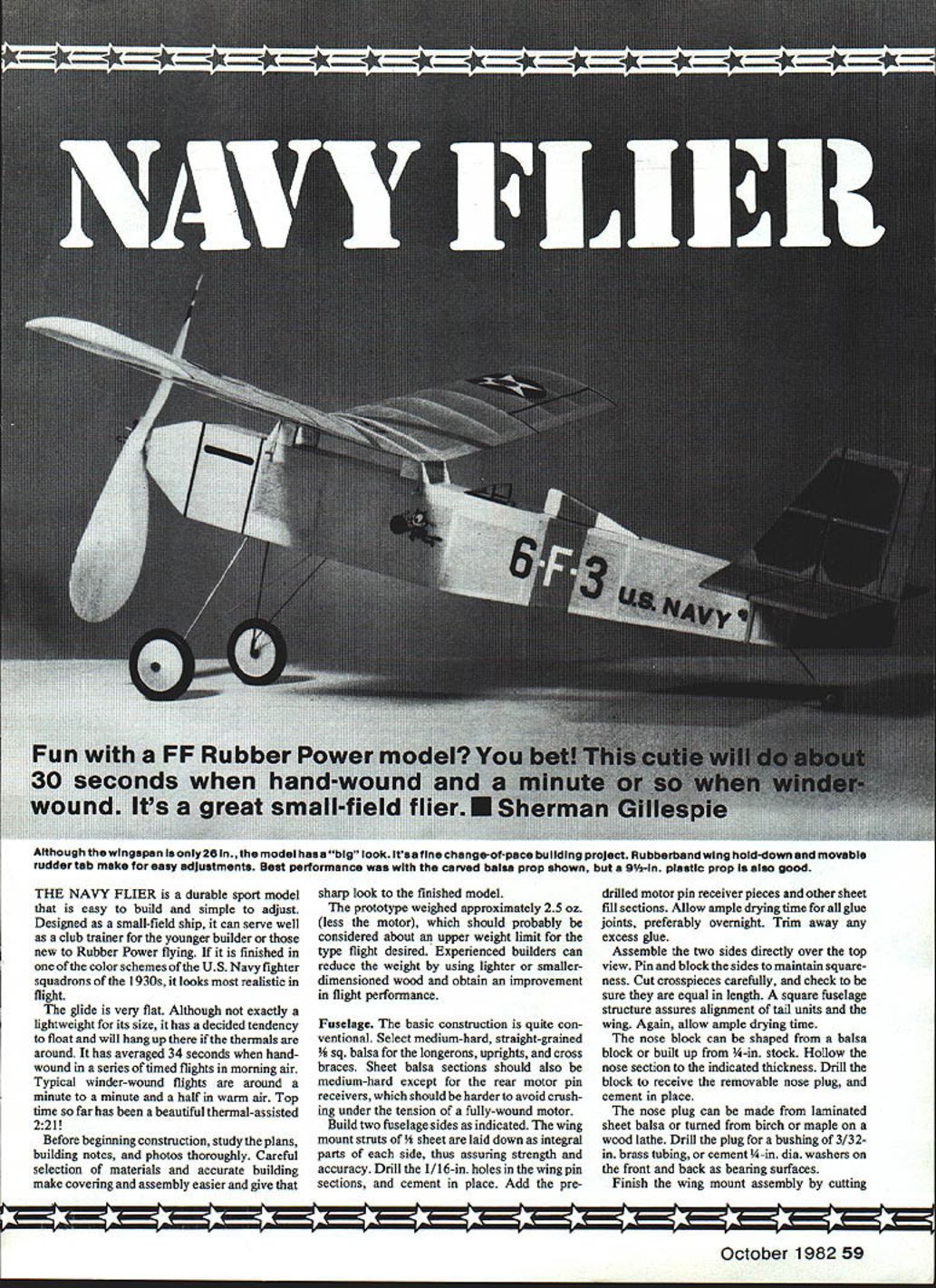Although thewingapan only2O model has bIg look ltsa fIne change-of-pace buildIng project Rubberbandwlng hold-down movable rudder tab make easy adjustments Best performance wIth carved balsa prop shown 91/z-ln plastic prop also good THE NAVY FLIER durable sport model easy build simple adjust Designed small-field ship can serve well club trainer younger builder new Rubber Power flying finished color schemes US Navy fighter squadrons 1 930s looks realistic flight glide very flat Although exactly lightweight its size has decided tendency float will hang up thermals around has averaged 34 seconds handwound series timed flights morning alr Typical winder-wound flights around minute minute half warm air Top time far has beautiful thermal-assisted 221 Before beginning construction study plans building notes photos thoroughly Careful selection materials accurate building make covering assembly easier give sharp look finished model prototype weighed approximately 25 oz less motor should probably considered about upper weight limit type flight desired Experienced builders can reduce weight using lighter smallerdimensioned wood obtain improvement flight performance Fuselage basic construction quite con ventional Select medium-hard straight-grained sq balsa longerons uprights cross braces Sheet balsa sections should also medium-hard except rear motor pin receivers should harder avoid crush ing under tension fully-wound motor Build two fuselage sides indicated wing mount struts t laid down integral parts side thus assuring strength accuracy Drill 1/16-in holes wing pin sections cement place Add pre drilled motor pin receiver pieces other sheet fill sections Allow ample drying time glue joints preferably overnight Trim away excess glue Assemble two sides directly over top view Pin block sides maintain square ness Cut crosspieces carefully check sure equal length square fuselage structure assures alignment tail units wing Again allow ample drying time nose block can shaped balsa block built up -in stock Hollow nose section indicated thickness Drill block receive removable nose plug cement place nose plug can made laminated sheet balsa turned birch maple wood lathe Drill plug bushing 3/3 2in brass tubing cement -in dia washers front back bearing surfaces Finish wing mount assembly cutting October 1982 59 small grooves wing struts Cut pieces 1/32-in wire size cement place Cement balsa cross braces position serve rests leading trailing edges center section tie wing mount rigidly together Landing gear Bend legs shapes shown patterns Cement side sheet balsa sandwich place fuselage let dry put wire gear legs place will allow adjustment squareness Cement thor oughly add other half balsa sandwich fit snuggiy hold gear Check trueness before glue sets up fuselage square gear properly aligned finished model will sit squarely should quite annoying discover wing lower other because landing gear cockeyed Bind legs together thread cement Williams Brothers 1 i-in Vintage Golden Era wheels look very sharp However wooden plastic wheels will work equally well About 2-in diameter wheels fine size gives right scale appearance Most old fighters big wheels Wheels can held small pieces tight-fitting plastic tubing drops giue tail wheel can hardwood indicated made laminated balsa Cut fit 1/16in brass tubing bushing Bend tail wheel wire shape cement place wheel held place drop giue end axle Tail surfaces stabilizer rudder made medium-sized 3/32 sq strips tips gussets rudder tab cutfrom medium 3/32 sheet tab fixed three soft wire hinges inserted holes made carefully pierc ing balsa pin paper ties come plastic garbage trash bags good source such wire Wing structure quite standard Mediumhard wood recommended Cut 14 ribs 1/16 sheet using template made hard balsa sheet aluminum 1/32 model plywood Stack carefully pin ribs together sand uniformity Cut spar notches indicated Lay out leading trailing edges left right panels cement ribs place except wing root ribsthese added part center section wing tips carved soft balsa Finish-sand tips final contour panels have dried thor oughly Trim sand leading trailing edges complete airfoil shape Set up panels over plan Block up tips correct dihedral Add wing root ribs leading trailing edge pieces gussets Additional spars used across center wing root sections strength improved covering Propeller Various propellers 9 10-in dia may fitted 9w-in plastic props available hobby shops will fly model quite well best performance tests 10-in wide-bladed balsa prop shown key good carved prop properly prepared blank Patience very sharp pocket knife also essential blank layout shown plan has long standard Rubber-Powered models best drill blank shaft bushing before beginning carve Carve back blades first working fiat concave Carve facefirst fiat curvedand sand Shape blade de sired outline trace paper pattern other blade Finish sanding prop balance care fully Give several coats thinned dope sanding lightly between coats additional strength prop may covered Japanese tissue lightweight silk Free-wheeling free-wheeling prop device im proves glide considerably make unit shown cut h-in length 1/16-in aluminum brass tubing Clip 1-in length 1/32-in music wire insert tube Bend indicated plan right-angle bends upper pin point left lower pin vertical engage prop shaft arm Cement assembly place prop bind thread coat cement Check prop balance again assure vibration-free motor run Color schemes good treatment US Navy color schemes consult Profiles numbers 27 92 116 available hard-cover editions Aircraft Profile Vols 2 4 5 possibly local public college library individual Profiles cover Boeing Curtiss Grumman fighters 1930s same material can found hard-cover volumes sources show marking insignia famous carrier squadrons such High Hats Red Rippers Diving Eagles course Felix Cat fighter squad ron USS Saratoga section colors red white blue black green yellow colors used engine cowlings fuselage bands wing chevrons prototype Navy F