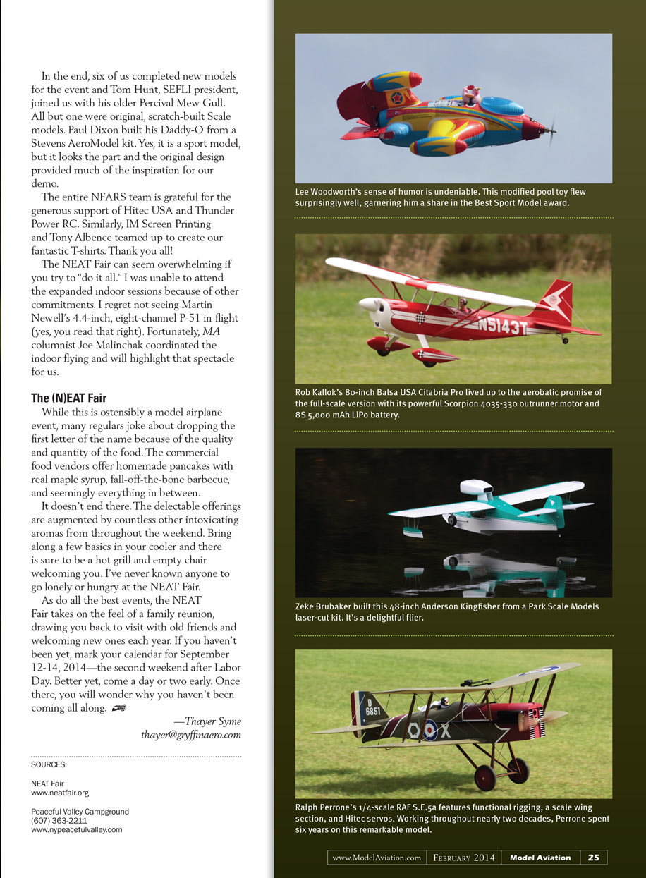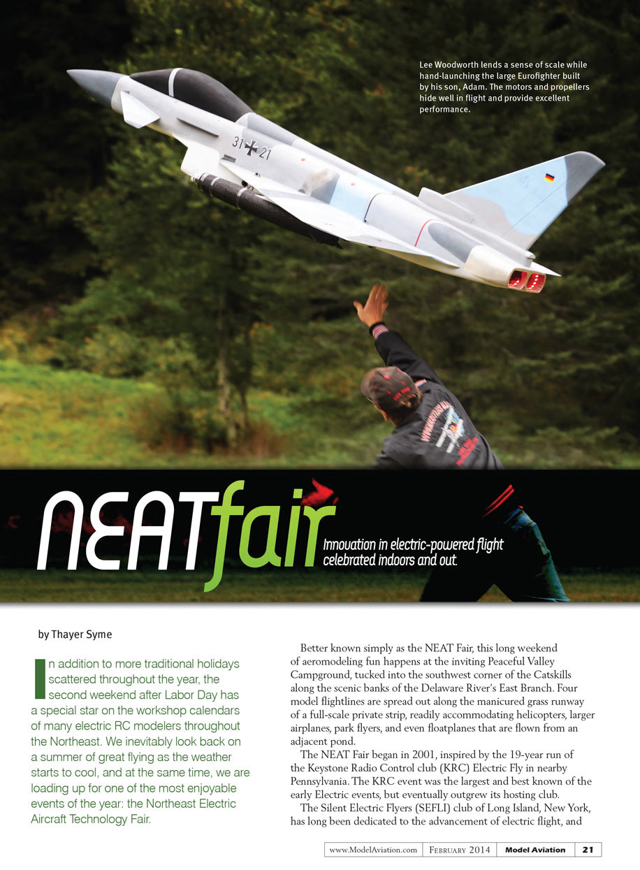 The NEAT Fair began in 2001, inspired by the 19-year run of the Keystone Radio Control club (KRC) Electric Fly in nearby Pennsylvania. The KRC event was the largest and best known of the early Electric events, but eventually outgrew its hosting club.