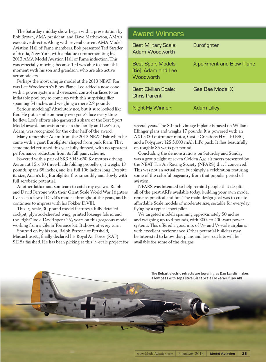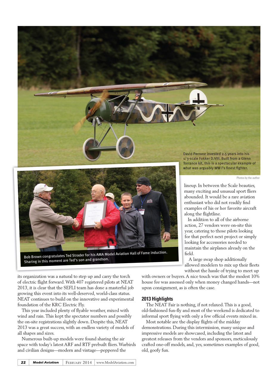 The Silent Electric Flyers (SEFLI) club of Long Island, New York, has long been dedicated to the advancement of electric flight, and its organization was a natural to step up and carry the torch of electric flight forward. With 407 registered pilots at NEAT 2013, it is clear that the SEFLI team has done a masterful job growing this event into its well-deserved, world-class status. NEAT continues to build on the innovative and experimental foundation of the KRC Electric Fly.
