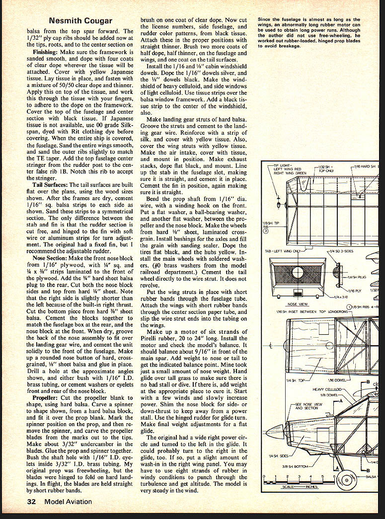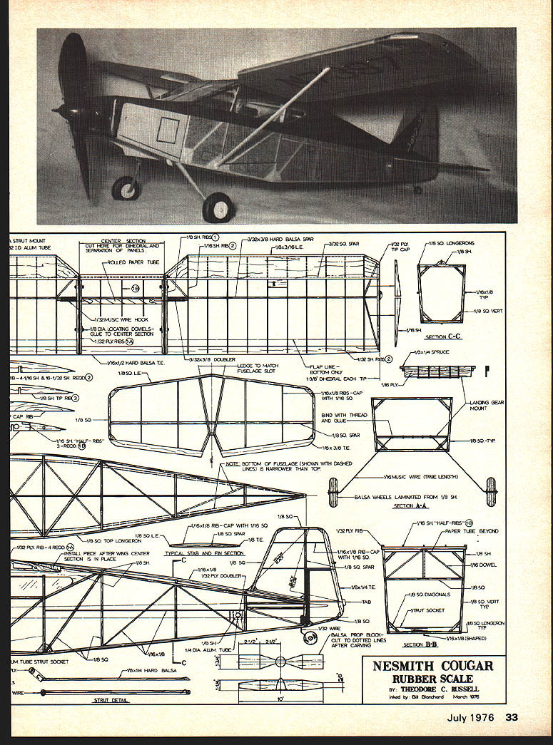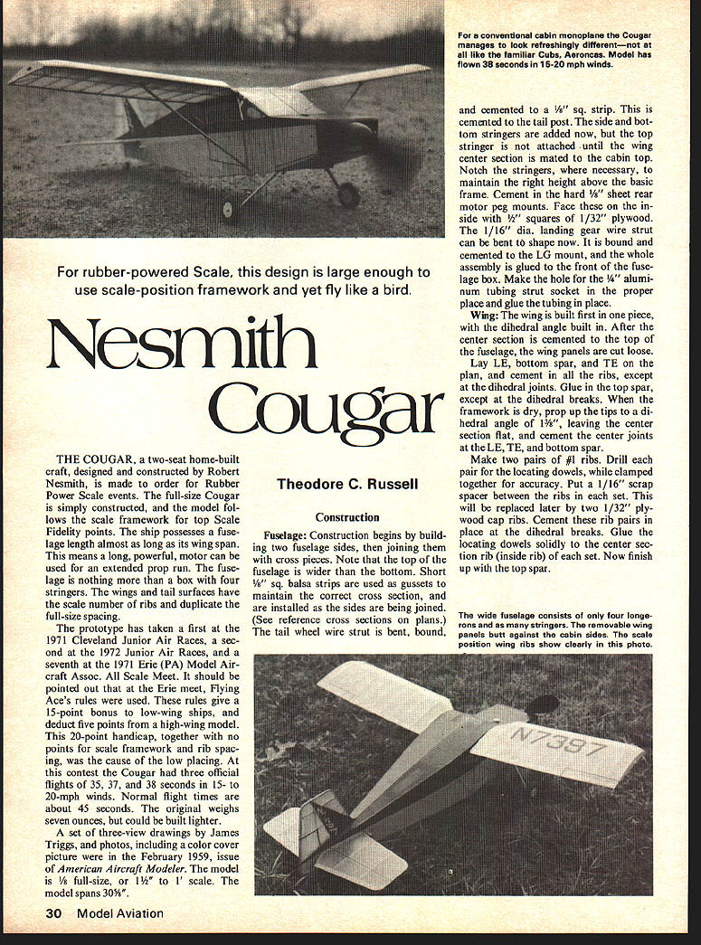 For rubber-powered Scale design large enough use scale-position framework yet fly like bird Nesmith Cougar THE COUGAR two-seat home-built craft designed constructed Robert Nesmith made order Rubber Power Scale events full-size Cougar simply constructed model fol lows scale framework top Scale Fidelity points ship possesses fuse lage length almost long its wing span means long powerful motor can used extended prop run fuse lage nothing box four stringers wings tail surfaces have scale number ribs duplicate full-size spacing prototype has taken first 1971 Cleveland Junior Air Races sec ond 1972 Junior Air Races seventh 1971 Erie PA Model Air craft Assoc Scale Meet should pointed out Erie meet flying Aces rules used rules give 15-point bonus low-wing ships deduct five points high-wing model 20-point handicap together no points scale framework rib spac ing cause low placing contest Cougar three official flights 35 37 38 seconds 15- 20-mph winds Normal flight times about 45 seconds original weighs seven ounces could built lighter set three-view drawings James Triggs photos including color cover picture February 1959 issue American Aircraft Modeler model -size 1 1 scale model spans 30/s Theodore C Russell Construction Fuselage Construction begins build ing two fuselage sides joining cross pieces Note top fuselage wider bottom Short alsa strips used gussets maintain correct cross section installed sides being joined See reference cross sections plans tail wheel wire strut bent bound conventional cabin monoplane Cougar manages look nfreshingly differentnot like familiar Cubs Aeroncas Model has flown 38 seconds 15-20 mph winds cemented sq strip cemented tail post side bot tom stringers added now top stringer attached until wing center section mated cabin top Notch stringers necessary maintain right height above basic frame Cement hard sheet rear motor peg mounts Face side res 1/32 plywood 1/16 dia landing gear wire strut can bent ti shape now bound cemented LG mount whole assembly glued front fuse lage box Make hole i num tubing strut socket proper place glue tubing place Wing wing built first piece dihedral angle built After center section cemented top fuselage wing panels cut loose Lay LE bottom spar TE plan cement ribs except dihedral joints Glue top spar except dihedral breaks framework dry prop up tips di hedral angle 1/s leaving center section flat cement center joints LE TE bottom spar Make two pairs #1 ribs Drill pair locating dowels clamped together accuracy Put 1/16 scrap spacer between ribs set will replaced later two 1/32 ply wood cap ribs Cement rib pairs place dihedral breaks Glue locating dowels solidly center sec tion rib inside rib set Now finish up top spar 30 Model Aviation wide fuselage consists four longe rons stringers removable wing panels butt against cabin sides scale position wing ribs show clearly photo Make two wing struts hard / x 1A balsa groove 1/32 wire insert Cement wire place rein force strip silk Position wings fuselage lined up right angles fuselage centerline glue wing securely fuselage After dries slip short lengths 1/32 ID aluminum tubing strut ends set place Hold position rubber band through fuselage socket tube Cement tubing strut end hard balsa mount wing careful get glue side tubing cement dry remove struts cut wing panels center section method assembly insures removable wing panels correct incidence dihedral angles after being cut free fuselage Sew strut tubing its mount cement again make secure Sand LEs shape add 1/32 sheet Drawing proof scale WING SPAN-20 -5 ENGINE85l15 HP 64 ME TAL PROP FIBERGLASS NOSE COWL 7 LANDING LIGHT & PITOT TUBELEFT WING ONLY 1 DIHEDRAL CONSTRUCTION WWIGS-WOOD SPARS & RIBS FABRIC COVERING FUSELAGE & TAIL SURFACESSTEEL TUBE FABRIC COVERING HIS VIEW TOP RIGHT SIDE ______ THIS VIEW ______ BOTTOM RIGHT ______ SIDE QLOBz YELLOW WITH BLACK TRIM 7 t TORSION BAR LANDING BC ABC D D F E E BLACK ABC VENT FRTAL COWL PANELSBCEF ROBERT NESMITHS COUGAR 0246ORAWN FOR MODEL AVIATION BY TED RUSSELL July1976 31 simple basic structure makes model easy conStruct RC typesand othersshould encouraged scale up needs Nesmith Cougar balsa top spar forward 1/32 ply cap ribs should added now tips roots center section Finishing Make sure framework sanded smooth dope four coats clear dope wherever tissue will attached Cover yellow Japanese tissue Lay tissue place fasten mixture 50/50 clear dope thinner Apply top tissue work through tissue fingers adhere dope framework Cover top fuselage center section black tissue Japanese tissue available use 00 grade Silkspan dyed Rit clothing dye before covering entire ship covered fuselage Sand entire wings smooth sand outer ribs slightly match TE taper Add top fuselage center stringer rudder post cen ter false rib lB Notch rib accept stringer Tail Surfaces tail surfaces built flat over plans using wood sizes shown After frames dry cement 1/16 sq balsa strips side shown Sand strips symmetrical section difference between stab fin rudder section cut free hinged fin soft wire aluminum strips turn adjust ment original fixed fin recommend adjustable rudder Noae Section Make front nose block l/l6 plywood 14ff sq 1/4 x ps laminated front plywood Add hard sheet balsa plug rear Cut both nose block sides top hard sheet Note right side slightly shorter left because built-in right thrust Cut bottom piece hard t balsa Cement blocks together match fuselage box rear nose block front dry groove back nose assembly fit over landing gear wire cement unit solidly front fuselage Make up rounded nose button hard cross grained t balsa glue place Drill hole approximate angles shown either bush 1/16 ID brass tubing cement washers eyelets front rear nose block Propeller Cut propeller blank shape using hard balsa Carve spinner shape shown hard balsa block fit over prop blank Mark spinner position prop re move spinner carve propeller blades marks out tips Make about 3/32 undercamber blades Glue prop spinner together Bush shaft hole 1/16 ID eye let