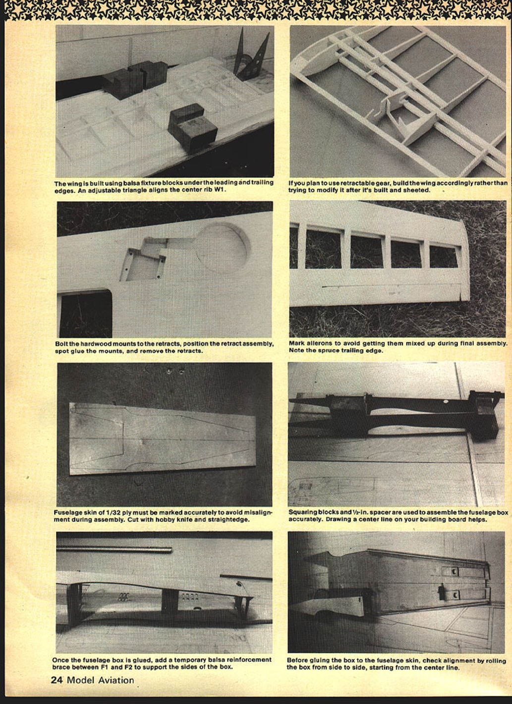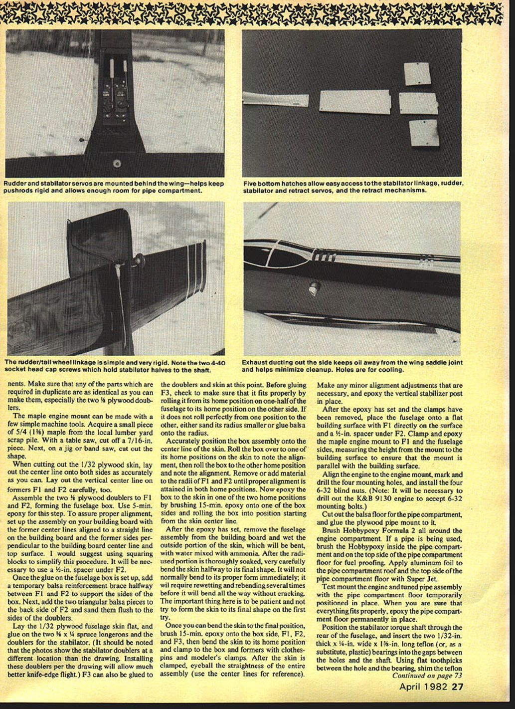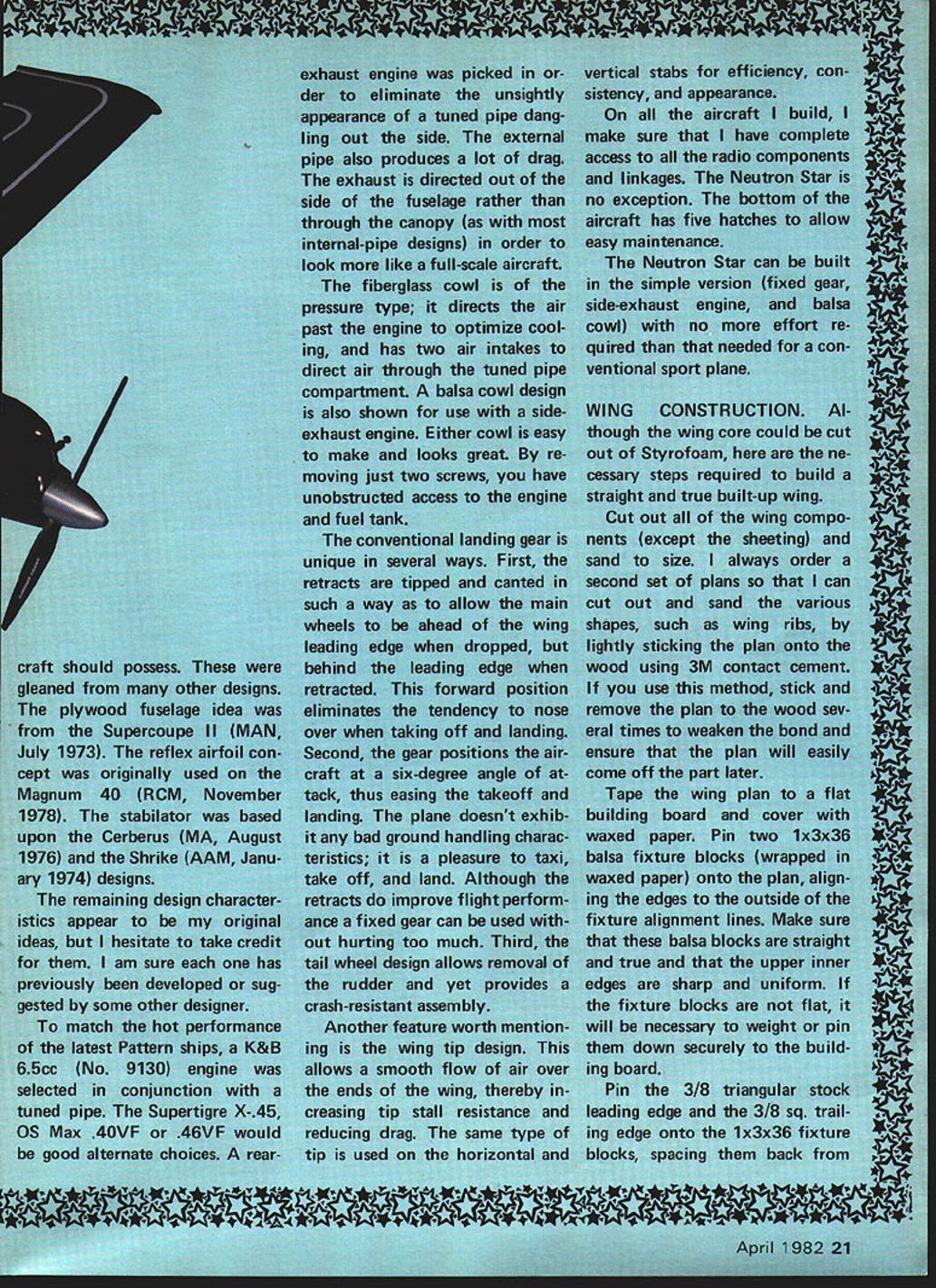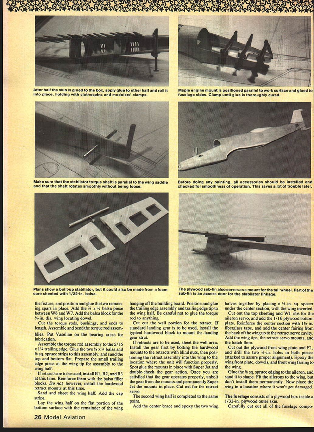 ese ce minly NJ dc classy ap machines being n aircraft c deveic Won Star stages -powered latter thn vith conven made tli look fora 1 mai ed ship sembly nd rig field U vely take etet ince al ge e other ch ong ur L NO OCR TEXT Neat radIo Installation looks better can preventa crash dueHatch sub-fIn allows easy access stabllatortorque rod linkage Two vIbratIon Throttle servo ahead battery packscrews hold hatch Goldberg Angle Hold-Down works well too fixture edge 1/8 match plan location Using small triangle position glue using Jet Hot Stufi ribs Wi proper location aligning triangle plans below Make sure determine ahead time wing half building mark accordingly avoid costly error Remember will building left wing half top-side-up right wing half bottom-side-up Position Wi 1-deg 45-mm angle off vertical glue place done approximate dihedral simplify joining two wing halves later An adjustable triangle works great step dont have just tip Wl back 1/16 its maxi mum thickness off verticaL sure remember half building tip Wl proper direction Position glue two top spars ones facing up place Remove wing half 22 Model Aviation Removing cowl allows complete access engine throttle linkage tank tuned pipe OS 7B carb used K&B 65 Wheels positioned ahead wing leading edge canting tipping retracts makes takeoff landIng very easy Engine fuel tank compartment should tnorougnly fuel-proofed slow-cure epoxy Blind nuts under wood mount engine bolts choose build fiberglass cowl Styrofoam plug should look lIke plug must conform fuselage sides Holes engine ana xan comparrmern vor cooming engine tuned pipe help drain oil gunk etore enciosing tuned pipe compartment fuel-proofed epoxy aluminum foil glued top reflect heat OF A~POOr1/16 PL1NOC TIP /8 BALSA ON1/200 ALUMINUM 1/16 PLY PLATESTORQUE TUBEGOLDEN ROD INNER TUBE 10 STAB POOT RIB JR7/ jUl FOR DOWN GEAR--- FURTHER PULL IS SERVO PUSH- FIRST TUG RELEASES HOOKHOOK UP 10 LOCK RUDDER DOWN BALSA LJI~ILJ- eDUBROWHL b-7 COLLAR F-21/8 PLYWOOD3/8BALSA BASE UP AND LOCKEDSPRIN6 HELPSHOOK SUPPORT WHEELROCKSAND LOCKED TILL LOCKEDOVER CAM F 1 1/4 PLYWOCO/8 SHEET1/32 PLYWOOD FUSELAGE- FIBERGLASS COWL ON 1/16 PLY FRAME 1/8 X 1/4 LE BALSA 1/8 X 3/8 SPARS 1i16 FACED 1/4 PLYIAD KEEL I/B PLYNOD DU BRO NO 138 LINKAGE TABS /B X 1/4 SPRUCEI TAIL WHEEL ON BOllOM COfJERS3/32 M WIRE THRU 1/32 PLYWDD HAiCH1/8 BRASS TUBE 1/8 WIRE IN BRASS TUBE FROM AILERON SERVO 3/8 X 12 BALSA AILERON HARDWOOO EDGE 1/16 SHEET BALSA TOP BALSA. . BALSA TIP 1/4 DOWELS 12I/4X 3/8SPRUCE IN WING CSI/B PLY~0CS SPARS1/32 PLYWOOD PLATE K B B 65 CC ENGINE1/16 BALSA WALLS FOR LGLG RIBSTOP AND BOTTOM 3/47/s MAPLE MOIORGOLDBERG TWIN GEAR RG 2 RETRACTSYSTBAI/B BALSA RIBSI/4X 3/BBALSA SPARS3/BBALSA TRIANGLE LE BALSA UNDER COWLMOUNT NOSE TO F-I2 /2 DIAWHEELSBOLTS 10 HARDWOOD WITH 1/4 BALSA SPACERS BLOCKS W/T-NUTS 24 Model Aviation wing built using balsa fixture blocks underthe leading andtralling edges An adjustable triangle aligns center rib Wi p0. e retractable gear build thewing accordingly ratherthan trying modify after Its built sheeted Bolt hardwood mounts tothe retracts position retract assemblyMark ailerons avoid getting mixed up during final assembly spot glue mounts remove retractsNote spruce trailing edge Fuselage skin 0 1/32 ply must marked accurately tO avoid misalign ment during assembly Cut hobby knife straightedge quaring DIOCK5 ana y2-in spacerare used assemblethetuselage box accurately Drawing center line building board helps Once fuselage box glued add temporary balsa reinforcement brace between Fl F2 support sides box Before gluing box fuselage skin check alignment rolling box side side starting center line 3/B BALSA 1/32 PLY D-D NOTE EPOXY WING HALVES TOGETHER ThEN REINFORCE1/B PLYWOCOOULDBERG TWIN GEAR RG-2FISTSRE ALISPI LINED VBBALSA2 RAG VRBALSA 2 RED VRRALSA 2 RED SISIR TOP ROTPB BALSA RE PB BALSA 2 RED VSU/4 BALSAI 2TOPBBOTTOM-R S/B I-/2 BALSA TAPB BALSA2 RED ROBART STEEL PINSTOCI WITH ROUNDEDALRER TORDUE ROD HINGE POINT AREDILUONG EDGEPB WIRE WITh BRASSDABU-IRBALSA1GB PLY BOTTOM PUG BEARINGSI/B SO SPRUCETRALING EDGE STOCIG9 LB BALSA 2 REG 2 RED 5-6 r1-- 3/52 BALSA 2 RED S-S S2BALSA 2 BEG 3/22 BALSA 2 BED S/32BALSA2 BED 132 PLYWOOD FUSALAGA OUTLINE1/BRALSA 2 RED NOTE T145 LEA ID NOT ALIGNED I/IA DIA MUSIC WIBE WITH THE TOP VIEW IN TREW NO SELF TAPPING BUSIIING COWL PIN 2 REDLARED LENGTHWISE DIRECTIONWITH 1/4-20 TAPPED HOLE FOX F3/4 DIA SLIM JIM ALUMINUM SPINNER7/IA MAPLE ENGINE ARYINT 1/4 V2 SPRUCE SERDG MOUNT 2 AEDVSD PLYsos BRASA OILED -NOrE TOP OF FUSELAGE NOT DROWN FOR CLARITYI YWOOD A-A ~111—.IiIIJUSELAGEELAGE TOP VIEW JUU 1- IITBPLY 2 BED1/16 PLY HATCH TAB] HATCH ROIBEONCERFITTED NODE HOLES aK- 1/B PLYWOOD GRAD1/32 PLYWOOD WSAG SA[52E FILLETDOLREER GREG VBR 16 SPRSEEV32 TEFLON REARINGO7DIA WIRE - FUSELAGE DOUBLERPODITIONEO TO INSIDE SF FUSELAGE2 REQUIREDGUWD IN PLACE 2 RED PB BALSAFINROD RAE BR 65cc ENSINE NO WOOSE ORSOP BASSES PIPE PR PLYWOBA UGUIL TAB W/U-UBRCINENUrABEA--4 --- / -4 AIR EX4flSIDE______ 3/RLBI~--~~LL-EVIEW_______TLBNEUTGI/RSIARAR r ' KLIUBEBEBLEBFL~SERVAN --- RUD 1B5jQj5255/J5 iUBENERI 1 14-4BP4LBN---4J'---ELESETOR PIJiEODZrBATE BaLE S 01W 5/B FUEL YANK Arr IPRER DREBAS I JtBRRREBBBPLIWAINTOIMDOEE 0-I________ B NDSI GVB ENDS BE TIS REQ BEE-ARES NB IUBIPRI IRUBBRT3LESFUELARJfl PUABRECEIVERII~-______-4BRED UACIBR W/ I/BSALSA 9AlL p PLYRUDDER4-RB TAP BAA FDSBBEPUSHROD- IRBALSAIWRUB PB BALSA3r 4I --L ------------P32 PLYWOOD32 FL WOOD3/B BALSAI/B UlABA TIRE 5/4 BALSAF-2WOODDCREW 2 RED /HA CH6PLYWOOD5430 MARIA WIRE REMOVAR E HATCH -P32 PLYWOOD/4 FL W PGRENOVABLE BATCH VIA PLYWOOD FRAME~T LI WELMAD BA 37 OS 5/AG40 FSR ENGINEI/BPLY-C G-PIBBALSAWING /4 20 BAtON BOLTYWOODA~k\TNDIB TAR BREEC HATCHLBATSP4 FL FLOORPIE PLYWOOD ~----f1K\ SADNANAIBM IU/UZIIA PB FL REELCELLAR W/WASBEBA /4 FL-RBILAUBA RE DOUBLER /4K4IAY1IRBERET CScRAWL CIBA BALSA BLOCKS1/B K1K4i2I FLTAP B SOnORA B CASTRAL ___WREEL4COWL4-FRAMKFRONT WING PLATEIJ IN DOWN P05S/BAt__6 ________LjHF 2 NEUTRON STAR PRESAUBE COWL TOP VIEW 