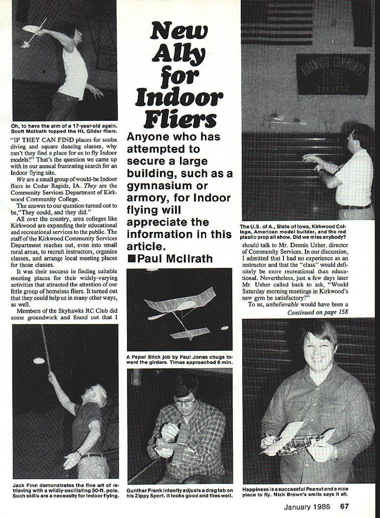 IF THEY CAN FIND places scuba diving square dancing classes cant find place us fly Indoor models Thats question came up annual frustrating search Indoor flying site small group would-be Indoor fliers Cedar Rapids IA Community Services Department Kirkwood Community College answer question turned out beThey could did over country area colleges like Kirkwood expanding educational recreational services public staff Kirkwood Community Services Department reaches out small rural areas recruit instructors organize classes arrange local meeting places classes success finding suitable meeting places widely-varying activities attracted attention little group homeless fliers turned out could help us other ways well Members Skyhawks RC Club did some groundwork found out New Ally Indoor Fliers Anyone has attempted secure large building such gymnasium armory Indoor flying will appreciate information article EPaul Mcllrath January 1986 67 Oh have arm 17-year-old again Scott Mciirath topped HL Gilder fliers US State Iowa Klrkwood Col lege American model builder red plastic prop show Did miss anybody should talk Mr Dennis Usher director Community Services discussion admitted no experience instructor class would defi nitely recreational educa tional Nevertheless just few days later Mr Usher called back ask Would Saturday morning meetings Kirkwoods new gym satisfactory us unbelievable would have Continued page 158 Paper Stick job Paul Jones chugs ward girders Times approached 6 mm Jack Finn demonstrates tine art re trieving wildly-oscillating 30-ft pole Such skills necessity Indoor flying Gunther Frank intently adjusts drag tab Zippy Sport looks good flies well Happiness isasucceseful Peanutanda nice place fly Nick Browns smile says PILOTS TS RIOR TS T THE MOST SUPERIOR PILOT FIGURE ON THE MARKET LIGHTEST WEIGHT MOST REALISTIC AVAILABLE GIVE YOUR PLANE PILOT. FOR YOUR NEWEST OLDEST OR NEXT CREATION R YOURS TODAY FULL FIGURES CIVILIANWWII MILITARY 1/3 Scale $19951/5 Navy $1395 1/4ScaIe14951/6AAF1195 1 /5 Scale 1295 Plus 1/12 Scale895$250 shipping 1/12 Chopper 895each figure KNIGHTS OF THE AIR 1400 Rte 22 West Friendship MD 21794 301-489-5050 FL Y ME WINDSOCK Attaches antenna mast clips clips included Available frequency colors Give frequency number order 5u&H 65 Foreign orders add S8H $150 Calif Residents add 6% tax Product Brochure Free order Jet fla Products PO Box 484 Lake Elsinore CA 92330 714 674-1151 help underwrite costs host club may win very first contest will gain experience enjoy camaraderie associated competition Soon will winning share trophies ten sion meet never goes completely away us make mistakes contests natural No ridi culed seriously rate foul up crash front friends least riding thing personal injury remote injured pride give competition try may like us become hopelessly hooked Found Lost model has found near site La Junta SAM Champs no description model other number A9663 model AMA has no record number its yours can claim model identifying Nels C Larsen Jr 601 Elm St Lajunta CO 81050 Clarence Haught 3226 Honeysuckle Dr Coeur dAlene ID 83814 New AIIy/Mcllrath Continued page 67 accurate word satisfactory tried too optimistic past great-sounding plans like almost al ways went awry building custodian would forget show up key volleyball game would scheduled same time session time unlike others help experienced professionals Community Services staff publicized meetings scheduled gym handled quiries registration collected tu ition showed up schedule key Theirs quality operation start finish During winter flying hit some snags course problems staff handled phone calls knew ropes locating alternate site short notice As students think ap preciated rare opportunity responded enthusiasm didnt hear arguments about rules complaints about quality judging Thats quite incredible message have potential Indoor fliers area stymied lack place fly investigate adult education facilities nearest com munity college name local organization may different names junior college area college adult education extension service worth checking out Whatever name talk over might find best friend homeless Indoor flier ever Manhattan/Van Gorder Continued page 70 strength handling connecting fully-wound motor prop assembly rear motor supports made /16 sheet small -in round piece 1/ plywood glued inside added strength little trick use make sure aluminum tubing used rear peg highly polished use rubbing compound toothpaste will also work Polishing removes slightest nicks tubing have found little nicks can cause small nick rubber motor result premature failure other nice feature about aluminum tube rear motor peg can put 032 wire through hold model winding stooge Build rectangle part fuselage first Crack joints front rear rectangle glue rear end together put nose together will end up very straight true wellaligned fuselage dry lightly sand set aside Prepare building wing stab upper lower rudders making set cardboard templates shown pictures use soap cartons tem plates Make sure templates under size allow spars use 1-in squares scrap cardboardto hold spars against template during construction 158 Model Aviation 8 plustails Wind Direction Anytime Anywhere GOITIOLINI TRill PROFILE0COM8A 7RA T WIDE & NARROW WEDGE 7 5 6 oz Capacities UNIFLOW & STINDD Gumtrn usiA Vials Ingredients detailed bochurA50C stamps/check oni CAROLINATAFFINDER 8345 Delhi Road charleston Hgts. sc 29418 803-553-7169