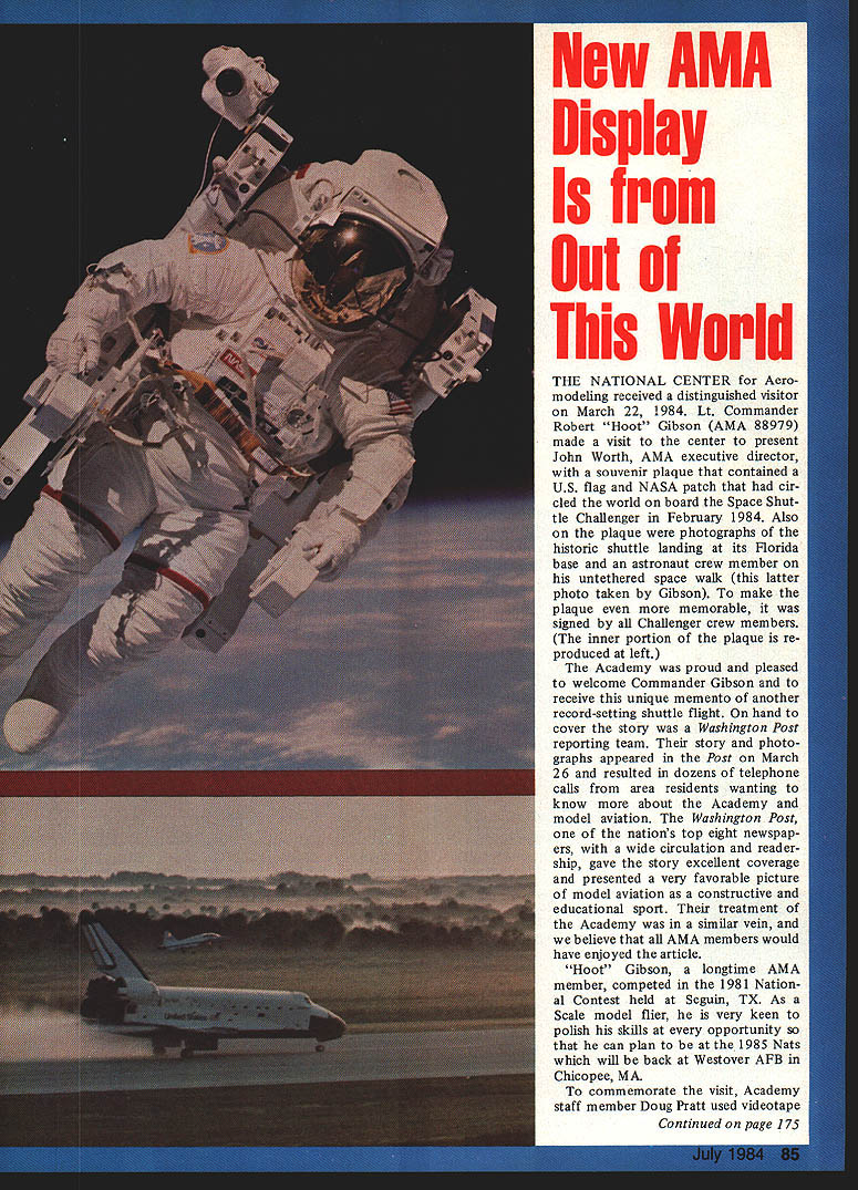 \deflang1033\pard\plain\f0\fs17 New AMA Display Out World THE NATIONAL CENTER Aero modeling received distinguished visitor March 22 1984 Lt Commander Robert Hoot Gibson AMA 88979 made visit center present John Worth AMA executive director souvenir plaque contained US flag NASA patch cir cled world board Space Shut tle Challenger February 1984 Also plaque photographs historic shuttle landing its Florida base astronaut crew member untethered space walk latter photo taken Gibson make plaque memorable signed Challenger crew members inner portion plaque re produced left Academy proud pleased welcome Commander Gibson receive unique memento another record-setting shuttle flight hand cover story Washington Post reporting team story photo graphs appeared Post March 26 resulted dozens telephone calls area residents wanting know about Academy model aviation Washington Post nations top eight newspap ers wide circulation reader ship gave story excellent coverage presented very favorable picture model aviation constructive educational sport treatment Academy similar vein believe AMA members would have enjoyed article Hoot Gibson longtime AMA member competed 1981 Nation al Contest held Seguin TX As Scale model flier very keen polish skills opportunity can plan 1985 Nats will back Westover AFB Chicopee MA commemorate visit Academy staff member Doug Pratt used videotape Continued page 175 soap film dries rinse model off carefully clear water Let dry apply two coats clear over everything may have trouble getting clear stick shiny vinyl Try applying clear just up edge vinyl until clear just touches should make good seal Let finish dry couple days Getting air Use 3-48 screws bolt engine firewall engine doesnt point toward outside flight circle put two small washers under left-hand engine lugs before install screws finished Kanary should weigh about 6 oz Check balance holding Kanary upside down lower wing tips balance should about 1 behind leading edge first flights use 25-ft steel lines 008-012 diameter dont forget take off downwind After youve got feel flight try up 35-ft lines Have fun near power lines NASA & AMA Continued aae 85 equipment make audio-visual record presentation well covering Commander Gibsons enjoy ment AMA Museum After complete tour Academy offices library museum Hoot pro nounced opinion funds contributed members supporters well spent member should come see place National Center Aeromodel ing has come known resource facility Northern Virginia day goes several AMA non-AMA visitors dropping tour Schools Scout groups regu lar visitors fact 1984 alone 40 group tours have given such people recent weeks AMA club outings Mocksville Hickory both NC Harrisburg PA Patuxent MD other cities have pre sented Academy staff oppor tunities show off museum its contents enthusiastic audiences Indi vidual visitors far away San Diego CA Houston TX have also toured building wholeheartedly endorse what have seen Lt Commander Gibson concluded visit taking time meet Academy personnel shaking hands signing autographs everyone asked him souvenir plaque framed will hang place prominence National Center Aeromodel ing know visitors will enjoy wonderful new exhibit will substantiate story mem bership represents everyone school children astronauts feel typical spirit Academy sup porters Astronaut Gibson would take time busy schedule carry him Challenger flight necessary items plaque also ensure plaque would prepared us make time available come person Reston present completed memento Academys headquarters Hoot thank Geoff Styles Director Public Relations Super Chicken/Hellyer Continued vaoe 149 landing gear Styrofoam 45-mm Hobbypoxy form drumstick around kit-supplied wire landing gear about whitewalls nt see too airplanes days Wheels 33/4 made Robart About other modifications steerable tail wheel reshaped vertical stabi lizer scalloped elevator balsa fillets above below horizontal stabilizer Im afraid little tricks like plus generous helpings various Formula-Us including two coats clear over Solartex just great apply plus tons Devcon 5-mm epoxy have made Super Chicken heavyweight tip ping scales just over 8 lb gross takeoff weight pound lead fishing sinkers head offset modi fications behind wing ie fillets tail THE SANDING BLOCK THAT WEARS BELT block made TOUGHLIGHTWEIGHT HIGH IMPACT STYRENE T EVER BREAKS WE WILL REPLACE IT FREE uses same size belt 3x18 electric hand sanders might ask WHY USE expensive belts instead cheaper sandpaper WHY BECAUSE BELT IS MORE DEPENDABLE DURABLE ECONOMICAL EASIER TO USE glueing tacking clamping sandpaper other type block Simple Use PUSH SMALL END OF WEDGE TO THE RIGHT TO OPEN IT AND PUT THE 8ELT ON LEFT SIDE OF BLOCK SLIDING IT OVER TOP PART OF WEDGE CUSHION PAD ON BOTTOM GIVES SMOOTH FINISHING FOR LONGER BELT LIFE TO GET NEW CLEAN SANDING SURFACE AS NEEDED JUST LOOSEN WEDGE AND ROTATE BELT USE ALL 54 sq inches Belt Will slip Wrinkle tear causing unwanted marks gouges finished work 1 RESIN BONDED BELT WILL GIVE YOU AT LESS COST MORE TROUBLE FREE SANDING THAN 10 SHEETS OF regular Sandpaper sandpaper sanding blocks can waste up 440/0 its Sand paper just hold itself block BELT IS EASILY CHANGED IN SECONDS WITHOUT ANY DAMAGE AND SO BELT MAY BE SAVED AND USED ON MANY OTHER JOBS Since belt SO QUICKLY CHANGED pick right type grit size belt MAKE YOUR SANDING JOB EASIER will send PREPAID 1 WEDGE LOCK BLOCK comes 80 grit cloth belt 3 EXTRA RESIN BONDED BELTS COST OF INTRO DUCTORY OFFER JUST $1000 Please fill out coupon circle 3 belts want coupon mailing label IF YOU HAVE BLOCK AND JUST WANT BELTS WE WILL SEND YOU 6 BELTS FOR just $1000 ASK YOUR HOBBY SHOP TO CARRY WEDGE LOCK IF THEY DO NOT HAVE ONE ASK THEM TO GET SOME Dealer/Direct Block $600Resin Sanded Belts $200 enPostage & Hendling $200 $1000COUPON SPECIAL$1000 BELTS ALUMINUM OXIDESILCON CARBIDE 80-100-120-1 50-180-220220-280-360-400 FROM\tab ART GROSS ENTERPRISES206 743-9332 12516 MAPLEWOOD AVE EDMONDS WA 98020 TO SLIP THE SANDING BELT INTO PL