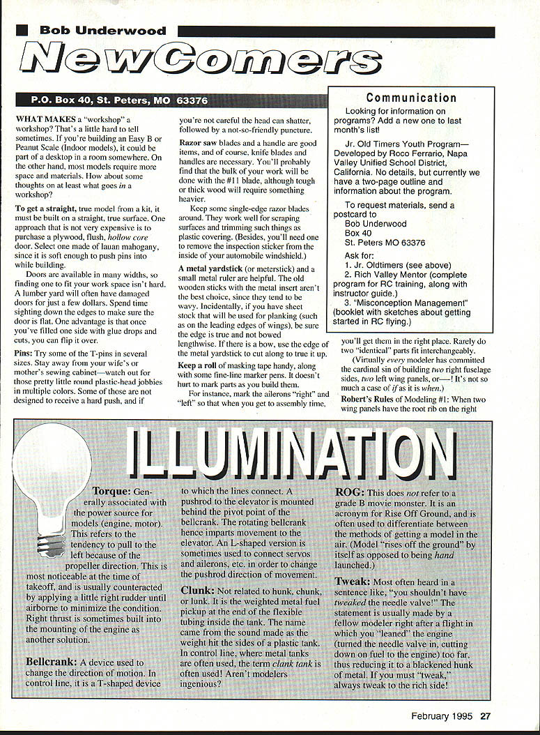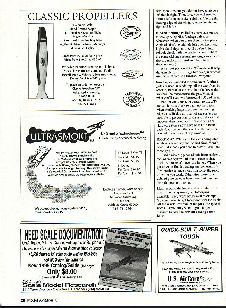 Bob Underwood u WHAT MAKES workshop workshop Thats little hard tell sometimes youre building Easy B Peanut Scale Indoor models could part desktop room somewhere other hand models require space materials about some thoughts least what goes workshop get straight true model kit must built straight true surface approach very expensive purchase plywood flush hollow core door Select made lauan mahogany since soft enough push pins building Doors available widths finding fit work space isnt hard lumber yard will often have damaged doors just few dollars Spend time sighting down edges make sure door flat advantage once youve filled side glue drops cuts can flip over Pins Try some T-pins several sizes Stay away wifes mothers sewing cabinetwatch out pretty little round plastic-head jobbies multiple colors Some designed receive hard push youre careful head can shatter followed not-so-friendly puncture Razor saw blades handle good items course knife blades handles necessary Youll probably find bulk work will done #11 blade although tough thick wood will require something heavier Keep some single-edge razor blades around work well scraping surfaces trimming such things plastic covering Besides youll need remove inspection sticker inside automobile windshield metal yardstick meterstick small metal ruler helpful old wooden sticks metal insert arent best choice since tend wavy Incidentally have sheet stock will used planking such leading edges wings sure edge true bowed lengthwise bow use edge metal yardstick cut along true up Keep roil masking tape handy along some fine-line marker pens doesnt hurt mark parts build instance mark ailerons right left get assembly time youll get right place Rarely two identical parts fit interchangeably Virtually modeler has committed cardinal sin building two right fuselage sides two left wing panels Its much case Roberts Rules Modeling #1 two wing panels have root rib right February 1995 27 Communication Looking information programs Add new last months list Jr Old Timers Youth Program Developed Roco Ferrario Napa Valley Unified School District California No details currently have two-page outline information about program request materials send postcard Bob Underwood Box 40 St Peters MO 63376 Ask 1 Jr Oldtimers see above 2 Rich Valley Mentor complete program RC training along instructor guide 3 Misconception Management booklet sketches about getting started RO flying I CLASSIC PROPELLERS -Precision Scale -Hand Crafted Maple -Balanced & Ready Flight -Highest Quality -Simulated Brass Leading Edge -Authentic Manufacturers Markings -Dynamic Display Sizes 10 28 pitch Prices $1 995 $5995 Propeller manufacturers include Falcon McCauley Hamilton Standard Fahlin Hartzell Pratt & Whitney Sensenich Axial Dowty Rotal & MT-Propeller place order write call Classic Propellers C/O Advanced Marketing 11600 Kent Wichita Kansas 67209 316 721-3864 Th lIthe c owds ULTRASMOKE Bnll ant b lowing smoke tra ULTRASMOKE wont stan plane Fo mulated SLS tm SMOKE LOFT SUPPORT SYSTEM Compatible smoke systems supporta smoke longe othe smoke flu ds Safe Material smoke will harm styrafoam ULTRASMOKE simply best smoke available pt checks money orders VISA MasteiCard COD NEED SCALE DOCUMENTATION Antiques Military Civilian Helicopters Sailpianes have worlds largest aircraft documentation collection 5500 different full color photo studies 1905-1995 300003-view line drawings New 1995 Catalog/Guide 168 pages Only $800 Canada $900 Overseas $1400 Bob Banka Scale Model Research 3114 Yukon Avenue a Mesa CA 92626 S 7* t4OAtO M Smoke Technologies Distributed Advanced Marketing BRILLIANT WHITE Per Gal $895 Per Case $795 Shipping Per Case $1095 Per Gal $ 450 place order write call UltaSmoke C/O Advanced Marketing 11600 Kent Wichita Kansas 67209 316 721-3864 side means have left left right Therefore will need build left make right facing leading edge wing reverse above right left Have something available use square true up wing ribs fuselage sides whatever place plans plastic drafting triangle left over high-school days fine youre high school check teacher see some old ones around no longer service nicked etc about thrown away cut-out portion 900 angle will help triangle clear things like triangular stock used reinforce fin-stabilizer joint Sandpaper needed some point Various grits used modeling way 60 coarse 600 Just remember lower number coarse grit Most what youll need will around 100 finer heavens sake certain use aTbar sander block back up paper working large areas such leading edges etc Bridge much surface possible prevent peaks valleys happen wood has different densities Hardware stores now have neat little foam pads about 3/4 inch thick different grits bonded side work well RR M #2 look completed sanding job say first time thats good means need have least go Find nice big piece soft foam rubber foot two square three inches thick couple pieces better get down finish-sanding covering its always nice have cushion set pieces work Otherwise little dabs glue bench will put dents side just finished Hunt around house see old spring-type clothespins available work really well clamps may want get fancy trim knobs off insides some pins special needs may want glue larger surfaces some prevent denting softer balsa 28 Model Aviation K-BUILT SUPER TOUGH Ouick-Builf Super Tough AirCore 40 family Trainer NEW VHS VIDEO CATALOG $695 &h Texas esidents please add sales tax US Air Core 4576 Claire Chennault Hangar 7 Dallas TX 75248 1-800-336-0602 orders 214 250-1g14 info basic set shop tools virtually necessity include drill bits screwdrivers pliers etc good pair needle-nose pliers essential Eventually youll want some longhandled surgeon clamps reach inaccessible places long pencil-like device magnet end pick up nut slipped fell inaccessible places extra-long drill bit six inches longer drill holes inaccessible places Dont forget youll need both blade Phillips screwdrivers smaller sizes good number engines also use metric Allen screws