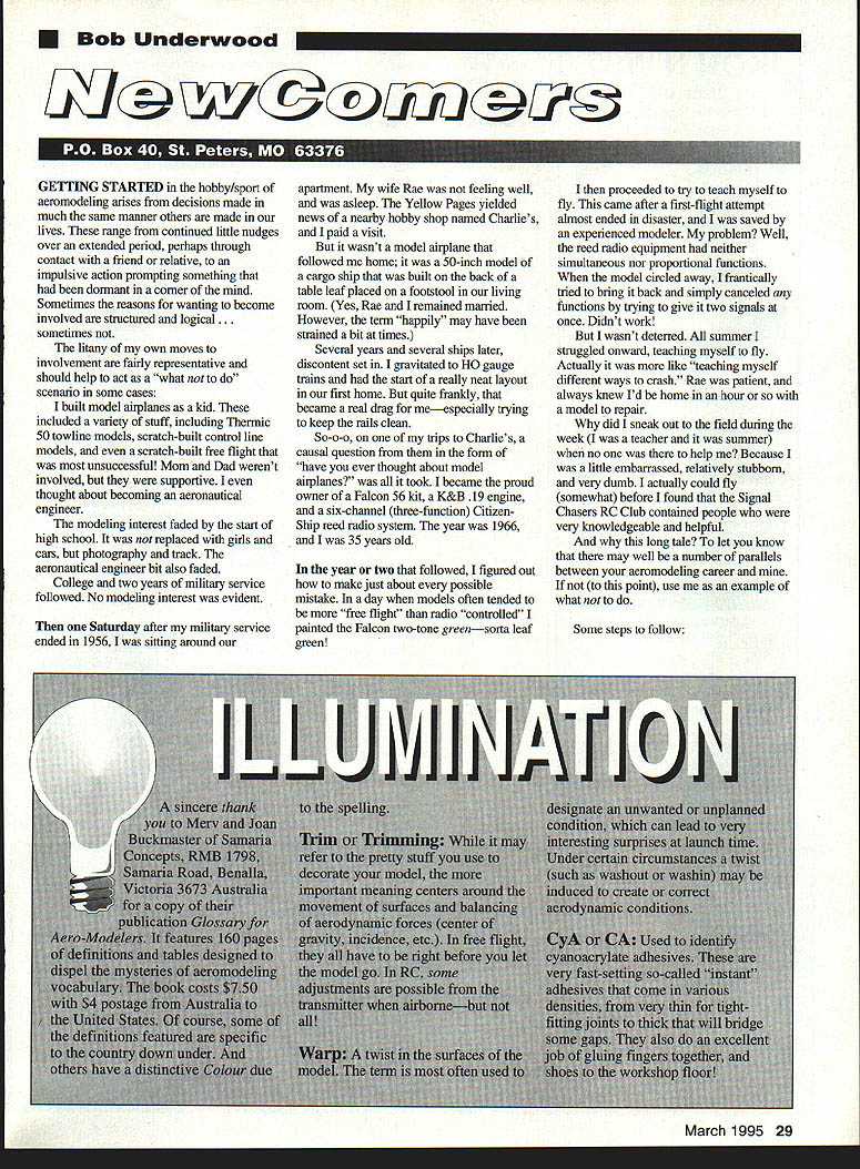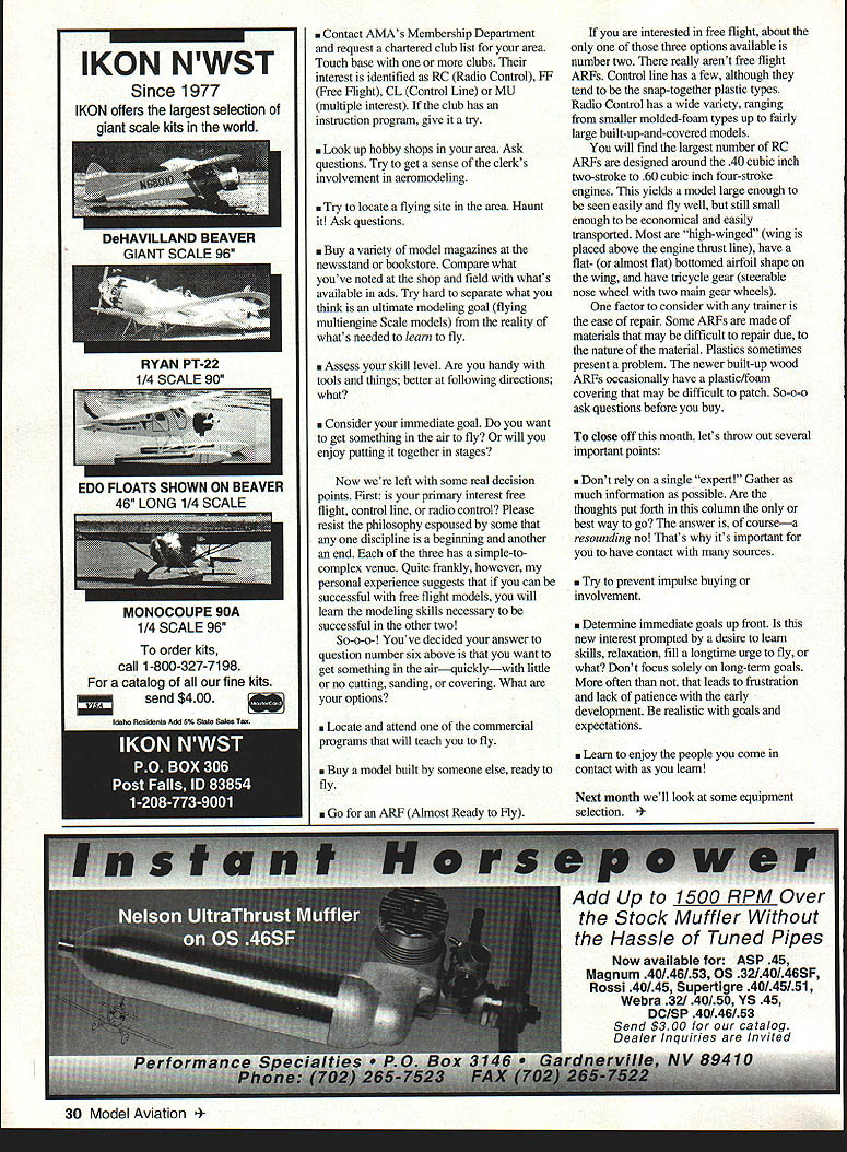 Bob Underwood iYkh1U GETTING STARTED hobby/sport aeromodeling arises decisions made much same manner others made lives range continued little nudges over extended period perhaps through contact friend relative impulsive action prompting something dormant corner mind Sometimes reasons wanting become involved structured logical. sometimes litany own moves involvement fairly representative should help act what scenario some cases built model airplanes kid included variety stuff including Thermic 50 towline models scratch-built control line models scratch-built free flight unsuccessful Mom Dad werent involved supportive thought about becoming aeronautical engineer modeling interest faded start high school replaced girls cars photography track aeronautical engineer bit also faded College two years military service followed No modeling interest evident Saturday after military service ended 19561 sitting around apartment wife Rae feeling well asleep Yellow Pages yielded news nearby hobby shop named Charlies paid visit wasnt model airplane followed home 50-inch model cargo ship built back table leaf placed footstool living room Yes Rae remained married However term happily may have strained bit times Several years several ships later discontent set gravitated HO gauge trains start really neat layout first home quite franldy became real drag meespecially trying keep rails clean So-o-o trips Charlies causal question form have ever thought about model airplanes took became proud owner Falcon 56 kit K&B 19 engine six-channel three-function Citizen Ship reed radio system year 1966 35 years old year two followed figured out make just about possible mistake day models often tended free flight radio controlled painted Falcon two-tone greensorta leaf green proceeded try teach myself fly came after first-ffight attempt almost ended disaster saved experienced modeler problem Well reed radio equipment neither simultaneous nor proportional functions model circled away frantically tried bring back simply canceled functions trying give two signals once Didnt work wasnt deterred summer struggled onward teaching myself fly Actually like teaching myself different ways crash Rae patient always knew Id home hour model repair did sneak out field during week teacher summer no help Because little embarrassed relatively stubborn very dumb actually could fly somewhat before found Signal Chasers RC Club contained people very knowledgeable helpful long tale let know may well number parallels between aeromodeling career point use example what Some steps follow March 1995 29 IKON NWST Since 1977 IKON offers largest selection giant scale kits world Contact AMAs Membership Department request chartered club list area Touch base clubs interest identified RC Radio Control FF Free flight CL Control Line MU multiple interest club has instruction program give fly uLook up hobby shops area Ask questions Try get sense clerks involvement aeromodeling Try locate flying site area Haunt Ask questions Buy variety model magazines newsstand bookstore Compare what youve noted shop field whats available ads Try hard separate what think ultimate modeling goal flying multiengine Scale models reality whats needed learn fly Assess skill level Are handy tools things better following directions what Consider immediate goal want get something air fly will enjoy putting together stages Now left some real decision points First primary interest free flight control line radio control Please resist philosophy espoused some discipline beginning another end three has simple-tocomplex venue Quite franldy however personal experience suggests can successful free flight models will leam modeling skills necessary successful other two So-o-o- Youve decided answer question number six above want get something airquicklywith little no cutting sanding covering What options Locate attend commercial programs will teach fly Buy model built someone else ready fly Go ARF Almost Ready fly interested free flight about three options available number two really arent free flight AREs Control line has few although tend snap-together plastic types Radio Control has wide variety ranging smaller molded-foam types up fairly large built-up-and-covered models will find largest number RC ARFs designed around 40 cubic inch two-stroke 60 cubic inch four-stroke engines yields model large enough seen easily fly well still small enough economical easily transported Most high-winged wing placed above engine thrust line have fiat- almost fiat bottomed airfoil shape wing have tricycle gear steerable nose wheel two main gear wheels factor consider trainer ease repair Some ARFs made materials may difficult repair due nature material Plastics sometimes present problem newer built-up wood ARFs occasionally have plastic/foam covering may difficult patch So-o-o ask questions before buy close off month lets throw out several important points Dont rely single expert Gather much information possible Are thoughts put forth column best way go answer coursea resounding no Thats its important have contact sources Try prevent impulse buying involvement Determine immediate goals up front new interest prompted desire learn skills relaxation fill longtime urge fly what Dont focus solely long-term goals often leads frustration lack patience early development realistic goals expectations Learn enjoy people come contact leam Next month well look some equipment selection Up 1500 RPM Over Stock Muffler Without Hassle Tuned Pipes Now available ASP 45 Magnum 40/46/53 05 32/40146SF Rossi 40145 Supertigre 40/45/51 Webra 32/ 40150 YS 45 DCISP 40146153 Send $300 catalog Dealer Inquiries Invited 30 Model Aviation VILLAND BEAVER GIANT SCALE 96 RYAN PT-22 1/4 SCALE 90 EDO FLOATS SHOWN ON BEAVER 46 LONG 1/4 SCALE MONOCOUPE 90A 1/4 SCALE 96 order kits call 1-800-327-7198 a catalog fine kits send $4 00 Ikn Rnxdxnh A& Sax