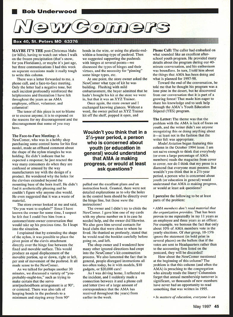 Bob Underwood PiikXzo MAYBE ITS THE post-Christmas blahs bills having watch out walk frozen precipitation thats snow Floridians maybe its just age three communications week separate occasions made really tough write column letter forwarded phone call face-to-face meeting Only letter negative tone incident profoundly reinforced helplessness frustration have felt throughout years AMA employee officer volunteer columnist tenor piece blame excuse anyone expound reasons discouragement discouragement some may have Face-to-Face Meeting NewComer hobby shop purchasing some control horns first model made offhand comment about shape nylon triangles holding didnt indicate expected response just reacted way consumers confused amused way manufacturers toy design product wondered holes devises extended beyond mounting base horn itself didnt find aesthetically pleasing couldnt figure anyone else would suggested waste material store owner looked said want explain Since have known owner some time suspect felt could free him customer/store-owner conversation would take up precious time So leapt situation explained extending shape nylon possible place pivot point clevis attachment directly over hinge line between fixed movable surface would produce equal displacement movable portion up down right left per unit movement pushrod made sense NewComer As talked perhaps another 30 minutes discussed variety probably-ought-tos such trying make certain servo armlpushrod/horn arrangement 900 centered also talk keeping bends pushrods minimum staying away 900 bends wire using plastic-rodwithin-a-housing-type pushrod suggested supporting pushrods hinges several pointswe discussed types hinges virtues necessity pinning some hinge types etc point store owner asked NewComer what type kit building Flushing mild embarrassment buyer admitted hadnt bought kit store XYZ Trainer Once again store owner exchanged knowing glances Without word owner pulled XYZ Trainer kit off shelf popped open Wouldnt think 2-year period person concerned about youth education general would understand AMA making progress would least ask questions pulled out excellent plans instruction book Granted detailed explanations holes control horn should directly over hinge line instructions owner didnt try chide NewComer gave him cards phone number case needed help owner did likewise also gave him several contacts local clubs close lived thanked us profusely stated would read booklet carefully before going left shop owner wondered other ignored directions crept NewComers kit construction process also lamented fact general people disregard instructions too often today models $10 gadgets $20000 cars As driving home reflected incident suddenly made connection between phone call letter two large amount correspondence AMA has received throughout years earlier week Phone Call caller embarked what sounded like excellent afterschool youth program provided details about program during 40minute conversation enthusiasm boundless turn told him about things AMA has doing what planned 1997-98 Toward end conversation told thought program lone pine desert discovered conversation part growing forest made him eager share knowledge seek help through AMAs Youth Education Stipend YES program Letter theme problem AMA lack focus youth writer didnt see anyone recognizing doing anything about itat least fashion writer felt appropriate Model Aviation began featuring column October 1994 issue am naive enough think everybody large percentage AMA members reads magazine cover cover nor think prose diamond everyone must possess wouldnt think 21/2-year period person concerned about youth education general would understand AMA making progress would least ask questions perceive following least parts problem AMA members dont read material organization provides has proven repeatedly 11 years employee three years officer example bemoan fact about 10% AMA members vote yearly elections group 10-15% ignore statement bold print several places ballots votes sent Headquarters rather accounting firm listed postcard will discarded about NewComer mentioned beginning column problem column often AMA preaching congregation already reads litany Columnists forget annual membership turnover significant thousands new members have never opportunity read something written 1995 matters education everyone May1997 45 Liesignen sy KIcS Ltravltch um termed cuwi ine & die-cut parts Wingspan 50 Length 40 Wing Area 060 Sq Engine 40-4620 50-7040 Radio reqaired $8999 Also MtNI SUKHOI 049 10 Powered $3299 P-47 RAZORBACK 20 Powered $5499 FRET SAW 5mm Safety stroke reduces risk Inlury Sturdy die cast constrac tion 4 way blade position ing rubber feet dampen aibratian cuts plastic up 114 non-terraus metal up 1/8 Hardwood ply up 1/2 $129 95 MB490 HIGH TORQUE DRILL High torque drill pen cii grip hi-eHiciency fun cooled motor lightweight keyless chncln Hi-opeed eatendible cable 4 $3496 MBtSO _____________ CIRCULAR SAW lie cast table greater tace pre cuts miter tar controlled "o e thru bade guard ufety grudautedwork tableiwo 2 bladesJ up to 1/16 JIG SAW Perfect tsr cutting intricate shapes small radii & scroll work comes 2 blades $5995 MB552 Note All MINICRAFTSsoIs DC powered require use power supply below MB730VAR SP Transformer$3495 MB750UNV SP TRANSFORMER$71 95 HOBBY HANGAR 1862 Pelerburg Rd Hehreu KY 41948 1 800 611 3860 rs Only 696 334 4331 omer Serv ce 334 4333 AdS6Shyp g&HPSbGb g uAin expert What affects learners experiences have person come contact AMAs problem has 150000 different versionseveryone has favorite model favorite method specific direction general no personal preferences wrong some righter others specific goal AMA s goals hampered multiplicity interests within organization Unlike sports hobbies types models flown aeromodeling diversified basic building skills specific areas interest often bear little resemblance another physical forces flight constant building hand-launch glider rubber-powered model will help t