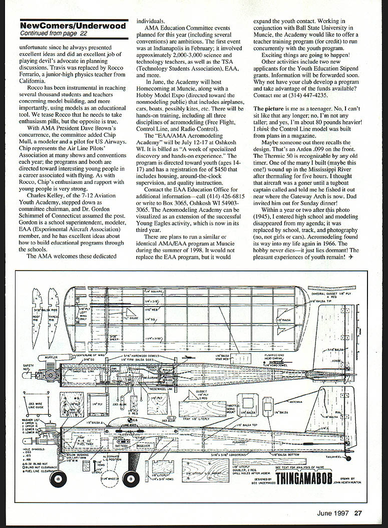 U Bob Underwood rvw ui WELCOME TO 1997 newcomers issue asked column couple years ago approached continue revive column used term beginner balked using word because individuals might have interested reading column along lines returnees far skills concerned Some 60-year-olds dont like referred novices realize returning hobby involves new materials concepts need adapt still-valid old skills new things subject semantics case some purists concerned about grammatical usage such Bring mom next room mean Take mom brother lives St Louisperhaps brother doesnt mind being instead As get meat column trust wont upset Im redundantly repetitive state its about dj vu over again Thingamabob Revisited page 62 April 1990 Model Aviation article about multipurpose trainer designed Thingamabob name coined fellow St Louis modeler presents interesting flight options within model can flown Radio Control trainer using glow engine Electric motor tail-dragger tricycle-gear format pure Control Line model tethered RC model Some people think model must revised building process accommodate possible configurations built plans model can convened flying site within five minutes element requiring explanation tethered RC plans accompanying article show metal post extending through fuselage left side center gravity CC line guide attached wingtip has center loop accommodate single control line attached post device swivel top center circle rudder pushrod removed servo control arm attached fixed metal rudder post inducing right turn rudder nose wheel youre flying trike gear model stays out line flies circle front center post either firmly anchored pavement couple concrete blocks its base staked ground tent-like its dirt fly tethered RC model wont fly away Using mode II radio system newcomers can get experience coordinating elevator throttle having worry about model skating its way right left toward above horizon Once elevator feel established directional control can developed close model outside circle movements elevator control can very quickly confirmed down side tethered model cannot stand too much wind Unlike Control Line model goes slack line flying crosswind upwind side circle cant backpedal pick up slack Thingamabob designed trainer nothing ultra-simple construct Using cyanoacrylate CyA adhesives plastic covering etc experienced modeler can build 10-12 hours No exotic materials used model can easily adjusted during building accommodate virtually engine/motor combination up 25 glow original used K&B Sportster geared 05 Electric no sheeting bend around wing leading edge fuselage side simple 1/ x 3 x 36 sheet angle sliced off top power plant change incorporates old ignition-era tray attached firewall glow configuration tray contains fuel tank throttle servo Electric version fuel form batteries located tray So far dialogue about Thingamabob has directed somewhat experienced modelers would good model use instruction building process Most techniques involved building present models construction interested trying different approach learn types flying except Free Flight unfortunately get set plans full-size ones number 649 available AMA $750 contact can supply copy April 1990 article although detailed building outline does provide some look-out-for information someone would like kit Thingamabob arrangements can made however 1990 officially given AMA provision profits channeled directly promotion support youth activities within Academy AMA Education Committee met during California trade shows January Some committee membership changes made plans next two years discussed Travis McGinnis original committee member stepped down because business commitment pressure committee finds Continued page 27 22 Model Aviation NewComers column contained reference pushrods seemed suggest plastic rod-within-a-housing types used incorrect pushrod type works great almost always use models same reference contained editing error called pushrods supported hinges pushrods should supported such support should immovablenot hinges NewComerslUnderwood Continued page 22 unfortunate since always presented excellent ideas did excellent job playing devils advocate planning discussions Travis replaced Rocco Ferrario junior-high physics teacher California Rocco has instrumental reaching several thousand students teachers concerning model building importantly using models educational tool tease Rocco needs take enthusiasm pills opposite true AMA President Dave Browns concurrence committee added Chip Mull modeler pilot US Airways Chip represents Air Line Pilots Association shows conventions year programs booth directed toward interesting young people career associated flying As Rocco Chips enthusiasm rapport young people very strong Charles Kelley 7-12 Aviation Youth Academy stepped down committee chairman Dr Gordon Schimmel Connecticut assumed post Gordon school superintendent modeler EAA Experimental Aircraft Association member has excellent ideas about build educational programs through schools AMA welcomes dedicated individuals AMA Education Committee events planned year including several conventions ambitious first event Indianapolis February involved approximately 2000-3000 science technology teachers well TSA Technology Students Association EAA June Academy will host Homecoming Muncie along Hobby Model Expo directed toward nonmodeling public includes airplanes cars boats possibly kites etc will hands-on training including three disciplines aeromodeling Free Flight Control Line Radio Control EAA/AMA Aeromodeling Academy will July 12-17 Oshkosh WI billed week specialized discovery hands-on experience program directed toward youth ages 1417 has registration fee $450 includes housing around-the-clock supervision quality instruction Contact EAA Education Office additional informationcall 414 426-6815 write Box 3065 Oshkosh WI 549033065 Aeromodeling Academy can visualized extension successful Young Eagles activity now its third year plans run similar identical AMA/E