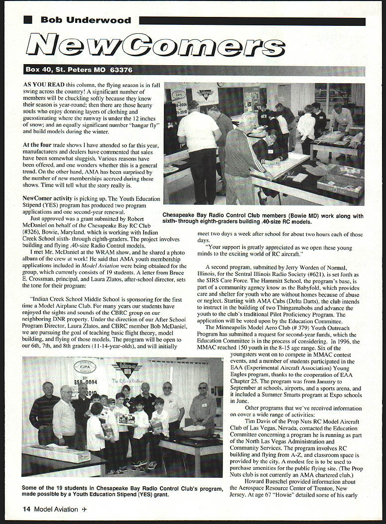 Bob Underwood P54uzu AS YOU READ column flying season full swing across country significant number members will chuckling softly because know season year-round hearty souls enjoy donning layers clothing guesstimating runway under 12 inches snow equally significant number hangar fly build models during winter four trade shows have attended far year manufacturers dealers have commented sales have somewhat sluggish Various reasons have offered wonders whether general trend other hand AMA has surprised number new memberships accrued during shows Time will tell what story really NewComer activity picking up Youth Education Stipend YES program has produced two program applications second-year renewal Just approved grant submitted Robert McDaniel behalf Chesapeake Bay RC Club #326 Bowie Maryland working Indian Creek School sixth- through eighth-graders project involves building flying 40-size Radio Control models met Mr McDaniel WRAM show shared photo album crew work said AMA youth membership applications included Model Aviation being obtained group currently consists 19 students letter Bruce E Crossman principal Laura Zlatos after-school director sets tone program Indian Creek School Middle School sponsoring first time Model Airplane Club years students have enjoyed sights sounds CBRC group neighboring DNR property Under direction After School Program Director Laura Zlatos CBRC member Bob McDaniel pursuing goal teaching basic flight theory model building flying models program will open 6th 7th 8th graders 1-14-year-olds will initially meet two days week after school about two hours days support greatly appreciated open young minds exciting world RC aircraft second program submitted Jerry Worden Normal Illinois Sentral Illinois Radio Society #621 set forth SIRS Care Force Hammitt School programs base part community agency know Babyfold provides care shelter youth homes because abuse neglect Starting AMA Cubs Delta Darts club intends instruct building two Thingamabobs advance youth clubs traditional Pilot Proficiency Program application will voted upon Education Committee Minneapolis Model Acm Club # 379 Youth Outreach Program has submitted request second-year funds Education Committee process considering 1996 MMAC reached 150 youth 8-15 age range Six youngsters went compete MMAC contest events number students participated EAA Experimental Aircraft Association Young Eagles program thanks cooperation EAA Chapter 25 program January September schools airports sports arena included Summer Smarts program Expo schools June Other programs weve received information cover wide range activities Tim Davis Prop Nuts RC Model Aircraft Club Las Vegas Nevada contacted Education Committee conceruing program running part North Las Vegas Administration Community Services program involves RC building flying A-Z classroom space provided city modest fee used purchase amenities public flying site Prop Nuts club currently AMA chartered club Howard Bueschel provided information about Aerospace Resource Center Trenton New Jersey age 67 Howie detailed some early 14 Model Aviation 4Chesapeake Bay Radio Control Club members Bowie MD work along sixth- through eighth-graders building 40-size RC models Some 19 students Chesapeake Bay Radio Control Clubs program made possible Youth Education Stipend YES grant Horizon Hobby Distributors Inc 4105 Fieldstone Road Champaign IL 61821 Okay Im betting offer good until July 30 worth postage Heres equipment Im now flying IU II II II II II I RADIO 51W40 MD MOOSt JR Im interested dieck [ F400 Four channels genuine JR quality L.J genuinely affordable price Z] XP642 computer six channel everything model storage useable features mixes predsion wonderI doesnt cost more3 Ffl XP783 Seven channels operation L.J storage capadty handle fleet 01 eight planesI Ior hells both Plus programming power tops seven channel ever offered f] XPSIO3 Innovative graphics logical LJ screen progressions make easy harness impressive computer power ten-model-storage radio Widely hailed eight channel takes mystery out programming 8103 complements skills demanding pilots [] PCMIOSx undisputed champ ease-ofI LJ programming among pm-class radios Its touchscreen operation superb displays make sophisticated setups simple owners rarely consult manuals ten channel PCM1OSx Its pro-dass JR enthusiast wants very best II INAMEI II ADDRESSI II CITYSTATEZIP _________ ___ I FAVORITE R/c DEALERYEAR5 IN R/C modeling experiences after having started modeling career approximately fifth grade recalls sery expensive $2350 OK Super 30 engine given him 8th-grade graduation hobby became career taught college aviation program 20 years 1971 Howard established Aerospace Resource Center create idea factory aerospace teaching aids 1994 Center incorporated nonprofit educational facility Negotiations ongoing local county state federal agencies obtain space Center now-closed Naval Air Warfare Center edge Trenton Mercer Airport addition being training site facility will have museum research facilities letter Howie indicated has contacted program listings provided magazine AMAs web page cites Howieisms Education organized theft others ideas Steal away Howie Thats AMA began networking program two years ago thats things beginning heat up aeromodeling education June brings combination Homecoming/Hobby Expo International Aeromodeling Center Muncie IN As may know Homecoming modelers can set up shelter chairs put soda cooler airplane shade swap lies about flying prowess dont have show ability dont want Expo designed attract interested curious nonmodelers want see what hobby about education part Expo will feature introductory flying hands-on building Hopefully will teachers crowd July omly brings Nats events also first EAA/AMA Aeromodeling Youth Academy Oshkosh WI Limited 30 youths 14-17 years age program weeklong concentrated study aeromodeling will begin basics nncludes Free Flight Control Line Radio Control flying details can contact Chuck Larsen EAA E