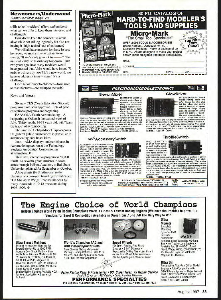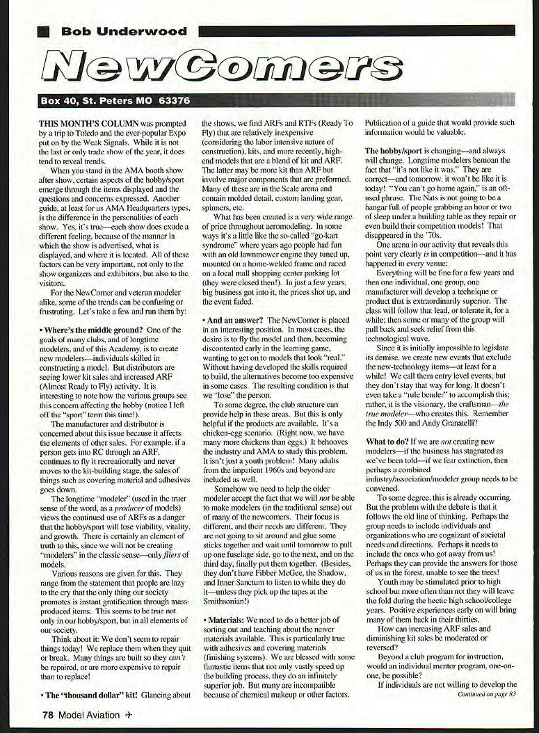 U Bob Underwood Uji fy urn-i HIS MONTHS COLUMN prompted trip Toledo ever-popular Expo put Weak Signals last trade show year does tend reveal trends stand AMA booth show after show certaln aspects hobby/sport emerge through items displayed questions concerns expressed Another guide least us AMA Headquarters types difference personalities show Yes its trueeach show does exude different feeling because manner show advertised what displayed located factors can very important show organizers exhibitors also visitors NewComer veteran modeler alike some trends can confusing frustrating Lets take few run Wheres middle ground goals clubs longtime modelers Academy create new modelersindividuals skilled constructing model distributors seeing lower kit sales increased ARF Almost Ready Fly activity interesting note various groups see concern affecting hobby notice left off sport term time manufacturer distributor concerned about issue because affects elements other sales example person gets RC through ARF continues fly recreationally never moves kit-building stage sales things such covering material adhesives goes down longtime modeler used truer sense word producer models views continued use ARFs danger hobby/sport will lose viability vitality growth certainly element truth since will creating modelers classic senseonlyfiiers models Various reasons given range statement people lazy cry thing society promotes instant gratification through massproduced items seems true hobby/sport elements society Think about dont seem repair things today replace quit break things built cant repaired expensive repair replace thousand dollar kit Glancing about shows find ARFs RTFs Ready Fly relatively inexpensive considering labor intensive nature construction kits recently highend models blend kit ARF latter may kit ARF involve major components preformed Scale arena contain molded detail custom landing gear spinners etc What has created very wide range price throughout aeromodeling some ways its little like so-called go-kart syndrome years ago people fun old lawnmower engine tuned up mounted home-welded frame raced local mall shopping center parking lot closed just few years big business got prices shot up event faded answer NewComer placed interesting position cases desire fly model becoming discontented early learning game wanting get models look real Without having developed skills required build alternatives become too expensive some cases resulting condition lose person some degree club structure can provide help areas helpful products available Its chicken-egg scenario Right now have chickens eggs behooves industry AMA study problem isnt just youth problem adults impatient 1 960s beyond included well Somehow need help older modeler accept fact will able make modelers traditional sense out of newcomers focus different needs different going sit around glue some sticks together wait until tomorrow pull up fuselage side go next third day finally put together Besides dont have Fibber McGee Shadow Inner Sanctum listen itunless pick up tapes Smithsonian Materials need better job sorting out teaching about newer materials available particularly true adhesives covering materials finishing systems blessed some fantastic items vastly speed up building process infinitely superior job incompatible because chemical makeup other factors Publication guide would provide such information would valuable hobby/sport changingand always will change Longtime modelers bemoan fact its like correctand tomorrow wont like today cant go home again oftused phrase Nats going hangar full people grabbing hour two sleep under building table repair build competition models disappeared 70s arena activity reveals point very clearly competitionand has happened venue Everything will fine few years individual group manufacturer will develop technique product extraordinarily superior class will follow lead tolerate some group will pull back seek relief technological wave Since initially impossible legislate its demise create new events exclude new-technology itemsat least call entry level eventsbut dont stay way long doesnt take rule bender accomplish rather visionary craftsmanthe true modelerwho creates Remember Indy 500 Andy Granatelli What creating new modelersif business has stagnated weve toldif fear extinction perhaps combined industry/association/modeler group needs convened some degree already occurring problem debate follows old line thinking Perhaps group needs include individuals organizations cognizant societal needs directions Perhaps needs include ones got away us Perhaps can provide answers us forest unable see trees Youth may stimulated prior high school often will leave fold during hectic high school/college years Positive experiences early will bring back thirties can increasing ARF sales diminishing kit sales moderated reversed Beyond club program instruction would individual mentor program one-onone possible individuals willing develop Continued poge 83 78 Model Aviation 4 NewcomerslUnderwood Continued page 78 skills modelers fliers anti builders what can offer keep interested challenged keep competitive arena alive stifling ingenuity also having high-teched out existence will have answers issues however must strive refrain saying wed go back ual today ordinary tomorrow Just two years ago modelers would have guessed AlMA would have issued 71 turbine waivers now Its new world have address new ways Its challenge NewComer oldtimerfrom user manufacturerare up task News Views Six new YES Youth Education Stipend programs have approved Lots good educational programs happening EAAIAMA Youth AeromodelingA happening Oshkosh second week July Thirty youth 14-17 years old will learn trade aeromodeling June 7-8 Hobby/Model Expo exposes general public teachers particular aeromodeling-cars-boats-kites JuneAIVIA displays participates Aeromodeling section Technology Students Association Convention Washington DC Third live interactive program 50000 fo