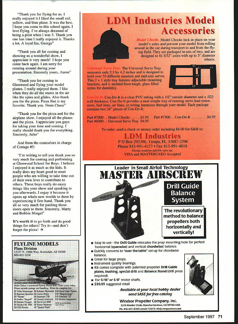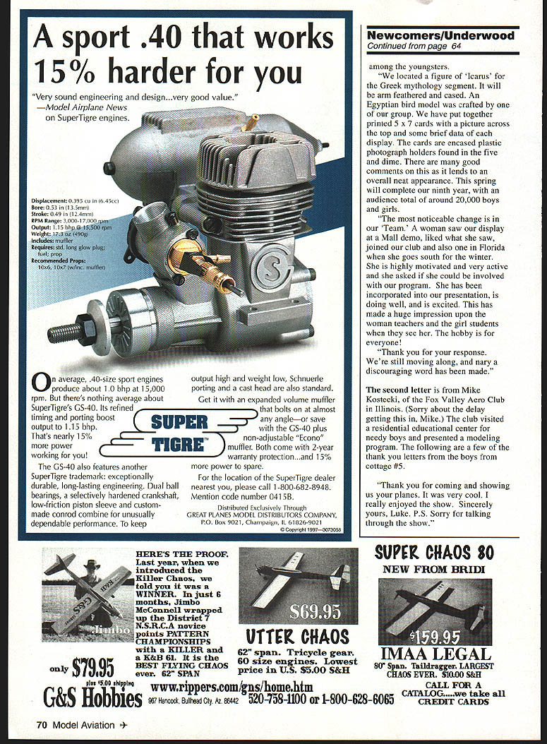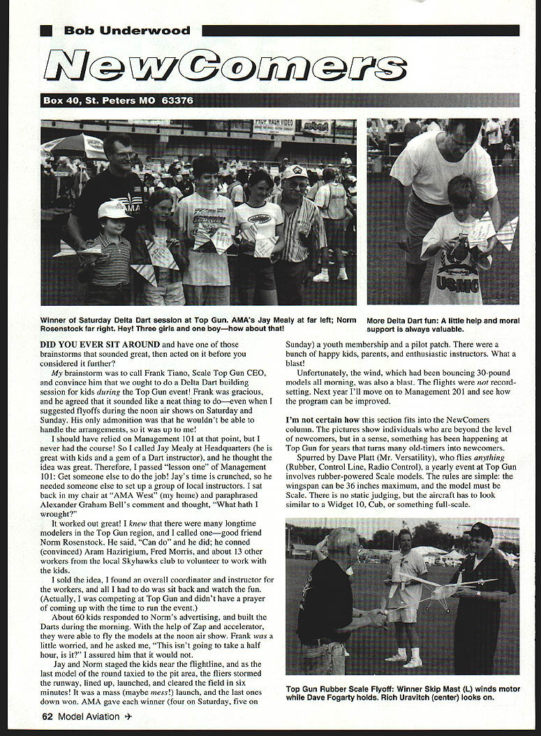 Bob Underwood UYik YOU EVER SIT AROUND have brainstorms sounded great acted before considered further brainstorm call Frank Tiano Scale Top Gun CEO convince him ought Delta Dart building session kids during Top Gun event Frank gracious agreed sounded like neat thing doeven suggested flyoffs during noon air shows Saturday Sunday admonition wouldnt able handle arrangements up should have relied Management 101 point never course So called Jay Mealy Headquarters great kids gem Dart instructor thought idea great Therefore passed lesson Management 101 Get someone else job Jays time crunched needed someone else set up group local instructors sat back chair AMA West home paraphrased Alexander Graham Bells comment thought What hath wrought worked out great knew longtime modelers Top Gun region called onegood friend Norm Rosenstock said Can did conned convinced Aram Hazirigium Fred Morris about 13 other workers local Skyhawks club volunteer work kids sold idea found overall coordinator instructor workers sit back watch fun Actually competing Top Gun didnt have prayer coming up time run event About 60 kids responded Norms advertising built Darts during morning help Zap accelerator able fly models noon air show Frank little worried asked isnt going take half hour assured him would Jay Norm staged kids near flightline last model round taxied pit area fliers stormed runway lined up launched cleared field six minutes mass maybe mess launch last ones down won AMA gave winner four Saturday five Sunday youth membership pilot patch bunch happy kids parents enthusiastic instructors What blast Unfortunately wind bouncing 30-pound models morning also blast flights record setting Next year Ill move Management 201 see program can improved Im certain section fits NewComers column pictures show individuals beyond level newcomers sense something has happening Top Gun years turns old-timers newcomers Spurred Dave Platt Mr Versatility flies anything Rubber Control Line Radio Control yearly event Top Gun involves rubber-powered Scale models rules simple wingspan can 36 inches maximum model must Scale no static judging aircraft has look similar Widget 10 Cub something full-scale 62 Model Aviation er Saturday Delta Dart session Top Gun AMAs Jay Mealy far leff Norm Delta Dart fun little help moral Rosenstock far right Hey Three girls boyhow about support always valuable Top Gun Rubber Scale Flyoff Winner Skip Mast L winds motor Dave Fogarty holds Rich Uravitch center looks RadioSale PriceRetail Feces 2AM Single Slick 27/72 MHz$6999$9995 Focus 4 FM$12899$29995 Feces 6 FM$15799$24995 Flash 4 FM$14699$23995 Flash 5 FM$16799$39495 Challenger 296 AM$5499$6795 Prism 7X FM$21999$38495 Prism iX PCM$23999$41995 Prism iX FM SPECTRA$29399$59995 Prism 7X PCM SPECTRA$33499$56995 SPECTRA Modules$9999$16995 Prism 7X FM SPECTRA Trausmitlur Charger$19999$34995 Focus 4 Tranomilter charger$4499 Focus 6 Trasomilter charger$4999 HITEC RECEIVERS ReceiverSale PriceRolail RCD Micro 539 wlctal$6699$9995 Sopreme Ri wtal$6299$9995 PCM Rs tar HiTec$9499$13495 Micra 5-ch 75 MHz$4799$695 2-ch 27 & 75MHz$2999$3995 2-ch AM Rs 27/72 MHz$2999$4495 59 & 75 MHz Ciystals$799$1395 Shredder RX$3999$4995 ZENOAR ENGINES oLsono 936$25999 G-45$33499 9-62$37999 WiOlIJO AiVCCflOiF5 J 5 Connectors sumails rricn 6 Estension 9 12 Estenoino 9 24 Esteusiun 9 36 Estenslun 9 6 BoottjButlen Estenoino 9 12 BoostjBufter Ectensiun 9 24 BoostjBufter Esteosiun 9 36 Boost/Buffer Extension 9 6 Y Connector 99 24 Y Connector 99 6 Boost/Butt Y Connector 9 Switch Harness 9 59 3-lead Servo Wire 9 Trainer curd Futaho Cumpat 9 Clasuic Citabnia 9-Shark MK II NEW Laser 299 CAP 231 96 iaser 66 G-Shorh 71555 flDIflIU5I 794 CombatCall SPECIAL 10% OFF NON-SALE ITEMS TO AMA MEMBERS AUGUST FREEBIE 12 oz CA Glue ORDER TOLL PREE 1-800-604-6229 Info 608 241-3491 FaX 608 241-1313 E-Mail Address hehbyhorne@hebbyhersscem Visit Oar Web Site wwwhohbyhorsecom Visa/ManterCurd Welcome WS4 Prices Good Through August 31 1997 [WI Ruversed servos $1599 additional ServoSale Price HS-69 Super Micm 15 uz$3799 HS-69 Sub Micro 31 05$2399 HS8OMG Sob Micro 99 HSBSBB Sopor Mini 510gm68 39 us$32 99 tiS-lOl Mini 24 99 HS-191MG$32 99 HS-295BB Micro 43 os526 99 HS-2BSMG$37 99 HS-225BB Sn p Mini Micre 59 us . $3299 HS-3B9 Std S port 42 nz $1999 HS-422 Pro Servo 43 oc$1299 115-42596 Pm Dual 96 43 us$1699 HS-525B9 HiBh Speed 47 05$3499 HS5459B HI Torque 62 us$3499 HS-6959B Ultra Torque 77 us$36 99 HS-695MG VII Torque 77 us$45 99 HS-61SMG 99 119 us $45 99 HS-7BBBB Giant 133 05$29 99 HS-795MG Giant 169 as$42 99 H5759B Retract 99 us$39 99 HS-725BB Sail Winch 161 us$4799 HS-895BB 224 Dxl$3999 GY-lOBBB Ball Bearing Gyro$9999 SERVO VALUE DEALS Switch Harveon Four HS-399Save $596 Foor HS-422Save $696 Three HS-1 61 Three HS-99 Ibree HS-2959B & 000 HS-8B . Save $597 Three HS-709 & sue HS-422 HITEC NiCd BATTERIES Battery Sale Price Ro 49v 279 mabSane $1699 Rs 48v 699 mabSane $1499 Rs4Bv1999 mobSane $2499 96v 699 mah Focus Serien e $2999 SEVEN CHANNEL FLIGHT PACK Remit $5495 $3995 $5495 $4995 $3195 $4595 $4195 $5995 $4995 $1695 $1995 $2895 $5995 $5995 $5995 $7495 $7495 $4495 $6495 $5995 $7395 $7395 $13495 $4599 $5299 $6599 $7199 $19499 $9999 Retail $1995 $1795 $2995 $6395 $595 $5 95Includes Four HS-39u Servex OneSwitch HarnessOne $99Supreme 7 ch Receineryoer channelchuice 6119mab Rx $gBattery Available 5 Jconnecters for$16999 $1395Available connecters Inn $11499 tour 115-422 $1395servos add $796 tear HS-425 servos add $3569 $1 495tour HS-6B5 servos add $19996 $1595SAITO ENGINES $995 EngineSale PriceRetail $1695 PA-SB Goldus Knight ABC$19999$33495 $1595 FA-56 Goldun Kni9ht ABC$20999$34995 $1995 FA-65 Guides Knight ABC$21999$39995 $1495 FA-89 Golden Knight ABC$23995$41495 $1495 FA-915 Golden Knight MC$24996$47495 FA-1295 Golden Knight AAC$37499$57995 3O4 99 PA-iSO Golden Knight MC$39499$93495 $29499 FA-59 RC ABC$19499$39995 $32499 FA-56 R/C ACC$18999$31999 $39999 FA-65 RC ABC$19499$33495 $24999 FA-89 RC ABC$21499$37995 $17999 FA-giS RC