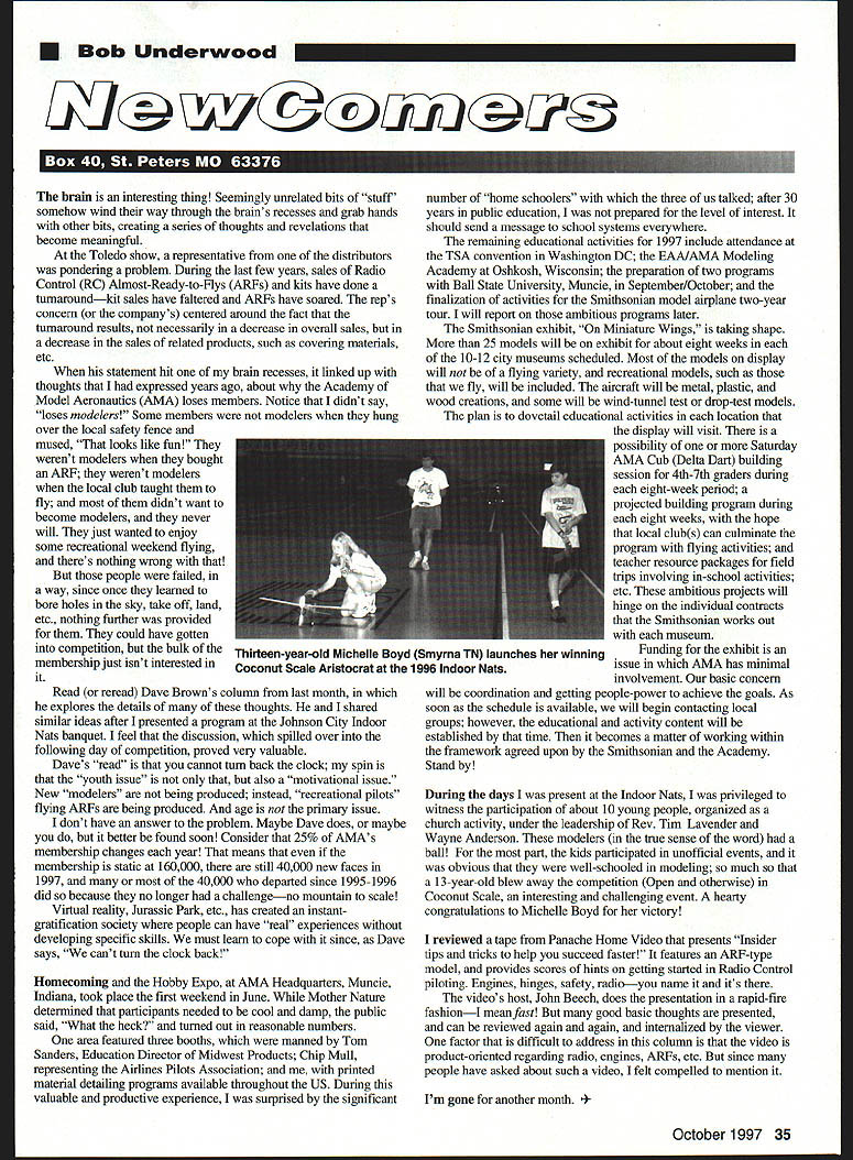 U Bob Underwood U WFai brain interesting thing Seemingly unrelated bits stuff somehow wind way through brains recesses grab hands other bits creating series thoughts revelations become meaningful Toledo show representative distributors pondering problem During last few years sales Radio Control RC Almost-Ready-to-Flys ARFs kits have done turnaroundkit sales have faltered ARFs have soared reps concern companys centered around fact turnaround results necessarily decrease overall sales decrease sales related products such covering materials etc statement hit brain recesses linked up thoughts expressed years ago about Academy Model Aeronautics AMA loses members Notice didnt say loses modelers Some members modelers hung over local safety fence mused looks like fun werent modelers bought ARE werent modelers local club taught fly didnt want become modelers never will just wanted enjoy some recreational weekend flying theres nothing wrong people failed way since once learned bore holes sky take off land etc nothing further provided could have gotten competition bulk membership just isnt interested Read reread Dave Browns column last month explores details of thoughts shared similar ideas after presented program Johnson City Indoor Nats banquet feel discussion spilled over following day competition proved very valuable Daves read cannot turn back clock spin youth issue also motivational issue New modelers being produced instead recreational pilots flying ARFs being produced age primary issue dont have answer problem Maybe Dave does maybe better found soon Consider 25% AMAs membership changes year means membership static 160000 still 40000 new faces 1997 40000 departed since 1995-1996 did because no longer challengeno mountain scale Virtual reality Jurassic Park etc has created instantgratification society people can have real experiences developing specific skills must learn cope since Dave says cant turn clock back Homecoming Hobby Expo AMA Headquarters Muncie Indiana took place first weekend June Mother Nature determined participants needed cool damp public said What heck turned out reasonable numbers area featured three booths manned Tom Sanders Education Director Midwest Products Chip Mull representing Airlines Pilots Association printed material detailing programs available throughout US During valuable productive experience surprised significant number home schoolers three us talked after 30 years public education prepared level interest should send message school systems everywhere remaining educational activities 1997 include attendance ISA convention Washington DC EAA/AMA Modeling Academy Oshkosh Wisconsin preparation two programs Ball State University Muncie September/October finalization activities Smithsonian model airplane two-year tour will report ambitious programs later Smithsonian exhibit Miniature Wings taldag shape 25 models will exhibit about eight weeks 10-12 city museums scheduled Most models display will flying variety recreational models such fly will included aircraft will metal plastic wood creations some will wind-tunnel test drop-test models plan dovetail educational activities location display will visit possibility Saturdny AMA Cub Delta Dart building session 4th-7th graders during eight-week period projected building program during eight weeks hope local clubs can culminate program flying activities teacher resource packages field trips involving in-school activities etc ambitious projects will hinge individual contracts Smithsonian works out museum Funding exhibit issue AMA has minimal involvement basic concern will coordination getting people-power achieve goals As soon schedule available will begin contacting local groups however educational activity content will established time becomes matter working within framework agreed upon Smithsonian Academy Stand During days present Indoor Nats privileged witness participation about 10 young people organized church activity under leadership Rev Tim Lavender Wayne Anderson modelers tine sense word ball part kids participated unofficial events obvious well-schooled modeling much 13-year-old blew away competition Open otherwise Coconut Scale interesting challenging event hearty congratulations Michelle Boyd victory reviewed tape Panache Home Video presents Insider tips tricks help succeed faster features ARE-type model provides scores hints getting started Radio Control piloting Engines hinges safety radioyou name its videos host John Beech does presentation rapid-fire fashionI mean fast good basic thoughts presented can reviewed again again internalized viewer factor difficult address column video product-oriented regarding radio engines ARFs etc since people have asked about such video felt compelled mention Im gone another month ber 1997 35 Thirteen-year-old Michelle Boyd Smyrna TN launches winning Coconut Scale Aristocrat 1996 Indoor Nats