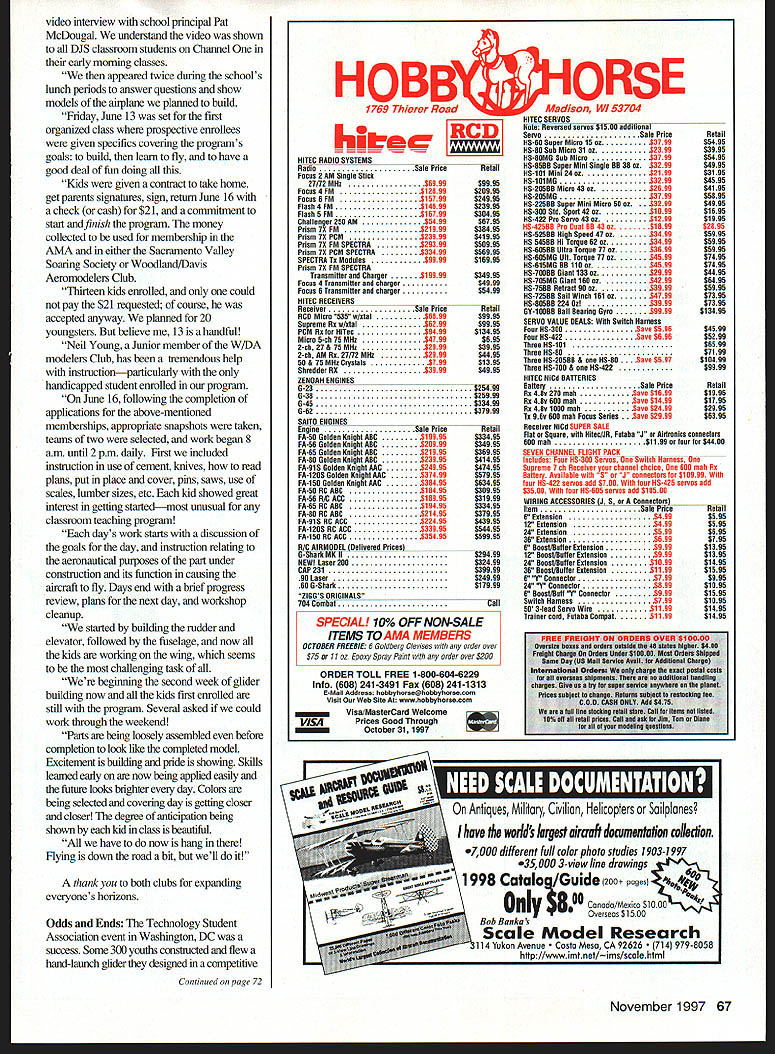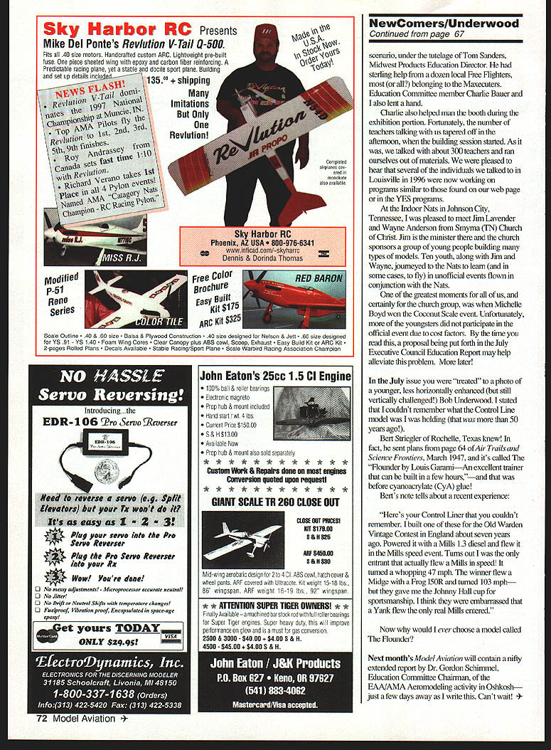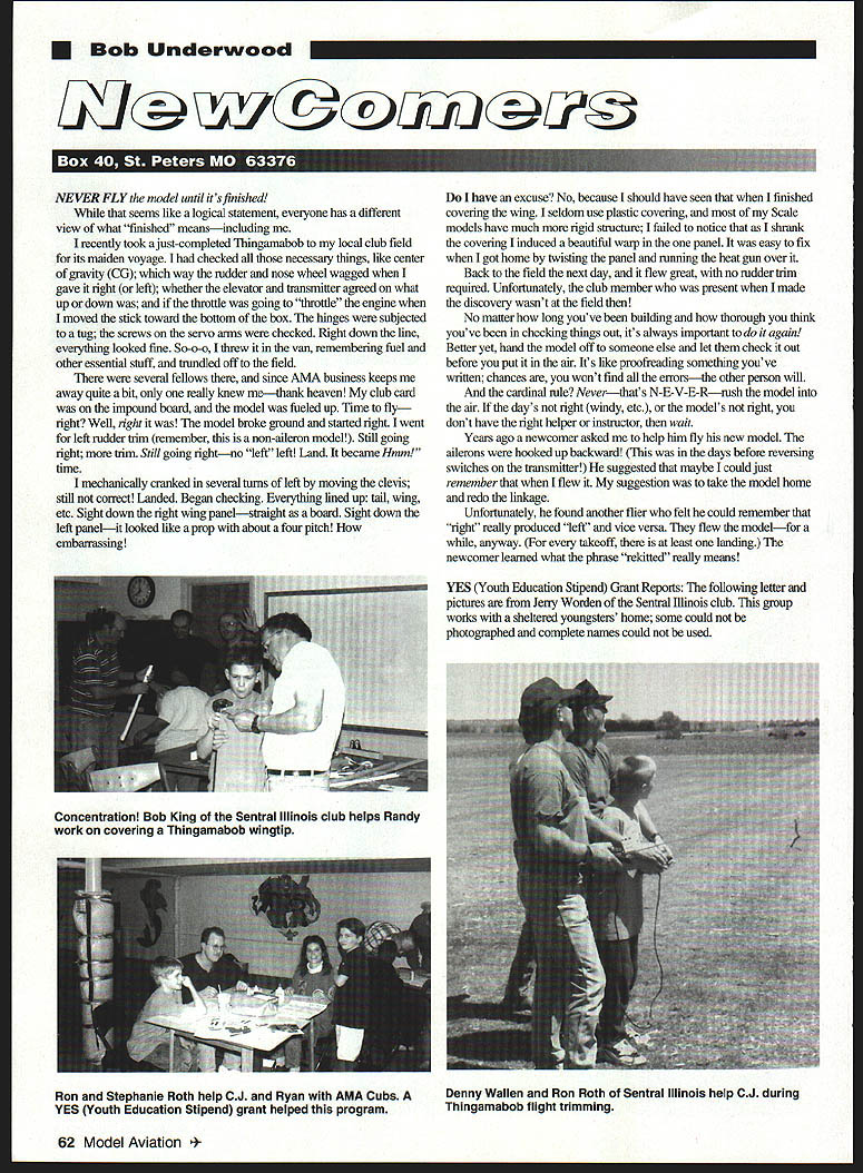 Bob Underwood fkJ @u NEVER FLY model until its finished seems like logical statement everyone has different view what finished meansincluding recently took just-completed Thingamabob local club field its maiden voyage checked necessary things like center gravity CG way rudder nose wheel wagged gave right left whether elevator transmitter agreed what up down throttle going throttle engine moved stick toward bottom box hinges subjected tug screws servo anns checked Right down line everything looked fine So-o-o threw van remembering fuel other essential stuff tnmdled off field several fellows since AMA business keeps away quite bit really knew methank heaven club card impound board model fueled up Time fly right Well right model broke ground started right went left rudder mm remember non-aileron model Still going right trim Still going rightno left left Land became Hmm time mechanically cranked several turns left moving clevis still correct Landed Began checking Everything lined up tail wing etc Sight down right wing panelstraight board Sight down left panelit looked like prop about four pitch embarrassing have excuse No because should have seen finished covering wing seldom use plastic covering Scale models have much rigid structure failed notice shrank covering induced beautiful warp panel easy fix got home twisting panel running heat gun over Back field next day flew great no rudder trim required Unfortunately club member present made discovery wasnt field No matter long youve building thorough think youve checking things out its always important again Better yet hand model off someone else let check out before put air Its like proofreading something youve written chances wont find errorsthe other person will cardinal rule Neverthats N-E-V-E-Rrush model air days right windy etc models right dont have right helper instructor wait Years ago newcomer asked help him fly new model ailerons hooked up backward days before reversing switches transmitter suggested maybe could just remember flew suggestion take model home redo linkage Unfortunately found another flier felt could remember right really produced left vice versa flew modelfor anyway takeoff least landing newcomer learned what phrase rekitted really means YES Youth Education Stipend Grant Reports following letter pictures Jerry Worden Sentral Illinois club group works sheltered youngsters home some could photographed complete names could used 62 Model Aviation entration Bob King Sentral Illinois club helps Randy work covering Thingamabob wingtip Ron Stephanie Roth help CJ Ryan AMA Cubs YES Youth Education Stipend grant helped program Denny Wallen Ron Roth Sentral Illinois help CJ during Thingamabob flight trimming Thanks effort securing YES grant club suggested $500 modest amount money included hope program will flourish Hourish has money has already netted fortune happiness joy kids babyfold another fortune satisfaction comes bringing wonder excitement child members Weve built Delta Darts three Thingamabobs have proven airworthy up task training kids building flying kids now official AMA members members club have out two sessions flying field boys almost capable keeping Thingamabob air assistance During flying sessions furnished hot dog lunch children staff plan continue sessions throughout summer addition plan explore area model rocketry small Control Line children Give thanks Academy helped securing grant second letter comes form Herschel Sandy Collins Woodland/Davis Acromodelers California WIDAs Young Hyers building program conceived put action WIDA members Sandy Collins Keith Young during month January 1997 asked W/DA Board Directors permission use W/DAs club name proposal Having went Woodlands Douglass Jr High School principal Pat McDougal permission use agriculture teaching classroom assistance recniiting seventh- eighth-grade students purpose providing summer fun-type gllder building flight training program kids Mr McDougal dellghted offered 100% cooperation prepared rough draft grant proposal money available AIVIAs YES program basic ideas W/DA member Keith Young took lead writing up preparing proposal grant money diseussed proposal times editing needed after getting signatures WIDA president Jack Macafee school principal letter support recommendation submitted proposal AIVIA $1000 finance activity meantime contacted number suppliers model aviation goodies looking best prices suppller House Balsa came through reduced price model needed indebted Don Dombrowski support AMA YES program awarded us $750 began setting supplies eamest finally purchasing enough supplies models allow 20 students euroll program Well have borrow radios since simply isnt enough money buy Keith Young son Neil gave demonstration noon Douglass Jr High School football field nearly 50 students present see Neil father launch fly model sailplancs participated ImM 9MW bd Waiting new K&B paint line Its worth wait K&B Super Poxy best paint industry knew going challenge repeat success SuperPoxy ULTRAPOXY has done will see what mean try ULTRAPOXY exceeds expectations anticipated new paint line ULTRAPOXY has same strong durable fuel proof finish SuperPoxy best has clear coat already finish has deep high gloss unmatched other paint Better yet two part epoxy paint requires no thinner coverage exceptional spray light dust coat followed final flow coat youre done finish looks like youve spent hours wet sanding painting youre sure get comments wondering got such fantastic finish ULTRAPOXY comes standard base colors match colors popular heat shrink covering So now its easy match painted parts rest filmcovered parts model Additionally satin catalyst available wishing silkier finish ULTRAPOXY available local hobby dealer still have some SuperPoxy paint left over K&B hasnt forgotten Catalyst thinner will still available period time ULTRAPOXY K&B keeping promise providing quality modeling products model enthusiast I$T& tfte Le~4er its FiI4 inc 1946 520045303579/520045303563 i---