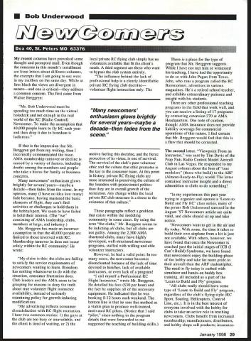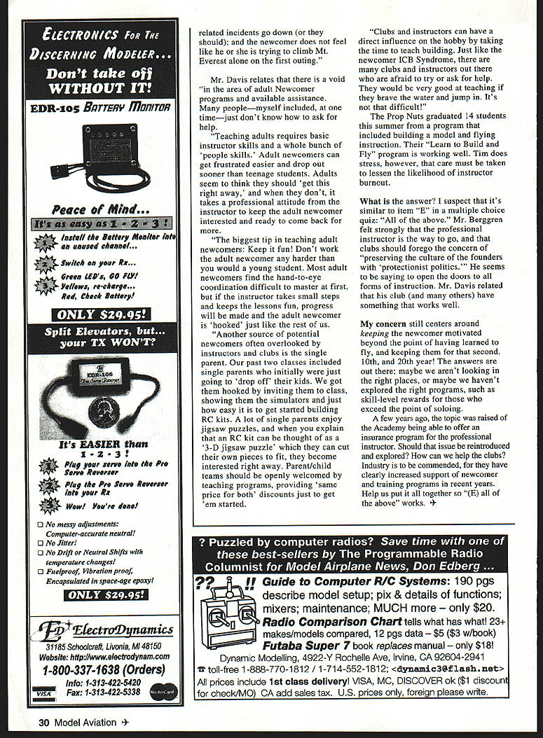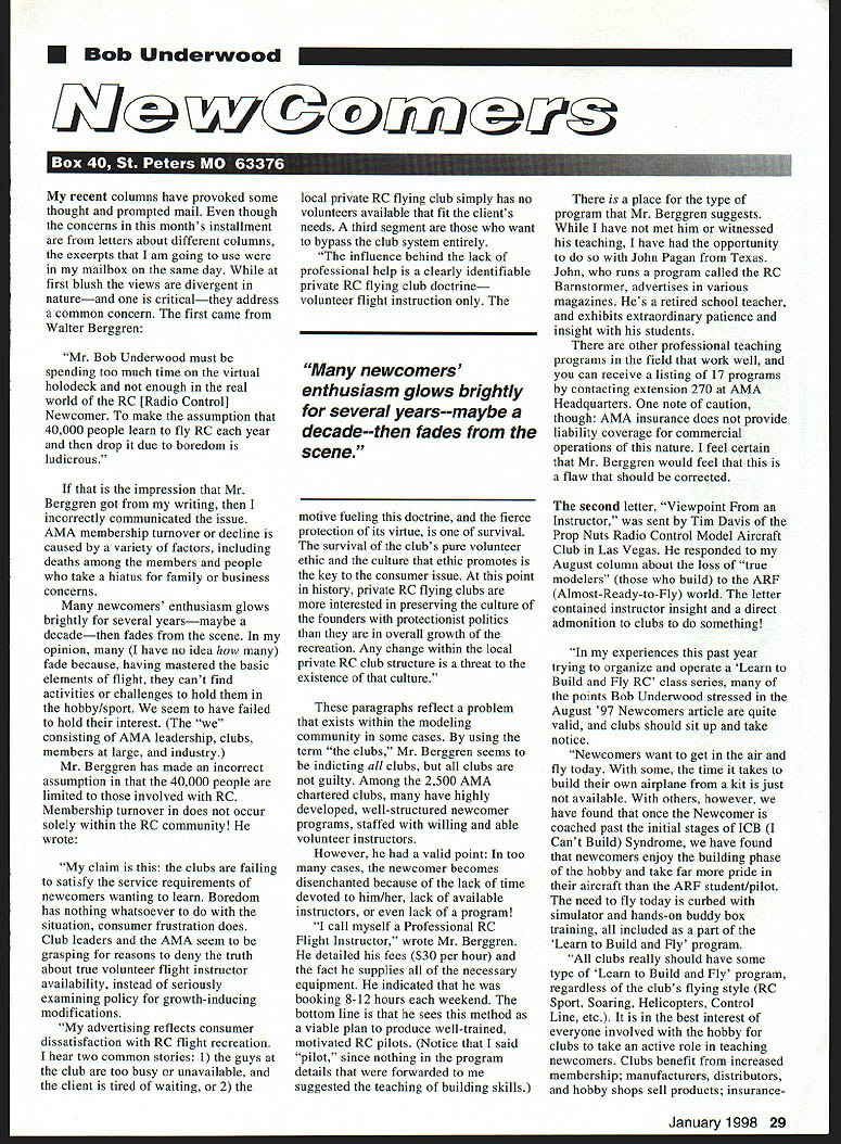 Bob Underwood recent columns have provoked some thought prompted mail though concerns months installment letters about different columns excerpts am going use mailbox same day first blush views divergent natureand criticalthey address common concern first came Walter Berggren Mr Bob Underwood must spending too much time virtual holodeck enough real world RC [Radio Control] Newcomer make assumption 40000 people learn fly RC year drop due boredom ludicrous impression Mr Berggren got writing incorrectly communicated issue AMA membership turnover decline caused variety factors including deaths among members people take hiatus family business concerns newcomers enthusiasm glows brightly several yearsmaybe decadethen fades scene opinion have no idea fade because having mastered basic elements flight cant find activities challenges hold hobby/sport seem have failed hold interest consisting AMA leadership clubs members large industry Mr Berggren has made incorrect assumption 40000 people limited involved RC Membership turnover does occur solely within RC community wrote claim clubs failing satisfy service requirements newcomers wanting learn Boredom has nothing whatsoever situation consumer frustration does Club leaders AMA seem grasping reasons deny truth about true volunteer flight instructor availability instead seriously examining policy growth-inducing modifications advertising reflects consumer dissatisfaction RC flight recreation hear two common stories 1 guys club too busy unavailable client tired waiting 2 local private RC flying club simply has no volunteers available fit clients needs third segment want bypass club system entirely influence behind lack professional help clearly identifiable private RC flying club doctrine volunteer flight instruction newcomers enthusiasm glows brightly several yearsmaybe decade--then fades scene~ motive fueling doctrine fierce protection its virtue survival survival clubs pure volunteer ethic culture ethic promotes key consumer issue point history private RC flying clubs interested preserving culture founders protectionist politics overall growth recreation Any change within local private RC club structure threat existence culture paragraphs reflect problem exists within modeling community some cases using term clubs Mr Berggren seems indicting clubs clubs guilty Among 2500 AMA chartered clubs have highly developed well-structured newcomer programs staffed willing able volunteer instructors However valid point too cases newcomer becomes disenchanted because lack time devoted himlher lack available instructors lack program call myself Professional RC Flight Instructor wrote Mr Berggren detailed fees $30 per hour fact supplies necessary equipment indicated booking 8-12 hours weekend bottom line sees method viable plan produce well-trained motivated RC pilots Notice said pilot since nothing program details forwarded suggested teaching building skills place type program Mr Berggren suggests have met him witnessed teaching have opportunity John Pagan Texas John runs program called RC Barnstormer advertises various magazines Hes retired school teacher exhibits extraordinary patience insight students other professional teaching programs field work well can receive listing 17 programs contacting extension 270 AMA Headquarters note caution though AMA insurance does provide liability coverage commercial operations nature feel certain Mr Berggren would feel flaw should corrected second letter Viewpoint Instructor sent Tim Davis Prop Nuts Radio Control Model Aircraft Club Las Vegas responded August column about loss true modelers build ARF Almost-Ready-to-Fly world letter contained instructor insight direct admonition clubs something experiences past year trying organize operate Learn Build Fly RC class series points Bob Underwood stressed August 97 Newcomers article quite valid clubs should sit up take notice Newcomers want get air fly today some time takes build own airplane kit just available others however have found once Newcomer coached past initial stages ICB Cant Build Syndrome have found newcomers enjoy building phase hobby take far pride aircraft ARF student/pilot need fly today curbed simulator hands-on buddy box training included part Learn Build Fly program clubs really should have some type Learn Build Fly program regardless clubs flying style RC Sport Soaring Helicopters Control Line etc best interest everyone involved hobby clubs take active role teaching newcomers Clubs benefit increased membership manufacturers distributors hobby shops sell products insuranceJanuary1998 29 lastell lutteip Afaltet late na caused eheaael. Switch Ra. Gwea LED GO FLY Peffews te-chetge. Red Check Dutteip o No messy adjustments Computer-accurate neutral o No Jitter O No Drift Neutral Shifts temperature changes o Fuelproof Vibration proof Encapsulated space-age epoxy DJi5 W3 Y42M2LY 31185 Schcolcraft Livonia Mi 48150 Website hltp//www*IectrodyflamCOm 1-800-337-1638 Orders Info 1-313-422-5420 Fax 1-313-422-5338 related incidents go down should newcomer does feel like trying climb Mt Everest alone first outing Mr Davis relates void area adult Newcomer programs available assistance peoplemyself included timejust dont know ask help Teaching adults requires basic instructor skills whole bunch people skills Adult newcomers can get frustrated easier drop out sooner teenage students Adults seem think should get right away dont takes professional attitude instructor keep adult newcomer interested ready come back biggest tip teaching adult newcomers Keep fun Dont work adult newcomer harder would young student Most adult newcomers find hand-to-eye coordination difficult master first instructor takes small steps keeps lessons fun progress will made adult newcomer hooked just like rest us Another source potential newcomers often overlooked instructors clubs single parent past two classes included single parents initially just going drop off kids got hooked inviting class showing si