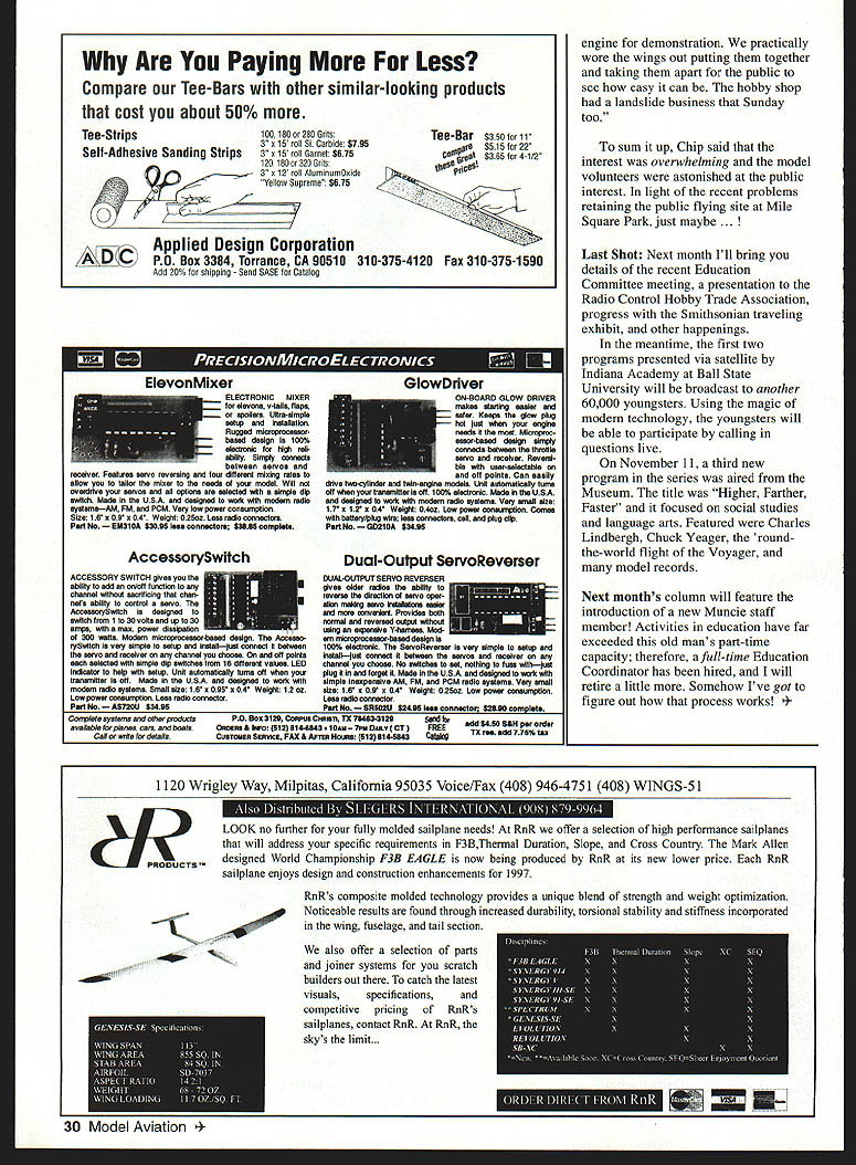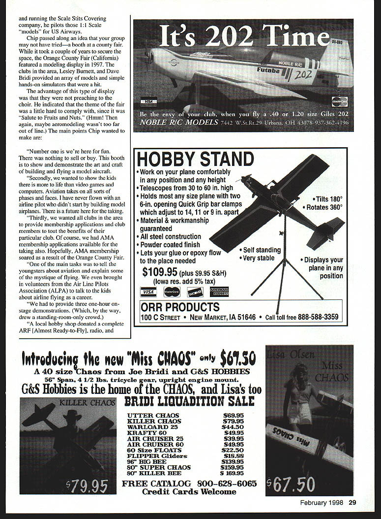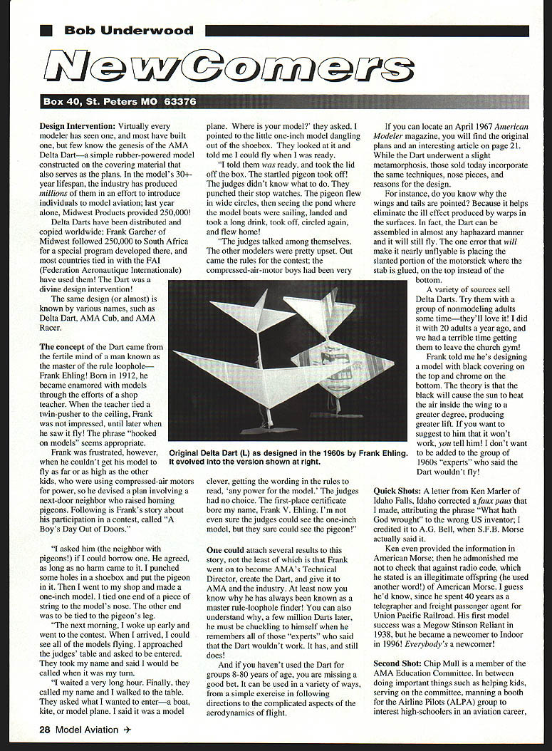 Bob Underwood Design Intervention Virtually modeler has seen have built few know genesis AMA Delta Darta simple rubber-powered model constructed covering material also serves plans models 30year lifespan industry has produced millions effort introduce individuals model aviation last year alone Midwest Products provided 250000 Delta Darts have distributed copied worldwide Frank Garcher Midwest followed 250000 South Africa special program developed countries tied FAI Federation Aeronautique Internationale have used Dart divine design intervention same design almost known various names such Delta Dart AMA Cub AMA Racer concept Dart caine fertile mind man known master rule loophole Frank Ehling Born 1912 became enamored models through efforts shop teacher teacher tied twin-pusher ceiling Frank impressed until later saw fly phrase hooked models seems appropriate Frank frustrated however couldnt get model fly far high other kids using compressed-air motors power devised plan involving next-door neighbor raised homing pigeons Following Franks story about participation contest called Boys Day Out Doors asked him neighbor pigeons could borrow agreed long no harm came punched some holes shoebox put pigeon went shop made one-inch model tied end piece string models nose other end tied pigeons leg next morning woke up early went contest arrived could see models flying approached judges table asked entered took name said would called turu waited very long hour Finally called name walked table asked what wanted entera boat kite model plane said model plane model asked pointed little one-inch model dangling out shoebox looked told could fly ready told ready took lid off box startled pigeon took off judges didnt know what punched stop watches pigeon flew wide circles seeing pond model boats sailing landed took long drink took off circled again flew home judges talked among themselves other modelers pretty upset Out came rules contest compressed-air-motor boys very clever getting wording rules read power model judges no choice first-place certificate bore name Frank V Ehling Im sure judges could see one-inch model sure could see pigeon could attach several results story least Frank went become AMAs Technical Director create Dart give AMA industry least now know has always known master rule-loophole finder can also understand few million Darts later must chuckling himself remembers experts sald Dart wouldnt work has still does havent used Dart groups 8-80 years age missing good bet can used variety ways simple exercise following directions complicated aspects aerodynamics flight can locate April 1967 American Modeler magazine will find original plans interesting article page 21 Dart underwent slight metamorphosis sold today incorporate same techniques nose pieces reasons design instance know wings tails pointed Because helps eliminate ill effect produced warps surfaces fact Dart can assembled almost haphazard manner will still fly error will make nearly unflyable placing slanted portion motorstick stab glued top instead bottom variety sources sell Delta Darts Try group nonmodeling adults some timetheyll love did 20 adults year ago terrible time getting leave church gym Frank told hes designing model black covering top chrome bottom theory black will cause sun heat air inside wing greater degree producing greater lift want suggest him wont work tell him dont want added group 1960s experts said Dart wouldnt fly Quick Shots letter Ken Marler Idaho Falls Idaho corrected faux paus made attributing phrase What hath God wrought wrong US inventor credited AG Bell SFB Morse actually said Ken provided information American Morse admonished check against radio code stated illegitimate offspring used another word American Morse guess hed know since spent 40 years telegrapher freight passenger agent Union Pacific Railroad first model success Megow Stinson Reliant 1938 became newcomer Indoor 1996 Everybodys newcomer Second Shot Chip Mull member AMA Education Committee between doing important things such helping kids serving committee manning booth Airline Pilots ALPA group interest high-schoolers aviation career 28 Model Aviation inal Delta Dart L designed 1960s Frank Ehling evolved version shown right running Scale Stits Covering company pilots 11 Scale models US Airways Chip passed along idea group may have trieda booth county fair took couple years secure space Orange County Fair California featured modeling display 1997 clubs area Lesley Burnett Dave Bridi provided array models simple hands-on simulators hit advantage type display preaching choir indicated theme fair little hard comply since Salute Fruits Nuts Hmm again maybe aeromodeling wasnt too far out line main points Chip wanted make Number fun nothing sell buy booth show demonstrate art craft building flying model aircraft Secondly wanted show kids life video games computers Aviation takes sorts phases faces have never flown airline pilot didnt start building model airplanes future taking Thirdly wanted clubs area provide membership applications club members tout benefits particular club course AMA membership applications available taking also Hopefully AMA membership soared result Orange County Fair main tasks tell youngsters about aviation explain some mystique flying brought volunteers Air Line Pilots Association ALPA talk kids about airline flying career provide three one-hour stage demonstrations Which way drew standing-room-only crowd local hobby shop donated complete ARF [Almost Ready-to-Fly] radio HOBBY STAND Work plane comfortably position height eTelescopes 30 60 high Holds size plane two 6-in opening Quick Grip bar clamps adjust 1411 or9 inap Material & workmanship guaranteed steel construction er coated finish Lets glue epoxy flow place needed $10995 plus $995 S&H Iowa res add 5% tax VISAIwraIm w standing Very stable /1 ORR PRODUCTS 100 C STREET MARKET IA 51646 toll free 888-588-3359 lntroducin% new Miss CMAOS 0 40 size haos Joe Bridi G&S HOBBIES 5