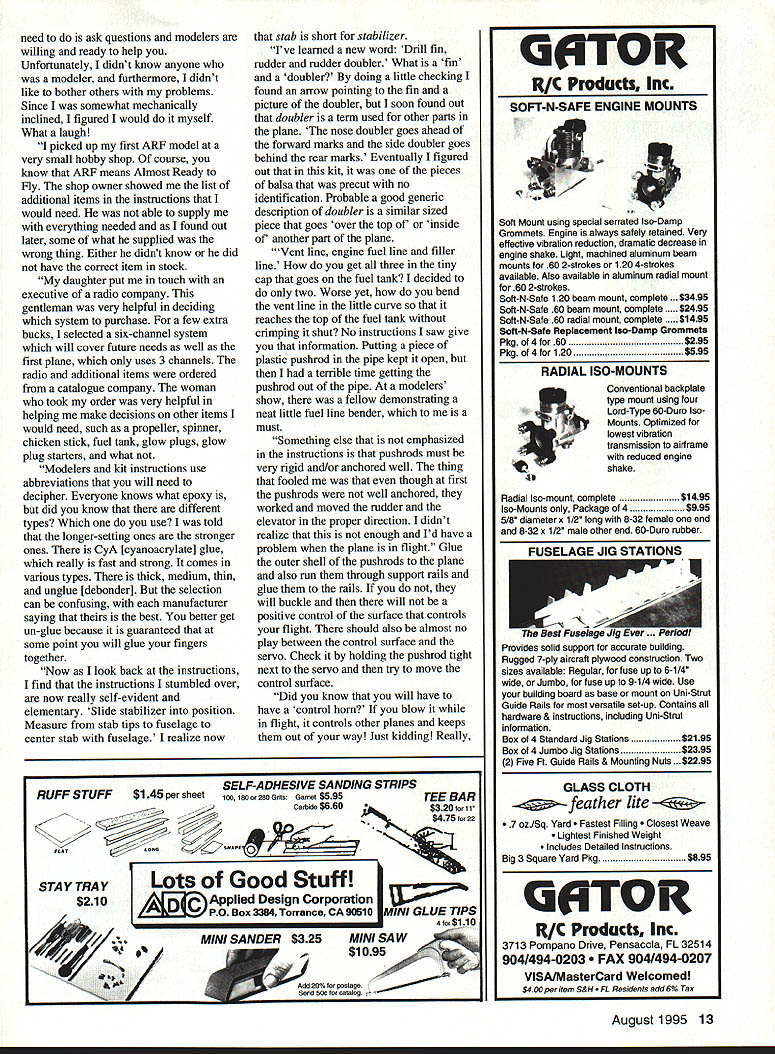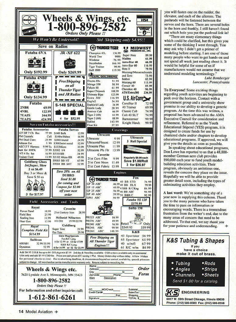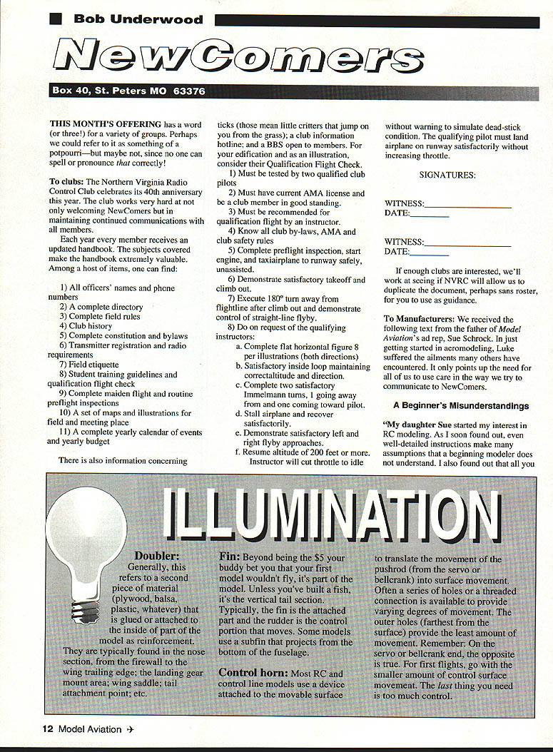 Bob Underwood THIS MONTHS OFFERING has word three variety groups Perhaps could refer something potpourribut maybe since no can spell pronounce correctly clubs Northern Virginia Radio Control Club celebrates its 40th anniversary year club works very hard welcoming NewComers maintaining continued communications members year member receives updated handbook subjects covered make handbook extremely valuable Among host items can find 1 officers names phone numbers 2 complete directory 3 Complete field rules 4 Club history 5 Complete constitution bylaws 6 Transmitter registration radio requirements 7 Field etiquette 8 Student training guidelines qualification flight check 9 Complete maiden flight routine preflight inspections 10 set maps illustrations field meeting place 11 complete yearly calendar events yearly budget also information concerning ticks mean little critters jump grass club information hotline BBS open members edification illustration consider Qualification Right Check 1 Must tested two qualified club pilots 2 Must have current AMA license club member good standing 3 Must recommended qualification flight instructor 4 Know club by-laws AMA club safety rules 5 Complete preflight inspection start engine taxiairplane runway safely unassisted 6 Demonstrate satisfactory takeoff climb out 7 Execute 1800 turn away flightline after climb out demonstrate control straight-line flyby 8 request qualifying instructors a Complete flat horizontal figure 8 per illustrations both directions b Satisfactory inside loop maintaining correctaltitude direction c Complete two satisfactory Immelmann turns 1 going away coming toward pilot d Stall airplane recover satisfactorily e Demonstrate satisfactory left right flyby approaches f Resume altitude 200 feet Instructor will cut throttle idle warning simulate dead-stick condition qualifying pilot must land airplane runway satisfactorily increasing throttle SIGNATURES WITNESS DATE______ WITNESS DATE______ enough clubs interested well work seeing NVRC will allow us duplicate document perhaps sans roster use guidance Manufacturers received following text father Model Aviations ad rep Sue Schrock just getting started aeromodeling Luke suffered ailments others have encountered points up need us use care way try communicate NewComers Beginners Misunderstandings daughter Sue started interest RC modeling As soon found out well-detailed instructions make assumptions beginning modeler does understand also found out 12 Model Aviation ask questions modelers willing ready help Unfortunately didnt know anyone modeler furthermore didnt like bother others problems Since somewhat mechanically inclined figured would myself What laugh picked up first ARF model very small hobby shop course know ARF means Almost Ready Fly shop owner showed list additional items instructions would need able supply everything needed found out later some what supplied wrong thing Either didnt know did have correct item stock daughter put touch executive radio company gentleman very helpful deciding system purchase few extra bucks selected six-channel system will cover future needs well first plane uses 3 channels radio additional items ordered catalogue company woman took order very helpful helping make decisions other items would need such propeller spinner chicken stick fuel tank glow plugs glow plug starters what Modelers kit instructions use abbreviations will need decipher Everyone knows what epoxy did know different types Which use told longer-setting ones stronger ones CyA [cyanoacrylate] glue really fast strong comes various types thick medium thin unglue [debonder] selection can confusing manufacturer saying best better get un-glue because guaranteed some point will glue fingers together Now look back instructions find instructions stumbled over now really self-evident elementary Slide stabilizer position Measure stab tips fuselage center stab fuselage realize now stab short stabilizer Ive learned new word Drill fin rudder rudder doubler What fin doubler doing little checking found arrow pointing fin picture doubler soon found out doubler term used other parts plane nose doubler goes ahead forward marks side doubler goes behind rear marks Eventually figured out kit pieces balsa precut no identification Probable good generic description doubler similar sized piece goes over top inside another part plane Vent line engine fuel line filler line get three tiny cap goes fuel tank decided two Worse yet bend vent line little curve reaches top fuel tank crimping shut No instructions saw give information Putting piece plastic pushrod pipe kept open terrible time getting pushrod out pipe modelers show fellow demonstrating neat little fuel line bender must Something else emphasized instructions pushrods must very rigid and/or anchored well thing fooled though first pushrods well anchored worked moved rudder elevator proper direction didnt realize enough Id have problem plane flight Glue outer shell pushrods plane also run through support rails glue rails will buckle will positive control surface controls flight should also almost no play between control surface servo Check holding pushrod tight next servo try move control surface Did know will have have control horn blow flight controls other planes keeps out way Just kidding Really SELF-ADHESIVE SANDING STRIPS RUFF STUFF$145 per sheet100180 280 Grits Garnet $595 Catbide $660 rCACONG STAY TRAY $210 AR $320 i1 C $475 tsr 22 Lots Good Stuff_ f~AppIied Design Corporation 1L' LI3/ PO Box 3384 Torrance CA 90610 .INI GLUE TIPS 4 $1 10 MINI SAIlflfl $325MINI SAW $1095 Add 20% tsr postage Send 500 tsr catalog O1I RIC Products Inc SOFT-N-SAFE ENGINE MOUNTS Soft Mount using special serrated Iso-Damp Grommets Engine always safely retained Very effective vibration reduction dramatic decrease engine shake Light machined aluminum beam mounts 60 2-strokes 120 4-strokes available Also available aluminum radial mount 60 2-strokes Soft-N-Safe 120 beam mount complete 