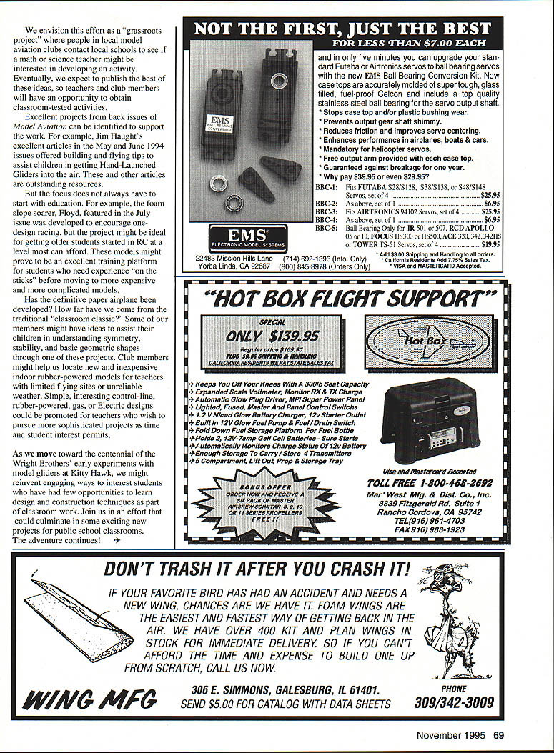 U Bob Underwood U ~u1J14 tdemy ei rias design4 activity identific rogranis indica JUST IMAGINE science classroom smell balsa air Imagine students applying concepts related forces flight center gravity experimental variables construct own flying models Imagine students having opportunity write about experiences language arts classes work scale drawings model part math class activities going right now part Ferraric s Flying Physics Redwood Middle School Napa California Most us grew up era activities related after-school programs Todays teachers looking opportunities engage students hands activities reinforce academics classroom Once basic reading writing arithmetic skills learned teachers need activities apply skills ways exciting meaningful students Model aviation offers numerous opportunities help bring math science concepts life Rocco Ferrano seventh-grade teacher almost ten years experience integrating model-airplane construction middle-school science classes work led him design all-balsa rubber-powered stick model combining best features several designs found back issues Model Aviation time students enthusiasm convinced other teachers incorporate some Mr Ferrarios ideas language-arts math classrooms Eventually Mr Ferrario honored Napa Valleys Teacher Year award work enthusiasm now shares units through workshops providing colleagues several California schools balsa models help run own programs also runs four-week summer camp Napa Valley Community College Bob Underwood asked write column promote structured information exchange between classroom teachers members model aviation community wish announce establishment clearinghouse information believe Rocco Feff aria teacher has incorporated activities accomplish objectives academic classroom confident members 2300 AMA-affiliated clubs would willing help teachers activities Building flyable model aircraft activity lends itself wide variety curricular concepts Most importantly gives students chance demonstrate ability solve problems apply knowledge new situations propose periodic feature magazinean opportunity promote ideas identify model club members willing spend little time classroom helping teachers hope provide forum exchange projects eventually developing master list resources around United States As mailing list grows can expand work electronic database through use E-mail Internet Eventually activities could lead workshop Muncie promote model aviation motivational tool middie- high-school classrooms goal start small let individuals participate define scope effort club Northeastern Drone Society produces newsletter interesting information classroom teachers might find useful want connect talent clubs classroom teachers would welcome assistance short focused units matched curriculum objectives Most teachers ready accept assistance few have Mr Ferrarios level interest membership modeling academic communities AMA ideal position assist effort Academy has long-standing interest developing programs young modelers Young Eagles program Experimental Aircraft Association EAA Fly-A-Teacher program Aircraft Owners Pilots Association AOPA make possible AMA leverage its impact public school classrooms linking other organizations Occasional articles EAA AOPA publications reflect need recruit young people sport aviation would clearinghouse really work have answers can imagine AMA members have already offered help building everything kites rockets would willing share ideas respond inquiries teachers become aware resources local clubs have worked classroom teachers aware specific modelbuilding activities have successful classroom invite contact us 68 Model Aviation sion effort grassroots project people local model aviation clubs contact local schools see math science teacher might interested developing activity Eventually expect publish best ideas teachers club members will have opportunity obtain classroom-tested activities Excellent projects back issues Model Aviation can identified support work example Jim Haughts excellent articles May June 1994 issues offered building flying tips assist children getting Hand-Launched Gliders air other articles outstanding resources focus does always have start education example foam slope soarer Floyd featured July issue developed encourage onedesign racing project might ideal getting older students started RC level can afford models might prove excellent training platform students need experience sticks before moving expensive complicated models Has definitive paper airplane developed far have come traditional classroom classic Some members might have ideas assist children understanding symmetry stability basic geometric shapes through projects Club members might help us locate new inexpensive indoor rubber-powered models teachers limited flying sites unreliable weather Simple interesting control-line rubber-powered gas Electric designs could promoted teachers wish pursue sophisticated projects time student interest permits As move toward centennial Wright Brothers early experiments model gliders Kitty Hawk might reinvent engaging ways interest students have few opportunities learn design construction techniques part classroom work Join us effort could culminate some exciting new projects public school classrooms adventure continues N aa E SIMMONS GALES8URG IL 61401 SEND $500 FOR CATALOG WITH DATA SHEETS five minutes can upgrade stan dard Futaba Airtronics servos ball bearing servos new EMS Ball Bearing Conversion Kit New case tops accurately molded super tough glass filled fuel-proof Celcon include top quality stainless steel ball bearing servo output shaft * Stops case top and/ar plastic bushing wear * Prevents output gear shaft shimmy * Reduces friction improves servo centering * Enhances performance airplanes boats & cars * Mandatory helicopter servos * Free output arm provided case top * Guaranteed against breakage year * Why pay $3995 $2995 IBC-1 Fits FUTABA S28/S128 S38/S138 548/5148 Servos set 4$2595 tflC2A