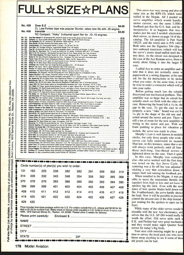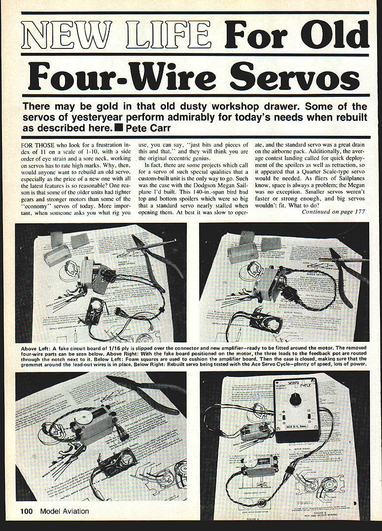 IzJ1i77Y JiD3Jii Old Four-Wire Servos may gold old dusty workshop drawer Some servos yesteryear perform admirably todays needs rebuilt described hereE Pete Carr FOR THOSE look frustration dex 11 scale 1-10 side order eye strain sore neck working servos has rate high marks would anyone want rebuild old servo especially price new latest features reasonable rea son some older units tighter gears stronger motors some economy servos today impor tant someone asks what rig use can say just bits pieces will think original eccentric genius fact some projects call servo such special qualities custom-built unit way go Such case Dodgson Megan Sail plane Id built 140-in-span bird top bottom spoilers big standard servo nearly stalled opening best slow oper ate standard servo great drain airborne pack Additionally aver age contest landing called quick deploy ment spoilers well retraction appeared Quarter Scale-type servo would needed As fliers Sailplanes know space always problem Megan no exception Smaller servos werent faster strong enough big servos wouldnt fit What Continued page 177 Above Left fake circuit board 1/16 ply slipped over connector new amplifierready fitted around motor removed four-wire parts can seen below Above Right fake board positioned motor three leads feedback pot routed through notch next Below Left Foam squares used cushion amplifier board case closed making sure grommet around lead-out wires place Below Right Rebuilt servo being tested Ace Servo Cycleplenty speed lots power 100 Model Aviation DVERTISERS INDEX ADVERTISERS INDEX ADVERTISERS INDEX ADVERTISERS INDEX &A IndustrIes25 MA Membership79 -justo-jig135 ce RC Inc135 ero Tech RC128 Irrech153 lrtronlcs2 -Tec Products Inc171 lexander & Alexander163 II Phase Art159 mericas Hobby Center37 pplled DesIgn Corp168 stro Flight128 &rHobbles130 alsa USA7 ehrens Plan Service170 ru-Line Industries28 yron Originals49 alifornia Model Imports27 arolina-Taffinder143 hnnle Casburn Mfg11 hamplon Model Products174 hevrOn14 ircus Hobbies98-99 leveland Model & Supply Co176 nc Clutton177 ondor Hobbles21 onsumers Guide RC Aircraft Prod. onsumers Hobby Corp150-151 overite17 Enterprises28 &D Engineering134 fG Products160 GA Designs26 1GM InduStries177 ohannes Daldosch131 favey Systems Corp130 arry Dodge Aero Inc176 bodgson Designs51 bugs Hobby Shop140-141 u-BrO ProductS16 177 Lastern Soaring Supplies nya Model Engines Model Supply HS Supply Inc abtronicS lite Line Products Inside Back Cover 177 4 138 143 Flyilne Models138 Fourmost Products162 Fox Mfg Co172 Futaba Corp America29 129 179 Gator RC Products154 Gemini Models148 Carl Goldberg Models15 Gorhgm Model Products167 Great Lakes Model Co139 Great Lakes Radio Control152 Great Planes Model Mfg de Front Cover 4 126 Grish Brothers9 Art Gross Enterprises161 William M Hawke24 Historic Aviation5 Hobby Barn132-1 33 Hobby Capitol Distributors176 Hobby Horn160 Hobby Lobby international6 Hobby Radio Shop22 Hobby Swap News148 Hobbypoxy Products169 Hoffelt Group161 lkonNWeSt174 indy RC Sales146-147 International Modeler Show127 J-5 Enterprises142 K&B ManufacturIng Co138 K&S Engineering26 Kin Craft130 Kings RC Hobbles Intl166-175 Kraft Systems83 Leisure Electronics158 Lone Star Models131 MACS Products131 Majestic Models134 Marks Models Master KIt144 McDanIel RC Service145 Jim Messers Quality Model ProductS Micro Mark148 Midwest Model Supply Co161 Midwest Products95 Midwest TechnIcal PublicatIons176 Model Engineering Norwalk173 Model Magic Products164 Model Products Corp148 Model Rectifier Corp1 Mutchiers Hobbles136-137 Nor-Cal AvIonics134 OhIo Superstar134 Pacer Technology & Resources180 Peck-Polymers172 PIca Products172 Dave Platt Models24 Polks Hobby45 Proctor Enterprises131 RF Enterprises170 RLF Products176 Radio Equipment Exchange176 Repla-Tech International177 Richardson PrecisIon Machining166 Ricks Kits160 Robbe Modellsport92-93 Roush Mfg Co144 158 161 155 177 126 158 10 145 22 156-157 13 144 SR Batteries S&W Hobby Supply Flite Models Salt Fork II Satellite City Scratch-A-Plane Semco Sheldons Hobby Shop Sig ManufacturIng Co St CroIx Park Falls Ltd Tatone Products Taylor-Craft Ltd Tide DistrIbutors Inc Toledo RC Exposition Top Filte Models Tower Hobbles Twlnn-K Inc VKModel Aircraft. VL Products Bob Vioiett Models WE Technical Services Williams Brothers World Engines Xpiorer EnterprIses CA ZaIc NIck ZIroli Models 159 23 145 149 165 139 153 164 168 8 14 Back Cover 139 135 14 128 Kavan flying rally Owners ot extra benefit during weekend its manufacturer Franz Kavan came West Germany daughter couple factory demonstration models plus pilot fly Kavan engines flightline got personal touch maker half-dozen demonstration flights demo planes featured plenty high-G aerobatics 90 mph low inverted passes PAW DIESELS Englands Finest 049 29 New low low prices Send $100 list Eric Clutton 3816 DeSoto Ave Fort Myers Florida 33905 Frequency allocations slight problem huge attendance final count showed just under 450 flights weekend fre quently six seven ships air once no midairs two crashes recorded during event astounding glance up see sky filled airplanes hear practically no noise Spectators pilots alike commented relaxed atmosphere quiet four-stroke engines produced could sit sun watch goings-on along flightllne holding normal conver sation friends recent changes interna tional competitive rules con stant emphasis noise control looks like future four-cycle engine unllmited Right now engines coming foreign manu facturers turnout First World Engines/Hawks Four-Cycle Rally indication plenty de mand spur development domestic companies Most modeling spec tators big event went away con vinced high time get strokin' Servos/Carr Continued page 100 old proportional sets Japan OS imported World Engines back late 1960s first-quality set its day rigs era used center-tapped battery feed amplifier servosa disaster battery cell failed servos old rig designated SP-260 four wires plus minus battery signal decoder white battery center ta