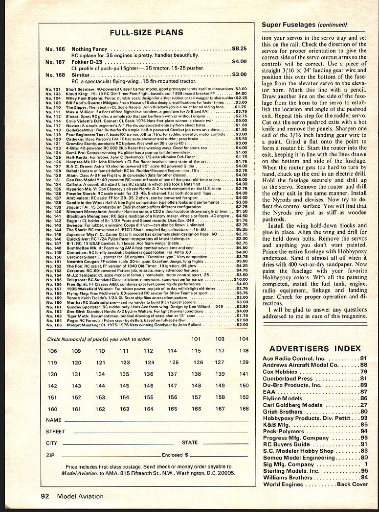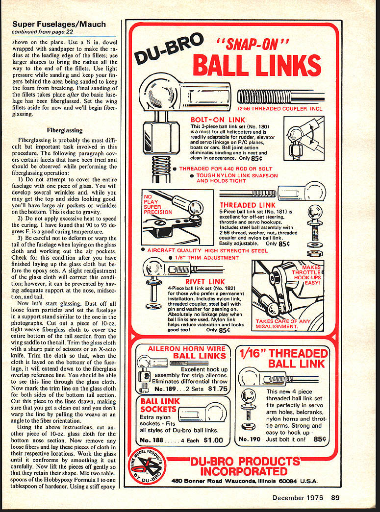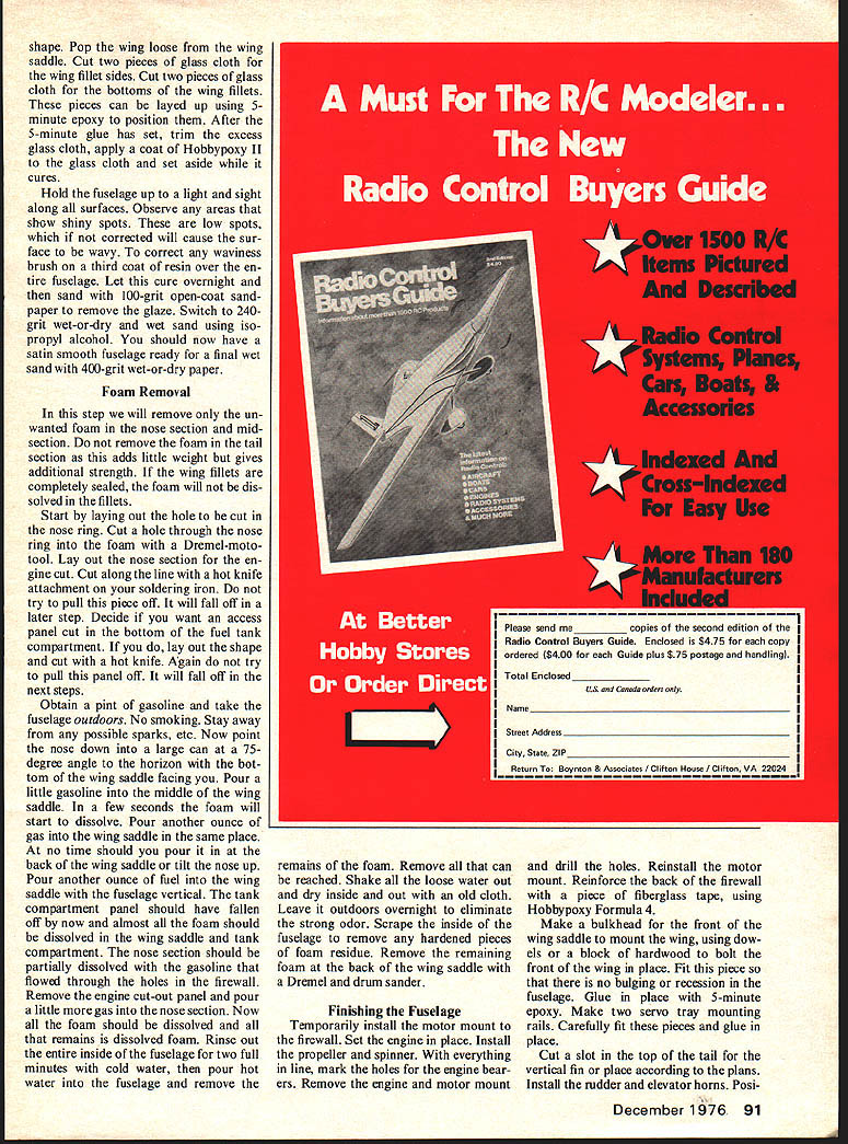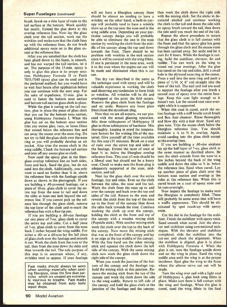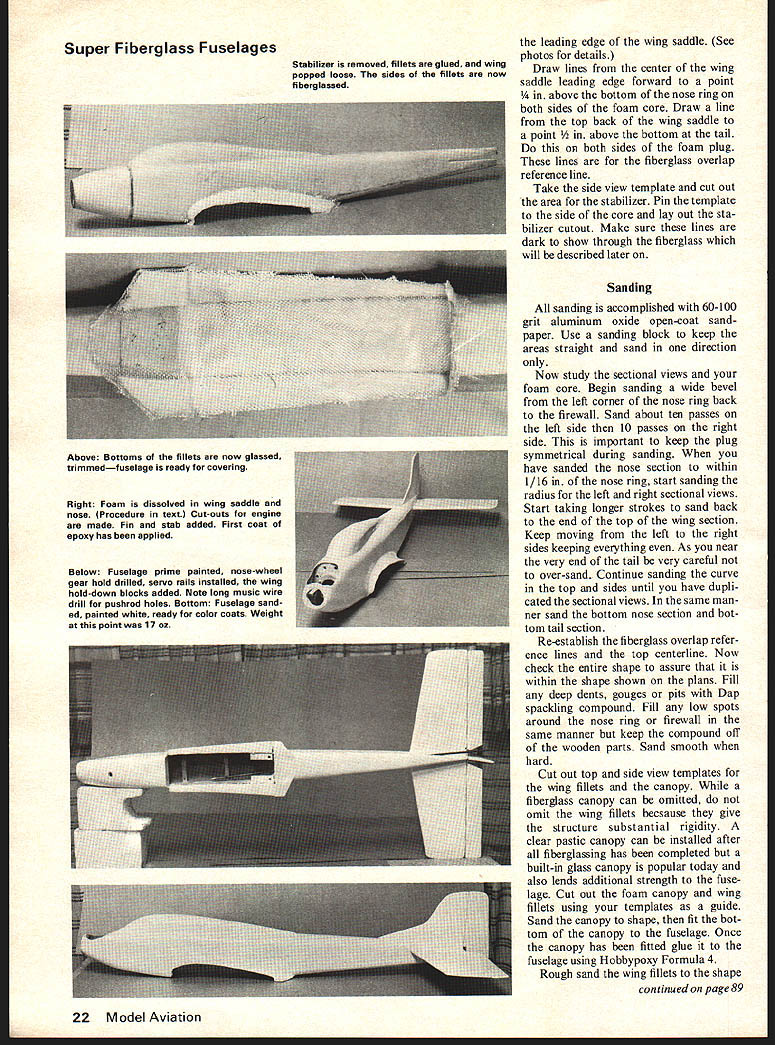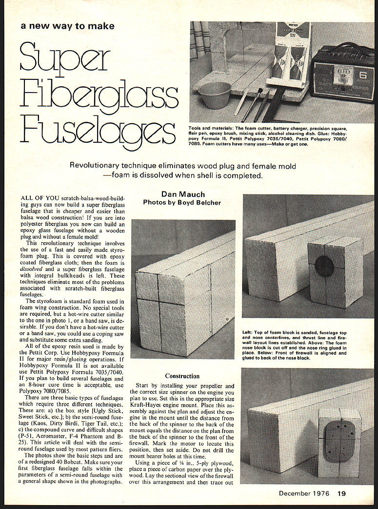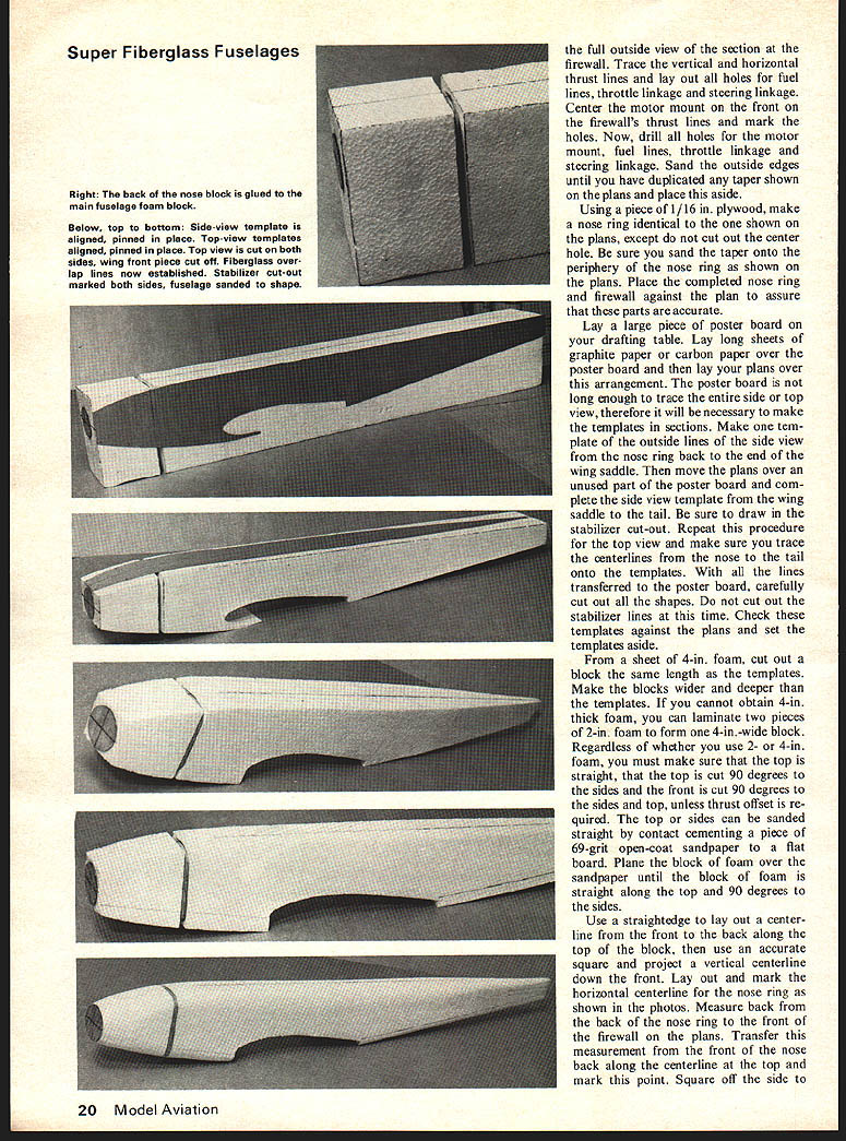 a new way make Super Fibergiuss FuseiGges Revolutionary technique eliminates wood plug female mold foam dissolved shell completed ALL OF YOU scratch-balsa-wood-build ing guys can now build super fiberglass fuselage cheaper easier balsa wood construction polyester fiberglass now can build epoxy glass fuselage wooden plug female mold revolutionary technique involves use fast easily made styro foam plug covered epoxy coated fiberglass cloth foam dissolved super fiberglass fuselage integral bulkheads left techniques eliminate problems associated scratch-built fiberglass fuselages styrofoam standard foam used foam wing construction No special tools required hot-wire cutter similar photo 1 band saw de sirable dont have hot-wire cutter band saw could use coping saw substitute some extra sanding epoxy resin used made Pettit Corp Use Hobbypoxy Formula II major resin/glueing operations Hobbypoxy Formula II available use Pettit Polypoxy Formula 7035/7040 plan build several fuselages 8-hour cure time acceptable use Polypoxy 7080/7085 three basic types fuselages require three different techniques box style [Ugly Stick Sweet Stick etc] b semi-round fuse lage Kaos Dirty Birdi Tiger Tail etc c compound curve difficult shapes P-Si Aeromaster F-4 Phantom B25 article will deal semiround fuselage used pattern fliers photos show basic steps redesigned 40 Bobcat Make sure first fiberglass fuselage falls within parameters semi-round fuselage general shape shown photographs Dan Mauch Photos Boyd Beicher Construction Start installing propeller correct size spinner engine plan use Set appropriate size Kraft-Hayes engine mount Place sembly against plan adjust en gine mount until distance back spinner back mount equals distance plan back spinner front firewall Mark motor locate position set aside drill mount bearer holes time Using piece y plywood place piece carbon paper over ply wood Lay sectional view firewall over arrangement trace out December 1976 19 Tools materials foam cutter battery charger precision square flair pen epoxy brush mixing stick alcohol cleaning dish Glue Hobby poxy Formula II Pettit Polypoxy 7035/7040 Pettit Polypoxy 7080/ 7085 Foam cutters have usesMake get Left Top foam block sanded fuselage top nose centerlines thrust line fire wall layout lines established Above foam nose block cut off nose ring glued place Below Front firewall aligned glued back nose block Super Fiberglass Fuselages Right back nose block glued main fuselage foam block Below top bottom Side-view template aligned pinned place Top-view templates aligned pinned place Top view cut both sides wing front piece cut off Fiberglass over lap lines now established Stabilizer cut-out marked both sides fuselage sanded shape full outside view section firewall Trace vertical horizontal thrust lines lay out holes fuel lines throttle linkage steering linkage Center motor mount front firewalls thrust lines mark holes Now drill holes motor mount fuel lines throttle linkage steering linkage Sand outside edges until have duplicated taper shown plans place aside Using piece 1/16 plywood make nose ring identical shown plans except cut out center hole sure sand taper onto periphery nose ring shown plans Place completed nose ring firewall against plan assure parts accurate Lay large piece poster board drafting table Lay long sheets graphite paper carbon paper over poster board lay plans over arrangement poster board long enough trace entire side top view therefore will necessary make templates sections Make tem plate outside lines side view nose ring back end wing saddle move plans over unused part poster board com plete side view template wing saddle tail sure draw stabilizer cut-out Repeat procedure top view make sure trace centerlines nose tail onto templates lines transferred poster board carefully cut out shapes cut out stabilizer lines time Check templates against plans set templates aside sheet 4-in foam cut out block same length templates Make blocks wider deeper templates cannot obtain 4-in thick foam can laminate two pieces 2-in foam form 4-in-wide block Regardless whether use 2- 4-in foam must make sure top straight top cut 90 degrees sides front cut 90 degrees sides top unless thrust offset re quired top sides can sanded straight contact cementing piece 69-grit open-coat sandpaper flat board Plane block foam over sandpaper until block foam straight along top 90 degrees sides Use straightedge lay out center line front back along top block use accurate square project vertical centerline down front Lay Out mark horizontal centerline nose ring shown photos Measure back back nose ring front firewall plans Transfer measurement front nose back along centerline top mark point Square off side 20 Model Aviation point lay out draw line across top side side Using square project line top down side Pin /s X ce strips against side lines just drawn cut off nose block using hot-wire cutter bow-type saw off using band saw Make sure cut straight Project top centerline down back just cut off nose block Lay out draw horizontal thrust line onto back nose block Using Hobbypoxy Formula 4 glue back nose ring front foam block lining up centerlines nose ring Use glue sparingly keep glue outer edges cures glue thefmnt ply firewall back nose block shown photo graphs cured glue back firewall large foam block using straightedges keep assembly aligned cures Foam Cutting Lay foam block its right side Lay left side front template against foam Line up center nose ring center templates nose Check midsection top top foam block satisfied use plenty pins secure template block Install rear section template same manner making sure tail section template top butts forward section shown photographs Double check squaring off right side foam block top nose ring check top nose template Repeat maneuver firewall satis fied alignment can now cut side view Before begin would suggest cut nose section outside template sand down nose sure dont undercut template nose ring firewall Begin c