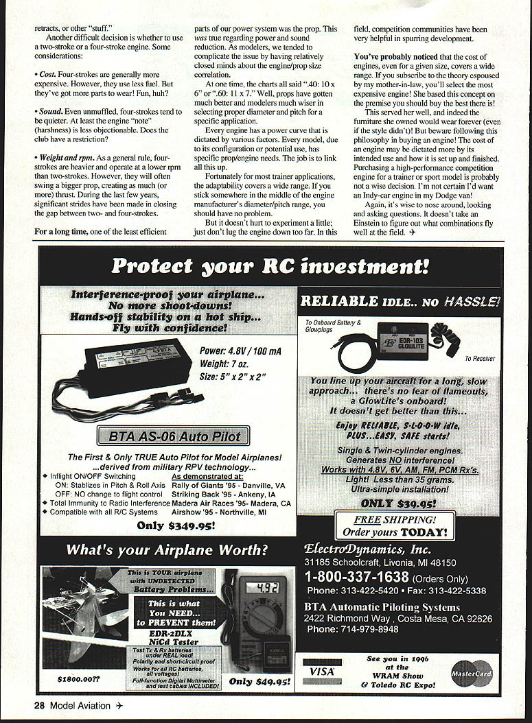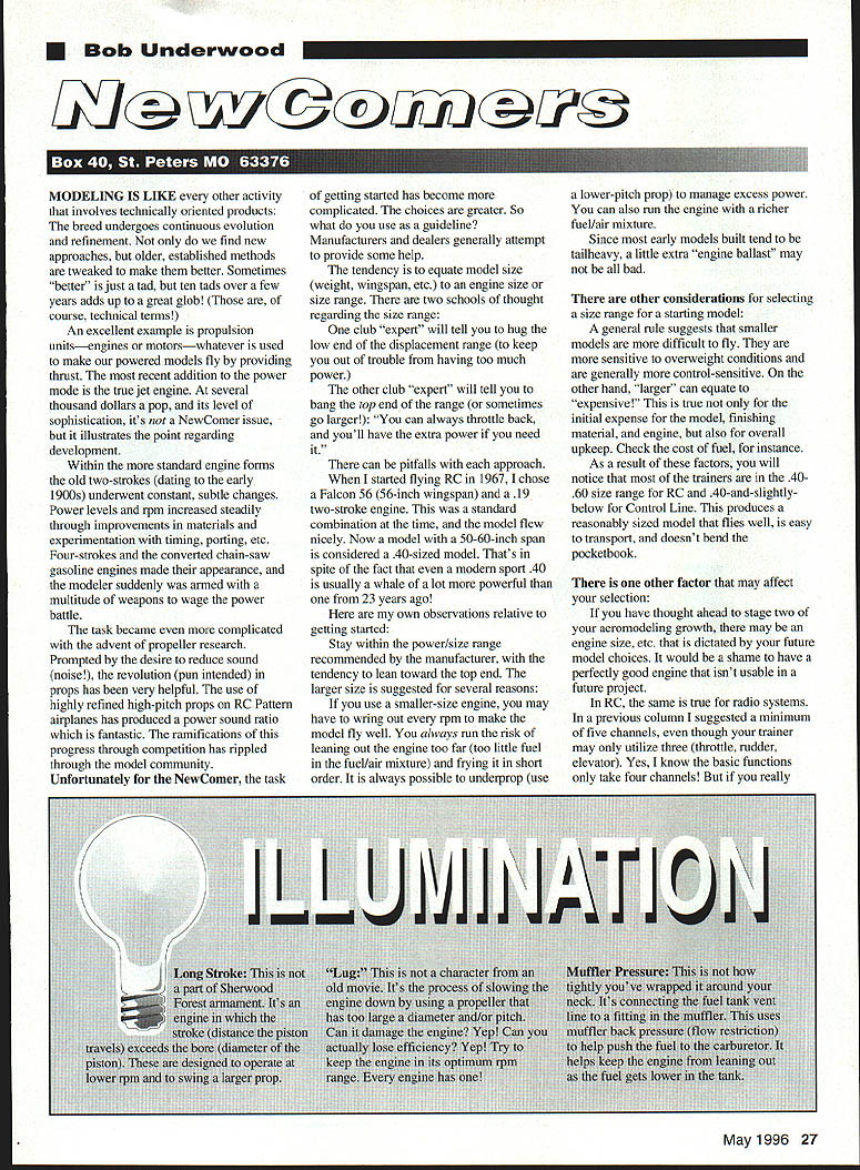 U Bob Underwood 5P74 Y@KU MODELING IS LIKE other activity involves technically oriented products breed undergoes continuous evolution refinement find new approaches older established methods tweaked make better Sometimes better just tad ten tads over few years adds up great glob course technical terms An excellent example propulsion unitsengines motorswhatever used make powered models fly providing thrust recent addition power mode true jet engine several thousand dollars pop its level sophistication its NewComer issue illustrates point regarding development Within standard engine forms old two-strokes dating early 1900s underwent constant subtle changes Power levels rpm increased steadily through improvements materials experimentation timing porting etc Four-strokes converted chain-saw gasoline engines made appearance modeler suddenly armed multitude weapons wage power battle task became complicated advent propeller research Prompted desire reduce sound noise revolution pun intended props has very helpful use highly refined high-pitch props RC Pattern airplanes has produced power sound ratio fantastic ramifications progress through competition has rippled through model community Unfortunately NewComer task getting started has become complicated choices greater So what use guideline Manufacturers dealers generally attempt provide some help tendency equate model size weight wingspan etc engine size size range two schools thought regarding size range club expert will tell hug low end displacement range keep out trouble having too much power other club expert will tell bang top end range sometimes go larger can always throttle back youll have extra power need can pitfalls approach started flying RC 1967 chose Falcon 56 56-inch wingspan 19 two-stroke engine standard combination time model flew nicely Now model 50-60-inch span considered 40-sized model Thats spite fact modern sport 40 usually whale lot powerful 23 years ago own observations relative getting started Stay within power/size range recommended manufacturer tendency lean toward top end larger size suggested several reasons use smaller-size engine may have wring out rpm make model fly well always run risk leaning out engine too far too little fuel fueL/air mixture frying short order always possible underprop use lower-pitch prop manage excess power can also run engine richer fuel/air mixture Since early models built tend tailheavy little extra engine ballast may bad other considerations selecting size range starting model general rule suggests smaller models difficult fly sensitive overweight conditions generally control-sensitive other hand larger can equate expensive true initial expense model finishing material engine also overall upkeep Check cost fuel instance As result factors will notice trainers 4060 size range RC 40-and-slightlybelow Control Line produces reasonably sized model flies well easy transport doesnt bend pocketbook other factor may affect selection have thought ahead stage two aeromodeling growth may engine size etc dictated future model choices would shame have perfectly good engine isnt usable future project RC same true radio systems previous column suggested minimum five channels though trainer may utilize three throttle rudder elevator Yes know basic functions take four channels really U May1996 27 retracts other stuff Another difficult decision whether use two-stroke four-stroke engine Some considerations Cost Four-strokes generally expensive However use less fuel theyve got parts wear Fun huh Sound unmuffled four-strokes tend quieter least engine note harshness less objectionable Does club have restriction Weight rpm As general rule fourstrokes heavier operate lower rpm two-strokes However will often swing bigger prop creating much thrust During last few years significant strides have made closing gap between two- four-strokes long time least efficient parts power system prop true regarding power sound reduction As modelers tended complicate issue having relatively closed minds about engine/prop size correlation onetime charts said 40 lOx 6 6011 x 7 Well props have gotten much better modelers much wiser selecting proper diameter pitch specific application engine has power curve dictated various factors model due its configuration potential use has specific prop/engine needs job link up Fortunately trainer applications adaptability covers wide range stick somewhere middle engine manufacturers diameter/pitch range should have no problem doesnt hurt experiment little just dont lug engine down too far field competition communities have very helpful spurring development Youve probably noticed cost engines given size covers wide range subscribe theory espoused mother-in-law youll select expensive engine based concept premise should buy best served well indeed furniture owned would wear forever style didnt beware following philosophy buying engine cost engine may dictated its intended use set up finished Purchasing high-performance competition engine trainer sport model probably wise decision Im certain Id want Indy-car engine Dodge van Again its wise nose around looking asking questions doesnt take Einstein figure out what combinations fly well field odel Aviation ly $495Z