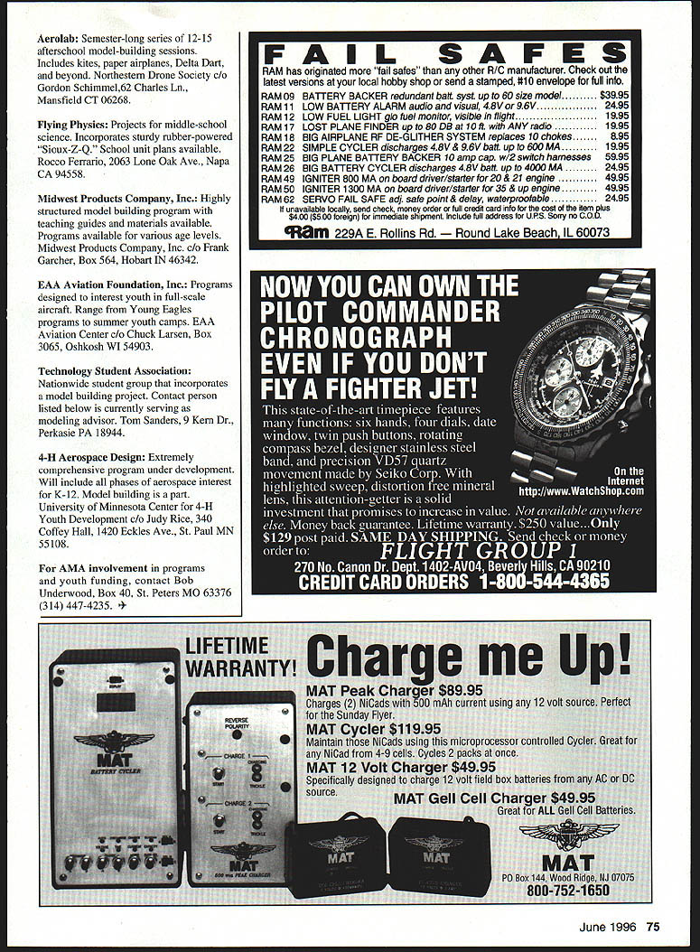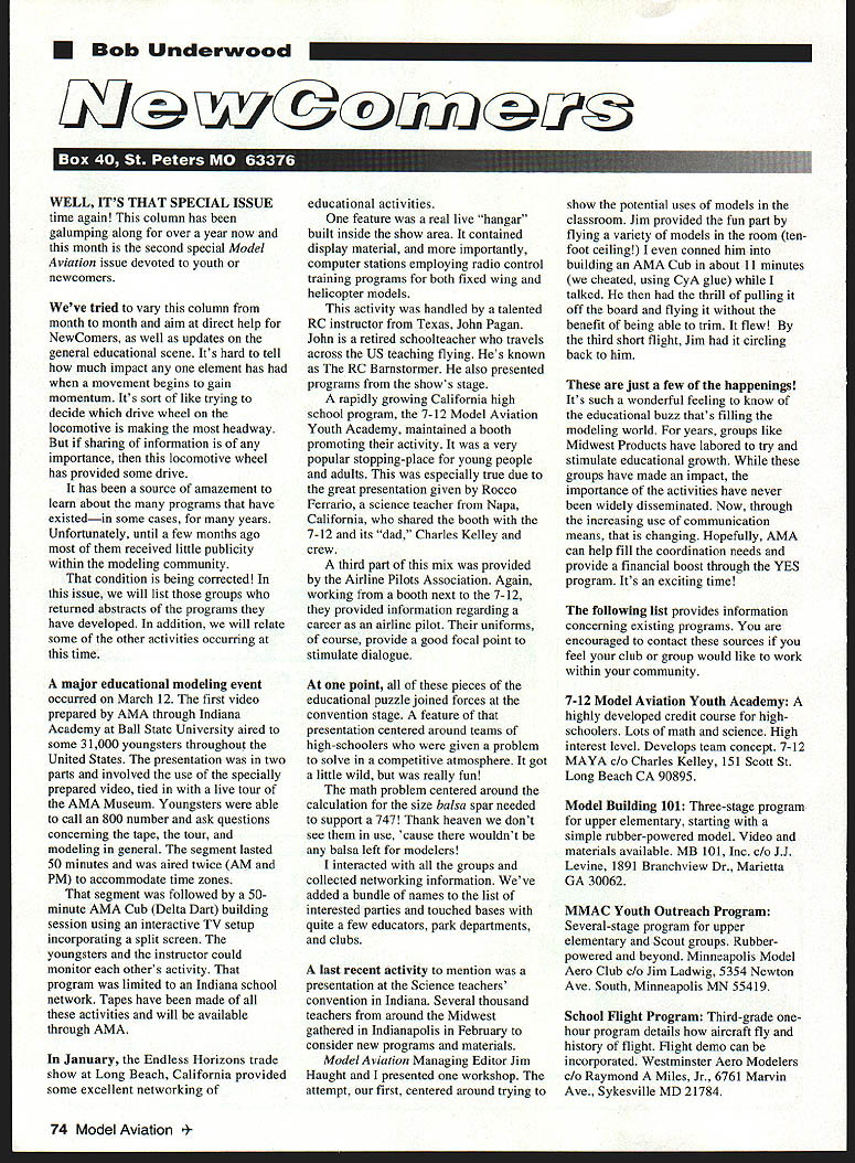 U Bob Underwood WELL ITS THAT SPECIAL ISSUE time again column has galumping along over year now month second special Model Aviation issue devoted youth newcomers Weve tried vary column month month aim direct help NewComers well updates general educational scene Its hard tell much impact element has movement begins gain momentum Its sort like trying decide drive wheel locomotive making headway sharing information importance locomotive wheel has provided some drive has source amazement learn about programs have existedin some cases years Unfortunately until few months ago received little publicity within modeling community condition being corrected issue will list groups returned abstracts programs have developed addition will relate some other activities occurring time major educational modeling event occurred March 12 first video prepared AMA through Indiana Academy Ball State University aired some 31000 youngsters throughout United States presentation two parts involved use specially prepared video tied live tour AMA Museum Youngsters able call 800 number ask questions concerning tape tour modeling general segment lasted 50 minutes aired twice AM PM accommodate time zones segment followed 50minute AMA Cub Delta Dart building session using interactive TV setup incorporating split screen youngsters instructor could monitor others activity program limited Indiana school network Tapes have made activities will available through AMA January Endless Horizons trade show Long Beach California provided some excellent networking educational activities feature real live hangar built inside show area contained display material importantly computer stations employing radio control training programs both fixed wing helicopter models activity handled talented RC instrnctor Texas John Pagan John retired schoolteacher travels across US teaching flying Hes known RC Barnstormer also presented programs shows stage rapidly growing California high school program 7-12 Model Aviation Youth Academy maintained booth promoting activity very popular stopping-place young people adults especially true due great presentation given Rocco Ferrario science teacher Napa California shared booth 7-12 its dad Charles Kelley crew third part mix provided Airline Pilots Association Again working booth next 7-12 provided information regarding career airline pilot uniforms course provide good focal point stimulate dialogue point pieces educational puzzle joined forces convention stage feature presentation centered around teams high-schoolers given problem solve competitive atmosphere got little wild really fun math problem centered around calculation size balsa spar needed support 747 Thank heaven dont see use cause wouldnt balsa left modelers interacted groups collected networking information Weve added bundle names list interested parties touched bases quite few educators park departments clubs last recent activity mention presentation Science teachers convention Indiana Several thousand teachers around Midwest gathered Indianapolis February consider new programs materials Model Aviation Managing Editor Jim Haught presented workshop attempt first centered around trying show potential uses models classroom Jim provided fun part flying variety models room ten foot ceiling conned him building AMA Cub about 11 minutes cheated using CyA glue talked thrill pulling off board flying benefit being able trim flew third short flight Jim circling back him just few happenings Its such wonderful feeling know educational buzz thats filling modeling world years groups like Midwest Products have labored try stimulate educational growth groups have made impact importance activities have never widely disseminated Now through increasing use communication means changing Hopefully AMA can help fill coordination needs provide financial boost through YES program Its exciting time following list provides information concerning existing programs encouraged contact sources feel club group would like work within community 7-12 Model Aviation Youth Academy highly developed credit course high schoolers Lots math science High interest level Develops team concept 7-12 MAYA Charles Kelley 151 Scott St Long Beach CA 90895 Model Building 101 Three-stage program upper elementary starting simple rubber-powered model Video materials available MB 101 Inc JJ Levine 1891 Branchview Dr Marietta GA 30062 MMAC Youth Outreach Program Several-stage program upper elementary Scout groups Rubberpowered beyond Minneapolis Model Aero Club Jim Ladwig 5354 Newton Ave South Minneapolis MN 55419 School Flight Program Third-grade onehour program details aircraft fly history flight Flight demo can incorporated Westminster Aero Modelers Raymond Miles Jr 6761 Marvin Ave Sykesville MD 21784 74 Modei Aviation lab Semester-long series 12-15 afterschool model-building sessions Includes kites paper airplanes Delta Dart beyond Northestern Drone Society Gordon Schimmel62 Charles Ln Mansfield CT 06268 Flying Physics Projects middle-school science Incorporates sturdy rubber-powered Sioux-Z-Q School unit pians available Rocco Ferrario 2063 Lone Oak Ave Napa CA 94558 Midwest Products Company Inc Highly structured model building program teaching guides materials available Programs available various age levels Midwest Products Company Inc Frank Garcher Box 564 Hobart IN 46342 EAA Aviation Foundation Inc Programs designed interest youth full-scale aircraft Range Young Eagles programs summer youth camps EAA Aviation Center Chuck Larsen Box 3065 Oshkosh WI 54903 Technology Student Association Nationwide student group incorporates model building project Contact person listed below currently serving modeling advisor Tom Sanders 9 Kern Dr Perkasie PA 18944 4-H Aerospace Design Extremely comprehensive program under development Will include phases aerospace interest K-12 Model building part University Minnesota Center 4-H Youth Development Judy Rice 340 Coffey Hall 1420 Eckles Ave St Paul MN 55108 AMA inv