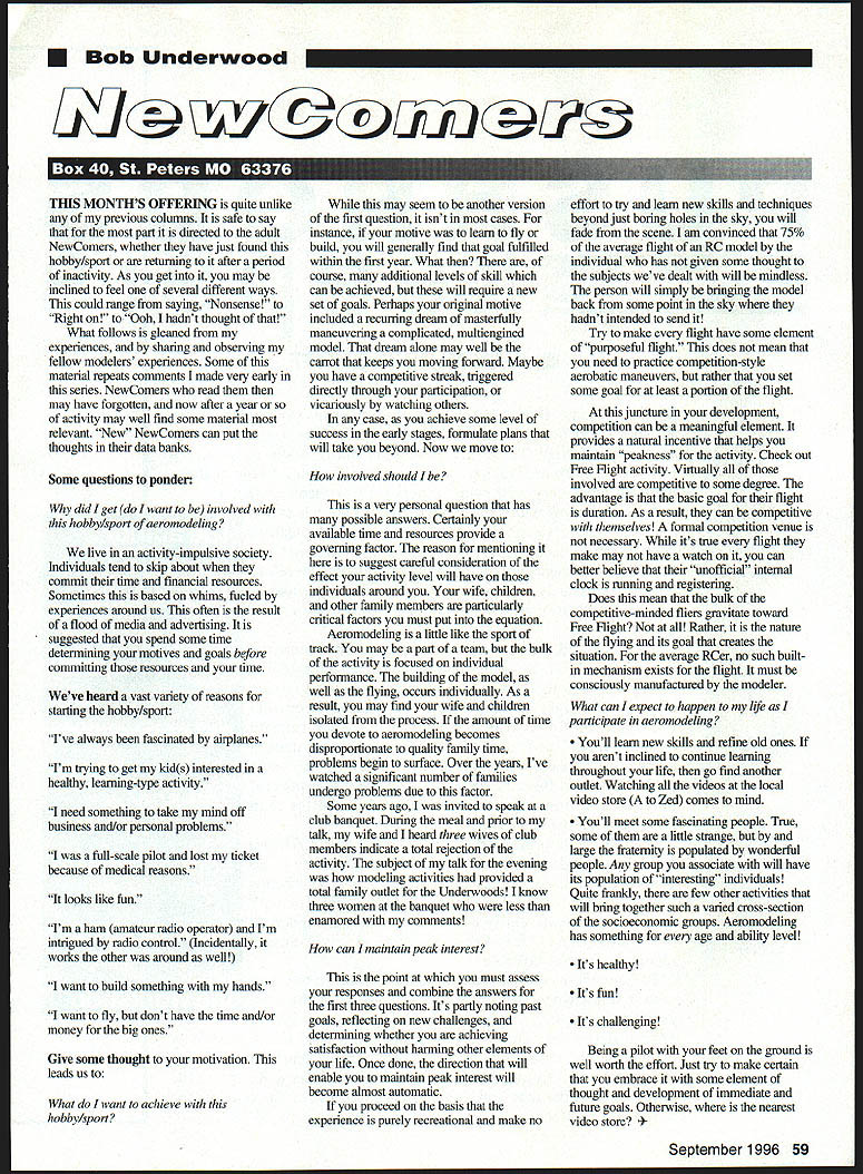 U Bob Underwood USk @uixu THIS MONTHS OFFERING quite unlike previous columns safe say part directed adult NewComers whether have just found hobby/sport returning after period inactivity As get may inclined feel several different ways could range saying Nonsense Right Ooh hadnt thought What follows gleaned experiences sharing observing fellow modelers experiences Some material repeats comments made very early series NewComers read may have forgotten now after year activity may well find some material relevant New NewComers can put thoughts data banks Some questions ponder did get want involved hobby/sport ofaeromodeling live activity-impulsive society Individuals tend skip about commit time financial resources Sometimes based whims fueled experiences around us often result flood media advertising suggested spend some time determining motives goals before committing resources time Weve beard vast variety reasons starting hobby/sport Ive always fascinated airplanes Im trying get kids interested healthy learning-type activity need something take mind off business and/or personal problems full-scale pilot lost ticket because medical reasons looks like fun Im ham amateur radio operator Im intrigued radio control Incidentally works other around well want build something hands want fly dont have time and/or money big ones Give some thought motivation leads us What want achieve hobby/sport may seem another version first question isnt cases instance motive leam fly build will generally find goal fulfilled within first year What course additional levels skill can achieved will require new set goals Perhaps original motive included recuiring dream masterfully maneuvering complicated multiengined model dream alone may well carrot keeps moving forward Maybe have competitive streak triggered directly through participation vicariously watching others case achieve some level success early stages formulate plans will take beyond Now move involved should very personal question has possible answers Certainly available time resources provide governing factor reason mentioning suggest careful consideration effect activity level will have individuals around wife children other family members particularly critical factors must put equation Aeromodeling little like sport track may part team balk activity focused individual performance building model well flying occurs individually As result may find wife children isolated process amount time devote aeromodeling becomes disproportionate quality family time problems begin surface Over years Ive watched significant number families undergo problems due factor Some years ago invited speak club banquet During meal prior talk wife heard three wives club members indicate total rejection activity subject talk evening modeling activities provided total family outlet Underwoods know three women banquet less enamored comments can maintain peak interest point must assess responses combine answers first three questions Its partly noting past goals reflecting new challenges determining whether achieving satisfaction harming other elements life Once done direction will enable maintain peak interest will become almost automatic proceed basis experience purely recreational make no effort try leam new skills techniques beyond just boring holes sky will fade scene am convinced 75% average flight RC model individual has given some thought subjects weve dealt will mindiess person will simply bringing model back some point sky hadnt intended send Try make flight have some element purposeful flight does mean need practice competition-style aerobatic maneuvers rather set some goal least portion flight juncture development competition can meaningful element provides natural incentive helps maintain peakness activity Check out Free flight activity Virtually involved competitive some degree advantage basic goal flight duration As result can competitive themselves formal competition venue necessary its true flight make may have watch can better believe unofficial internal clock running registering Does mean bulk competitive-minded fliers gravitate toward Free flight Rather nature flying its goal creates situation average RCer no such builtin mechanism exists flight must consciously manufactured modeler What can expect happen lfe participate aeromodeling Youll learn new skills refine old ones arent inclined continue learning throughout life go find another outlet Watching videos local video store Zed comes mind Youll meet some fascinating people True some little strange large fraternity populated wonderful people Any group associate will have its population interesting individuals Quite franldy few other activities will bring together such varied cross-section socioeconomic groups Aeromodeling has something age ability level Its healthy Its fun Its challenging Being pilot feet ground well worth effort Just try make certain embrace some element thought development immediate future goals Otherwise nearest video store ember 1996 59