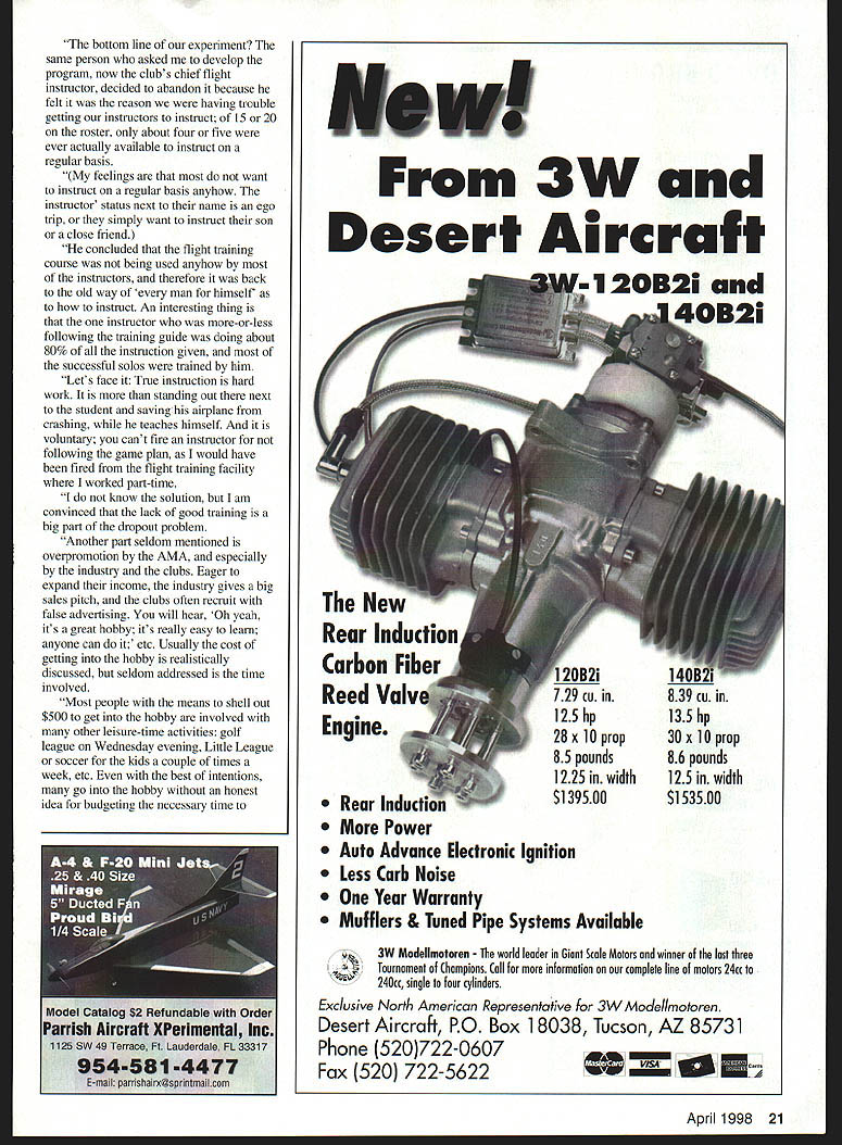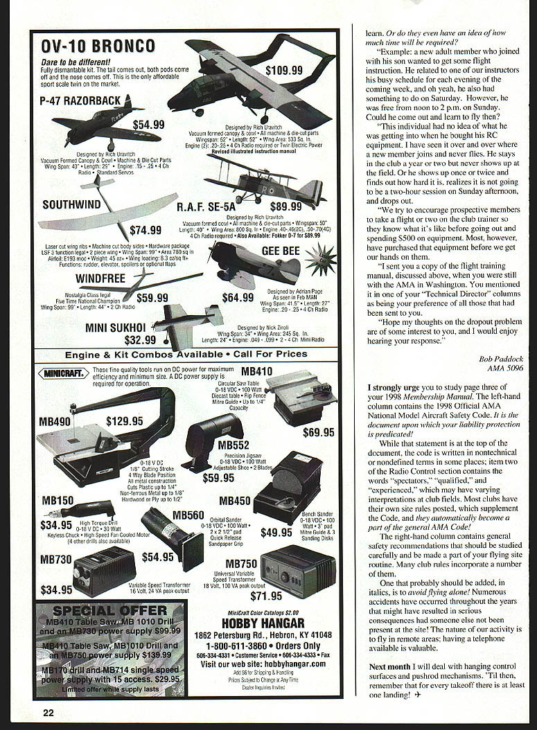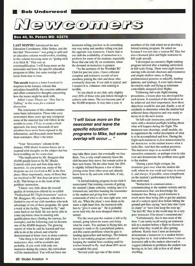 Bob Underwood fiZYik @u~U LAST MONTH introduced new Education Coordinator Mike Stokes fact Newcomers going split education column would evolve resulting column focusing gluing stick Stick B oversimplification will focus newcomer leave specific education programs Mike some overlap will occur time time month features letter received response January column articulates beautifully concerns addressed offers constructive thoughts concerning issues might dealt Editors note Please see Now Youre Tolkingin issue related discussion conclusion column contains some basic information newcomers three years ago may recognize some material will follow months come Ill try create fresh approach thousands new members have never exposed information thousands benefit reminders Heres letter Newcomers column January 1998 Model Aviation forces respond thoughts subject has troubling some time implication Mr Berggren 40000 people learn fly RC [Radio Control] year drop out incorrect As point out dropouts involved RC first place importantly involved RC drop out never learn fly brings us heart problem instruction know very little about overall quality instruction offered so-called Professional RC Flight Instructors such Mr Berggren experience limited club members took advantage programs spent week facility learned fly came back field never able come anywhere close meeting solo qualifications finding runway example following year became 40000 dropouts glowing reports what said learned able school what demonstrated home sharp contrast thing sure paid instructors will available probably work instructor during course curriculum will standardized will have instructor telling something way today another telling just opposite way tomorrow know club availability instructors problem some students especially can fly weekends demand instuctors greatest As secretary Westlake RC Club past ten years have collected complete extensive records new members joining club eventually drop out club typical suspect volunteer club training terrible last check club slightly over 20% join follow through achieve solo status rest become part 40000 dropouts may take year will focus newcomer leave specific education programs Mike some overlap will occur. may take three years eventually lose Yes very small minority leave club because move remain active new home other hand 20% slightly inflated because few joining come other areas already know fly solo little training formal training program club nonexistent training consists getting students plane airborne making sure trimmed out handing transmitter student giving him verbal commands what turn right now turn left etc planes nose drops starts right hand turn instructor tells him give some up probably never told nose dropped turned part student left fly around going wants doing what wants airplane flying him no attempt made fly predefined pattern causes problems gets landing approaches landings bottom line training program consists keeping student crashing until teaches himself fly about 80% never accomplish goal Several years ago senior members club asked develop formal training program asked because veteran RC flier also licensed pilot flight instructor full-scale aircraft developed extensive flight training program tailored after training curriculum full-scale flying eight lessons starting aircraft checkout orientation simple shallow turns flying predetermined patterns takeoffs landing patterns landings lesson devoted stalls flying minimum controllable airspeed slow flight Following full-scale flight training procedures lesson plan developed lesson consisted objectives achieved importance objectives would met finally set standards determine student achieved objectives ready move next lesson full-scale instruction lesson starts detailed preflight briefing about what will happen during flight instructor uses drawings small models etc supplement verbal description what accomplished During flight maneuver first demonstrated instructor student knows what looks like student practices instructor steps needed corrective comments perhaps take over demonstrate problem area again student During post-flight critique instructor goes over what student did well weak ways correct always possible some compliment students performance help keep him motivated Instruction communication communicating student verbally demonstration vast knowledge instructor has Being good instructor much being able get airplane out vertical spiral dive before hitting ground saying next time dont turn sharp next time keep nose up best RC flier world may very poor instructor doesnt communicate Unfortunately true time can rarely recall seeing instructor talk student before flight discuss detail what would after getting airborne Rarely have seen instructor demonstrate maneuver student before having him try seldom have seen instructor talk student afterward suggest solutions problems student having fact talk him about anything 20 Model Aviation om line experiment same person asked develop program now clubs chief flight instructor decided abandon because felt reason having trouble getting instructors instruct 15 20 roster about four five ever actually available instruct regular basis feelings want instruct regular basis anyhow instructor status next name ego trip simply want instruct son close friend concluded flight training course being used anyhow instructors therefore back old way man himself to instruct An interesting thing instructor more-or-less following training guide doing about 80% instruction given successful solos trained him Lets face True instruction hard work standing out next student saving airplane crashing teaches himself voluntary cant fire instructor following game plan would have fired flight training facility worked part-time know solution am convinced lack good training big part dropout problem Another part seldom mentioned overpromotion AMA especially industry clubs Eager expand income industry gives big sales pitch 