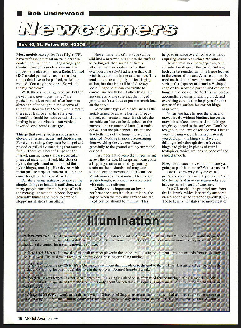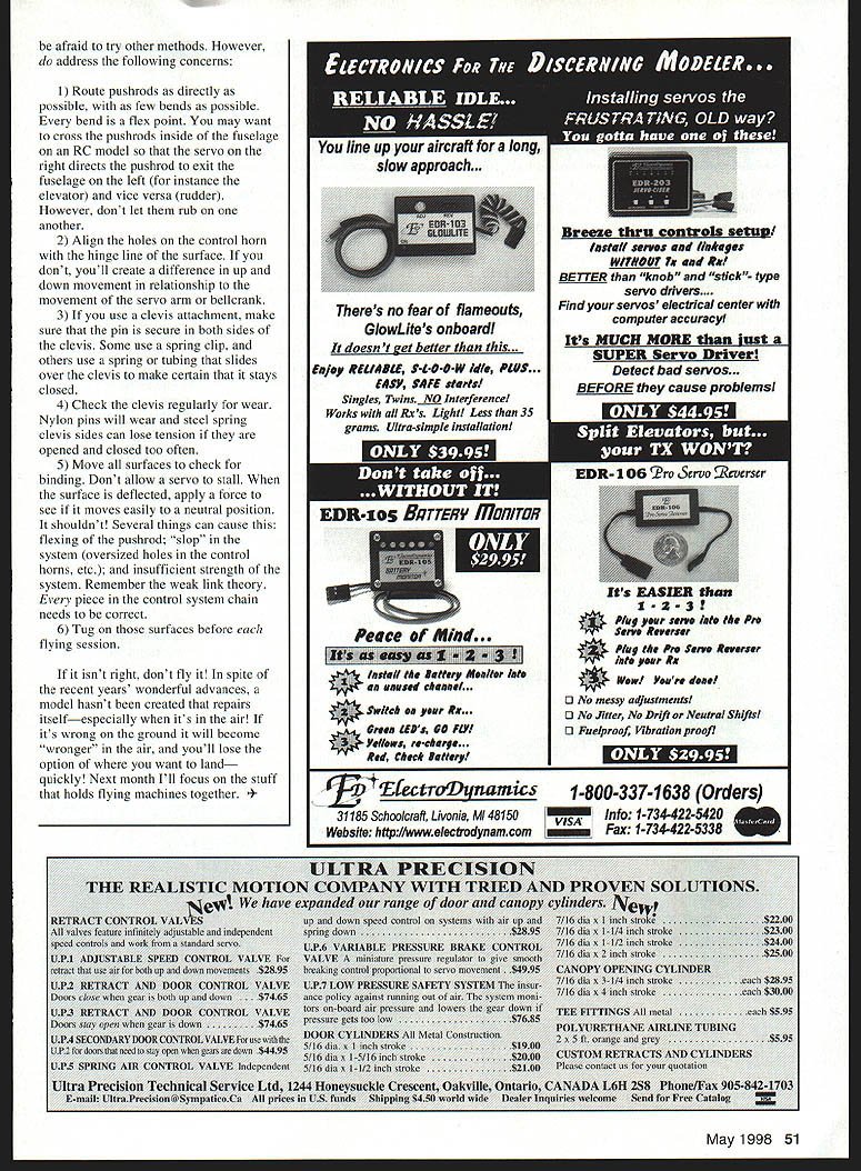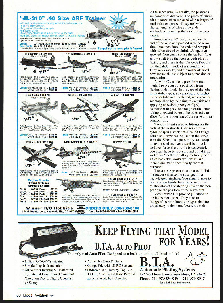 U Bob Underwood Pk@iKU Most models except Free Flight FF have surfaces must move order control flight path beginning-type Control Line CL models surface movesthe elevatorand Radio Control RC model generally has three four things have pushed pulled rotated may saying So whats big problem Well theres big problem newcomers things pushed pulled rotated often becomes almost afterthought scheme things shouldnt Since aircraft least landing takeoff should made certain landing wheelsnot vertical inverted otherwise strange Things swing items such elevator ailerons rudder throttle arm swing must hinged pushed pulled something moves freely host hinges market ranging simple rectangular pieces material look like cloth nylon through actual metal-pinned flat nylon hinges round peglike devices metal pins strips material run entire length movable surface average trainer-type model simplest hinge install sufficient people consider simplest rectangular material pieces generally thinner tolerant sloppy installation others Newer materials type can slid narrow slot cut surface hinged seated firmly attached application thin cyanoacrylate CyA adhesive will wick back hinge surface tends create slightly stiffer hinging action isnt bad really loose hinged joint can contribute control surface flutter other things correct Make sure hinged joint doesnt stall out put too much load servo Some other types hinges such metal-pinned ones whether flat pegshaped can create neater finish job movable surface can detached purpose reattached later Just make certain pin cannot slide out both ends hinge securely attached Nothing discouraging watching elevator flutter gracefully ground model crashes important keep hinges line across surface Misalignment can cause flopping motion binding putting strain pushrods may cause sudden erratic movement surface Misalignment noticeable along greater length crops up often strip-type ailerons important lowerperformance aircraft such trainers gap between movable surface fixed portion should minimal helps enhance overall control requiring excessive surface movement accomplish gap-free joint consider shape joined surface both can rounded hinge located center arc commonly used method leave non-movable surface flat square sand V-shaped edge movable portion center hinge apex V can best accomplished using sanding block exercising care also helps find center surface correct hinge alignment have hinged joint moves freely binding tug movable surface ensure hinges arefirmly seated surfaces Dont too gentle laws science wont using wide flat hinge material could pin hinges place drilling hole through surface hinge gluing pieces round toothpicks snipped off sanded smooth Now surface moves going push move pushrod dont know called pushrods actually push pull Maybe thats akin reason have scissors instead scissor CL model pushrod runs bellcrank securely anchored pivot near center gravity CG bellcrank translates movement 46 Model Aviation lines linear movement pushrod back elevator pushrod attached control horn mounted elevator portion horizontal stabilizer trainer model pushrod typically piece wire should contained supported prevented bending points along way easy accomplish since CL trainers have profile fuselages usually explained plans pushrod can attached bellcrank and/or control horn onto elevator several methods ranging simple Z bend wire use clevis similar adjustable devices prefer have least end usually control horn end adjustable since bending wire two Z bends exactly right length easy bellcrank arm pushrod attached will probably have several holes does control horn holes closest pivot point bellcrank farthest elevator surfaces produce least amount elevator throw operate theory better instance Too much throw will give problems Over-control good thing trainer plans will generally suggest throw amounts Err low side dont have enough throw get model off ground wont have come down Obtain copy Competition Regulations reference set up fitting lines model handle etc no specific guidelines requirements Sport Control Line wire sizes Study pages 28-29 show attach lines use chart page 48 line diameters pull-test requirements have suggested Precision Aerobatics since models typical average trainer say Speed Racing case wire diameter probably better off err high side Most previous information also applies RC bellcrank doesnt exist still have attach pushrod Made USA GIANT KITS Span- 76-83 Area- ttOO 12 lbs $22995 S/H Clipped Wing TCraft DELUXE KIT tncludes wood FIG cowl wheel panta landing gear window material hardvare roiled plans Over dozen kits available M/c-vISACatalog $200 REIDS QUALITY MODEL PRODUCTS 30 Clirton St Phelps NY 14532 315-548-3779 FAX 548-4099 JL-310 40 Size ARF 1r er Ens FsrI VIi lf71 si FC10 ireled Radio Reqenes 4 C5 Wing Span 64 Wing Area 725 sq Flying Wt 55 lbs Engine 40 46 2C Cembo JL-310 w/49 ABC BB Thunder Tiger GP-42 Engine$129 9919 01 Super Consho add 4 ch FM Radio9254 99 Thunder Tiger 40 60s ae Tiger Trainer Combos please call tSr pr ce descr plan High quality lowest price America F4U Corsair 40 Size ARFP-51 Mustang 40 Size ARFSukhoi 40 Size ARF eagle Renaises 4 CC 15 seroesI Wng Spar 55Radio Requlees 4 C5 S sesenni Spar 57Radio Renesees 4 C5 Span 545 W ng Wing Assa 530 sq Plying 53 55in Wing Asee 505 sq Plying e lbs Aces 520 sq Flying W5 02 lbs Pegire 40 Engine 40 46 cc 12C1 ee 4n 70 l4ClEngine 40 53 no le Sd erOS- 70 4C 5300 12C1 Os 40 75 4C Sprier see piere eptien Painted ens piers F 5 rewl sor anIrstalleS sereoresPlO Ceesi Sen en Csmse Pre46 Engine 999 Combo Prs4t Engine 999 Comeg Prs46 Engine 699 wIFS4S 4C Engine$339 99w/P-54S 4C Engine 99w/F-54S 4C Engine 932999 Twin Sukhui Spurt ARFUltimate 30 Size ARFCap 231 40 Size ARF Made USA iA9 o Renaises 4 C Wing Span 675 is. WregRadio Reqoisen 4Cr spar 4t 7 WingRadio Renoises 4 Co IS sesnosi Wieg Span 56 Asea 676 sq Flying SOibs Pegise tecoAssa 57e sq ng 44 lbs ne 35 Wing Osea 009 sq P sirS SR lbs 40 53 rain 12C1 Os ewe 4R- 65 14C140 rein 2C os