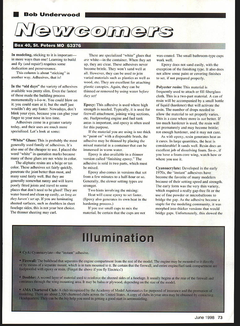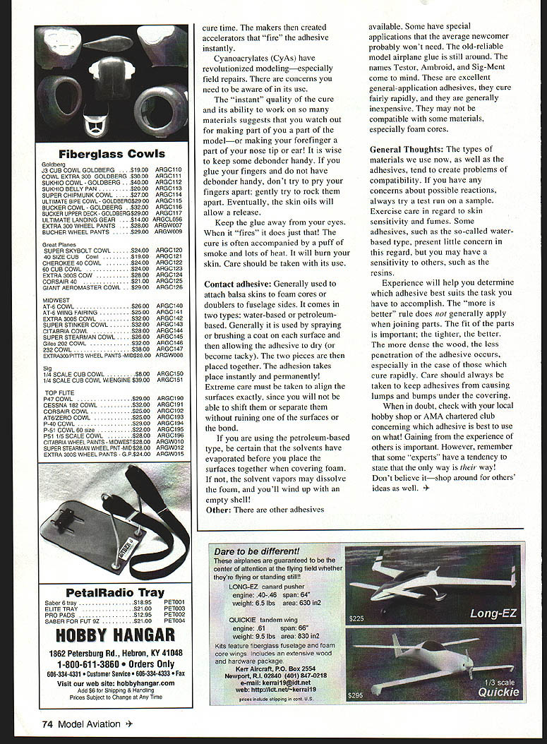U Bob Underwood &54YuiKu modeling sticking important ways Learning build fly repair requires some dedication perseverance column about sticking another way Adhesives old days variety adhesives available pretty slim fastest made building process monumentally s-l-o-w could blow could stare stuff just wouldnt dry faster Nowadays dont blink eyes because can glue finger nose less time Adhesives come greater variety today uses much specialized Lets look some White Glues probably generally used family adhesives Its also cheaper use placed word white quotation marks because glues white color aliphatic resins beige tan color adhesives set fairly quickly penetrate joint better sand fairly well generally somewhat runny will leave poorly fitted joints travel some places dont need glued water-based clean up easily long havent set up laminating sheeted surfaces such doublers sheet fuselage sides best choice thinner sheeting may curl specialized white glues whitein container set up clear adhesives never become brittle wont sand well However can used join varied materials such plastics well wood etc excellent attaching plastic canopies Again can thinned removed using water before set Epoxy adhesive used high strength needed Typically used firewall attachment joining wing sections etc Fuelproofing engine fuel tank areas Important epoxy often used purpose material using too thick paint disposable brush adhesive may thinned placing mixed material container can immersed warm water Epoxy also available thinner version called finishing epoxy adhesive sold two parts must mixed Epoxy also comes versions set few minutes half-hour Generally slower setting types stronger Two hints involving mixing Heat will cause epoxy set faster Epoxy also generates its own heat hardening process use small cups mix material certain cups wax-coated small bathroom-type cups work well Epoxy does sand easily exception finishing type also does allow some paint covering finishes set prepared properly Polyester resin material frequently used attach fill fiberglass cloth two-part material can resin will accompanied small bottle liquid hardener will activate resin number drops needed allow material set properly varies case better too much hardener used resin will set prematurely may become brittle enough hardener may cure As epoxy resin generates heat cures large quantities heat considerable sands well Resin does excellent job dissolving foam So-o- have foam-core wing watch use Cyanoacrylate Developed early 1970s instant adhesives have become favorite modelers because setting speed strength early form very thin variety required really gap-free fit use fine powder microballoons bridge gap As adhesive became staple modeling community morphed thicker versions would bridge gaps Unfortunately slowed June1998 73 Goldberg J3 CUB COWL GOLDBERG . $1900 COWL EXTRA 300 GOLDBERG $3000 SUKHIO COWL GOLDBERG . $4000 SUKHIO BELLY PAN $2000 SUPER CHIPMUNK COWL $2700 ULTIMATE BIPE COWL GOLDBERG$2900 BUCKER COWL GOLDBERG $3200 BUCKER UPPER DECK GOLDBERG $2900 ULTIMATE LANDING GEAR . $1400 EXTRA 300 WHEEL PANTS 800 BUCHER WHEEL PANTS $2900 Great Planes SUPER SKYBOLT COWL $2400 40 SIZE CUB Cowl $1900 CHEROKEE 40 COWL $2400 60 CUB COWL $2400 EXTRA 300S COW $2800 CORSAIR 40 $2100 GIANT AEROMASTER COWL . $2900 MIDWEST AT-6 COWL $2600 AT-6 WING FAIRING $2500 EXTRA 300S COWL $3200 SUPER STINKER COWL $3200 CITABRIA COWL $2800 SUPER STEARMAN COWL $2800 Giles 202 COWL $3200 232 COWL 800 EXTRA300/PITTS WHEEL PANTS -MID$2800 Si9 1/4 SCALE CUB COWL $800 1/4 SCALE CUB COWL W/ENGINE $3900 TOP ELITE P47 COWL . $2900 CESSNA 182 COWL $3200 CORSAIR COWL $2500 ATO/ZERO COWL $2500 P-40 COWL $2900 P-Si COWL 60 size $2200 P51 1/5 SCALE COWL $2800 CITABRIA WHEEL PAINTS MIDWEST$2800 SUPER STEARMAN WHEEL PNT -MID $2800 EXTRA 300S WHEEL PANTS GP$2400 ARGCI 10 AROCIll ARGC1 12 ARGC1 13 ARGC1 14 ARGC1 15 ARGCI16 AROCi 17 AROCLOSO ARGWOO7 ARGWOO9 AROC 120 ARGC121 ARGC122 AROCi 23 ARGC1 24 ARGC 125 ARGO 126 ARGC1 40 ARGC 141 ARGC142 ARGC143 ARGC144 AROCi 45 ARGC 146 ARGO 147 ARGWOO8 ARGC 150 ARGC151 ARGC 190 AROCigI ARGC1 92 ARGC193 ARGC1 94 ARGC 195 ARGC 196 AROWOl 0 ARGWO12 ARGWO15 PetaiRadi Tray Saber6tray$1895PETOOl ELITE TRAY$2100PETOO3 PRO PADS$1295PETOO2 SABER FOR FUT 9Z$2100PETOO4 HOBBY HANGAR 1862 Petersburg Rd Hebron KY 41048 1-800-611-3860 rs Only 606-334-4331 omer Service 334-4333 isit web site hobbyhangarcom Add $6 Shipping & Handling Prices Subject Change Any Time cure time makers created accelerators fire adhesive instantly Cyanoacrylates CyAs have revolutionized modelingespecially field repairs concerns need aware its use instant quality cure its ability work materials suggests watch out making part part modelor making forefinger part nose tip ear wise keep some debonder handy glue fingers have debonder handy dont try pry fingers apart gently try rock apart Eventually skin oils will allow release Keep glue away eyes fires does just cure often accompanied puff smoke lots heat will burn skin Care should taken its use Contact adhesive Generally used attach balsa skins foam cores doublers fuselage sides comes two types water-based petroleumbased Generally used spraying brushing coat surface allowing adhesive dry become tacky two pieces placed together adhesion takes place instantly permanently Extreme care must taken align surfaces exactly since will able shift separate ruining surfaces bond using petroleum-based type certain solvents have evaporated before place surfaces together Covering foam solvent vapors may dissolve foam youll wind up empty shell Other There other adhesives available Some have special applications average newcomer probably wont need old-reliable model airplane glue still around names Testor Ambroid Sig-Ment come mind excellent general-application adhesives cure fairly rapidly generally inexpensive may compatible some materials especially foam cores General Thoughts types materials use now well adhesives tend create problems compatibility have concerns a