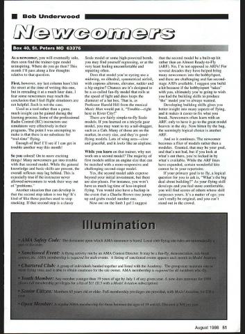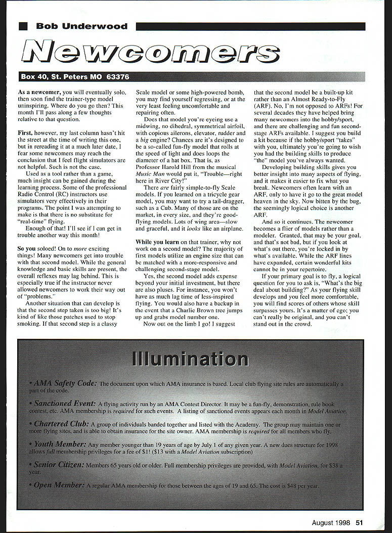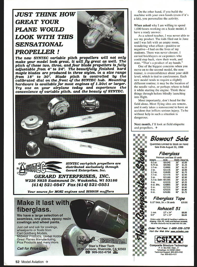 Bob Underwood ZiS4uu As newcomer will eventually solo soon find trainer-type model uninspiring go month Ill pass along few thoughts relative question First however last column hasnt hit street time writing rereading much later date fear some newcomers may reach conclusion feel flight simulators helpful Such case Used tool rather game much insight can gained during learning process Some professional Radio Control RC instructors use simulators very effectively programs point attempting make no substitute real-time flying Enough Ill see can get trouble another way month So soloed exciting things newcomers get trouble second model general knowledge basic skills present overall reflexes may lag behind especially true instructor never allowed newcomers work way out problems Another situation can develop second step taken too big Its kind like patches used stop smoking second step classy Scale model some high-powered bomb may find yourself regressing very least feeling uncomfortable repairing often Does model youre eyeing use midwing no dihedral symmetrical airfoil copious ailerons elevator rudder big engine Chances its designed so-called fun-fly model rolls speed light does loops diameter hat box Professor Harold Hill musical Music Man would put Troubleright River City fairly simple-to-fly Scale models learned tricycle gear model may want try tail-dragger such Cub market size theyre goodflying models Lots wing areaslow graceful looks like airplane learn trainer work second model majority first models utilize engine size can matched more-responsive challenging second-stage model Yes second model adds expense beyond initial investment also pluses instance wont have much lag time less-inspired flying would also have backup event Charlie Brown tree jumps up grabs model number Now out limb go suggest second model built-up kit rather Almost Ready-to-Fly ARF No Im opposed ARFs several decades have helped bring newcomers hobby/sport challenging fun secondstage ARFs available suggest build kit because hobby/sport takes ultimately youre going wish building skills produce model youve always wanted Developing building skills gives better insight aspects flying makes easier fix what break Newcomers often learn ARF have go great model heaven sky Now bitten bug seemingly logical choice another ARF continues newcomer becomes flier models rather modeler Granted may goal thats bad look whats out youre locked whats available ARF lines have expanded certain wonderful kits cannot repertoire primary goal fly logical question ask Whats big deal about building As flying skill develops feel comfortable will find scores others skill surpasses yours Its matter ego can t really original cant stand out crowd August1998 51 JUST THINK HOW GREAT YOUR PLANE WOULD LOOK WITH THIS SENSATIONAL PROPELLER new SYNTEC variable pitch propellers will make model look great will fly great well pitch two three four blade propellers fully adjustable 4 24 beautifully finished hard maple blades produced three styles size range 18 30 Blade pitch controlled calibrated dial front SYNTEC hub Mounting hardware available engines 120c1 larger Try airplane today experience convenience variable Ditch beautu SYNTEC other hand build machine own hands its kit personalize activity asked am willing spend 1000 hours working Scale model have ready answer As school teacher never able see product kids filed out June left empty room wondering what effectpositive negativeI lives students never closure envied bricklayers carpenters could step back view work state Thats product hands biggest concerns move second model nontrainer overconfidence about skill level tied carelessness new model tends require slightly different routine may location needle valve perhaps hold starting engine Think things through before blindly launching flight Most importantly dont head field alone Most flying sites remote takes nanosecond have accident inflicts serious injury help such situation dangerous Next month Ill look field etiquette propellers , MEE U U U. E Eta UbTE U Wnnht U U U. U U U U U U U U U U U U U U U U U U Eu Blowout Sale Quantities Limited Stock Hand Sale Ends August 31 1998 Fiberglass Minimum purchase 10 yards 05 oz 075 oz 15 oz 2 oz 23 oz 23 oz 3 oz 32 oz Satin 4 oz 6 oz 8Hs 6 oz 6 oz 6 oz G0104S GOlOSS GlOBOS G21125 G1610S G2113S G2116S G01205 G1522S G1680S G3733S G7533S G7628S 38$200 38$125 38$125 38$200 38$175 55$200 50$200 38$325 50$325 38$400 38$400 50$500 40$175 Fiberglass Tape 015 thick 2in x 36 yards$2000 Rohacell 51 12 x 24 11x 24 $900 $600 Orders under $50 add $5 handiing addition shippin9 VISA MC Amen Dbcover accepted No OIlier dacounts may sued tins sa 3der To/I Prea 1-800-338-1278 Visit r Wab Side uwcstsalacoa U Composite Structure Technology P 0 Box 822 Dept JT Tehachupi CA 93581-0622 Technical Support aos-a22-t182 Fax 805-822-4121 52 Model Aviation EC van-pitch propellers distributed ercclusively through Gerard Enterprises Inc INIf3N~ GERARD ENTERPRISES INC W226 N825 Eastmound Dr Waukesha WI 53186 414 521-0547 Fax 414 521-0551 source MOKI engines BISSON mufflers