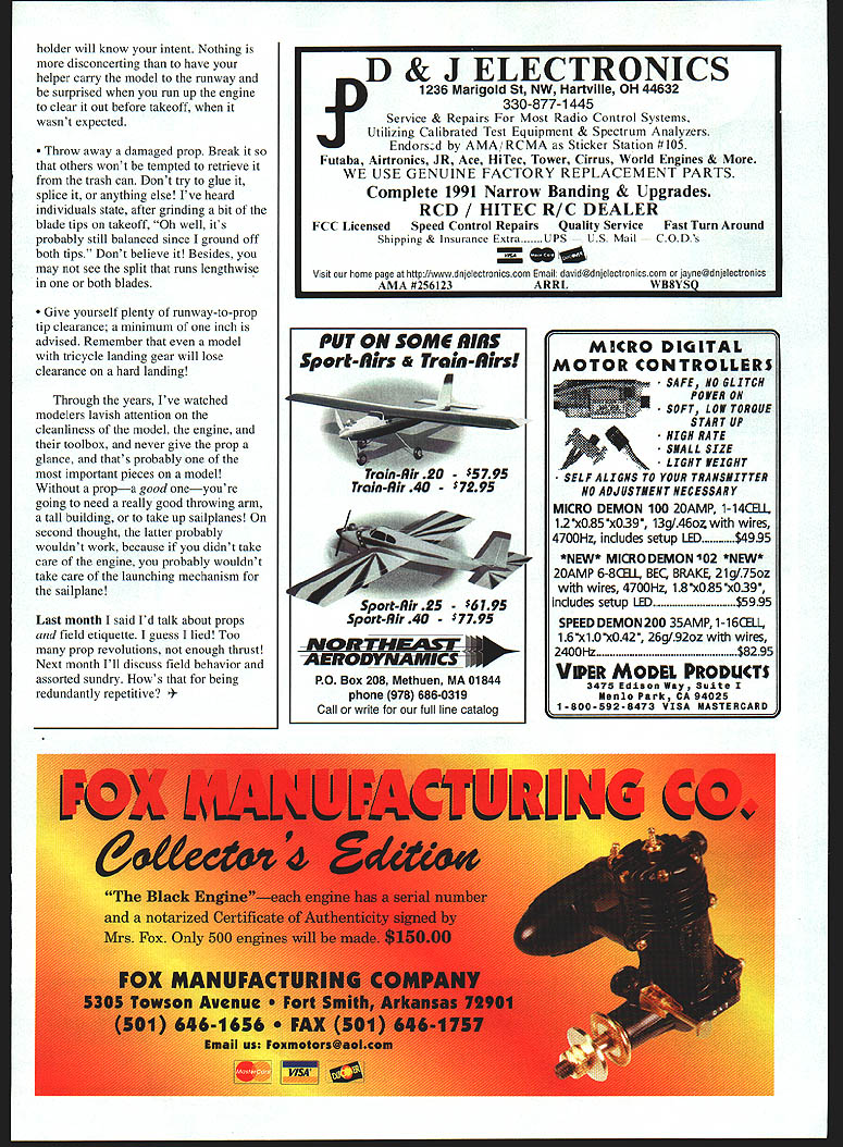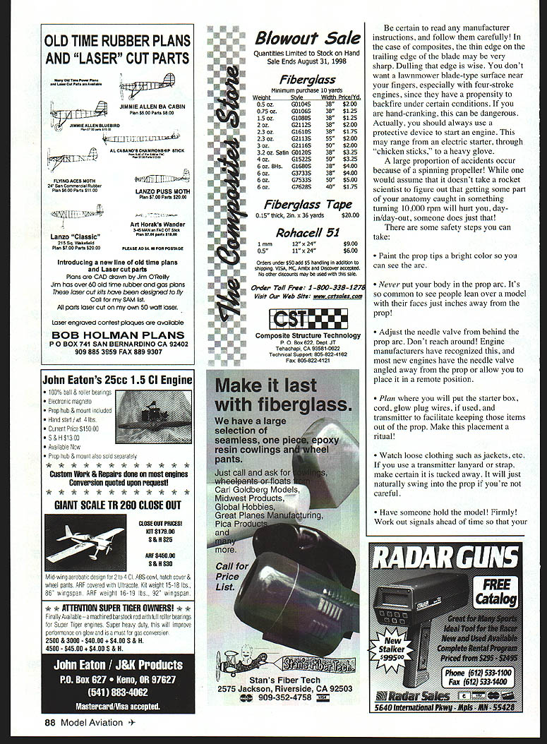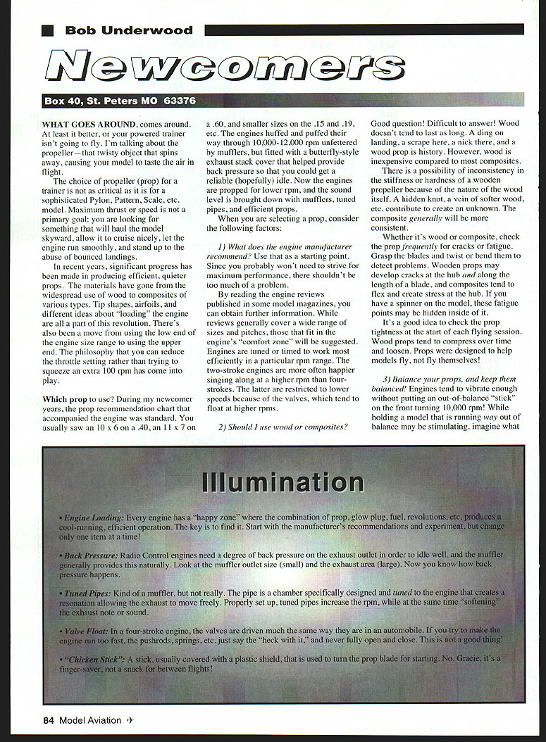 Bob Underwood USk~ WHAT GOES AROUND comes around least better powered trainer isnt going fly Im talking about propellerthat twisty object spins away causing model taste air flight choice propeller prop trainer critical sophisticated Pylon Pattern Scale etc model Maximum thrust speed primary goal looking something will haul model skyward allow cruise nicely let engine run smoothly stand up abuse bounced landings recent years significant progress has made producing efficient quieter props materials have gone widespread use wood composites various types Tip shapes airfoils different ideas about loading engine part revolution Theres also move using low end engine size range using upper end philosophy can reduce throttle setting rather trying squeeze extra 100 rpm has come play Which prop use During newcomer years prop recommendation chart accompanied engine standard usually saw 10 x 6 40 11 x 7 60 smaller sizes 15 19 etc engines huffed puffed way through 10000-12000 rpm unfettered mufflers fitted butterfly-style exhaust stack cover helped provide back pressure could get reliable hopefully idle Now engines propped lower rpm sound level brought down mufflers tuned pipes efficient props selecting prop consider following factors 1 What does engine manufacturer recommend Use starting point Since probably wont need strive maximum performance shouldnt too much problem reading engine reviews published some model magazines can obtain further information reviews generally cover wide range sizes pitches fit engines comfort zone will suggested Engines tuned timed work efficiently particular rpm range two-stroke engines often happier singing along higher rpm fourstrokes latter restricted lower speeds because valves tend float higher rpms Good question Difficult answer Wood doesnt tend last long ding landing scrape nick wood prop history However wood inexpensive compared composites possibility inconsistency stiffness hardness wooden propeller because nature wood itself hidden knot vein softer wood etc contribute create unknown composite generally will consistent Whether its wood composite check prop frequently cracks fatigue Grasp blades twist bend detect problems Wooden props may develop cracks hub along length blade composites tend flex create stress hub have spinner model fatigue points may hidden inside Its good idea check prop tightness start flying session Wood props tend compress over time loosen Props designed help models fly fly themselves 3 Balance props keep balanced Engines tend vibrate enough putting out-of-balance stick front turning 10000 rpm holding model running way out balance may stimulating imagine what 84 Model Aviation ould use wood composites Easy hand starts Slower smoother idle & mid-range Ughtweight- 3 oz less battery pack Better top end power Easy install achining wiring required Can Installed minutes hand tools electronic parts installed small ruggea anc ea aiui - x 1 5/8 x 1 3/16 No moving parts wear out get out adjustment new lightweight machined aluminum flywheel Timing adjustable few degrees fine tune engineIWodefsLZ have complete ignitien systems fer MeCulloch RyobiBstSeRing weed eater engines accessories pails available n5ofl ignition engine Custom installation available doing components solder joints radio system 4 Diameter pitch diameter hard figure Its total length prop Pitch other hand easy determine its twist angle blades set see number such used early column 10 x 6 first number refers diameter inches second pitch twist blade Both blades will should carry same pitch Some props will carry washed out pitch such 12 x 6-10 means pitch blades varies hub tip average newcomer type prop necessity may worth try youre having problem getting right rpmbite combination pull model 5 Other host differences exist between brands props within same brand instance youll find indicating fourstroke engines some feature scimitarshaped blades Other will feature wide blades still others very narrow wide blades designed creating greater thrust lower rpm narrow blades tend speed props thrust created much higher rpm often suggested APC increase either diameter pitch number optimum results 10 x 6 would suggest using 11 x6orlOx7 Years ago plastic nylon props carried specific instructions steps followed before used essential set prevent fatigue especially hub area newer composite materials generally require much preparation construction usually resins fibers impregnated resin Some use bits fiber others use continuous strands running length prop 86 Model Avjation entire years worth Model Aviation issues work get out aeromodeling experience 440 331-1881 440 331-2032 An entire years worth 2200 pages construction technical how-to articles Also AMA News regular columns covering Radio Control Control Line Free Flight modeling Browse issue quickly search entire year specific C D Libraries has reproduced page has assembled comprehensive database entire years worth issues Supported queries Article title author subject keyword keyname issue advertisement Other features Embedded text strings supported throughout full-color SVGA image display easy use Produced distributed CD Libraries Inc under license Academy Mini-Sander$335 Garnet Sandpaper 2 trite$235 Mined Garnet & Waterpreat Sandpaper$235 Waterprant Sandpaper 3 gritn $245 part building model Applied Design Corporation PO Box 3384 Torrance CA 90510 310-375-4120 Add 20% far chipping Send SASt ten Catalag Fax 3103751590 12 PR 12LS 145 P HAVE YOUR HOBBY DEALER CALL ON THE ORDER LINE UAV Inc 800-294-9506 OLD TIME RUBBER PLANS AND LASER CUT PARTS MMY 048 04400 Paw POnt ~2IEAaENUEfIS0 IS704$ 804 FIY1NO ACES MOTH 34 SW Conwar48I Rate P1nSOOOPtnSll 00 flL Lanzo Classic 21$ Sq keIeld Pint $700 P102000 JIMMIE ALLEN BA CABIN P1n 0600 P8050000 AL CASASOS CHAMPIONSHIP STICK ~-0 LANZO PUSS MOTh Plon $700 PtA 52000 Art Noraks Wander 3-40 MAN FAC ST 000k P404487W p018 51855 PLEASE AD 5404 FOR POSTAGE introducing new line old time plane Laser cut parts Mans CAD drawn Jim 