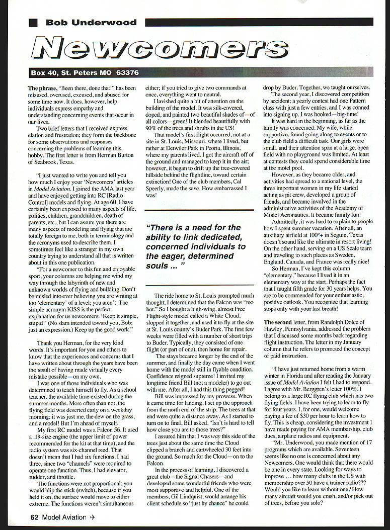 U Bob Underwood U 1Z1izU phrase Been done has misused overused excused abused some time now does however help individuals express empathy understanding concerning events occur lives Two brief letters received express elation frustration form backbone some observations responses concerning problems learning hobby first letter Herman Burton Seabrook Texas just wanted write tell much enjoy Newcomers articles Model Aviation joined AMA last year have enjoyed getting RC [Radio Control] models flying age 601 have certainly exposed aspects life politics children grandchildren death parents etc can assure aspects modeling flying totally foreign both terminology acronyms used describe sometimes feel like stranger own country trying understand written about publication newcomer fun enjoyable sport columns helping wind way through labyrinth new unknown worlds flying building Dont misled ever believing writing too elementary level arent simple acronym KISS perfect explanation us newcomers Keep simple stupid No slam intended toward Bob just expression Keep up good work Thank Herman very kind words Its important others know experiences concerns have written about through years have result having made virtually mistake possibleon own individuals determined teach himself fly As school teacher available time existed during summer months often flying field deserted early weekday morning just dew grass model Im ahead myself first RC model Falcon 56 used 19-size engine upper limit power recoimnended kit time radio system six-channel reed doesnt mean six functions three since two channels required operate function Thus elevator rudder throttle functions proportional would blip stick switch because held surface would move either extreme functions werent simultaneous either tried give two commands once everything went neutral lavished quite bit attention building model silk-covered doped painted two beautiful shades ofof colorsgreen blended beautifully 90% trees shrubs US models first flight occurred site St Louis Missouri lived rather Detwiler Park Peoria Illinois parents lived got aircraft off ground managed keep air however began drift up tree-covered hillside behind flightline toward certain extinctfon club members Cal Speerly made save embarrassed need ability link dedicated concerned individuals eager determined souls ride home St Louis prompted much thought determined Falcon too hot So bought high-wing almost Free flight-style model called White Cloud slopped together used fly site St Louis countys Buder Park first few weeks filled number short trips Buder Typically consisted flight part home repair stays became longer end summer finally day came went home model still flyable condition Confidence reigned supreme invited longtime friend Bill modeler go out After thing pegged Bill impressed prowess came time landing set up approach north end strip trees end quite distance away As started turn final Bill asked Isnt hard tell close trees assured him way side trees just about same time Cloud clipped branch cartwheeled 30 feet ground So much Cloudon Falcon process learning discovered great clubthe Signal Chasersand developed some wonderful friends supportive helpful members Gil Lindquist would arrange client schedule just chance could drop Buder Together taught ourselves second year discovered competition accident yearly contest Pattern class just few entries conned signing up hookedbig-time hard beginning far family concerned wife supportive found going along events club field difficult task girls small attention span large open field no playground limited least contests could spend considerable time motel pool However became older activities spread national level three important women life started acting pit crew developed group friends became involved administrative activities Academy Model Aeronautics became family fun Admittedly hard explain people howl spent summer vacation After auxiliary airfield 1000 Seguin Texas doesnt sound like ultimate resort living other hand serving US Scale team traveling such places Sweden England Canada France really nice So Herman Ive kept column elementary because lived elementary way start Perhaps fact taught fifth grade 30 years helps commended enthusiastic positive outlook recognize learning stops last breath second letter Randolph Dolce Hawley Pennsylvania addressed problem discussed some months back regarding flight instruction letter January colunm refers promoted concept paid instruction have just returned home warm winter florida after reading January issue Model Aviation felt respond agree Mr Berggrens letter 100% belong large RC flying club has two flying fields have trying learn fly four years would welcome paying fee $30 per hour learn fly cheap considering investment have made paying AMA membership club dues airplane radios equipment Mr Underwood made mention 17 programs available Seventeen seems like no concerned about Newcomers would think would state Looking ways improve . clubs US membership over 50 have trainer radio? Would like leam aircraft would crash and/or pick out trees before solo 62 Model Aviation renewed membership year Jam just building airplanes Frustrated yes Quitting no Well hope maybe will find instructor will have teaching skills patience teach great sport Randolph voice some valid concerns regarding clubs AMA general column have published information about well-developed club instruction programs like manner number clubs have no instruction programs whatsoever solution seems simplistic doesnt work out way instance because nature insurance liability coverage commercial instruction viable possibility time suggest methods overcome couldnt worked out just hasnt happened asked some questions second paragraph essence addressed earlier column strongly discourage anyone leaming RC way did question becomes will leam club doesnt have program have no commercial instructor available shouldnt try own might some help study dynamics club associated number